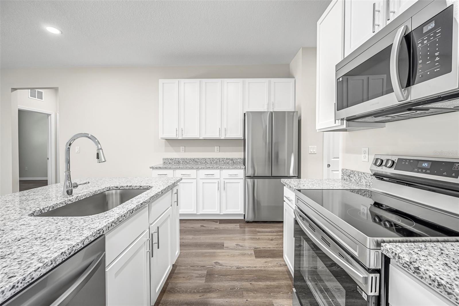 One or more photo(s) has been virtually staged. Ready for Immediate Occupancy! This brand-new 3-bedroom, 2-bathroom home with a 2-car garage offers 1,550 sq ft of living space (2,069 total) and is located in the highly sought-after gated community of GlenLakes Country Club! Step inside and be welcomed by a spacious, open layout ideal for modern living. The kitchen boasts rich wood cabinetry, granite countertops, stainless steel appliances, a breakfast bar that seats three, LED lighting, and beautiful, easy-to-maintain flooring that runs throughout the entire home. The bright and airy living room includes sliding glass doors that open to the backyard. Enjoy the convenience of an indoor laundry room, complete with washer and dryer. The generous primary suite features a walk-in closet and a private bath with dual sinks, a tub/shower combo, wood vanity, and sleek LED lighting. Two additional bedrooms are located near the guest bath, which includes granite counters, tile-surround tub/shower combo, and matching cabinetry. This home is nestled within GlenLakes, home to a stunning 18-hole championship golf course and a vibrant clubhouse offering a full-service restaurant and the popular 19th Hole Grill & Bar. Gated community with 24/7 security for peace of mind. Conveniently located near major shopping centers, restaurants, and everyday essentials. Drive your golf cart to the many amenities: fitness center, tennis and pickleball courts, lakeside pool and spa, game and card rooms, billiards, library, yoga studio, dog park, playground, and Veterans Memorial. With over 100 clubs and social groups to join, there's always something to enjoy! Located just 1 hour from Tampa, and close to beaches, Pine Island sunsets, boating, fishing, kayaking, and more. HOA dues include cable and internet for added value and convenience!