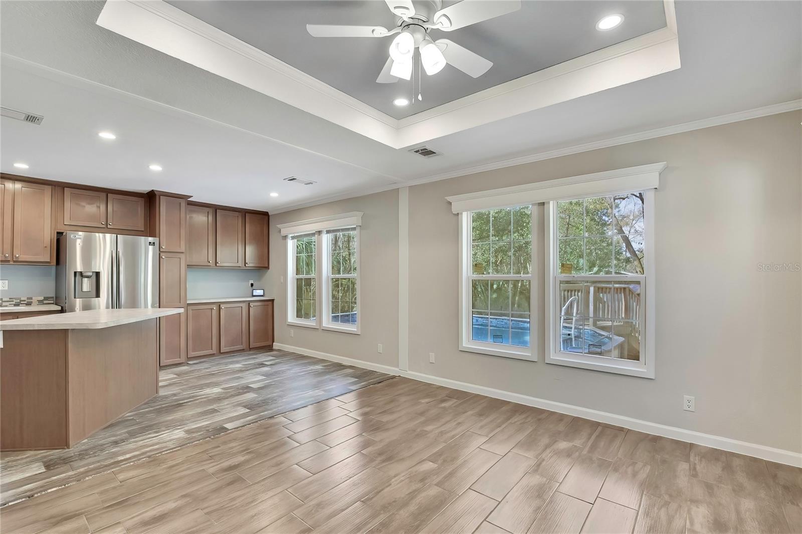 Situated on 2.50 private acres in the Weeki Wachee/Brooksville area, this 2019 built former model modular home with high upgrades was delivered and installed in 2021, with new well, septic, and A/C installed in 2021. The home offers approximately 816 square feet of living space with 2 bedrooms and 2 bathrooms, providing flexibility and peaceful country living. Inside, the home showcases a bright open living and dining area with tray ceilings, crown molding, and abundant natural light. The kitchen is equipped with tall wood cabinetry, ample counter space, and a center island, making it ideal for both cooking and entertaining. Bedrooms feature tile flooring and built-in storage, while the bathrooms include vanities and a walk-in shower. A dedicated laundry area with washer and dryer adds everyday convenience. The property includes multiple outbuildings, highlighted by a 30x40 multi-use garage with three bays built in 2023, along with additional sheds and animal pens, and a large arena area suitable for horses or livestock. Zoned AG, the property is designed for functionality and easy access with two gated entrances. The farm-side entrance features a 16-foot gate, providing ample space for trailers and equipment to back in directly from the street. The home-side entrance includes a 12-foot gate and a 6-inch crushed concrete driveway, allowing heavy equipment and trucks for easy access to the garage, which includes a reinforced slab designed for a future vehicle lift or machinery. The building was constructed with a heavy-duty footer for added structural support. Additional improvements include a 16x28 above-ground pool with deck, RV hookup with water and electric, French drains, security camera system, and several fenced pasture areas with gates, offering plenty of space for animals, equipment, hobbies, or future improvements. Located in Hernando County with convenient access to US-19, the Suncoast Parkway, the Gulf Coast, parks, and local amenities, this property combines the tranquility of rural living with convenient access to nearby services.