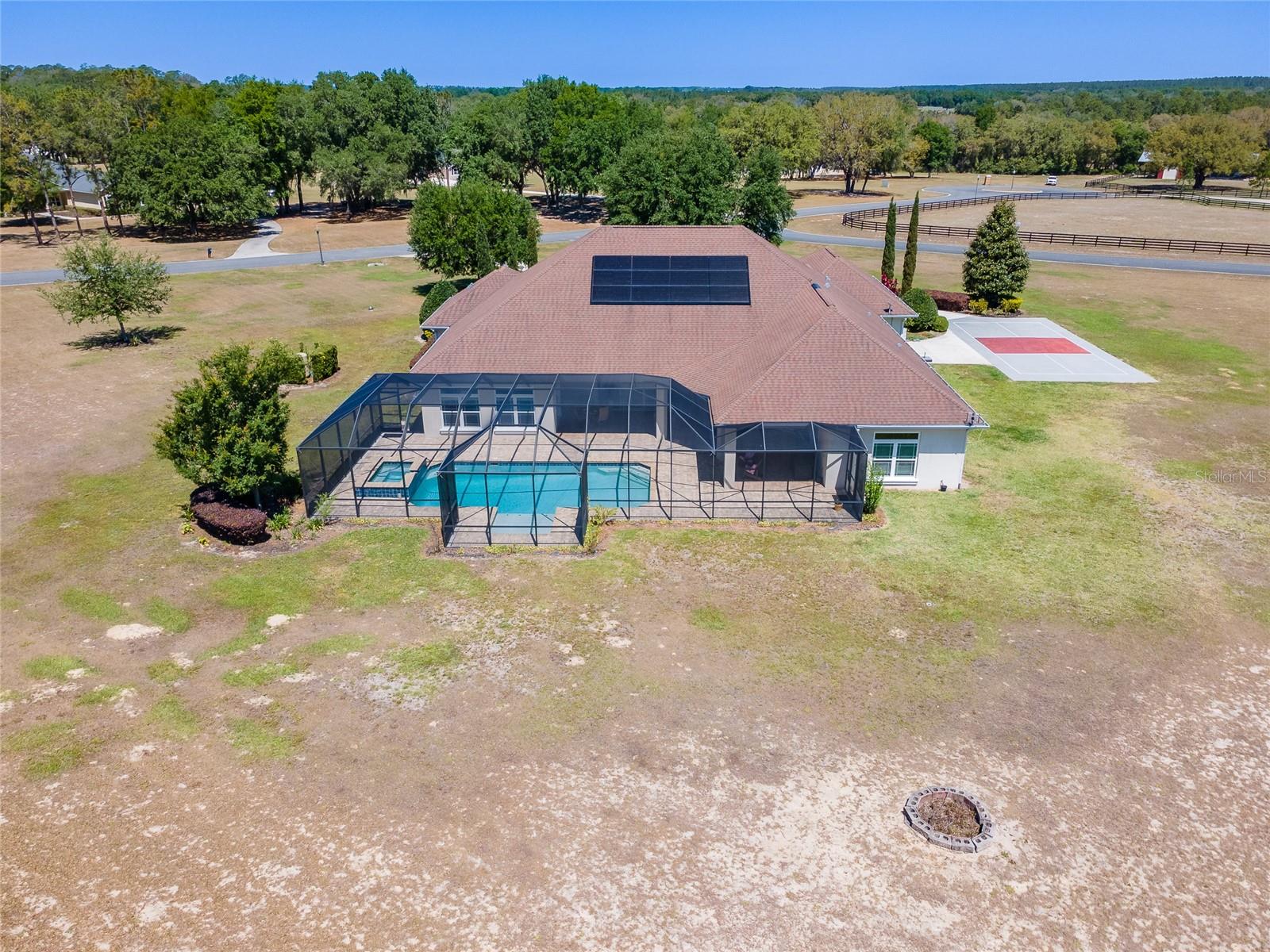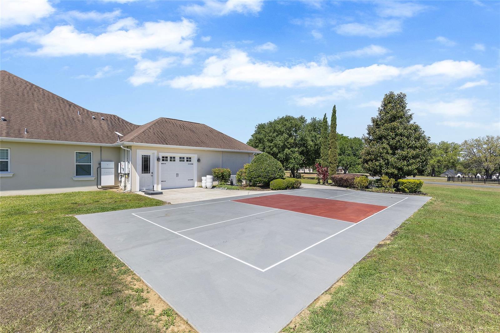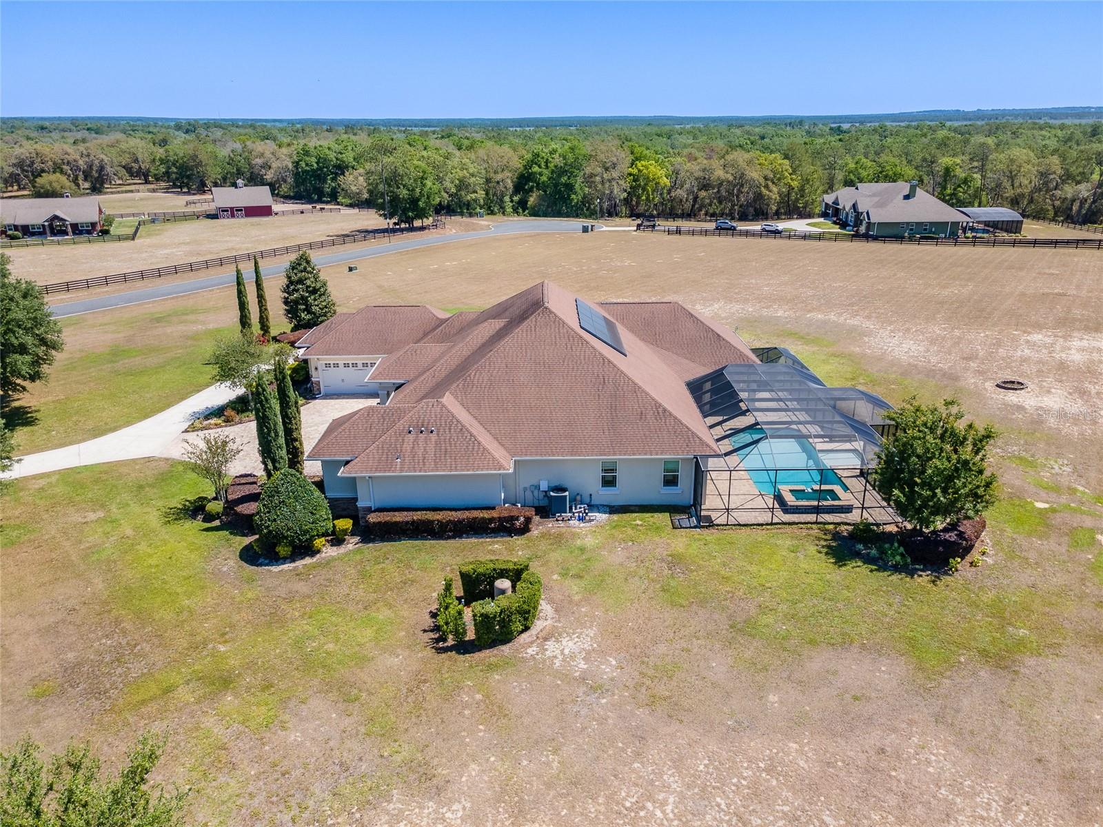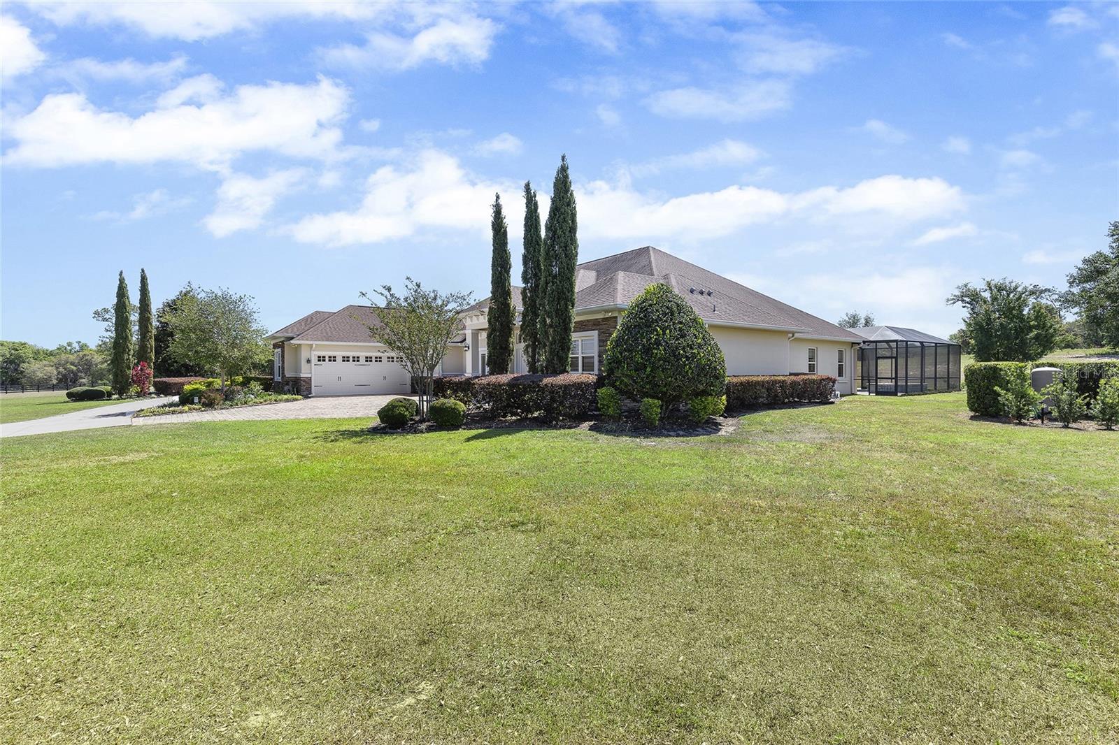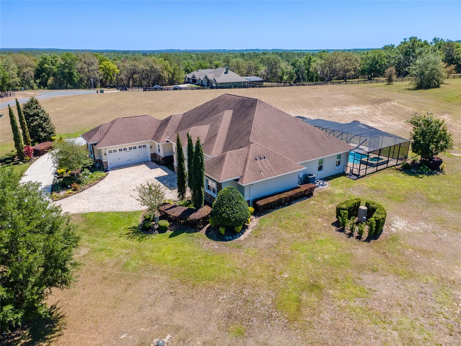 Welcome Home ! PRICE IMPROVEMENT - Don't let this one slip through your fingers !! Nestled in the serene Saddle Ridge Community just minutes from The Villages, this stately stucco home offers an unparalleled blend of luxury and tranquility. Spanning 4,218 square feet of living space on nearly 4 acres of meticulously manicured grounds, this estate boasts privacy and natural beauty. The property features a 3-car garage with 10' ceilings, a Tesla battery wall, and an electric car charger, offering convenient, energy-efficient options for electric vehicles. Additionally, the home includes a private pickleball court, complemented by a pavered rear screened enclosure surrounding the sparkling heated saltwater pool. This custom built home showcases 5 bedrooms and 3.5 baths, including an impressive primary en-suite and an additional en-suite bed-bath combination. Inside, discover 7" baseboards, crown molding, tray ceilings, and volume ceilings throughout, enhancing the spacious and elegant atmosphere. The main areas feature engineered wood flooring, while modern lighting illuminates every corner. The gourmet kitchen is a chef's dream, featuring beautiful quartz countertops, an abundance of cabinetry, and ample countertop space perfect for both meal prep and entertaining. The kitchen also boasts custom cabinets, a walk-in pantry, a hot water heater at the sink for instant hot water, and a gas stove for cooking. Enjoy the eat-in space situated next to the pool and view of the property, plus a spacious separate formal dining room for entertaining. Primary suite is spacious with door-entry to the pool and The home’s energy efficiency is elevated with a fully paid-for solar panel system, offering significant energy savings and reducing your carbon footprint. This environmentally friendly addition ensures lower utility bills, providing both financial savings and peace of mind while maintaining modern luxury living. Additionally, the primary bedroom retreat includes two huge walk-in closets and a luxurious bathroom with an expansive shower, soaking tub, and separate vanities. Enjoy the natural beauty of the property from the living room of this home and enjoy the modern gas fireplace accent wall. Coffered and crowned ceilings are an amazing architectural detail you'll enjoy. The property also boasts its own private pickleball court, perfect for both recreation and exercise right in your backyard. Termite Bond renewed March 2025. Additional features include a fully restored Yamaha gas golf cart and an exceptional location within a tranquil gated community. Saddle Ridge offers low HOA dues, exclusive access to approximately 300 acres of wildlife preserve, and just 22 lots, ensuring a private and serene setting. Experience the ultimate in energy-efficient, luxury living. Schedule your private tour today and make this extraordinary estate your new home.