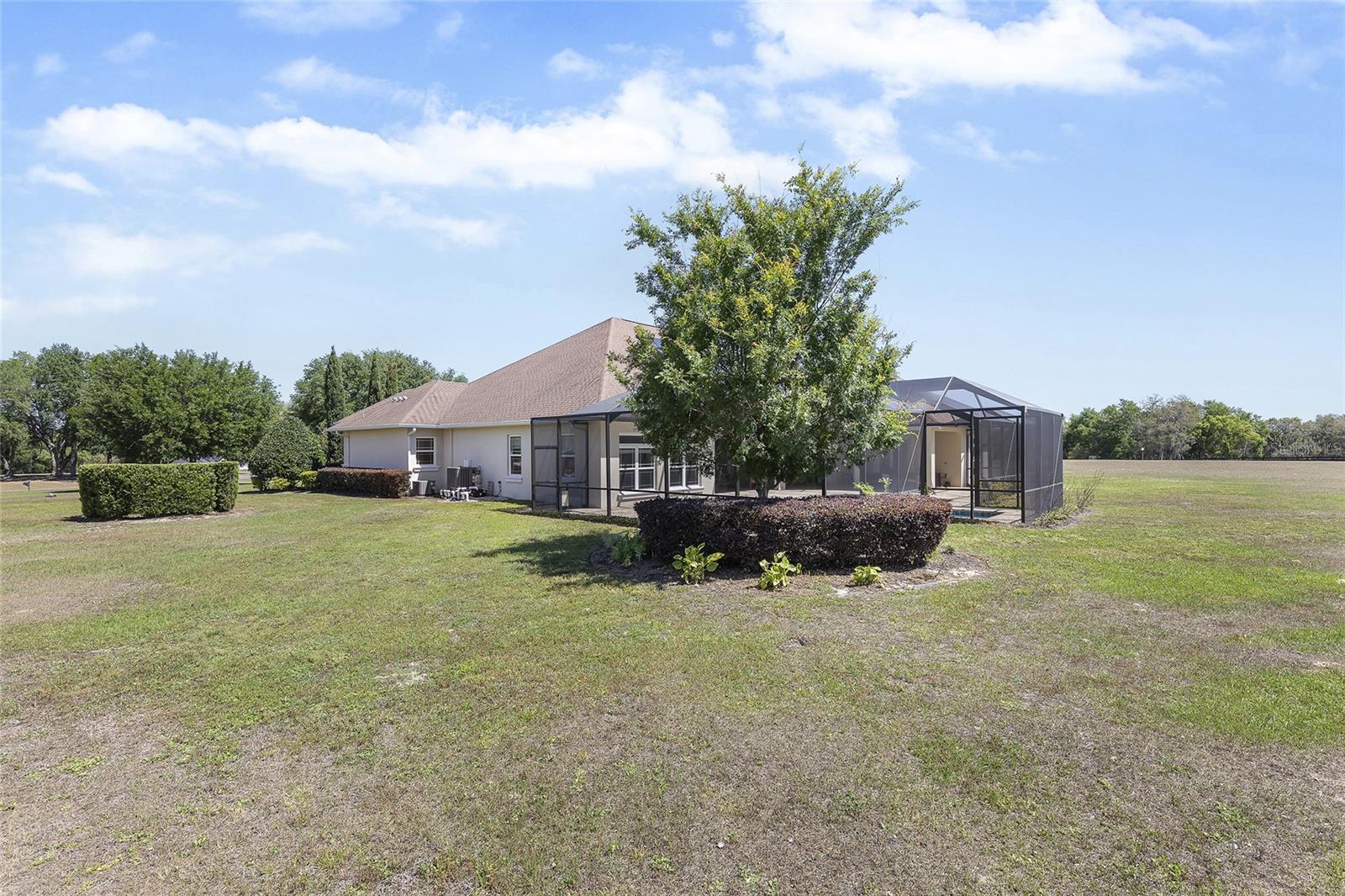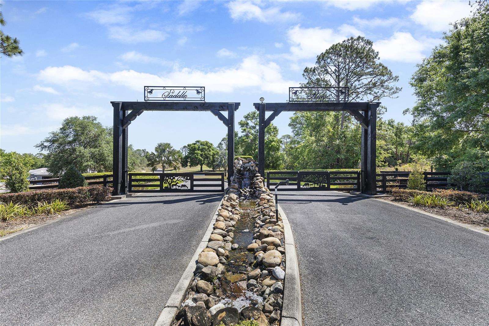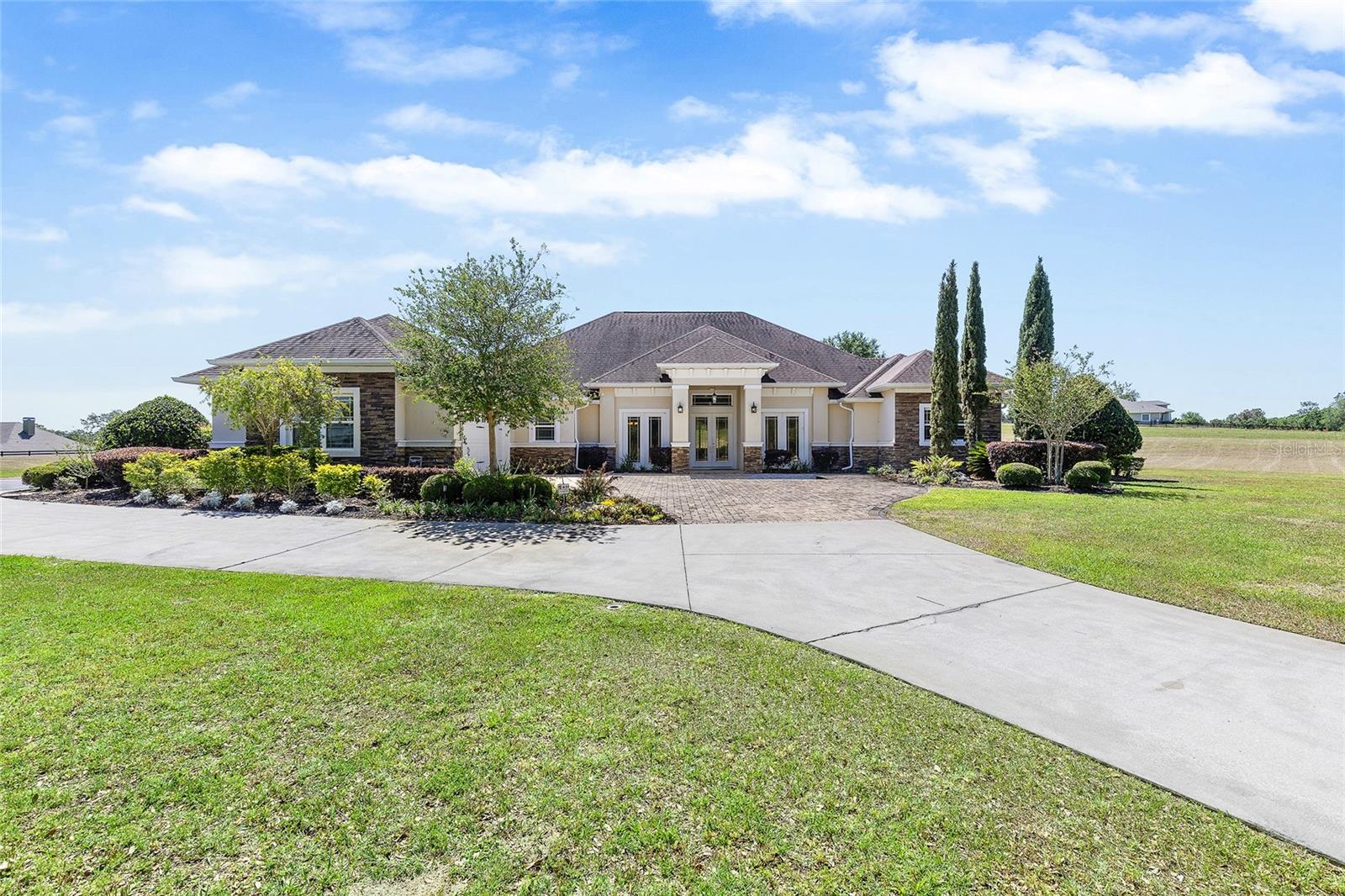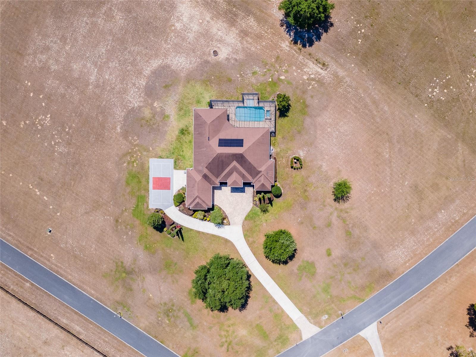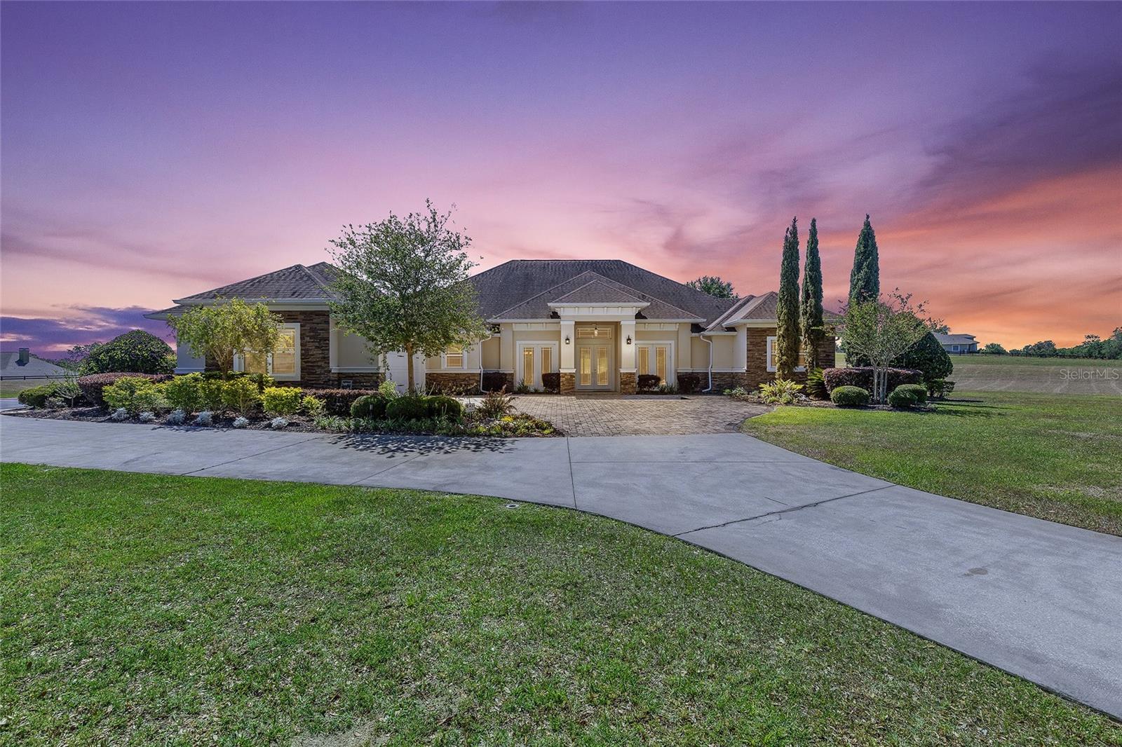 Welcome Home ! PRICE IMPROVEMENT - Don't let this one slip through your fingers !! Nestled in the serene Saddle Ridge Community just minutes from The Villages, this stately stucco home offers an unparalleled blend of luxury and tranquility. Spanning 4,218 square feet of living space on nearly 4 acres of meticulously manicured grounds, this estate boasts privacy and natural beauty. The property features a 3-car garage with 10' ceilings, a Tesla battery wall, and an electric car charger, offering convenient, energy-efficient options for electric vehicles. Additionally, the home includes a private pickleball court, complemented by a pavered rear screened enclosure surrounding the sparkling heated saltwater pool. This custom built home showcases 5 bedrooms and 3.5 baths, including an impressive primary en-suite and an additional en-suite bed-bath combination. Inside, discover 7" baseboards, crown molding, tray ceilings, and volume ceilings throughout, enhancing the spacious and elegant atmosphere. The main areas feature engineered wood flooring, while modern lighting illuminates every corner. The gourmet kitchen is a chef's dream, featuring beautiful quartz countertops, an abundance of cabinetry, and ample countertop space perfect for both meal prep and entertaining. The kitchen also boasts custom cabinets, a walk-in pantry, a hot water heater at the sink for instant hot water, and a gas stove for cooking. Enjoy the eat-in space situated next to the pool and view of the property, plus a spacious separate formal dining room for entertaining. Primary suite is spacious with door-entry to the pool and The home’s energy efficiency is elevated with a fully paid-for solar panel system, offering significant energy savings and reducing your carbon footprint. This environmentally friendly addition ensures lower utility bills, providing both financial savings and peace of mind while maintaining modern luxury living. Additionally, the primary bedroom retreat includes two huge walk-in closets and a luxurious bathroom with an expansive shower, soaking tub, and separate vanities. Enjoy the natural beauty of the property from the living room of this home and enjoy the modern gas fireplace accent wall. Coffered and crowned ceilings are an amazing architectural detail you'll enjoy. The property also boasts its own private pickleball court, perfect for both recreation and exercise right in your backyard. Termite Bond renewed March 2025. Additional features include a fully restored Yamaha gas golf cart and an exceptional location within a tranquil gated community. Saddle Ridge offers low HOA dues, exclusive access to approximately 300 acres of wildlife preserve, and just 22 lots, ensuring a private and serene setting. Experience the ultimate in energy-efficient, luxury living. Schedule your private tour today and make this extraordinary estate your new home.