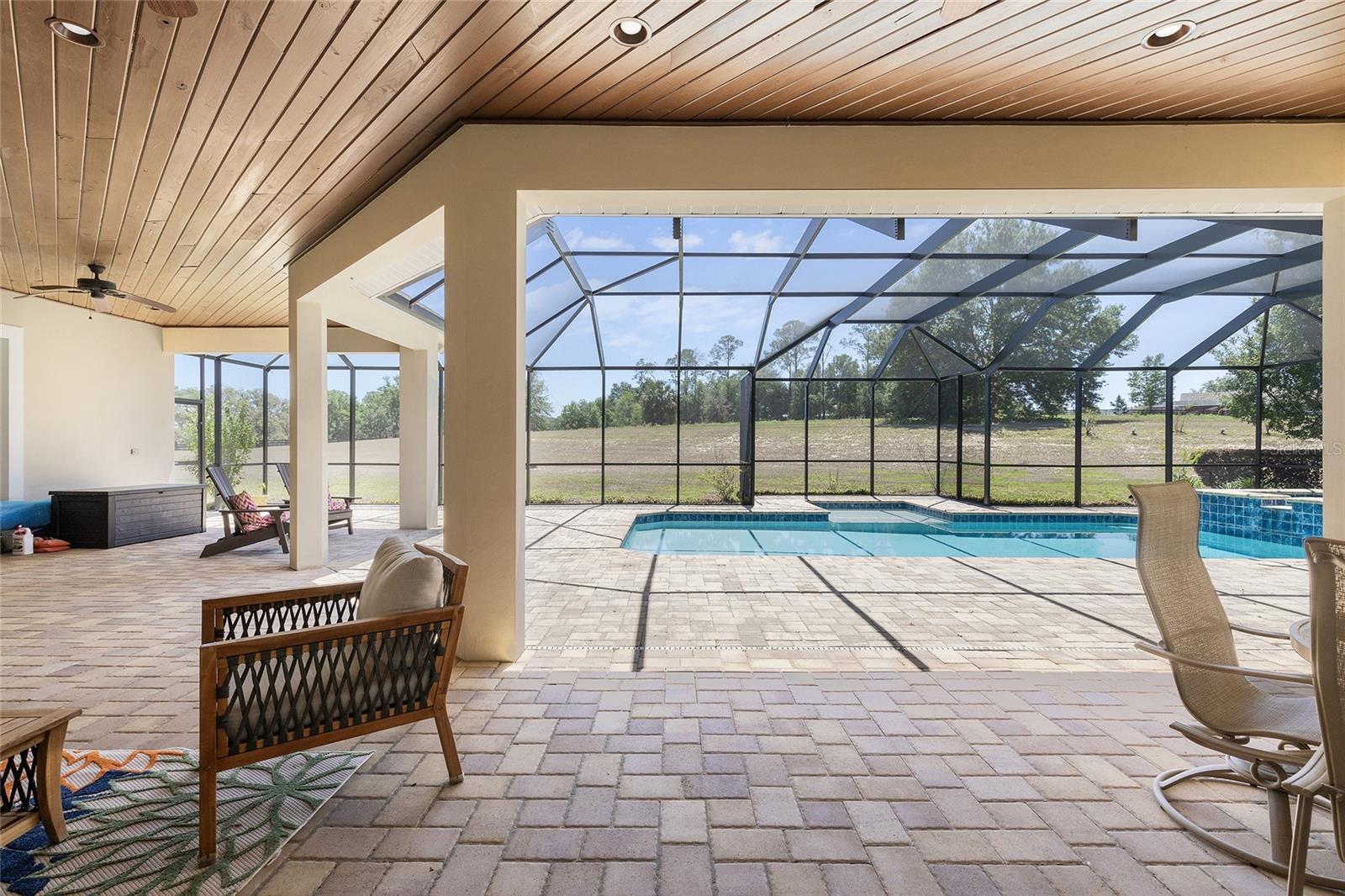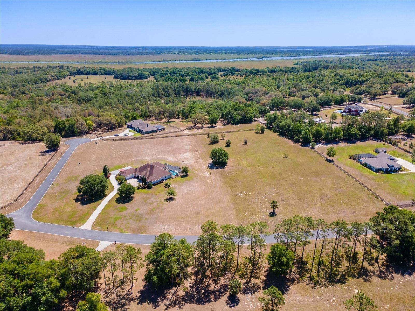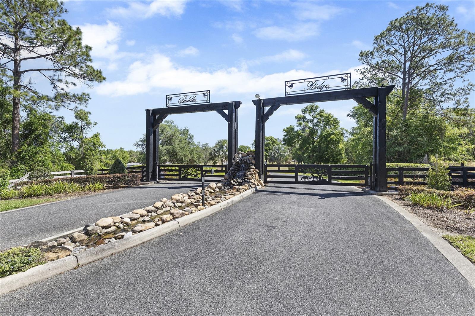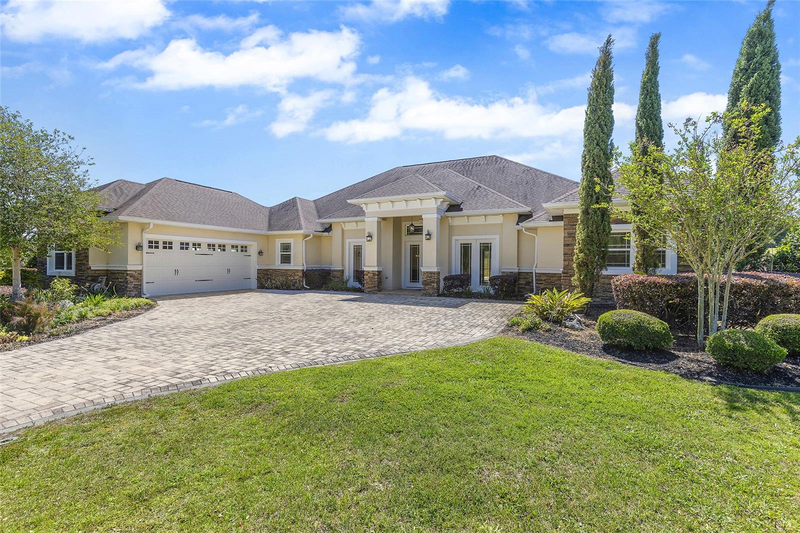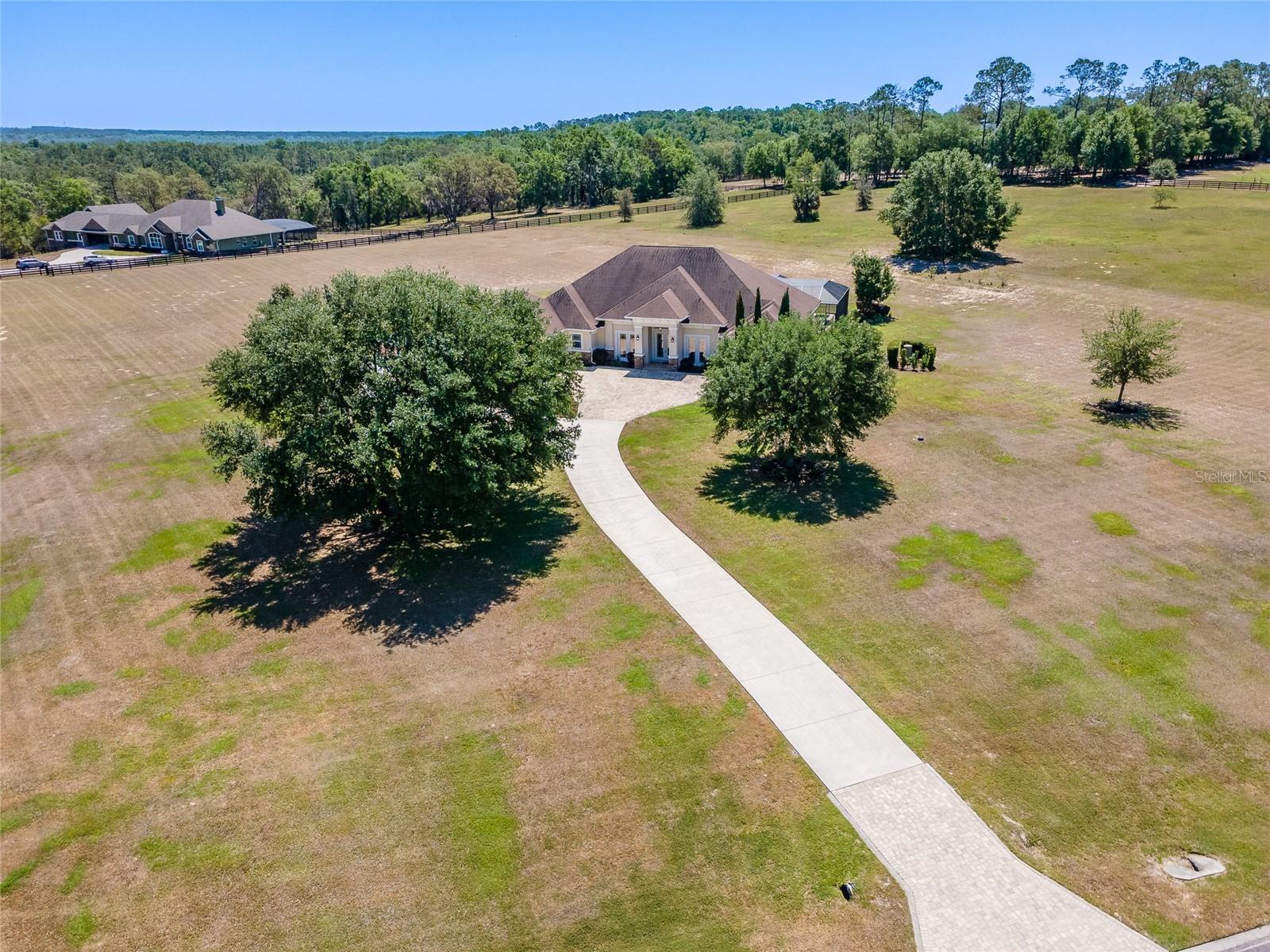 Welcome Home ! PRICE IMPROVEMENT - Don't let this one slip through your fingers !! Nestled in the serene Saddle Ridge Community just minutes from The Villages, this stately stucco home offers an unparalleled blend of luxury and tranquility. Spanning 4,218 square feet of living space on nearly 4 acres of meticulously manicured grounds, this estate boasts privacy and natural beauty. The property features a 3-car garage with 10' ceilings, a Tesla battery wall, and an electric car charger, offering convenient, energy-efficient options for electric vehicles. Additionally, the home includes a private pickleball court, complemented by a pavered rear screened enclosure surrounding the sparkling heated saltwater pool. This custom built home showcases 5 bedrooms and 3.5 baths, including an impressive primary en-suite and an additional en-suite bed-bath combination. Inside, discover 7" baseboards, crown molding, tray ceilings, and volume ceilings throughout, enhancing the spacious and elegant atmosphere. The main areas feature engineered wood flooring, while modern lighting illuminates every corner. The gourmet kitchen is a chef's dream, featuring beautiful quartz countertops, an abundance of cabinetry, and ample countertop space perfect for both meal prep and entertaining. The kitchen also boasts custom cabinets, a walk-in pantry, a hot water heater at the sink for instant hot water, and a gas stove for cooking. Enjoy the eat-in space situated next to the pool and view of the property, plus a spacious separate formal dining room for entertaining. Primary suite is spacious with door-entry to the pool and The home’s energy efficiency is elevated with a fully paid-for solar panel system, offering significant energy savings and reducing your carbon footprint. This environmentally friendly addition ensures lower utility bills, providing both financial savings and peace of mind while maintaining modern luxury living. Additionally, the primary bedroom retreat includes two huge walk-in closets and a luxurious bathroom with an expansive shower, soaking tub, and separate vanities. Enjoy the natural beauty of the property from the living room of this home and enjoy the modern gas fireplace accent wall. Coffered and crowned ceilings are an amazing architectural detail you'll enjoy. The property also boasts its own private pickleball court, perfect for both recreation and exercise right in your backyard. Termite Bond renewed March 2025. Additional features include a fully restored Yamaha gas golf cart and an exceptional location within a tranquil gated community. Saddle Ridge offers low HOA dues, exclusive access to approximately 300 acres of wildlife preserve, and just 22 lots, ensuring a private and serene setting. Experience the ultimate in energy-efficient, luxury living. Schedule your private tour today and make this extraordinary estate your new home.