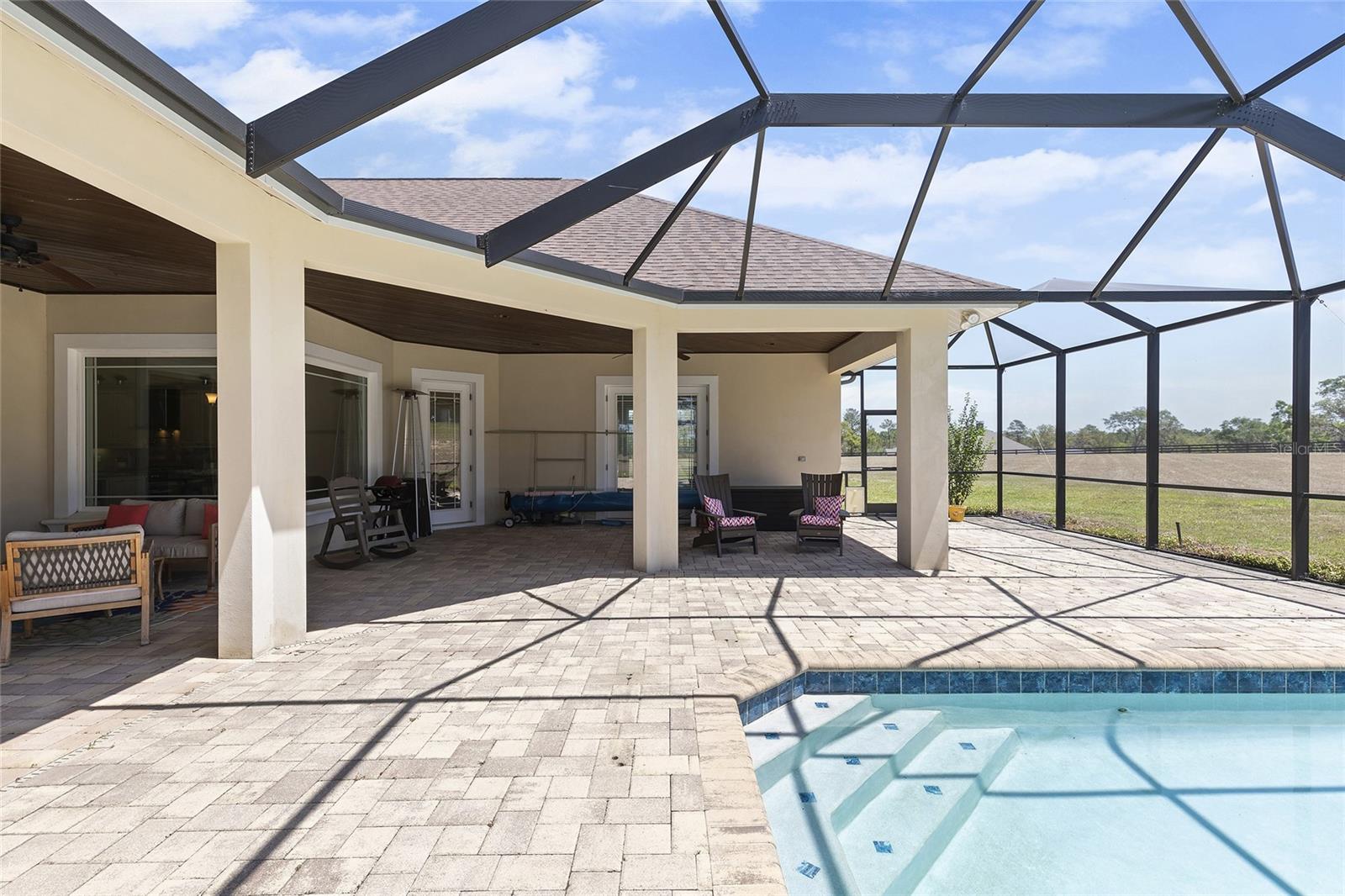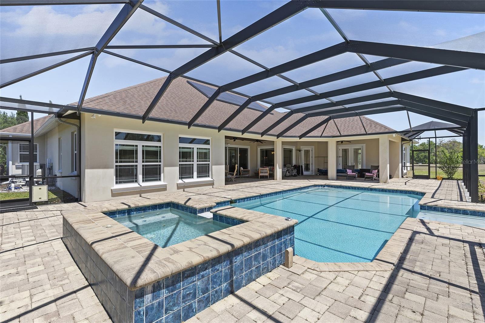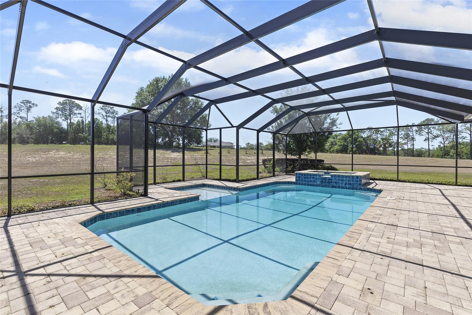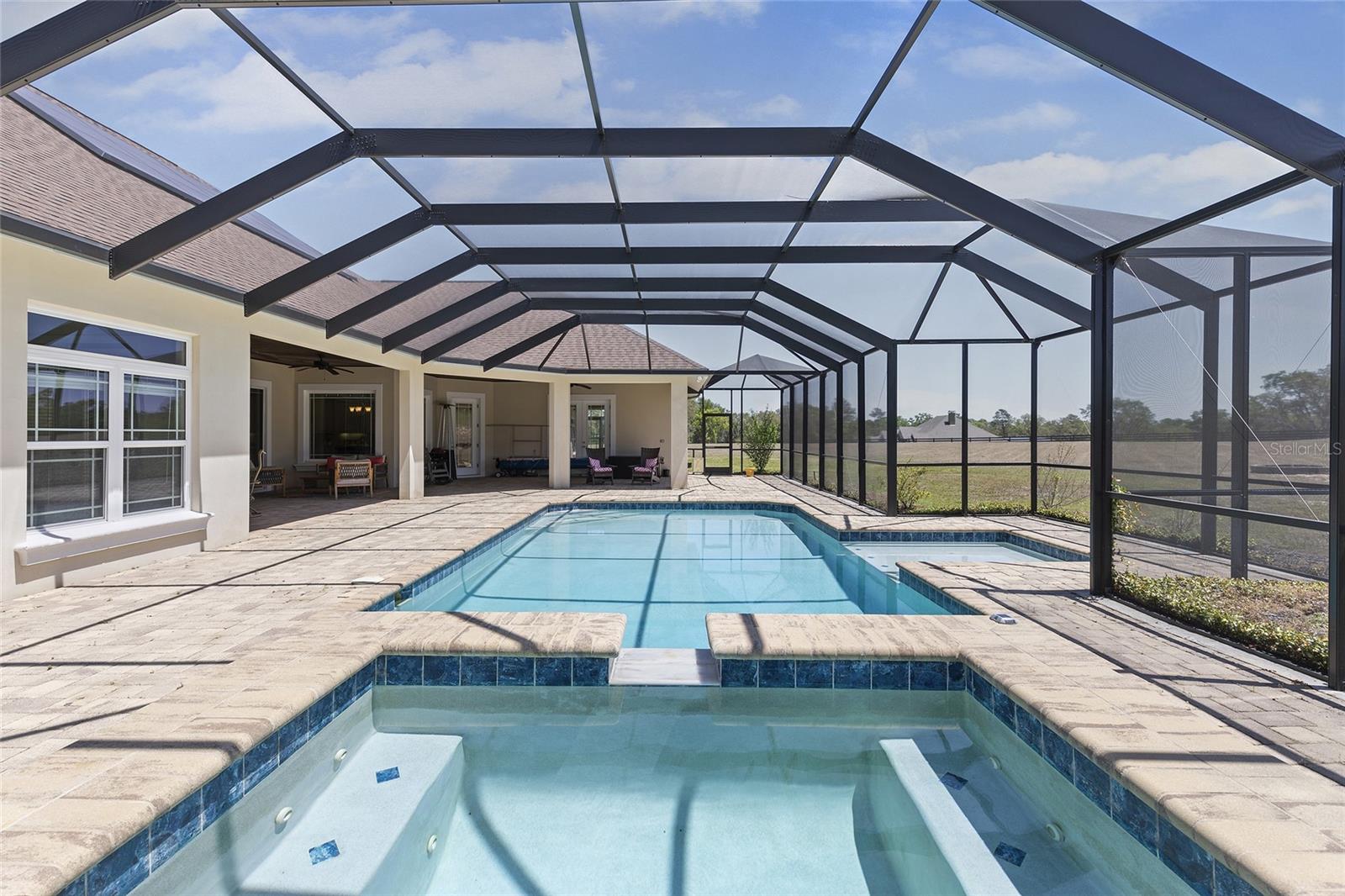 Welcome Home ! PRICE IMPROVEMENT - Don't let this one slip through your fingers !! Nestled in the serene Saddle Ridge Community just minutes from The Villages, this stately stucco home offers an unparalleled blend of luxury and tranquility. Spanning 4,218 square feet of living space on nearly 4 acres of meticulously manicured grounds, this estate boasts privacy and natural beauty. The property features a 3-car garage with 10' ceilings, a Tesla battery wall, and an electric car charger, offering convenient, energy-efficient options for electric vehicles. Additionally, the home includes a private pickleball court, complemented by a pavered rear screened enclosure surrounding the sparkling heated saltwater pool. This custom built home showcases 5 bedrooms and 3.5 baths, including an impressive primary en-suite and an additional en-suite bed-bath combination. Inside, discover 7" baseboards, crown molding, tray ceilings, and volume ceilings throughout, enhancing the spacious and elegant atmosphere. The main areas feature engineered wood flooring, while modern lighting illuminates every corner. The gourmet kitchen is a chef's dream, featuring beautiful quartz countertops, an abundance of cabinetry, and ample countertop space perfect for both meal prep and entertaining. The kitchen also boasts custom cabinets, a walk-in pantry, a hot water heater at the sink for instant hot water, and a gas stove for cooking. Enjoy the eat-in space situated next to the pool and view of the property, plus a spacious separate formal dining room for entertaining. Primary suite is spacious with door-entry to the pool and The home’s energy efficiency is elevated with a fully paid-for solar panel system, offering significant energy savings and reducing your carbon footprint. This environmentally friendly addition ensures lower utility bills, providing both financial savings and peace of mind while maintaining modern luxury living. Additionally, the primary bedroom retreat includes two huge walk-in closets and a luxurious bathroom with an expansive shower, soaking tub, and separate vanities. Enjoy the natural beauty of the property from the living room of this home and enjoy the modern gas fireplace accent wall. Coffered and crowned ceilings are an amazing architectural detail you'll enjoy. The property also boasts its own private pickleball court, perfect for both recreation and exercise right in your backyard. Termite Bond renewed March 2025. Additional features include a fully restored Yamaha gas golf cart and an exceptional location within a tranquil gated community. Saddle Ridge offers low HOA dues, exclusive access to approximately 300 acres of wildlife preserve, and just 22 lots, ensuring a private and serene setting. Experience the ultimate in energy-efficient, luxury living. Schedule your private tour today and make this extraordinary estate your new home.