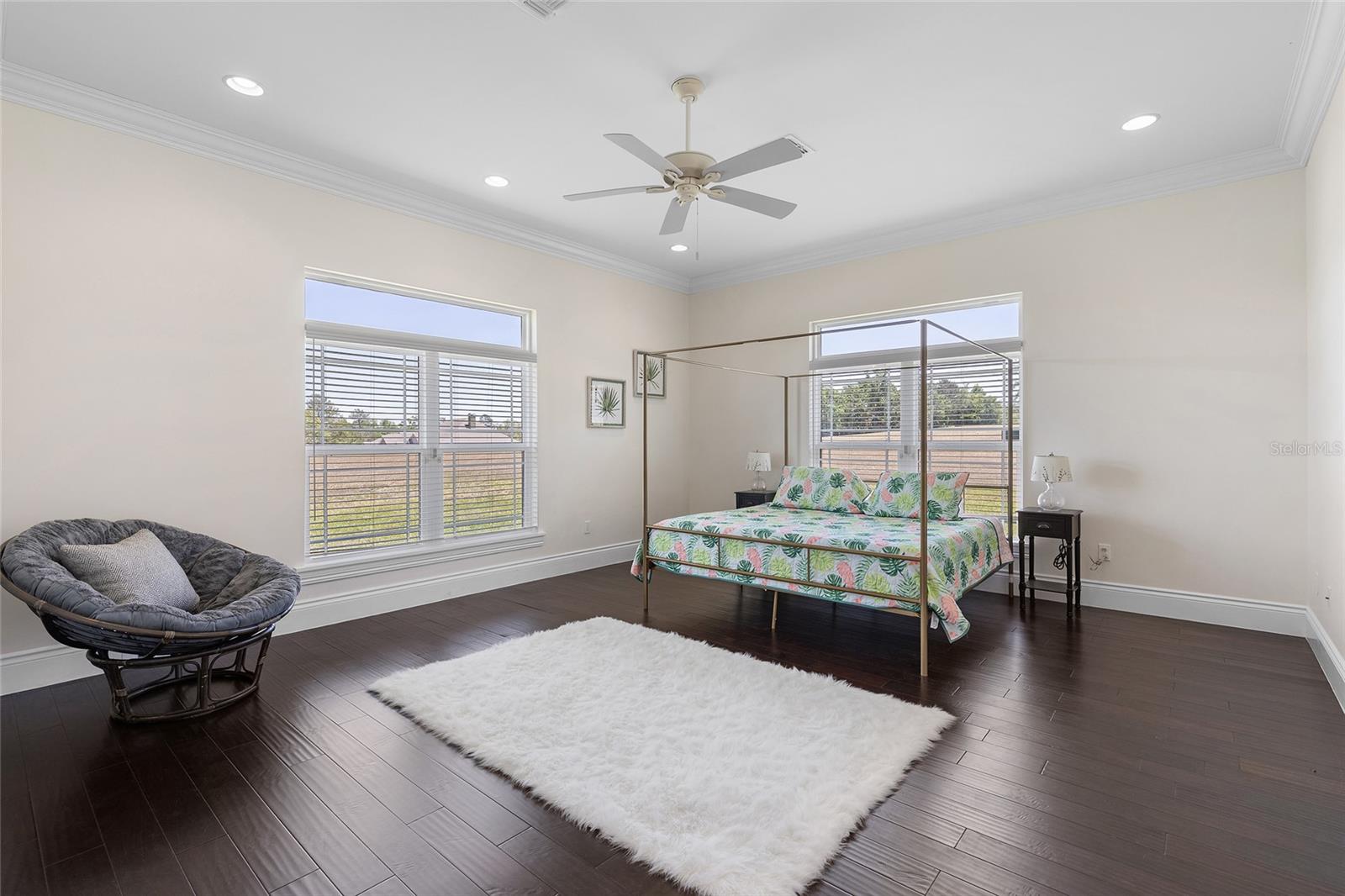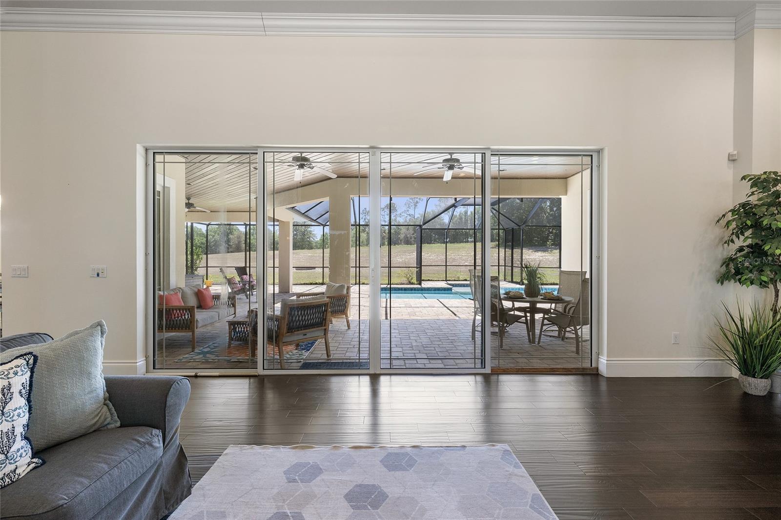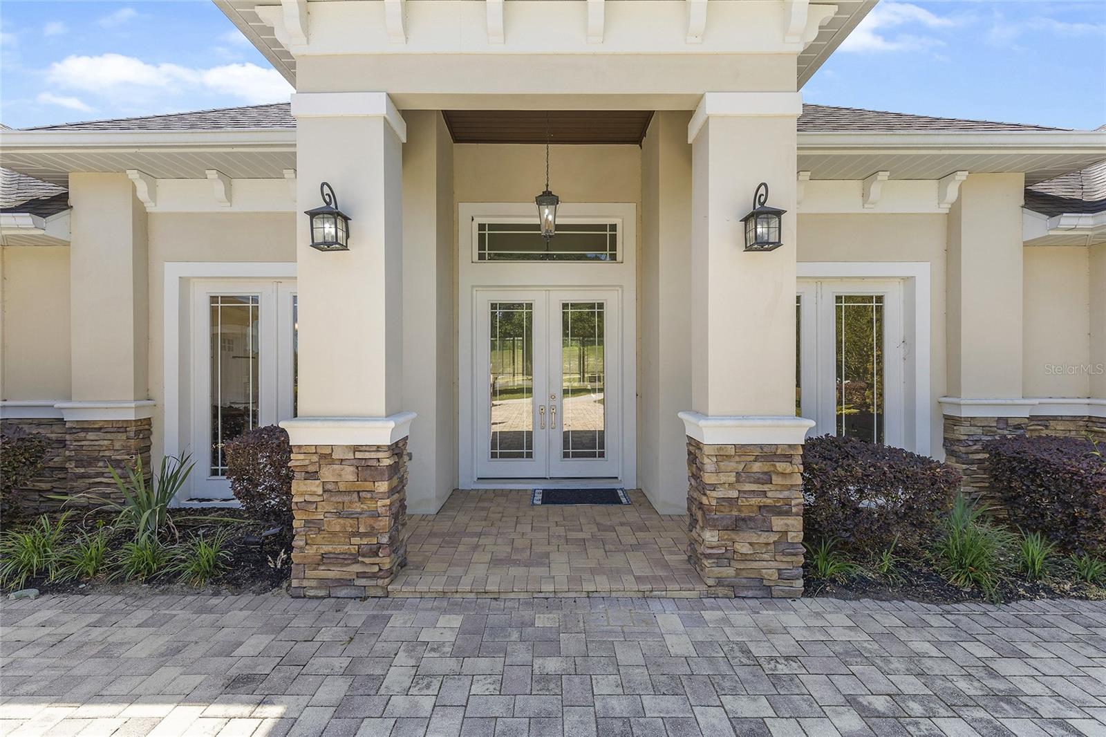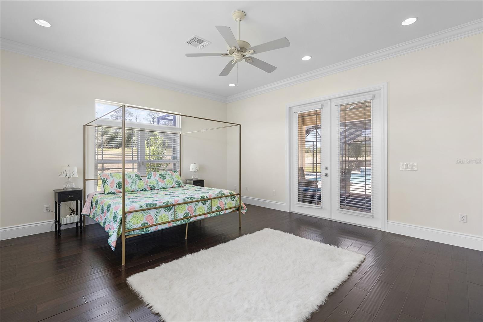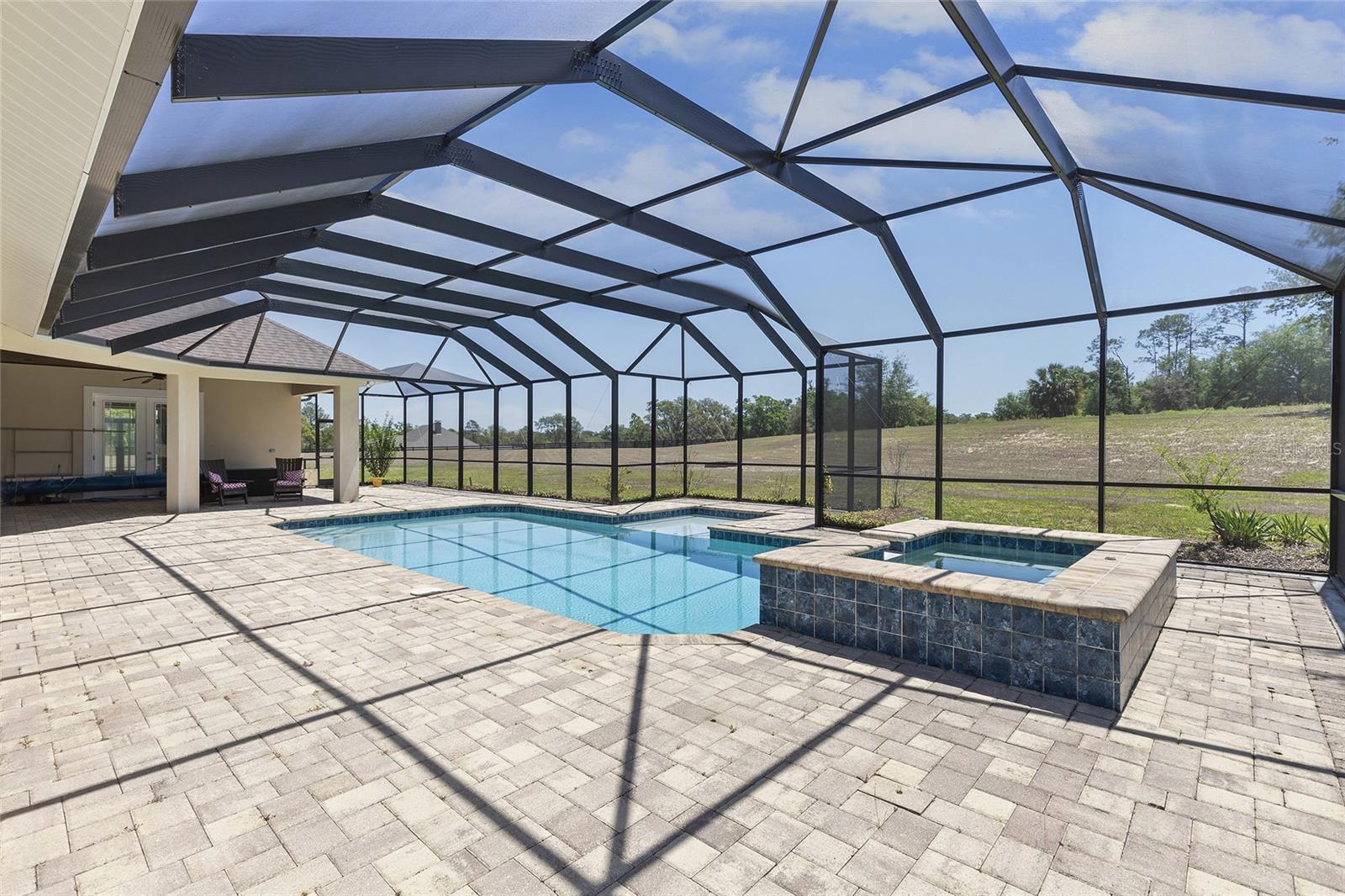 Welcome Home ! PRICE IMPROVEMENT - Don't let this one slip through your fingers !! Nestled in the serene Saddle Ridge Community just minutes from The Villages, this stately stucco home offers an unparalleled blend of luxury and tranquility. Spanning 4,218 square feet of living space on nearly 4 acres of meticulously manicured grounds, this estate boasts privacy and natural beauty. The property features a 3-car garage with 10' ceilings, a Tesla battery wall, and an electric car charger, offering convenient, energy-efficient options for electric vehicles. Additionally, the home includes a private pickleball court, complemented by a pavered rear screened enclosure surrounding the sparkling heated saltwater pool. This custom built home showcases 5 bedrooms and 3.5 baths, including an impressive primary en-suite and an additional en-suite bed-bath combination. Inside, discover 7" baseboards, crown molding, tray ceilings, and volume ceilings throughout, enhancing the spacious and elegant atmosphere. The main areas feature engineered wood flooring, while modern lighting illuminates every corner. The gourmet kitchen is a chef's dream, featuring beautiful quartz countertops, an abundance of cabinetry, and ample countertop space perfect for both meal prep and entertaining. The kitchen also boasts custom cabinets, a walk-in pantry, a hot water heater at the sink for instant hot water, and a gas stove for cooking. Enjoy the eat-in space situated next to the pool and view of the property, plus a spacious separate formal dining room for entertaining. Primary suite is spacious with door-entry to the pool and The home’s energy efficiency is elevated with a fully paid-for solar panel system, offering significant energy savings and reducing your carbon footprint. This environmentally friendly addition ensures lower utility bills, providing both financial savings and peace of mind while maintaining modern luxury living. Additionally, the primary bedroom retreat includes two huge walk-in closets and a luxurious bathroom with an expansive shower, soaking tub, and separate vanities. Enjoy the natural beauty of the property from the living room of this home and enjoy the modern gas fireplace accent wall. Coffered and crowned ceilings are an amazing architectural detail you'll enjoy. The property also boasts its own private pickleball court, perfect for both recreation and exercise right in your backyard. Termite Bond renewed March 2025. Additional features include a fully restored Yamaha gas golf cart and an exceptional location within a tranquil gated community. Saddle Ridge offers low HOA dues, exclusive access to approximately 300 acres of wildlife preserve, and just 22 lots, ensuring a private and serene setting. Experience the ultimate in energy-efficient, luxury living. Schedule your private tour today and make this extraordinary estate your new home.