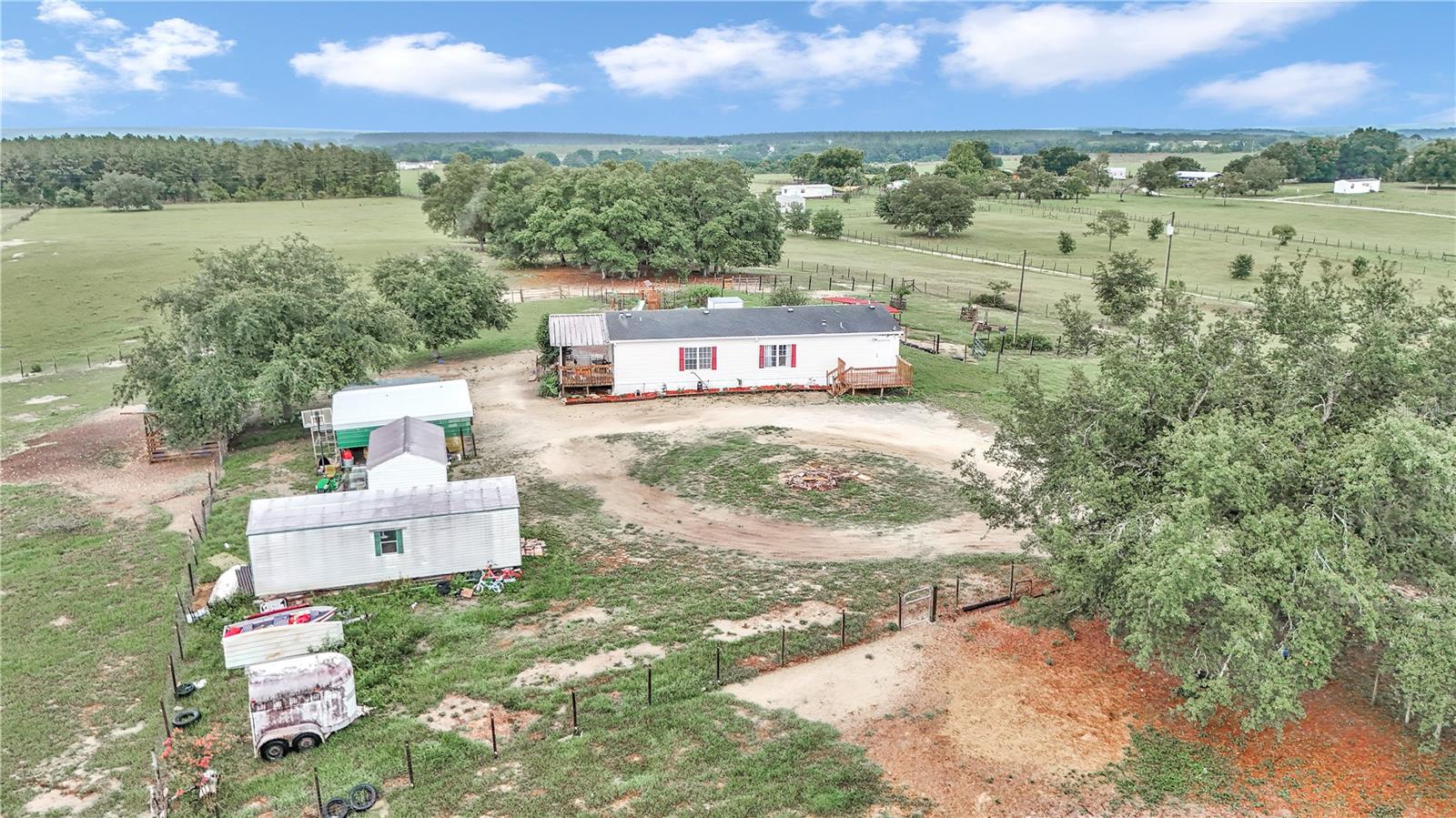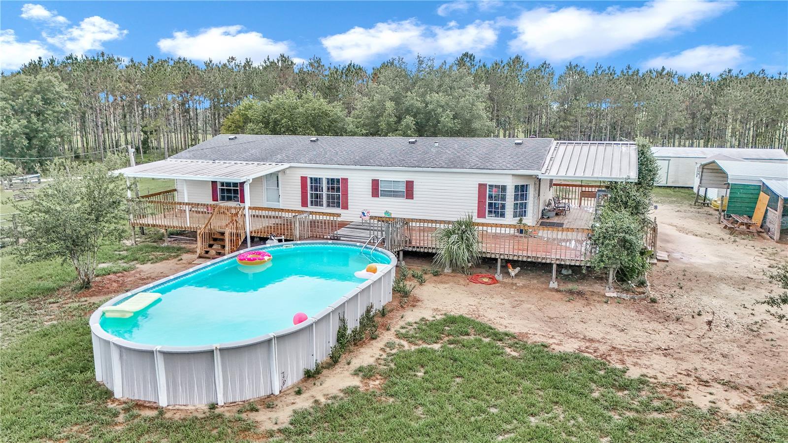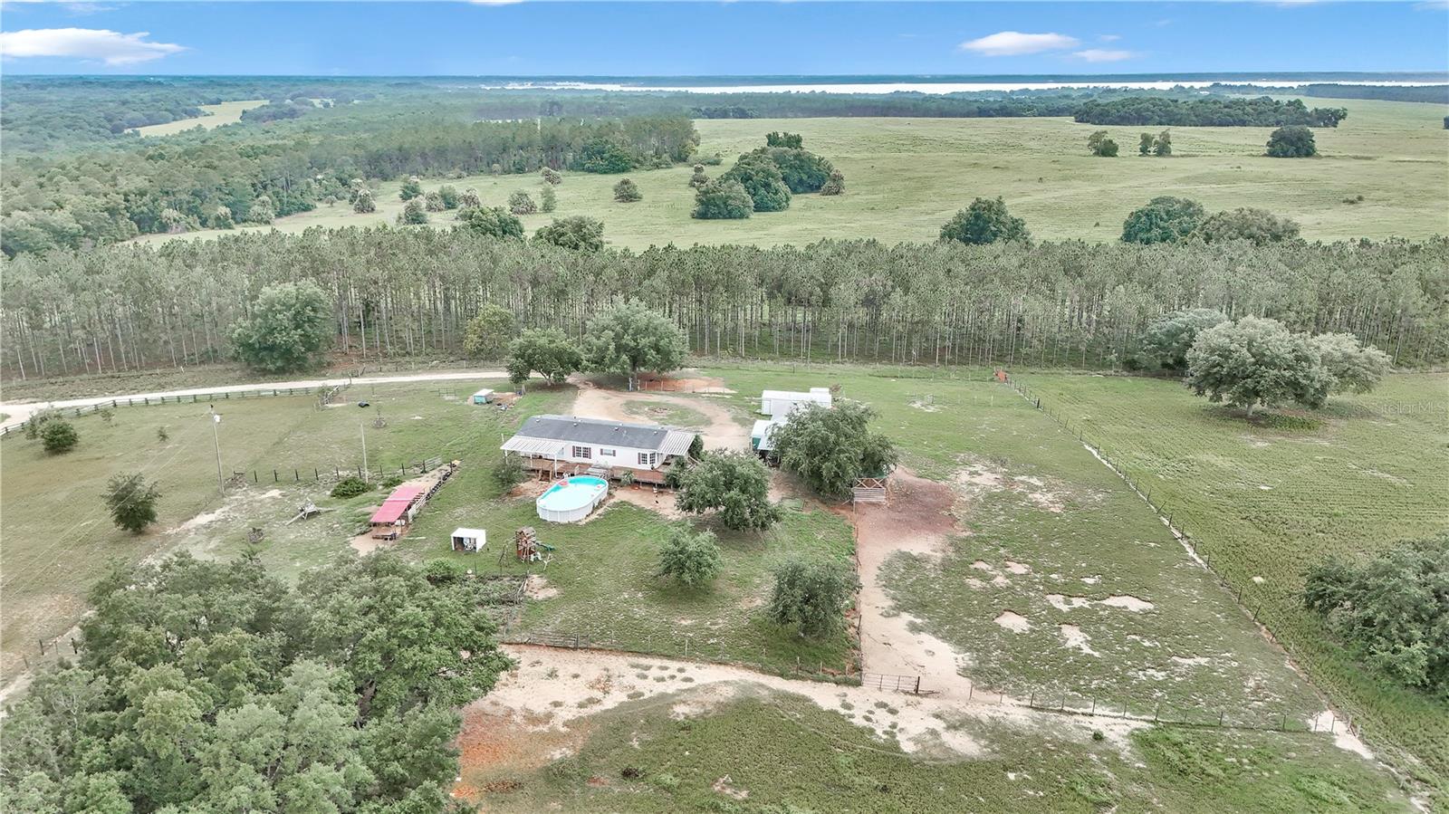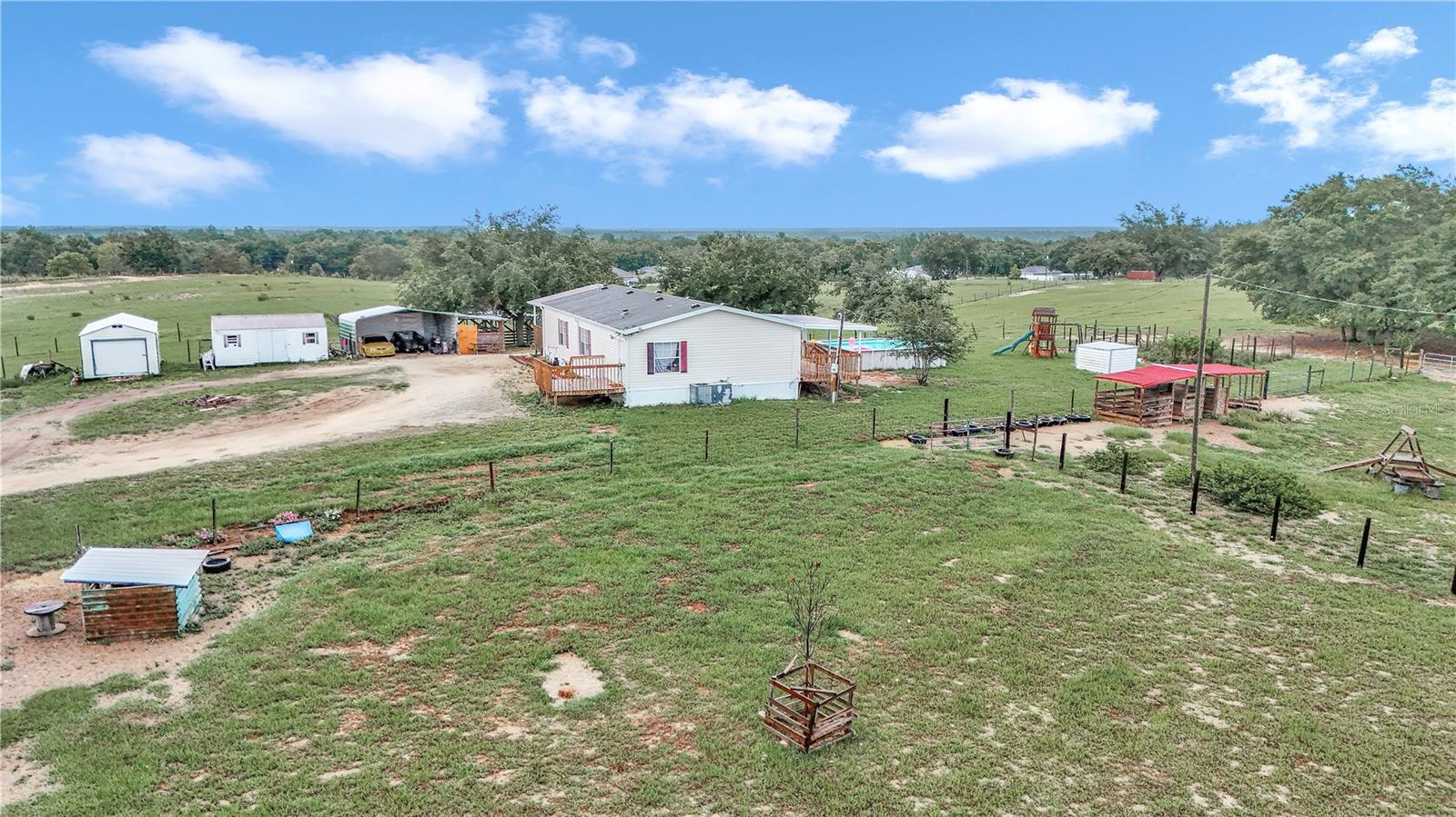 3 Bedroom 2 Bathroom home on 10 acres of pristine pasture land close to everything!! Featuring a split bedroom plan, breakfast nook in kitchen, large living and dining areas plus it's light & bright with plenty of windows. The Kitchen is a galley style and has an eating area that leads to a covered porch. The Kitchen faucet has a drinking water system as well as a filtration system at the well pump. Outside you will find 10 acres of fenced and cross fenced land, a 2 sheds a 2 car carport, a chicken coop, 3 paddocks with a large lean-to in each paddock. Water has been run to the paddocks in several places. A 33'x18' above ground pool, swing set, sand box and a fenced garden will keep you busy all day! A hand pump was installed on the 254 foot deep well and provides drinking quality water. The views from everywhere on this property are amazing! Located near all of the amenities of The Villages 24 miles from downtown Ocala featuring art galleries, restaurants and tons of entertainment. Located near Lake Wier and Eaton's Beach, plus the Ocala National Forest. Numerous equestrian related facilities such as Grand Oaks Resort (7.5 miles) and The World Equestrian Center (32 miles) are within an easy drive. This Property is at the end of unpaved road which allows for plenty of privacy in the countryside. This is country living at it's best!