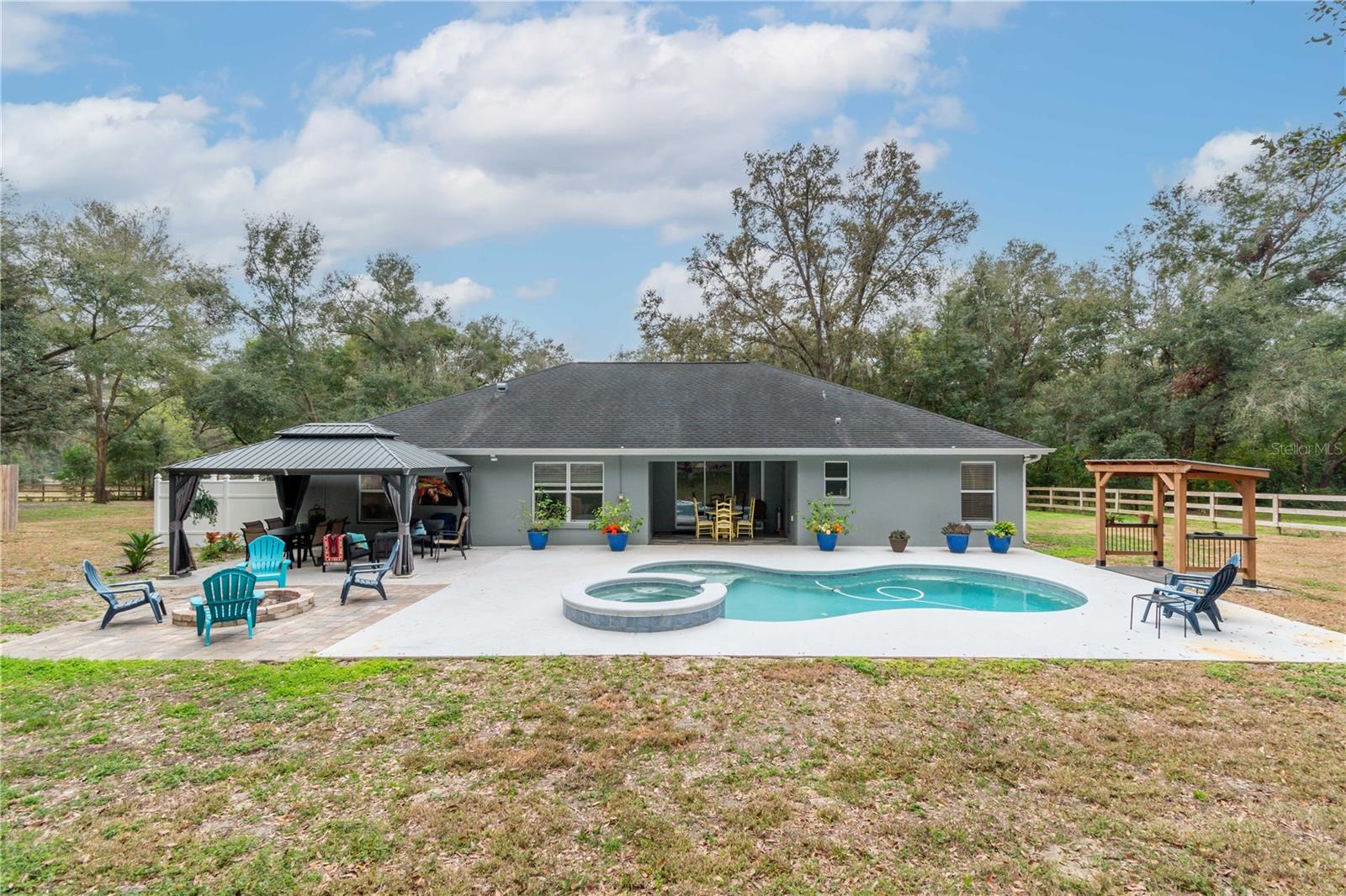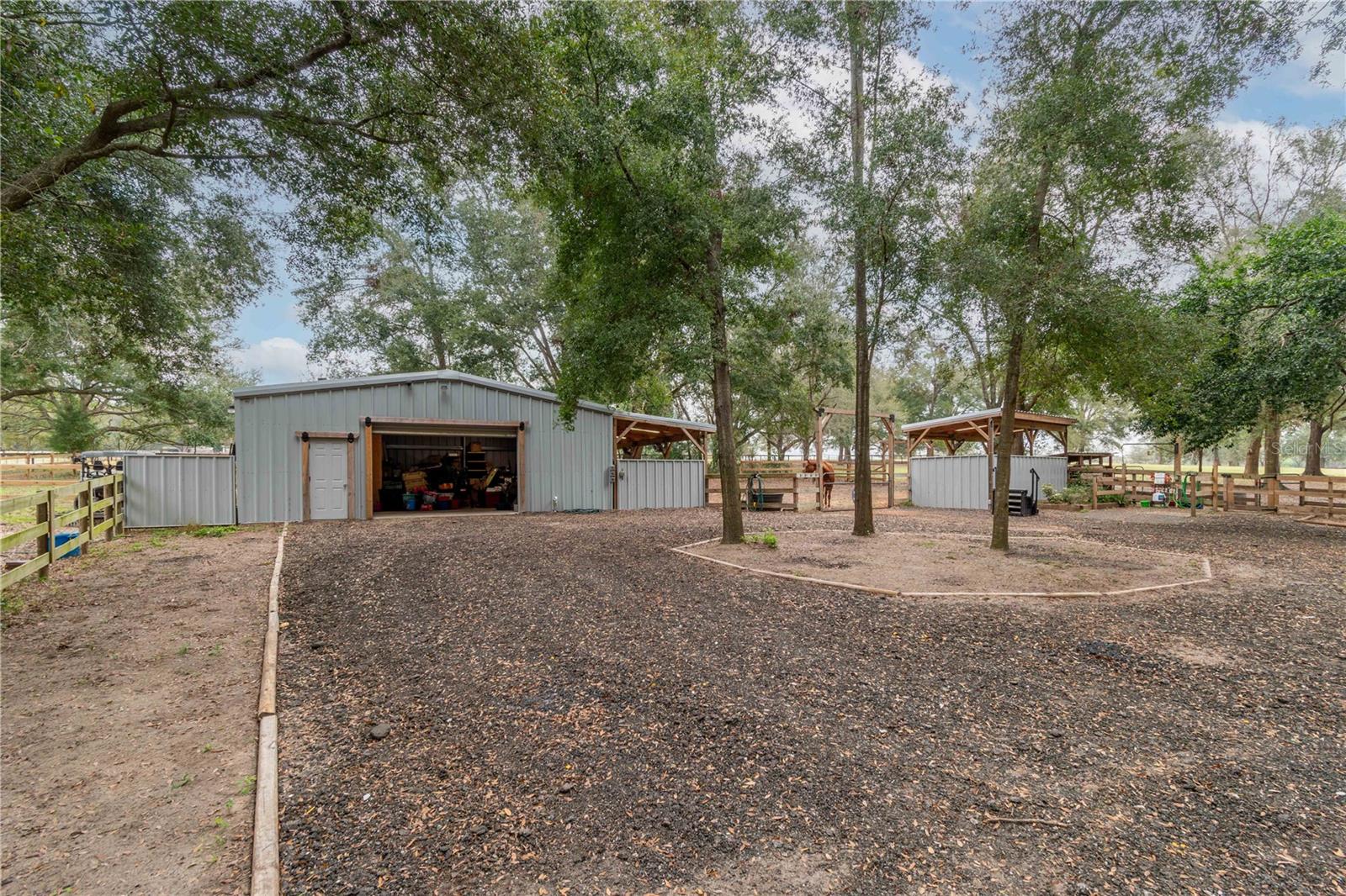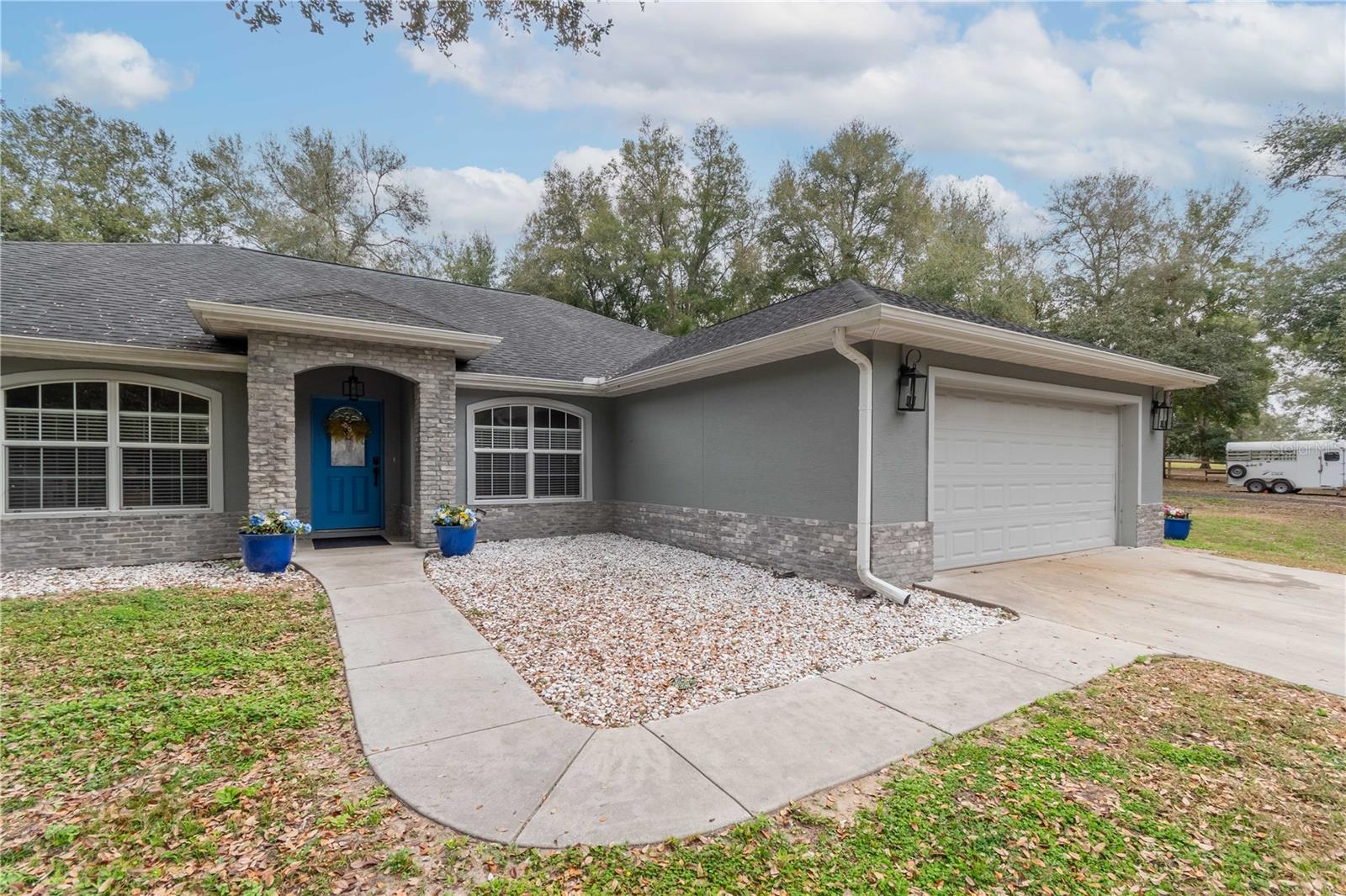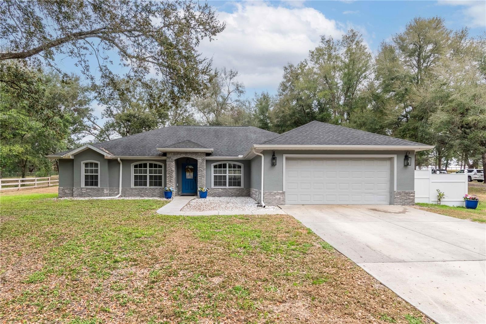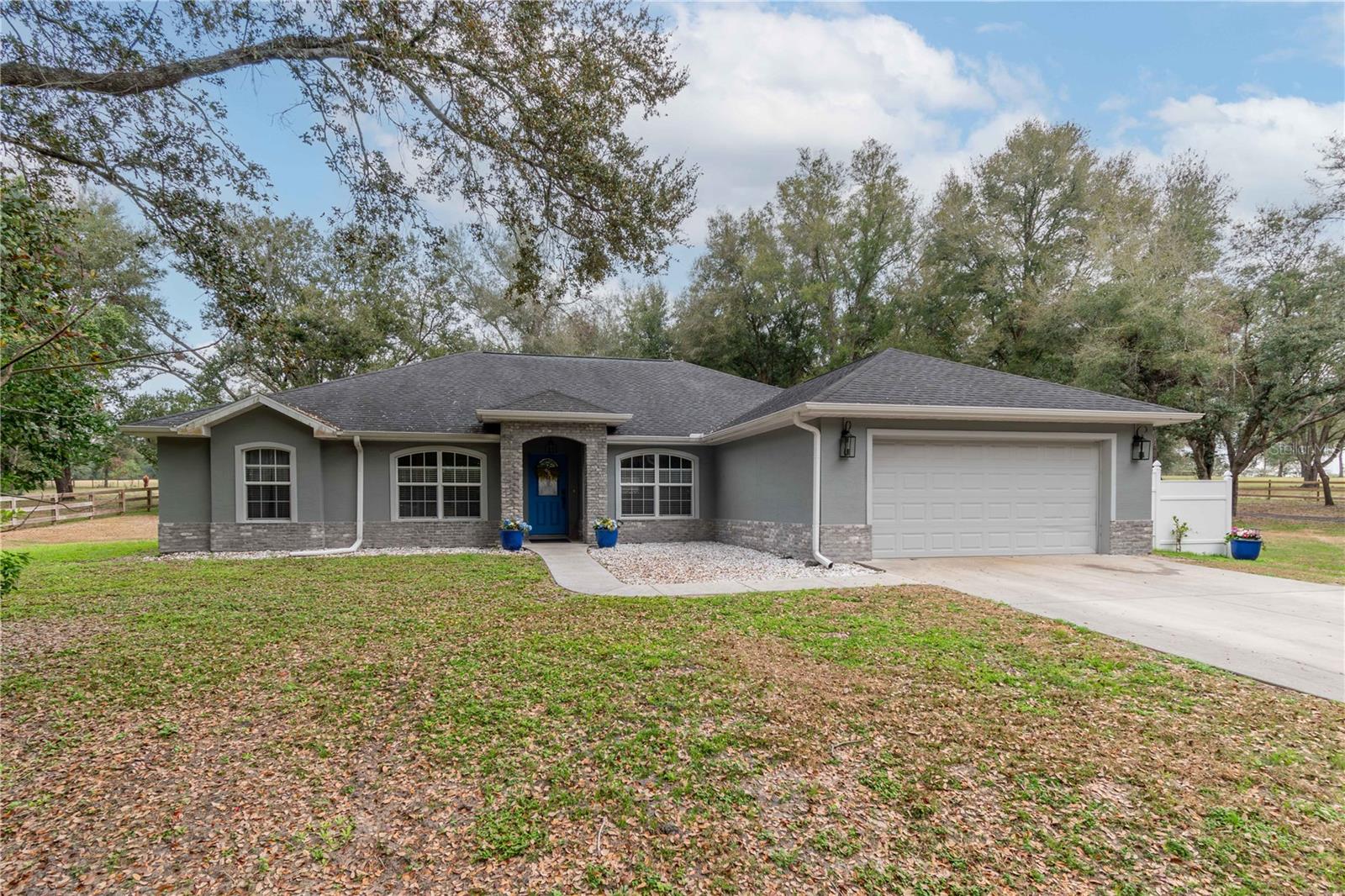Tucked behind a gated entrance, this stunning 4-bedroom, 3-bathroom home welcomes you with a grand 335-foot paved driveway, setting the stage for a private retreat on 4.79 picturesque acres. Built in 2014, this thoughtfully designed home offers an open and airy split floor plan, accentuated by vaulted ceilings and stylish wood-look porcelain tile flooring throughout. The spacious kitchen boasts ample cabinetry, granite countertops, a striking stone tile work, and a large pantry, making it both beautiful and functional. The expansive primary suite features a generous walk-in closet and a spa-like ensuite with a stunning tiled shower equipped with dual shower heads. On the opposite side of the home, three well-sized guest bedrooms provide comfort and privacy. When the Florida sun is at its peak, step outside to your patio and gazebo and take a refreshing dip in the in-ground pool or unwind in the hot tub under the stars. Mature trees provide gentle shade, while a privacy-fenced side yard offers a secure space for pets. The property is perfectly suited for equestrian enthusiasts, offering three fenced paddocks, a well-equipped metal barn with five full stalls, a mini stall, a feed room, an air-conditioned tack room, and a wash rack. For added convenience, an RV hookup with electricity is also available. Located just minutes from Grand Oaks Resort, The Villages, and Lake Weir this exceptional property delivers the perfect blend of rural tranquility and modern comfort. Don’t miss your opportunity to own this unique slice of Florida paradise!