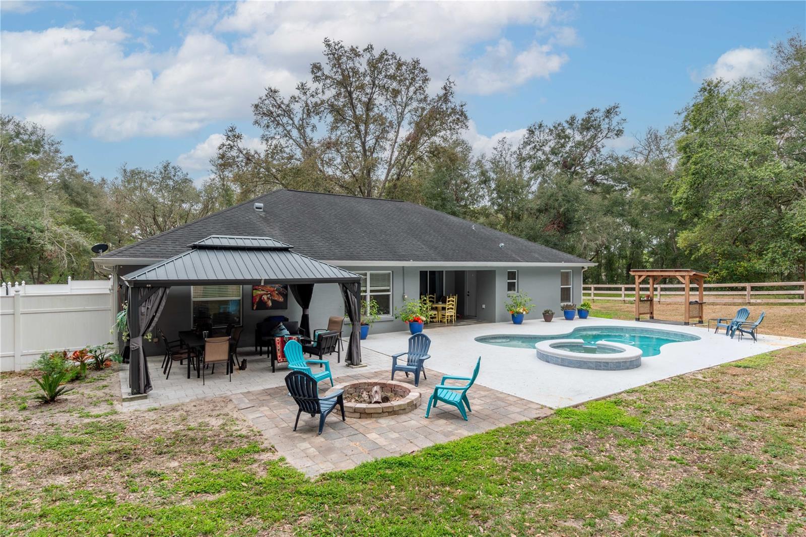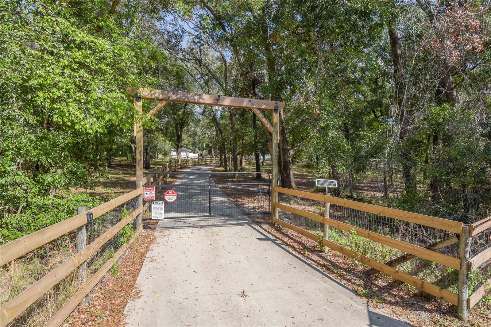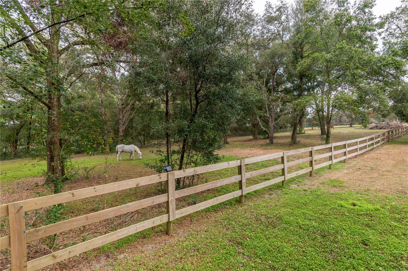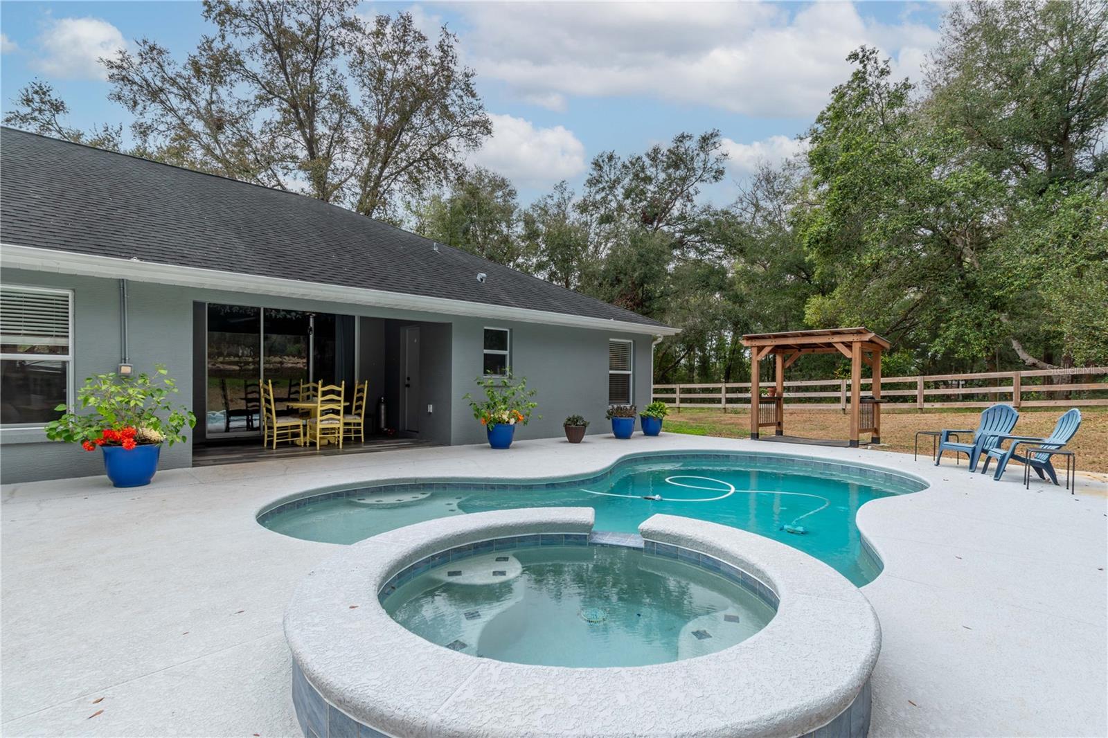 Tucked behind a gated entrance, this stunning 4-bedroom, 3-bathroom home welcomes you with a grand 335-foot paved driveway, setting the stage for a private retreat on 4.79 picturesque acres. Built in 2014, this thoughtfully designed home offers an open and airy split floor plan, accentuated by vaulted ceilings and stylish wood-look porcelain tile flooring throughout. The spacious kitchen boasts ample cabinetry, granite countertops, a striking stone tile work, and a large pantry, making it both beautiful and functional. The expansive primary suite features a generous walk-in closet and a spa-like ensuite with a stunning tiled shower equipped with dual shower heads. On the opposite side of the home, three well-sized guest bedrooms provide comfort and privacy. When the Florida sun is at its peak, step outside to your patio and gazebo and take a refreshing dip in the in-ground pool or unwind in the hot tub under the stars. Mature trees provide gentle shade, while a privacy-fenced side yard offers a secure space for pets. The property is perfectly suited for equestrian enthusiasts, offering three fenced paddocks, a well-equipped metal barn with five full stalls, a mini stall, a feed room, an air-conditioned tack room, and a wash rack. For added convenience, an RV hookup with electricity is also available. Located just minutes from Grand Oaks Resort, The Villages, and Lake Weir this exceptional property delivers the perfect blend of rural tranquility and modern comfort. Don’t miss your opportunity to own this unique slice of Florida paradise!