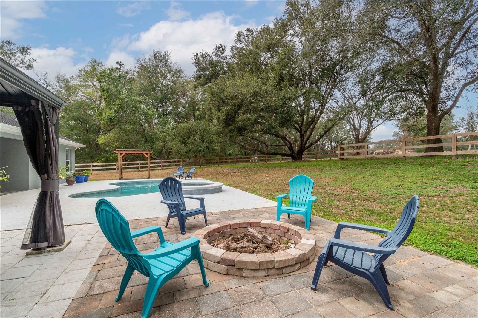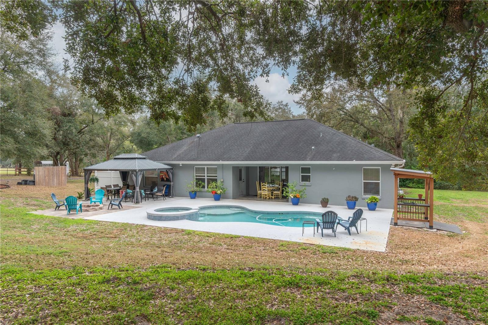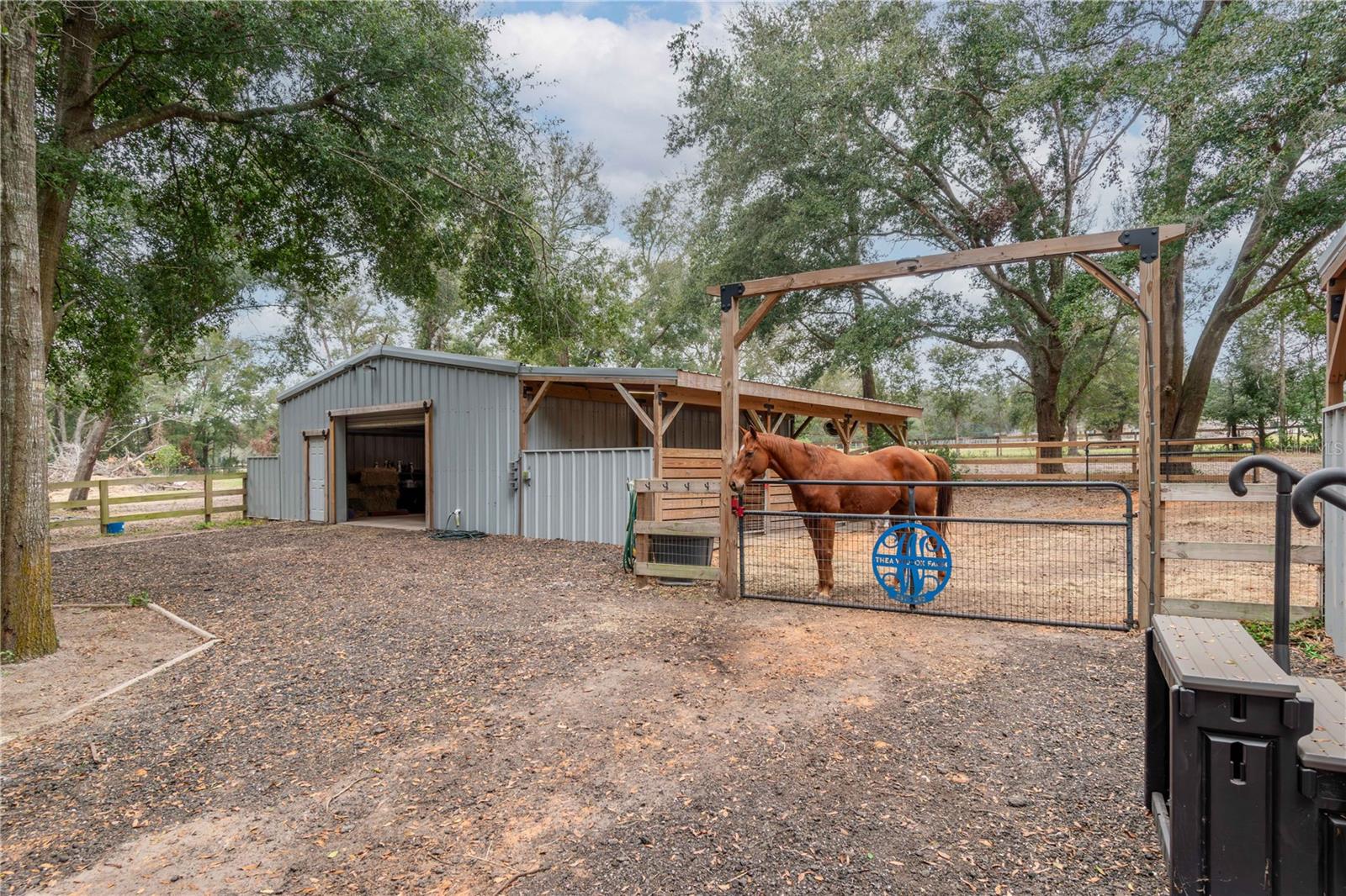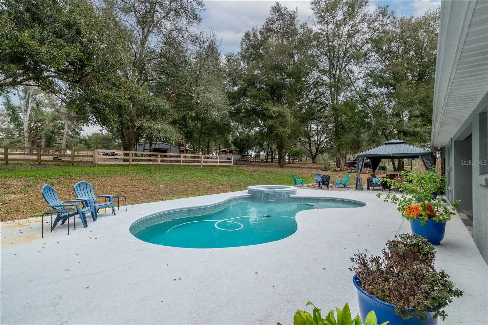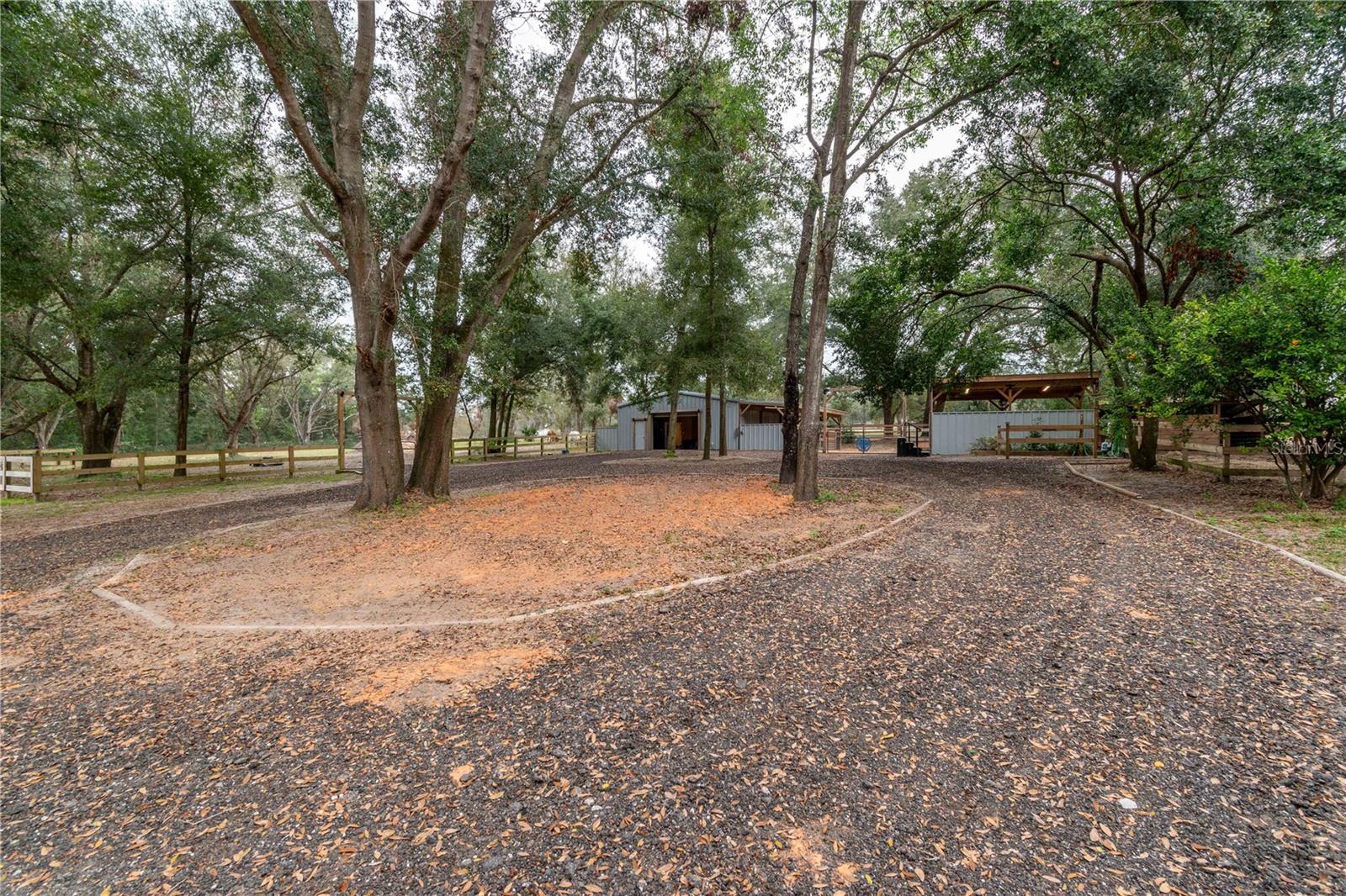Tucked behind a gated entrance, this stunning 4-bedroom, 3-bathroom home welcomes you with a grand 335-foot paved driveway, setting the stage for a private retreat on 4.79 picturesque acres. Built in 2014, this thoughtfully designed home offers an open and airy split floor plan, accentuated by vaulted ceilings and stylish wood-look porcelain tile flooring throughout. The spacious kitchen boasts ample cabinetry, granite countertops, a striking stone tile work, and a large pantry, making it both beautiful and functional. The expansive primary suite features a generous walk-in closet and a spa-like ensuite with a stunning tiled shower equipped with dual shower heads. On the opposite side of the home, three well-sized guest bedrooms provide comfort and privacy. When the Florida sun is at its peak, step outside to your patio and gazebo and take a refreshing dip in the in-ground pool or unwind in the hot tub under the stars. Mature trees provide gentle shade, while a privacy-fenced side yard offers a secure space for pets. The property is perfectly suited for equestrian enthusiasts, offering three fenced paddocks, a well-equipped metal barn with five full stalls, a mini stall, a feed room, an air-conditioned tack room, and a wash rack. For added convenience, an RV hookup with electricity is also available. Located just minutes from Grand Oaks Resort, The Villages, and Lake Weir this exceptional property delivers the perfect blend of rural tranquility and modern comfort. Don’t miss your opportunity to own this unique slice of Florida paradise!