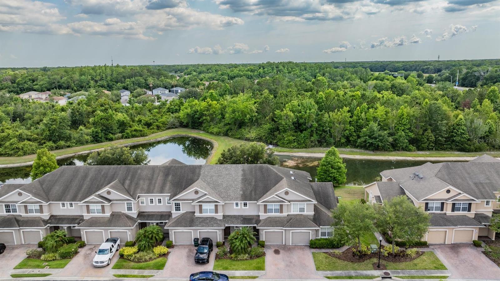 One or more photo(s) has been virtually staged. Beautiful 2-story townhome in gated Lakeside at Seven Oaks with POND VIEW - NO REAR NEIGHBORS!! 3 bedrooms, 2.5 bathrooms, loft space, and a one-car garage. Paver-lined driveway and covered front porch. Downstairs layout includes Great Room open to the Kitchen, half bathroom, under-stair storage, covered patio with peaceful pond views. Kitchen features large breakfast bar & pantry. Head upstairs to find a loft space - perfect for an Office or Play Area. Laundry room comes Complete With Washer and Dryer. Owner's Suite has 2 walk-in closets and en-suite bath features a spacious shower and Dual Sinks. Great opportunity to live in Seven Oaks! Centrally located near the best shopping, dining, entertainment & medical facilities Wesley Chapel has to offer. Seven Oaks features a clubhouse, pool with slide, splash park, Jr. Olympic size pool, cafe, Har-clay tennis courts, sand volleyball, basketball court, soccer field, nature trails, playgrounds, movie theater, gym & aerobics room. HOA fees cover water, sewer, trash, pest control, exterior maintenance and shingles.