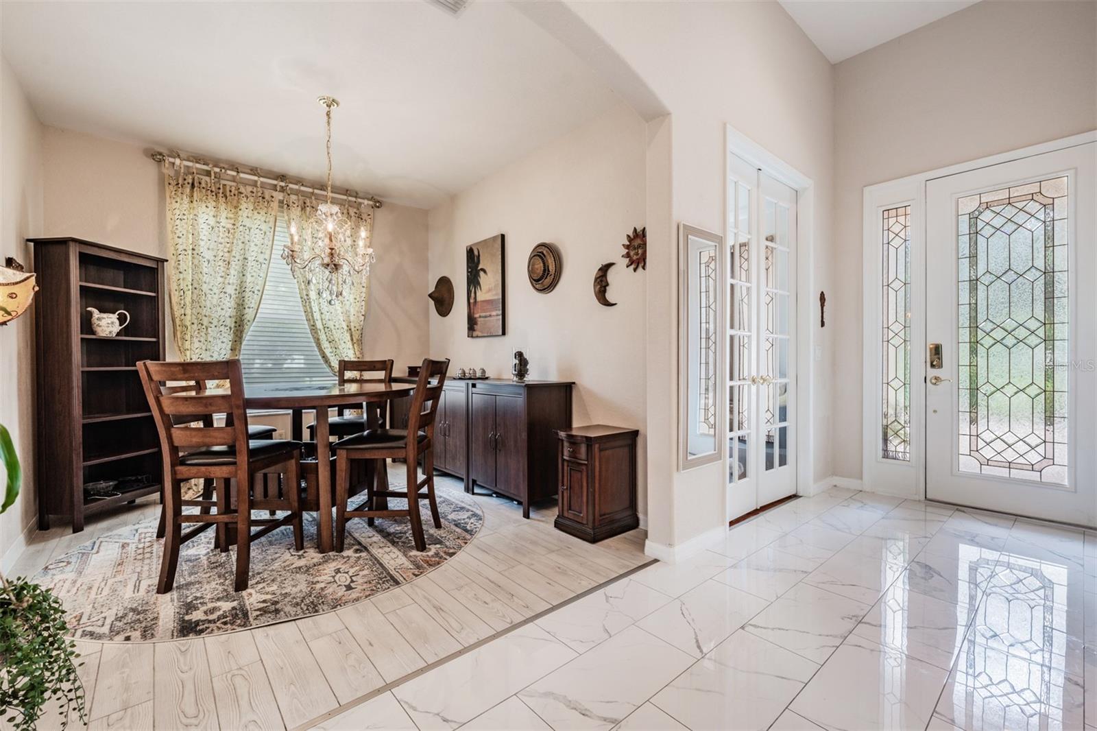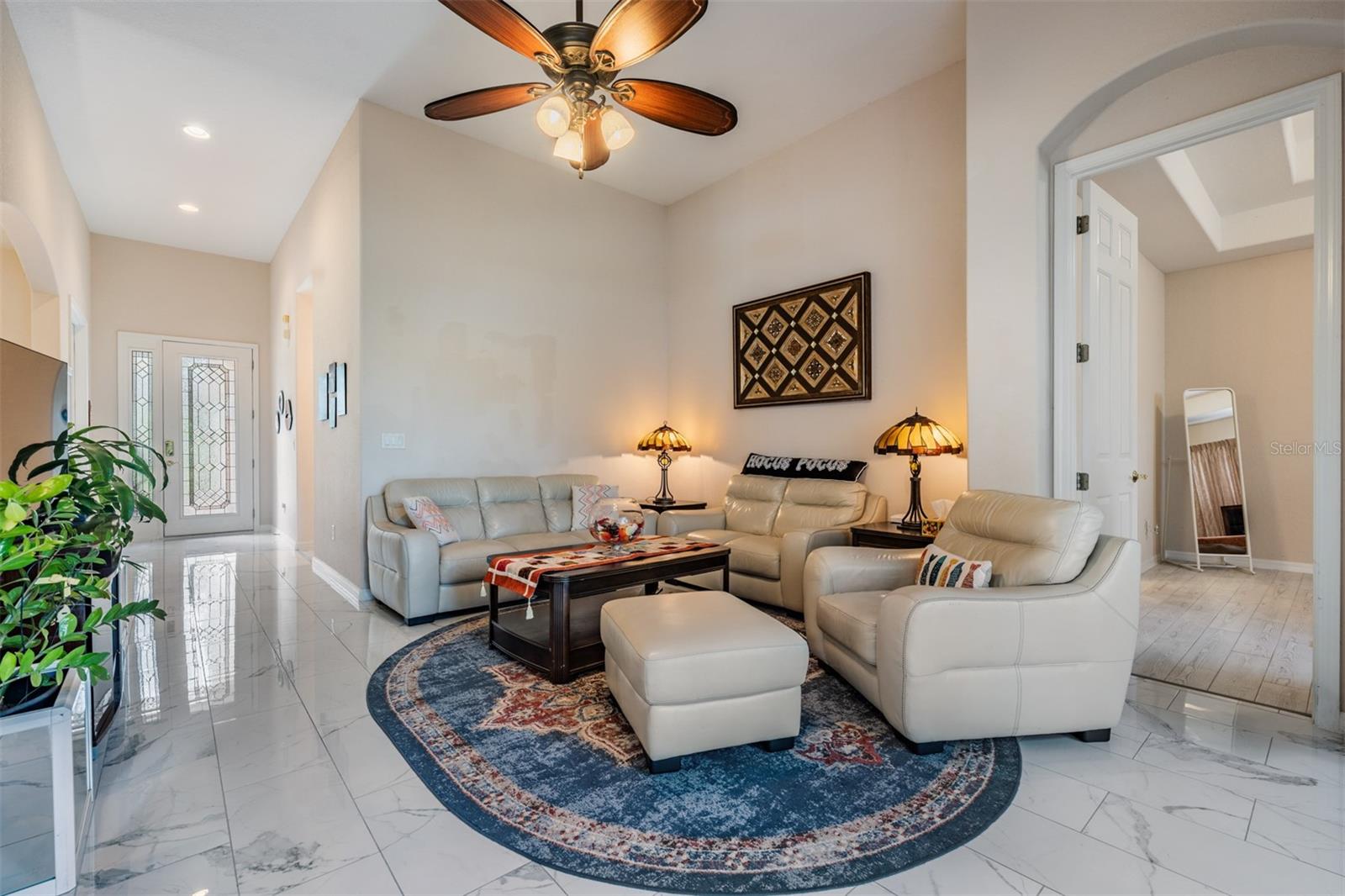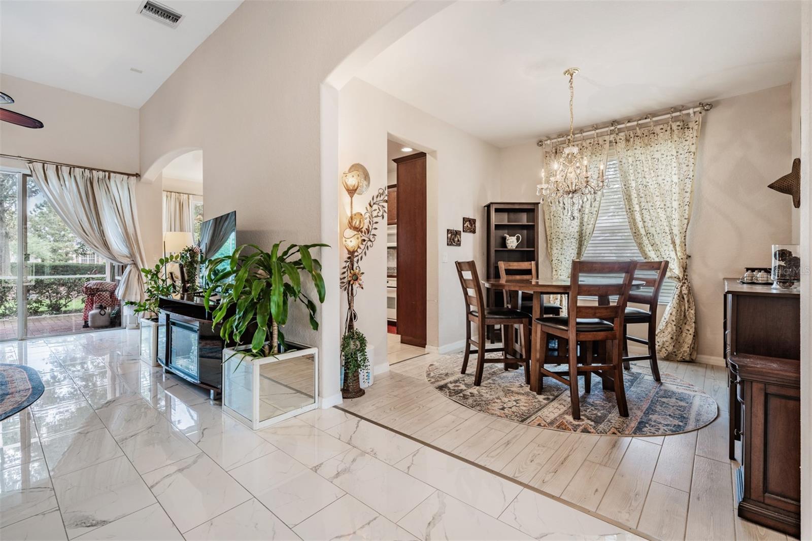 Enjoy a maintenance free lifestyle with this cozy Villa within Seven Oaks in the gated Villas at Edenfield, a community of 40 luxury Villa homes. This Villa is one of the few with its own separate brick paver driveway. Upon entering there is a den/office with glass French doors and hardwood floors. There is a good-sized dining room that opens into the family room and kitchen. The kitchen has granite countertops, maple cabinets, a new rectangular kitchen sink (with culinary accessories) and a new faucet. A stainless LG refrigerator, dishwasher and electric cooktop - all new in 2023. The charming eat-in kitchen, (that can also be used as a sitting area) and the family room have beautiful views of the backyard with privacy and neighborhood park. Opening off the kitchen is a large family room with sliders leading out to the brick paver screened lanai with lush landscaping in the rear. The master suite has a walk-in closet, garden tub, walk-in shower, water closet and duel sinks. The second bedroom is located on the opposite side of the home (for complete privacy for guests) and a second full bath is across the hall. An inside laundry room with utility sink leads to the oversized 2 car garage, with plenty of storage options. New roof in 2022 and A/C within the past 4 years. HOA covers: Lawn maintenance, termite monitoring, exterior painting, roof replacement, driveway maintenance, and annual pressure washing of the driveways, sidewalks and street gutters. Pressure washing of the exterior buildings is every 2 years (does not include the screen enclosure) and exterior painting is every 7 years. Seven Oaks is a very sought after master planned Community and with a desirable lifestyle. It offers an array of amenities: clubhouse, movie theater, pool, splash park, Jr. Olympic size pool, water slide, cafe, hard clay tennis courts, soccer field, nature trails, playgrounds and gym. Seven Oaks provides easy access to major thoroughfare like Bruce B. Downs Blvd, I75, I275 and SR 56. Premier shopping at Wiregrass Mall, Tampa Premium Outlets, and the Grove are all nearby. Also nearby are renowned healthcare facilities, including Advent Health and Bay Care Hospitals with an Orlando Health Hospital currently under construction. The James A. Haley VA Hospital and Moffitt Cancer Center are also easily accessible. There is an abundance of nearby restaurants for your dining enjoyment and entertainment. The offerings of this area are endless.