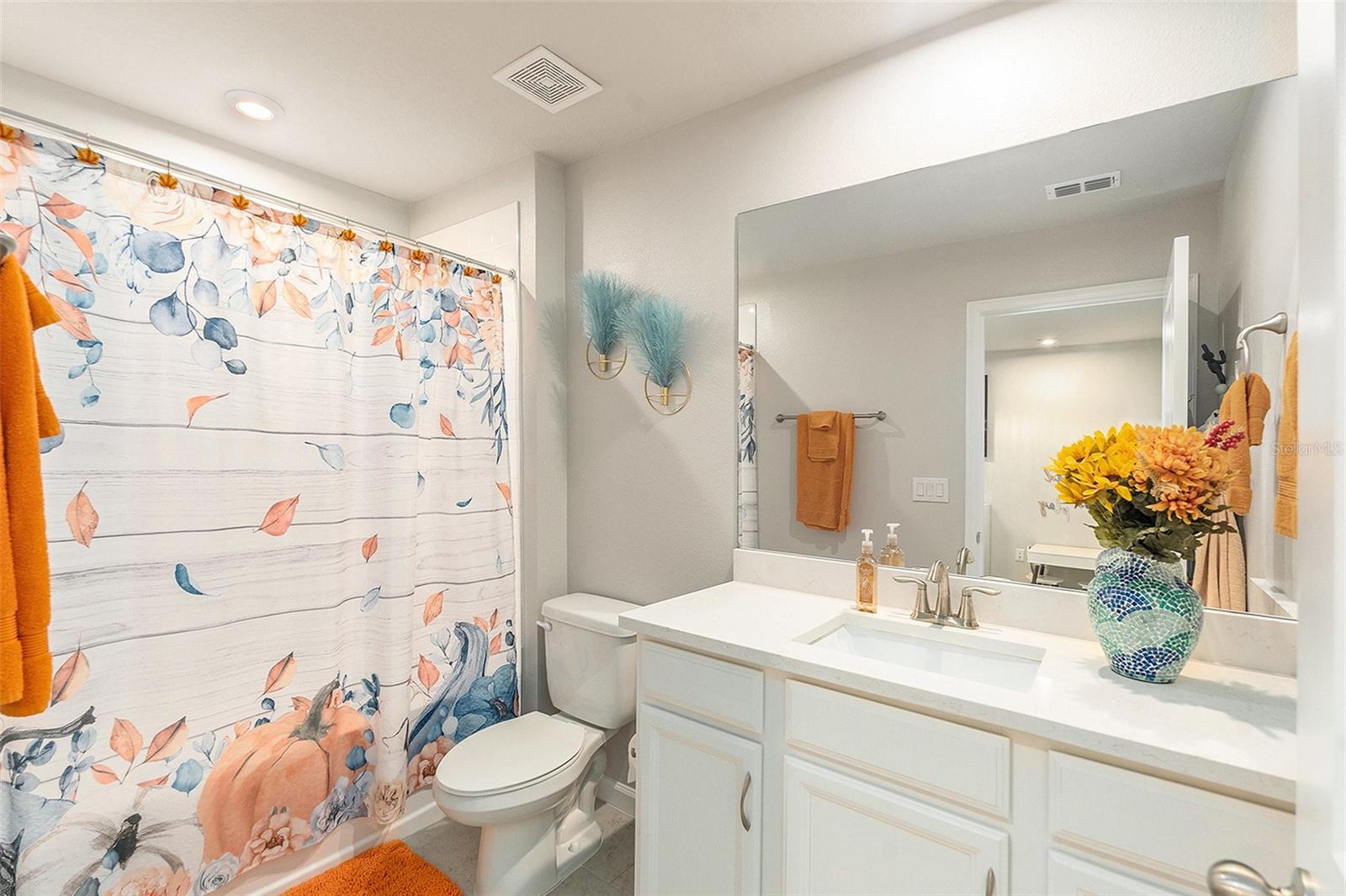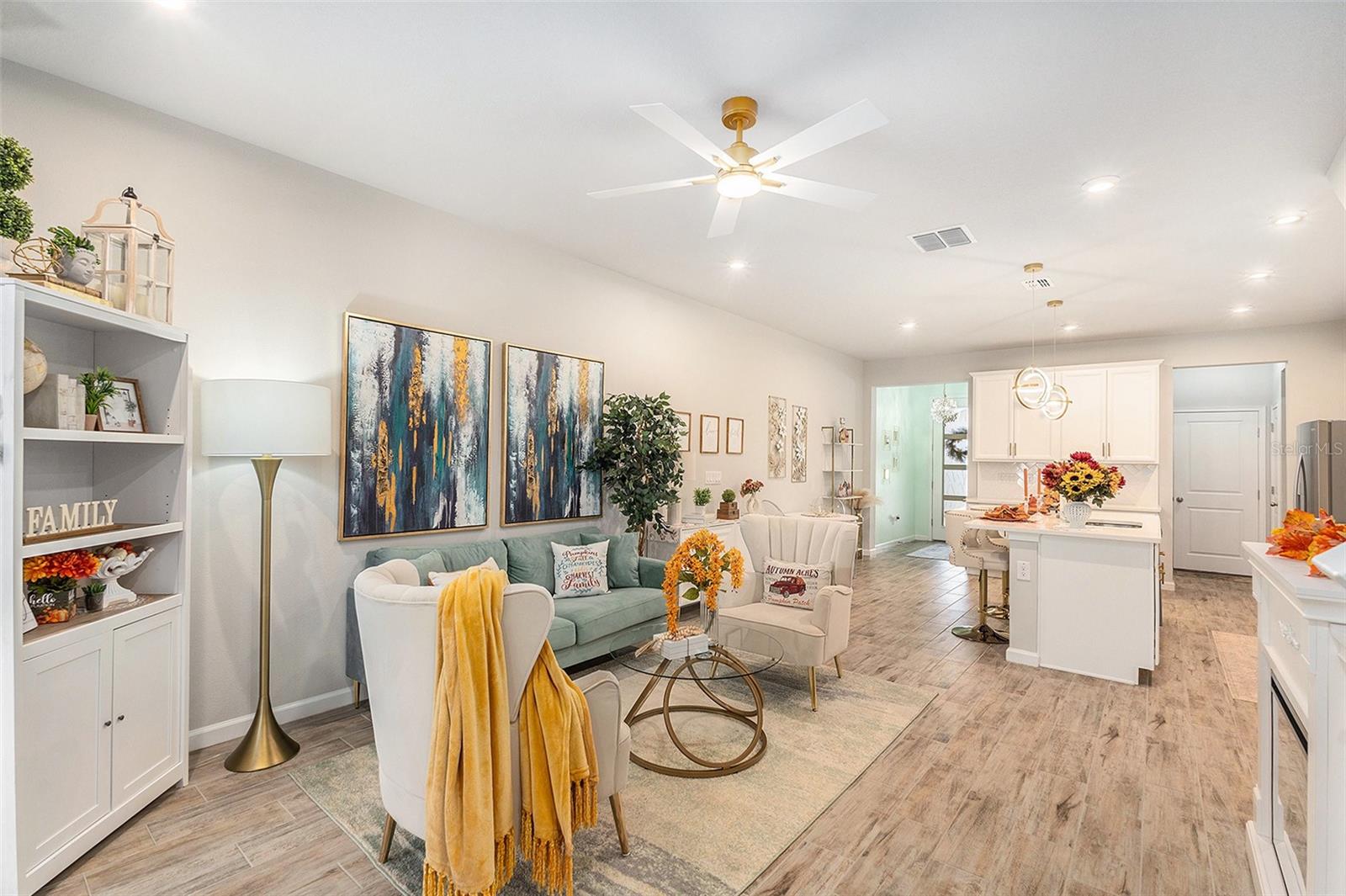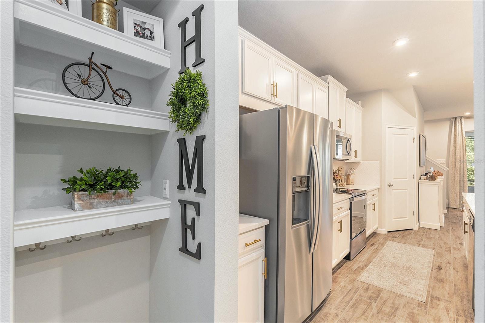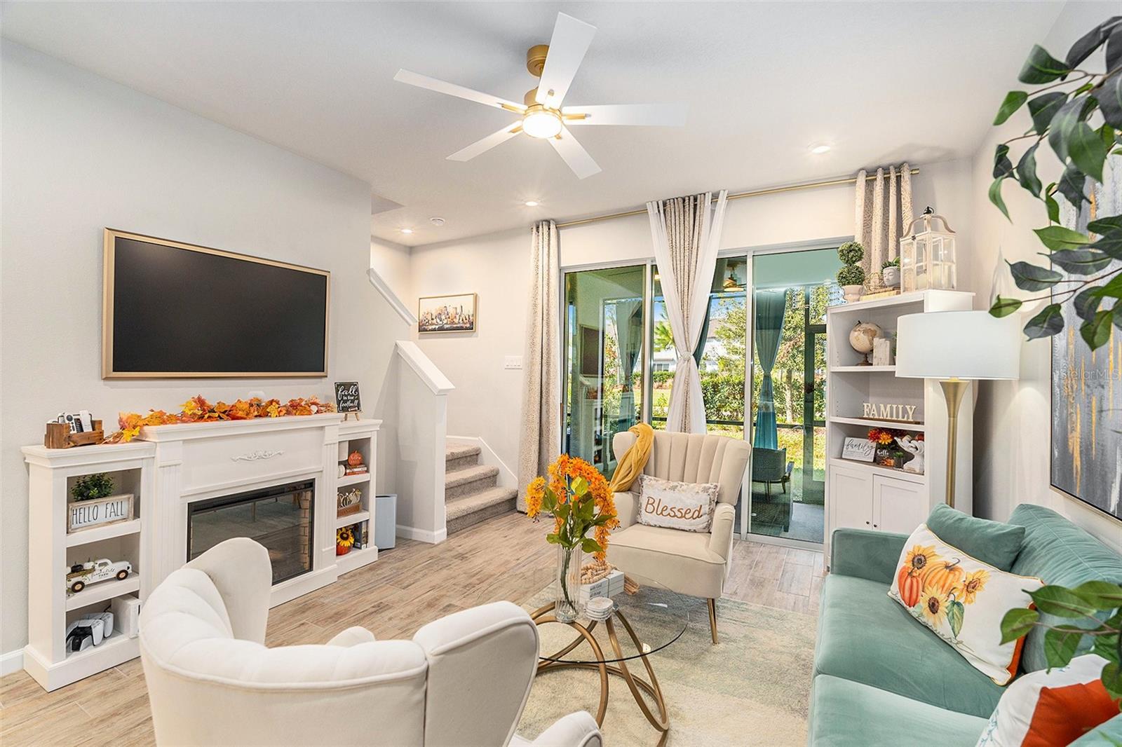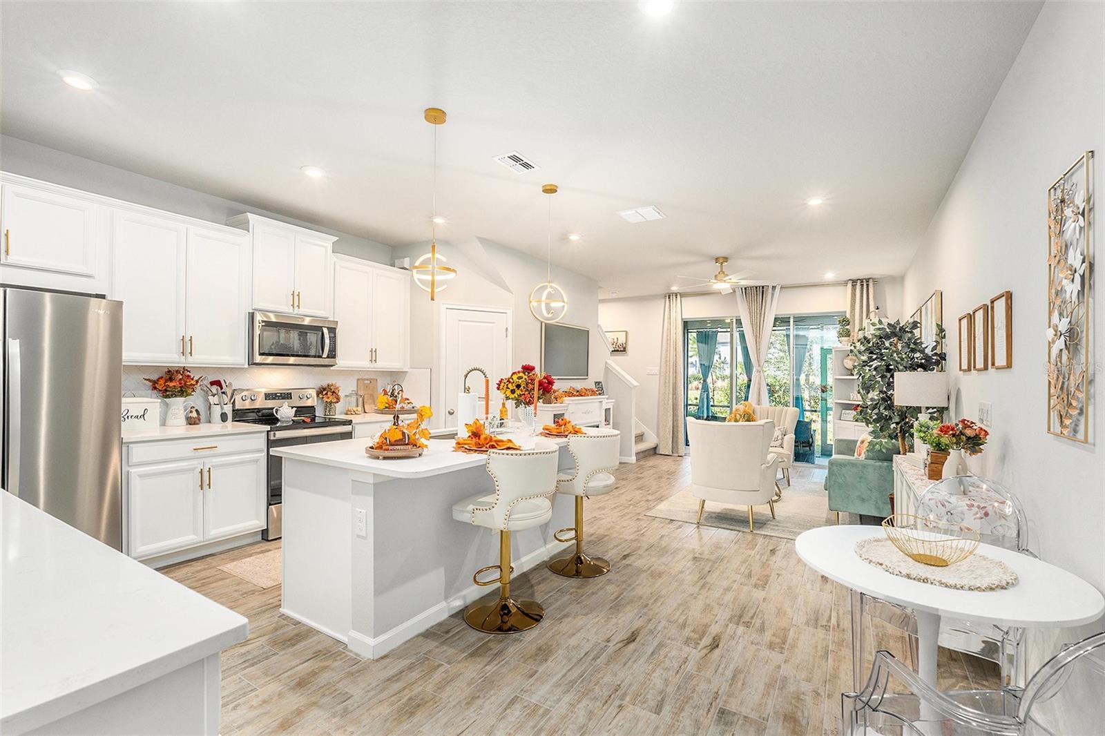 Welcome to 5513 Brooklet Woods Drive, a like-new, 2024-built townhome in the highly desirable area of Wesley Chapel. This home features the popular Marianna floorplan, offering 3 bedrooms, 2.5 bathrooms, and 1,667 sq. ft. of thoughtfully designed living space. What truly sets this townhome apart from other standard new builds of the same floorplan are the custom upgrades added by the current owner, including gold hardware on the cabinetry, a gold faucet in the kitchen, and new light fixtures throughout the home—including elegant pendant lights over the island and multiple chandeliers—features not typically found in new builds of this model. The home radiates clear pride of ownership, with each upgrade adding both style and function. The gourmet kitchen is a true highlight, with quartz countertops, sleek gold accents, and stainless steel appliances, all set against a striking herringbone tile backsplash. The entire first floor is finished with luxury vinyl tile that mimics the look of wood, offering both durability and a modern, polished look. Upstairs, the primary suite offers a spacious retreat with three walk-in closets and a beautifully appointed bathroom with a walk-in shower and quartz countertops. Two additional bedrooms share a beautifully designed bathroom, also with quartz counters. A spacious loft area on the second floor provides flexible space for a home office, playroom, or second living space. Enjoy the outdoors on the screened-in back patio, a perfect place to relax and unwind. The attached 1-car garage provides convenience and extra storage. Guest parking is conveniently located directly across the street, making visits easy for friends and family. The community itself offers amazing amenities, including a lazy river-style pool, a clubhouse, pickle-ball courts, and much more, making it the perfect place to relax and enjoy Florida living. Located near schools, shopping, dining, and major highways, this move-in ready home is a must-see. Schedule your private showing today and experience the exceptional details that make this home unique!