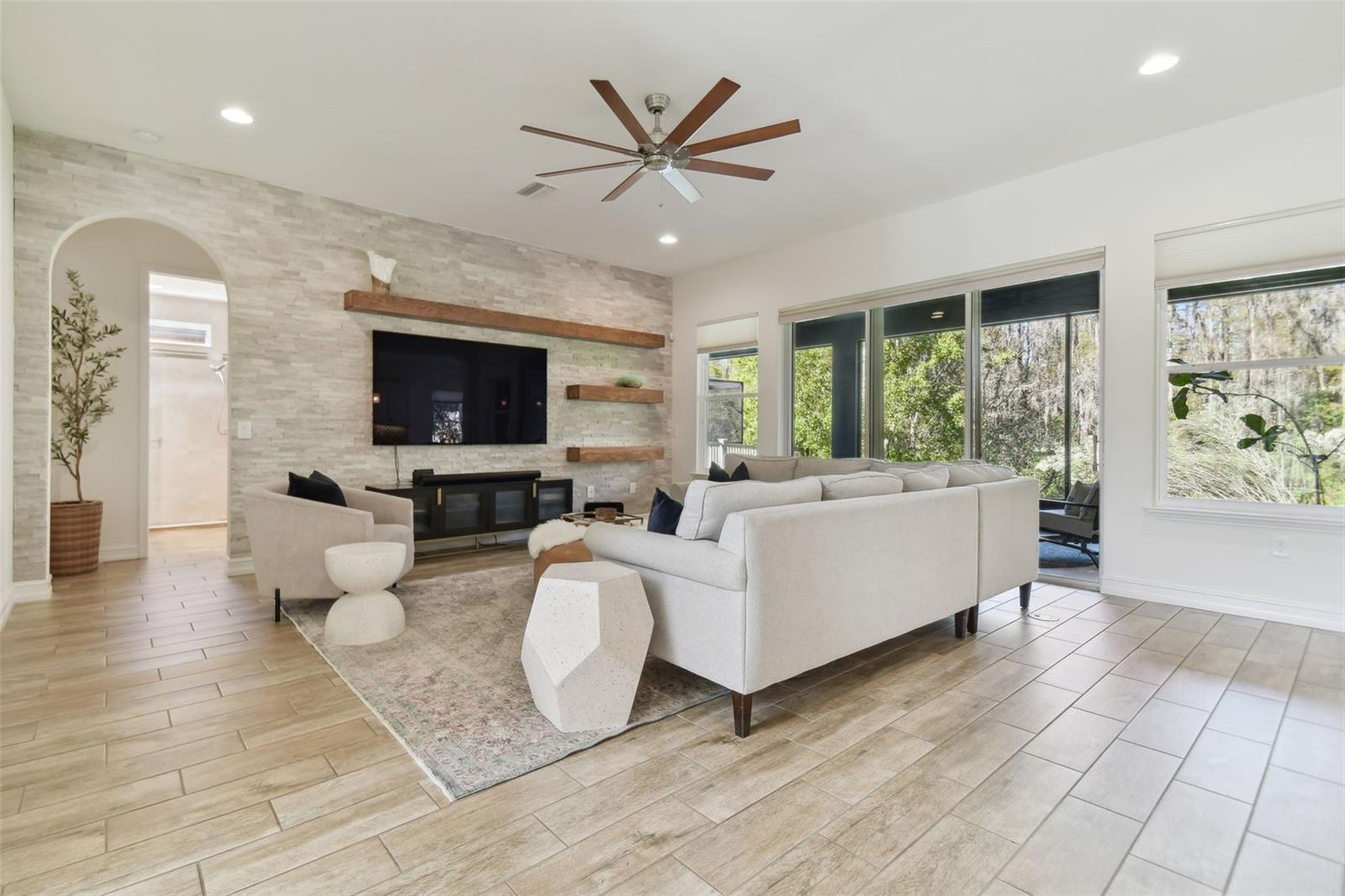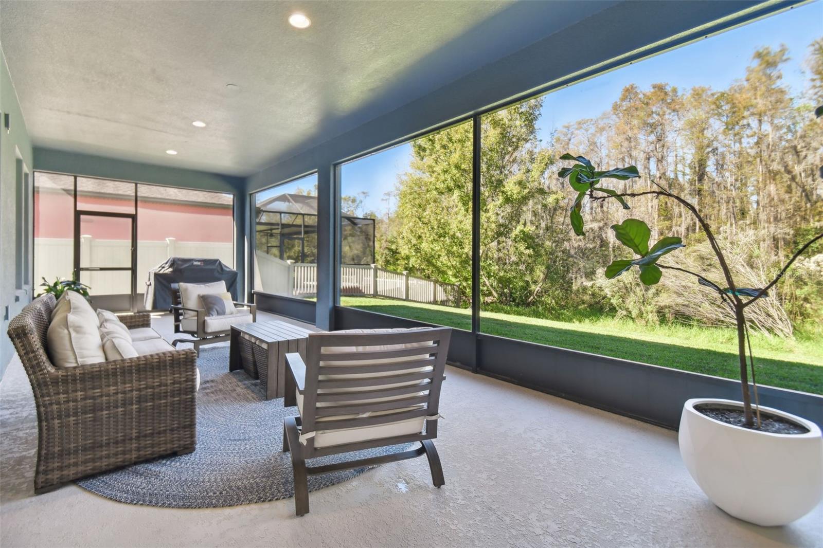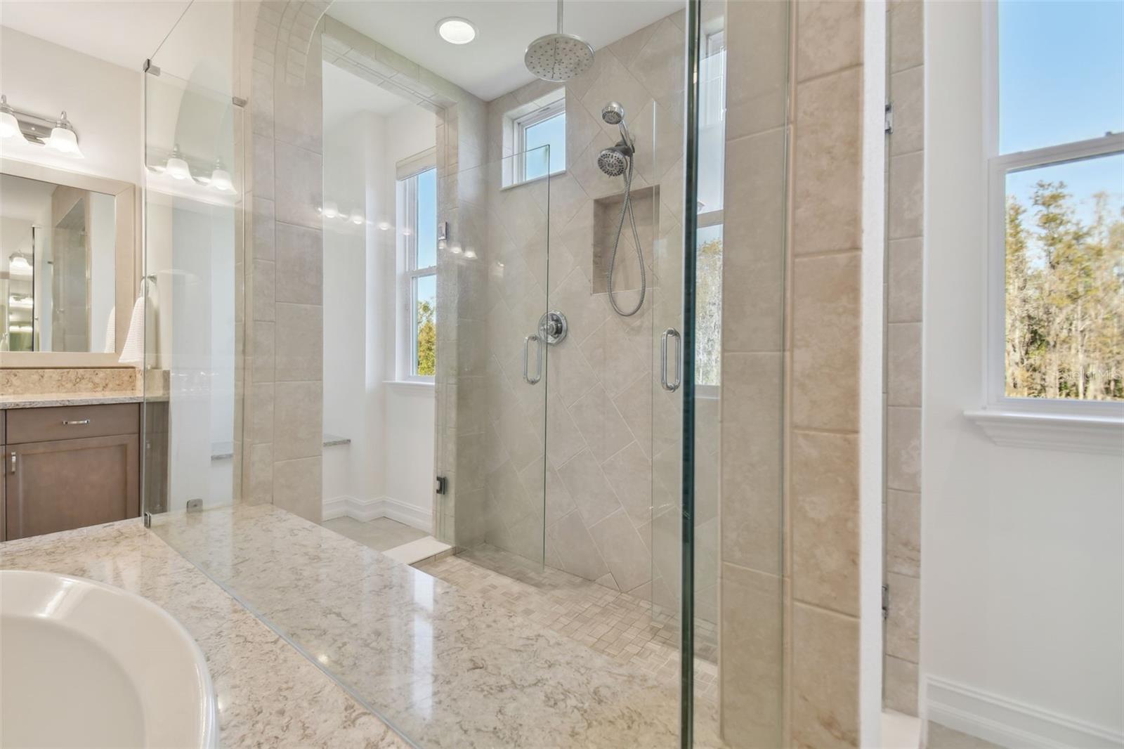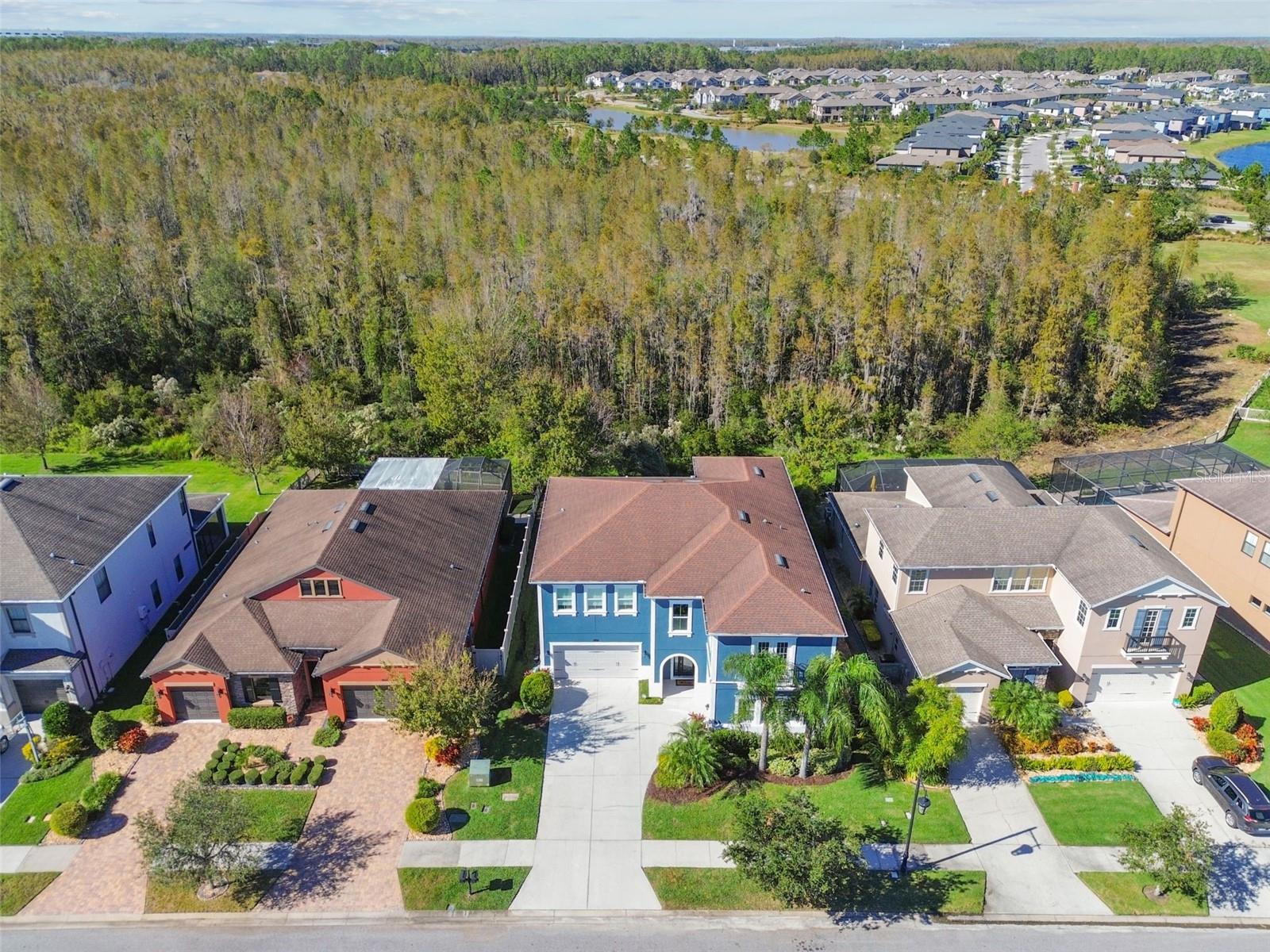 Beautiful CalAtlantic Chesapeake floorplan boasting over 4100 sq ft in the highly desired community of Estancia sitting on tranquil conservation with no rear neighbors! Located in the gated community of Tavira, the home offers 5 Bedrooms| 4 Baths| Bonus Room| Office and 3 Car Garage. It additionally provides an elongated driveway which will accommodate multiple vehicles comfortably. As you enter you are greeted by 20-foot-high ceilings, open staircase, decorative molding and lots of natural light. The interior has been freshly painted with a neutral color pallet that accentuates the existing design features. The main living area has porcelain tile that resembles wood planks, custom built in, decorative stone wall, and decorative archways. This gourmet kitchen features 42” high cabinets with decorative details, 5 burner natural gas stove, backsplash, double oven, apron kitchen sink, serving station, walk in pantry, stainless steel appliances, and quartz countertop. The first floor has an open concept, conservations views, and an oversized screened lanai! First floor has a private bedroom with a shower and an office with glass double doors. The primary bedroom is a complete oasis retreat. The primary bathroom has an oversized shower with rain shower, dual sink vanities with granite countertops, garden tub, natural light, and a decorative wall feature. The primary bedroom has plenty of space for a sitting area, tray ceiling, and a walk in dressing room. The laundry room features upper and bottom cabinets for lots of storage and sink. The 20x20 bonus room is upstairs and can serve as a multi purpose space. The club at Estancia has a lifestyle director hosting events and activities for its residents all year long. Enjoy the gym, clubhouse, tennis court, pickleball, tennis court, basketball court, trails and luxurious swimming pool with a zero entry and lap area. This neighborhood is less than 1 mile from Advent Health, BayCare Hospital, and the future Orlando Health. Zoned for A+ school zone, easy access to I-75, Wiregrass Mall, the Krates, restaurants, and shops make this area an ultimate favorite. Don’t miss out as this model does not hit the market often! Click for virtual tour!