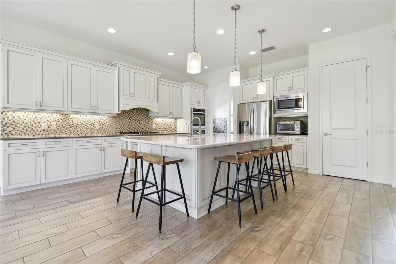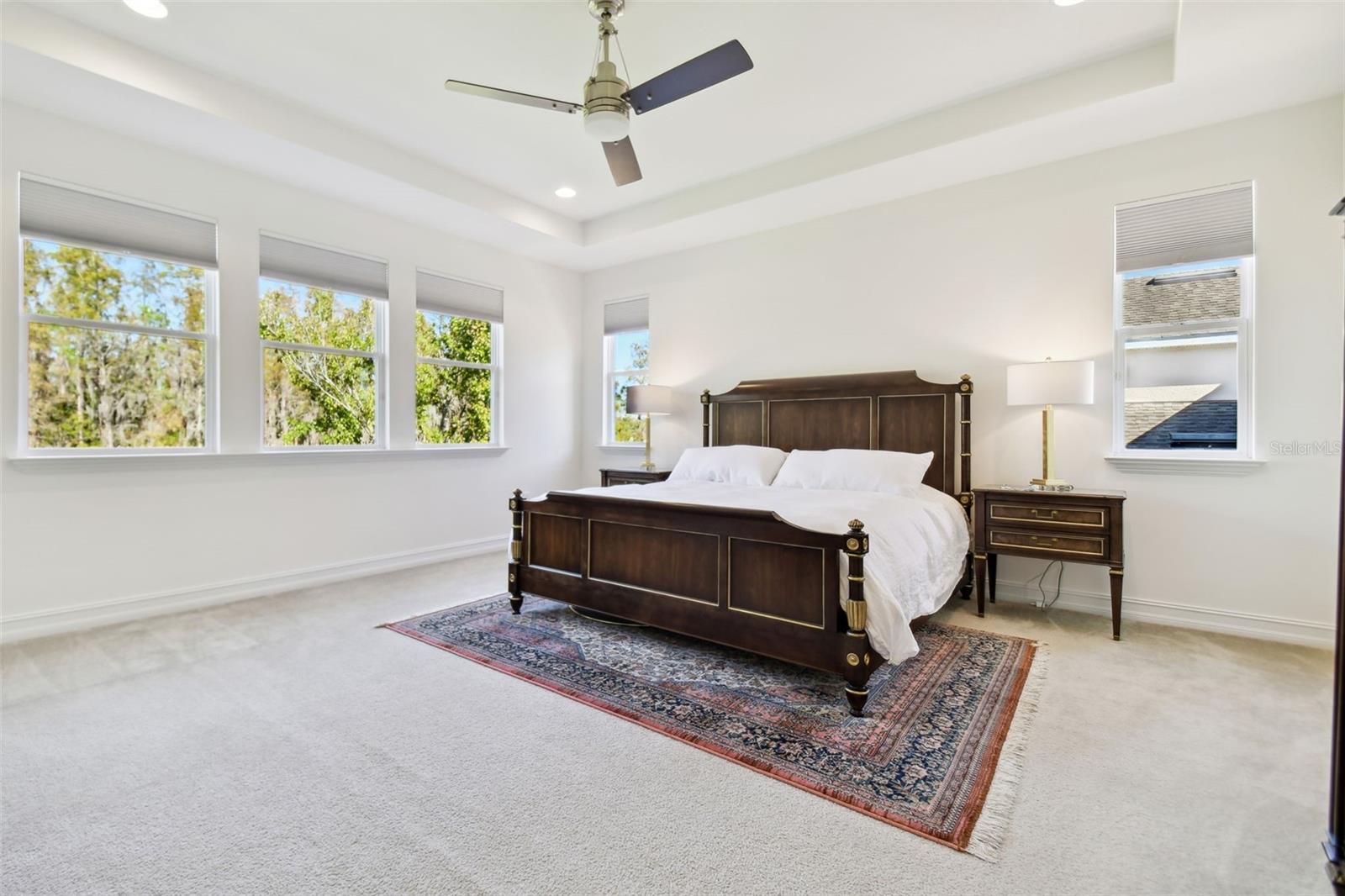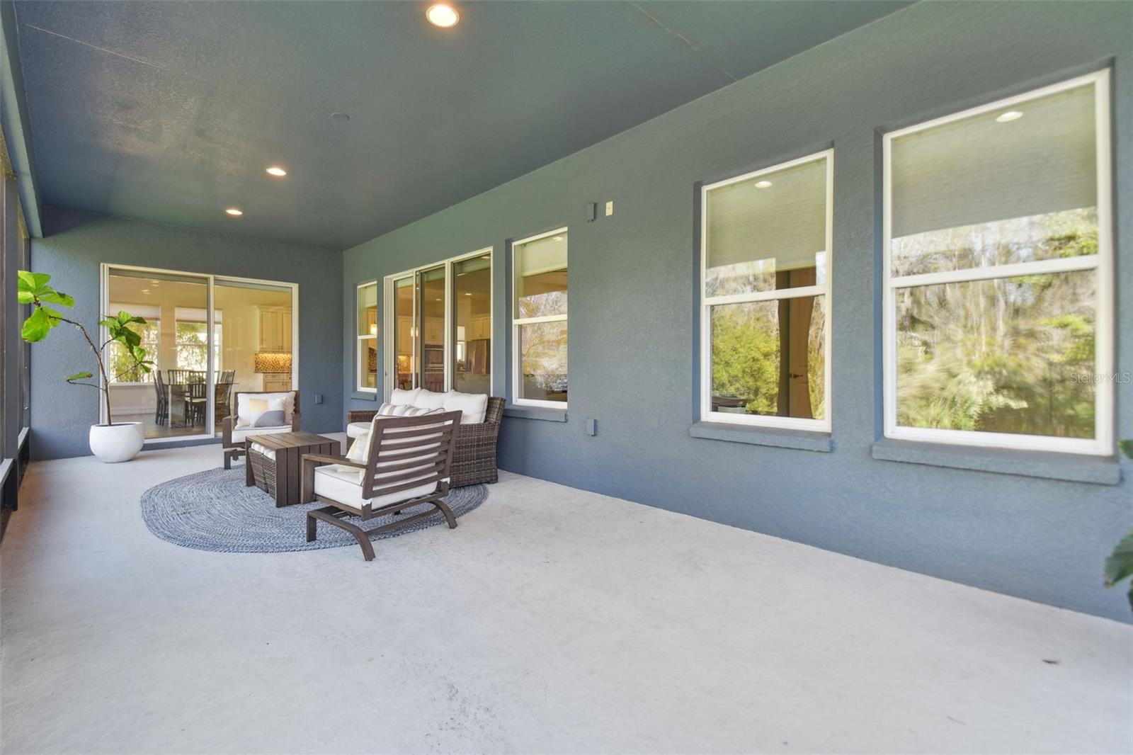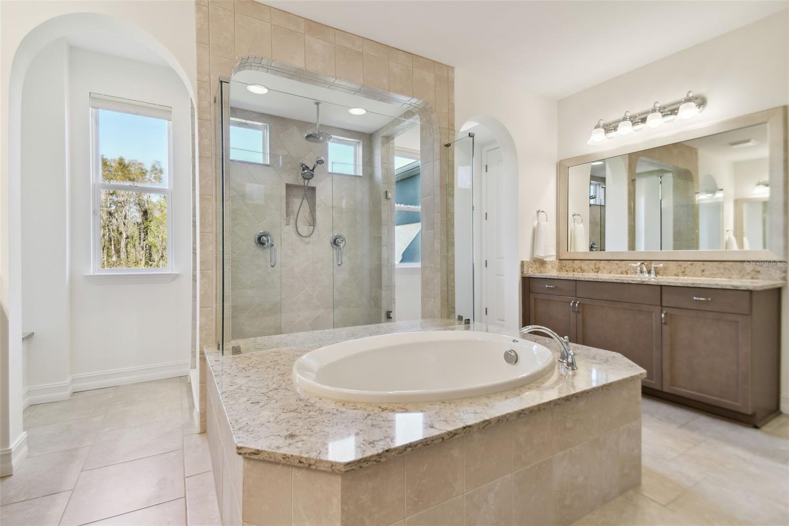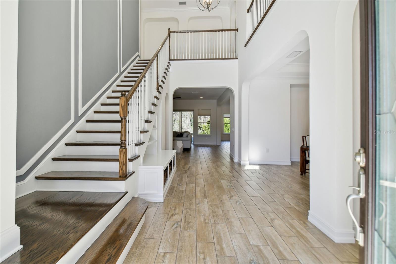 Beautiful CalAtlantic Chesapeake floorplan boasting over 4100 sq ft in the highly desired community of Estancia sitting on tranquil conservation with no rear neighbors! Located in the gated community of Tavira, the home offers 5 Bedrooms| 4 Baths| Bonus Room| Office and 3 Car Garage. It additionally provides an elongated driveway which will accommodate multiple vehicles comfortably. As you enter you are greeted by 20-foot-high ceilings, open staircase, decorative molding and lots of natural light. The interior has been freshly painted with a neutral color pallet that accentuates the existing design features. The main living area has porcelain tile that resembles wood planks, custom built in, decorative stone wall, and decorative archways. This gourmet kitchen features 42” high cabinets with decorative details, 5 burner natural gas stove, backsplash, double oven, apron kitchen sink, serving station, walk in pantry, stainless steel appliances, and quartz countertop. The first floor has an open concept, conservations views, and an oversized screened lanai! First floor has a private bedroom with a shower and an office with glass double doors. The primary bedroom is a complete oasis retreat. The primary bathroom has an oversized shower with rain shower, dual sink vanities with granite countertops, garden tub, natural light, and a decorative wall feature. The primary bedroom has plenty of space for a sitting area, tray ceiling, and a walk in dressing room. The laundry room features upper and bottom cabinets for lots of storage and sink. The 20x20 bonus room is upstairs and can serve as a multi purpose space. The club at Estancia has a lifestyle director hosting events and activities for its residents all year long. Enjoy the gym, clubhouse, tennis court, pickleball, tennis court, basketball court, trails and luxurious swimming pool with a zero entry and lap area. This neighborhood is less than 1 mile from Advent Health, BayCare Hospital, and the future Orlando Health. Zoned for A+ school zone, easy access to I-75, Wiregrass Mall, the Krates, restaurants, and shops make this area an ultimate favorite. Don’t miss out as this model does not hit the market often! Click for virtual tour!