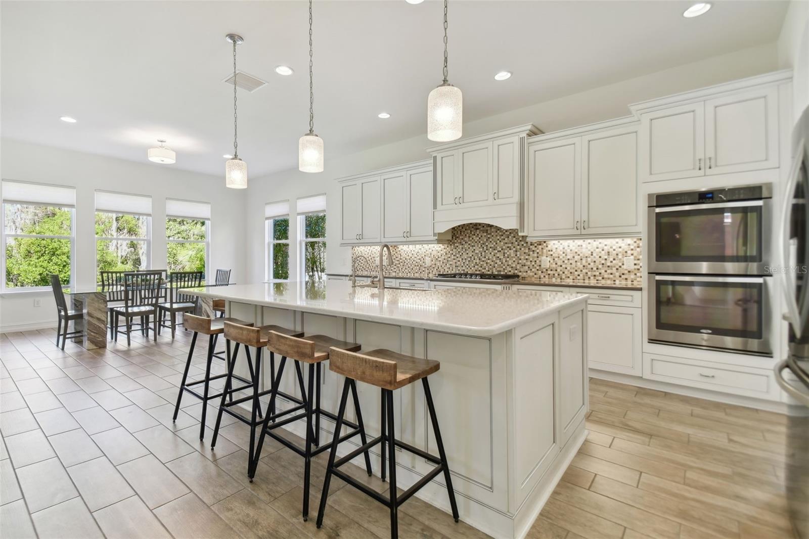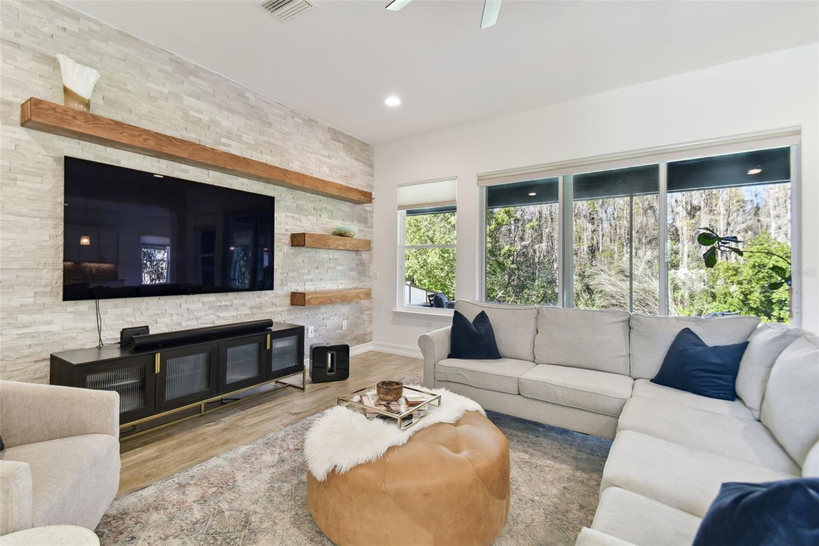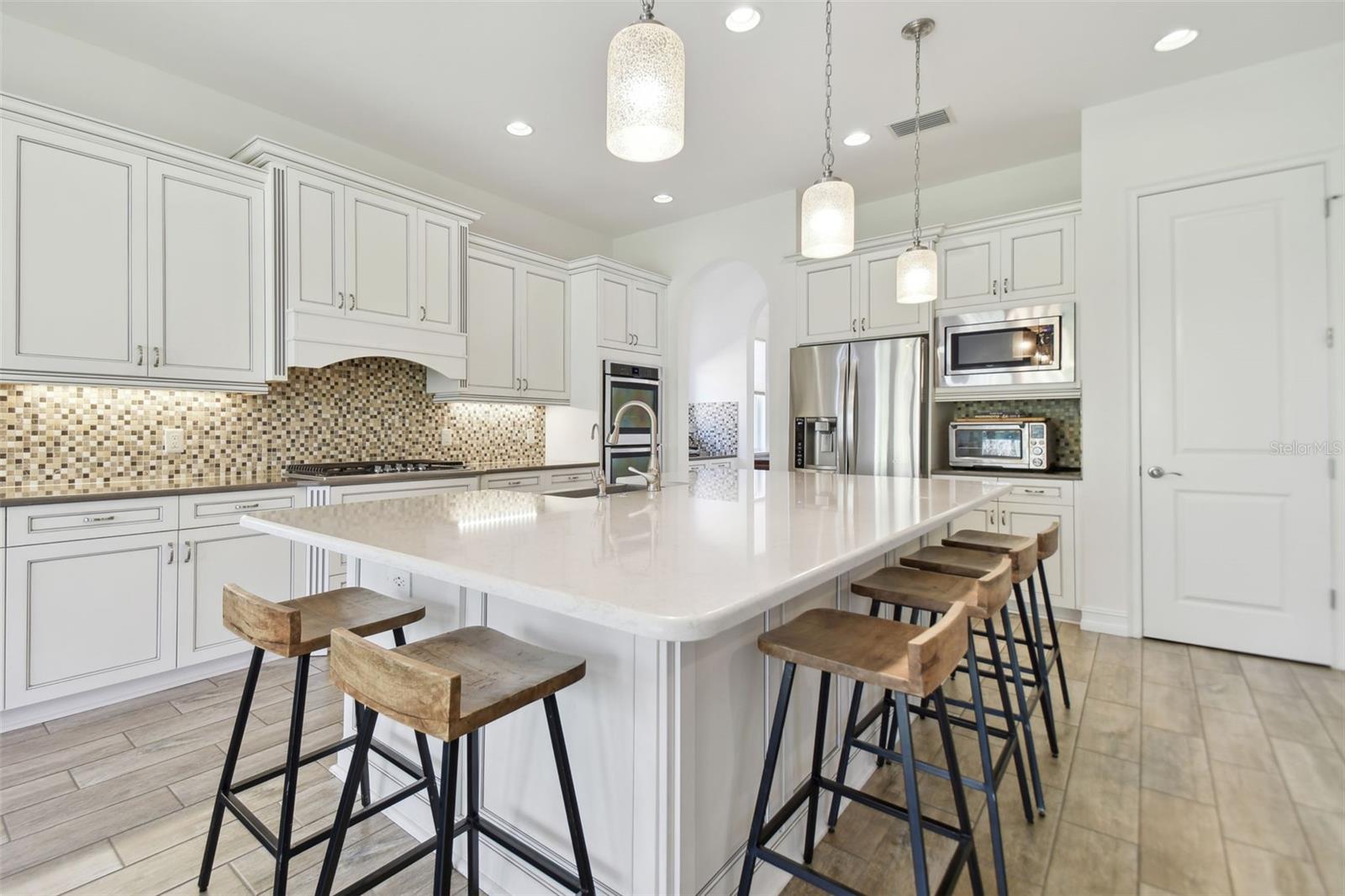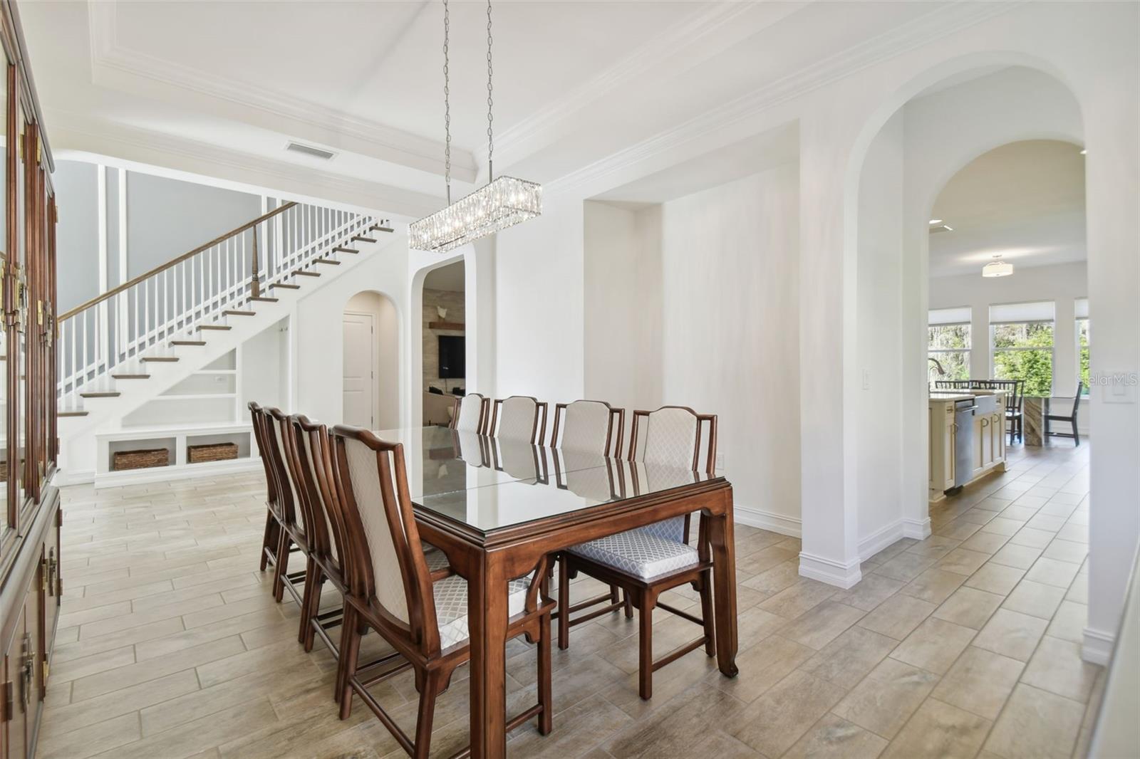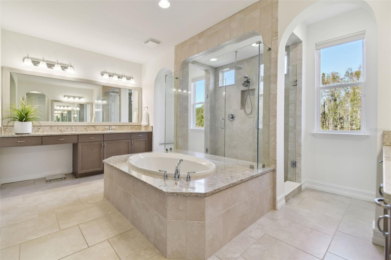 Beautiful CalAtlantic Chesapeake floorplan boasting over 4100 sq ft in the highly desired community of Estancia sitting on tranquil conservation with no rear neighbors! Located in the gated community of Tavira, the home offers 5 Bedrooms| 4 Baths| Bonus Room| Office and 3 Car Garage. It additionally provides an elongated driveway which will accommodate multiple vehicles comfortably. As you enter you are greeted by 20-foot-high ceilings, open staircase, decorative molding and lots of natural light. The interior has been freshly painted with a neutral color pallet that accentuates the existing design features. The main living area has porcelain tile that resembles wood planks, custom built in, decorative stone wall, and decorative archways. This gourmet kitchen features 42” high cabinets with decorative details, 5 burner natural gas stove, backsplash, double oven, apron kitchen sink, serving station, walk in pantry, stainless steel appliances, and quartz countertop. The first floor has an open concept, conservations views, and an oversized screened lanai! First floor has a private bedroom with a shower and an office with glass double doors. The primary bedroom is a complete oasis retreat. The primary bathroom has an oversized shower with rain shower, dual sink vanities with granite countertops, garden tub, natural light, and a decorative wall feature. The primary bedroom has plenty of space for a sitting area, tray ceiling, and a walk in dressing room. The laundry room features upper and bottom cabinets for lots of storage and sink. The 20x20 bonus room is upstairs and can serve as a multi purpose space. The club at Estancia has a lifestyle director hosting events and activities for its residents all year long. Enjoy the gym, clubhouse, tennis court, pickleball, tennis court, basketball court, trails and luxurious swimming pool with a zero entry and lap area. This neighborhood is less than 1 mile from Advent Health, BayCare Hospital, and the future Orlando Health. Zoned for A+ school zone, easy access to I-75, Wiregrass Mall, the Krates, restaurants, and shops make this area an ultimate favorite. Don’t miss out as this model does not hit the market often! Click for virtual tour!