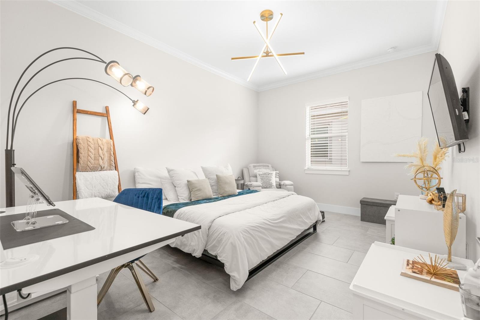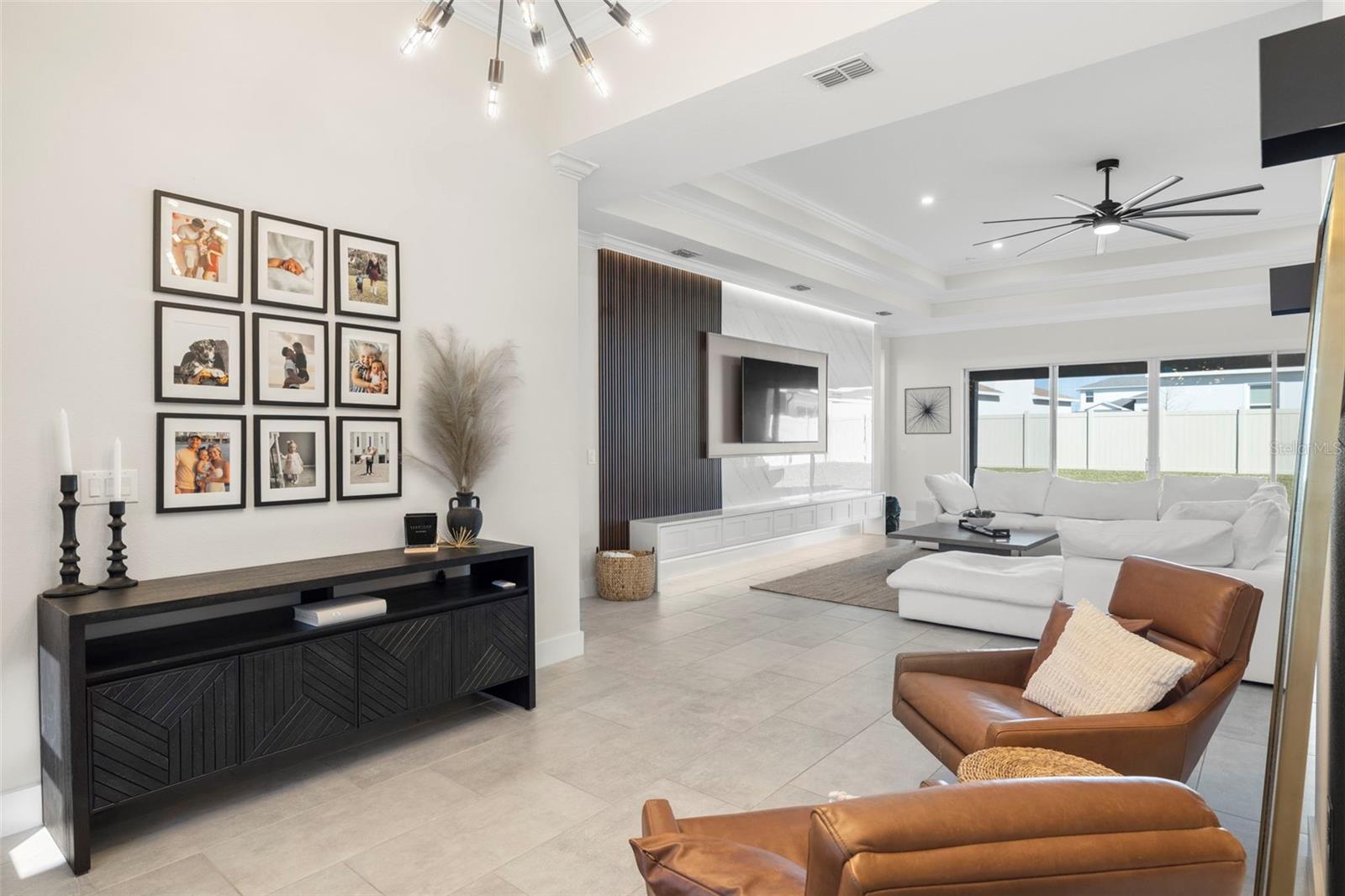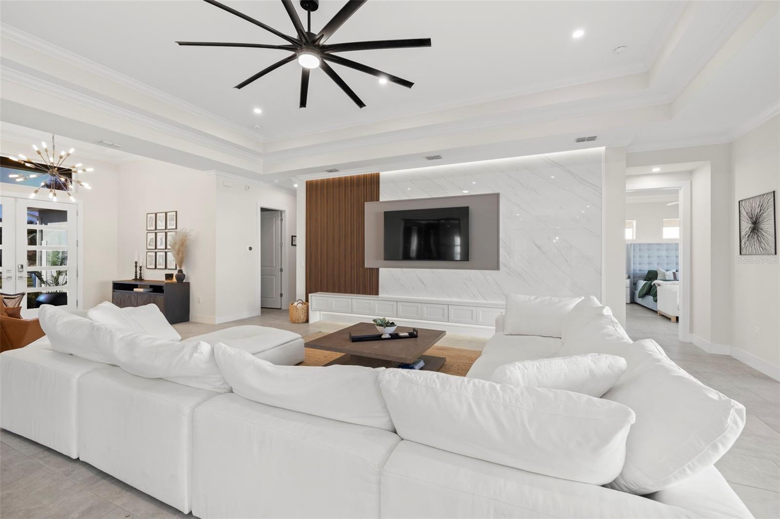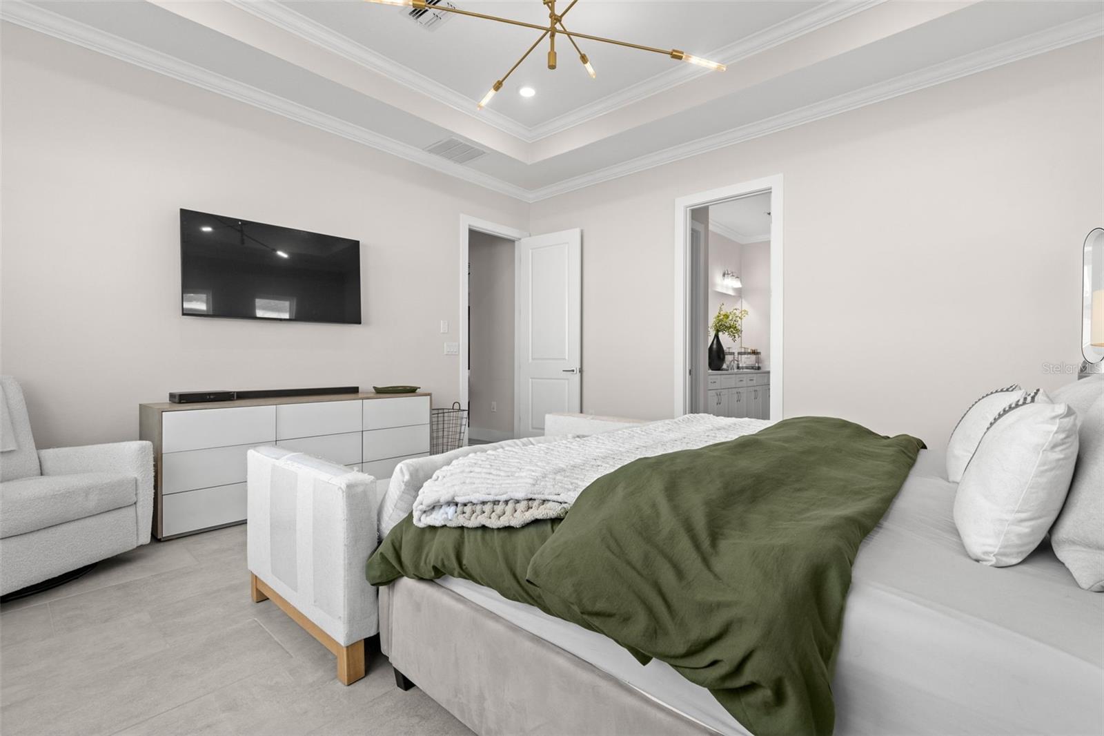 Welcome to this beautifully built, newer home located in the highly sought-after Epperson Lagoon community of Wesley Chapel. Boasting 4 spacious bedrooms, 3.5 luxurious baths, 3,214 square foot of living space, and a 3-car garage, this home is designed with upgraded modern finishes throughout, providing both style and comfort on a generous quarter-acre lot. As you enter, you’re immediately greeted by high ceilings and an open floor plan that seamlessly connects the living room, kitchen, and dining areas. The expansive living room features a custom accent wall that adds a wow factor to the space. Upon entering the living room, you'll discover an additional bonus room, currently set up as a home office, featuring custom built-in cabinets crafted from monkey pod wood imported from Puerto Rico. The chef's kitchen offers pristine quartz countertops, high-end stainless steel appliances, and a large island that opens up to the generous dining area. The master retreat is a true sanctuary, featuring dual walk-in closets, a luxurious soaking tub, and a walk-in shower with sleek finishes. One bedroom includes an en-suite bath, while two additional bedrooms are conveniently located next to a full shared bath. For added convenience, the home features a laundry room that connects directly to the two-car garage. The third garage space is currently being used as a home gym, and all materials for the gym can be included upon request. Step outside to enjoy the private fenced-in backyard, complete with a covered outdoor patio featuring stunning wood paneling from wall to ceiling —perfect for outdoor activities or simply relaxing in the Florida sunshine. The same wood paneling ceilings are located on the floor door entry way. Enjoy the convenience of being directly across the street from Eagle Park, which features a playground, dog park, community center, and extra parking just steps away. From your front door, you'll also have an unobstructed view of the lake and stunning sunsets. Residents of the Epperson community enjoy the benefits of an HOA that covers internet and cable, along with access to exclusive amenities, including the state-of-the-art lagoon—an incredible oasis just minutes from your doorstep. You’ll also find yourself within close proximity to local shops, restaurants, Publix, and more, making it easy to live, work, and play in one of the best areas of Wesley Chapel. This home offers the perfect blend of luxury, convenience, and community—don't miss the opportunity to make it yours! Contact us today for a tour.