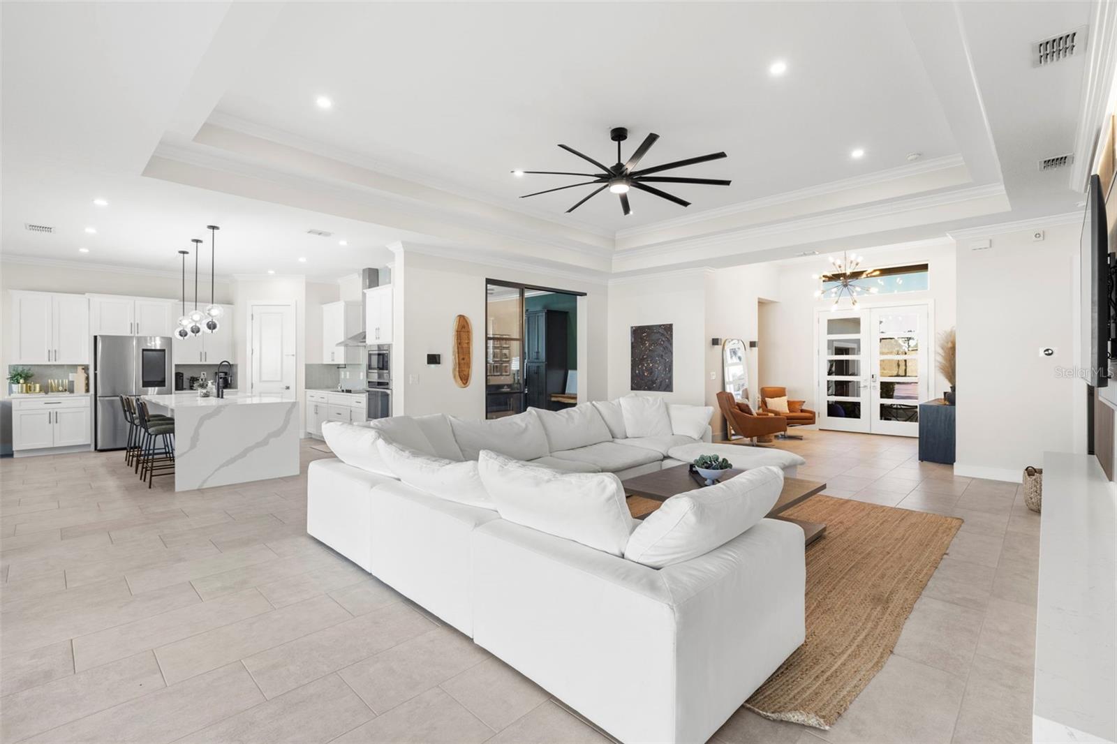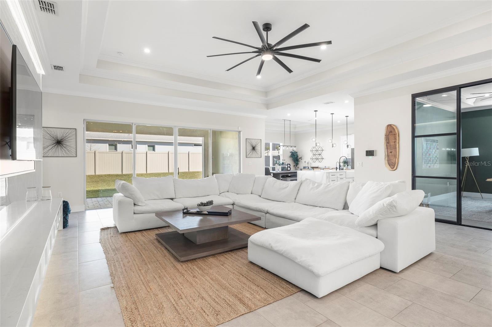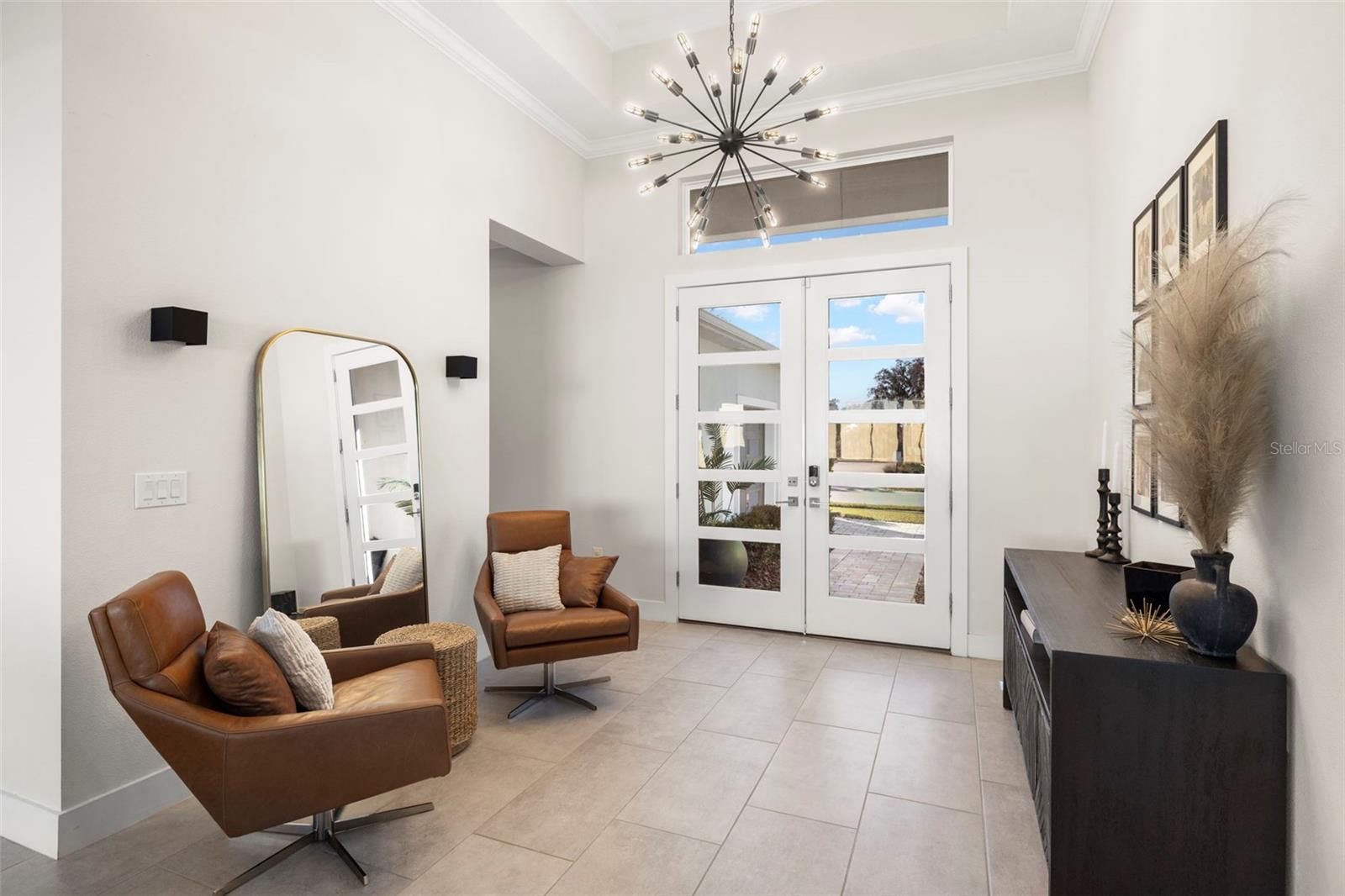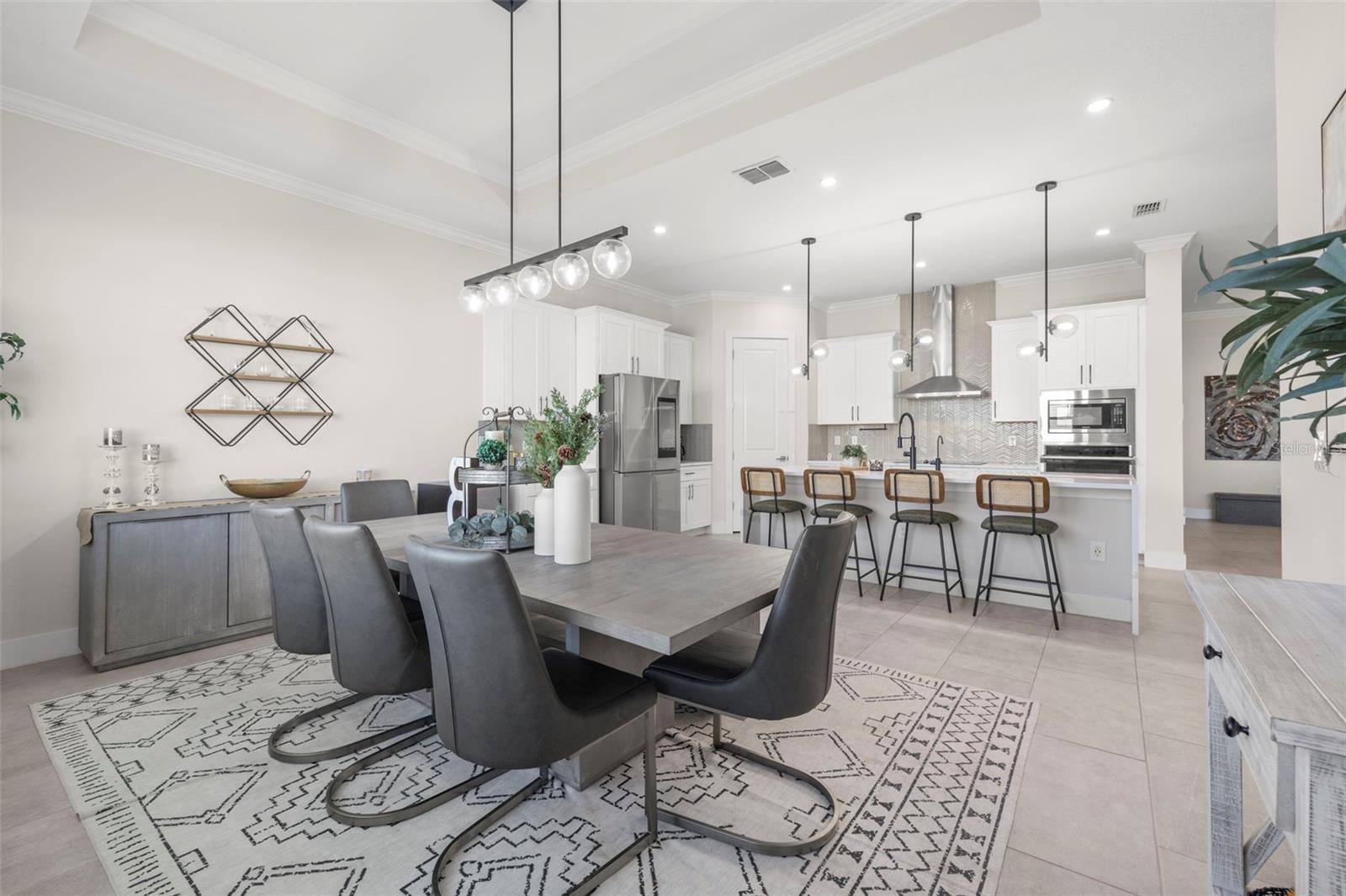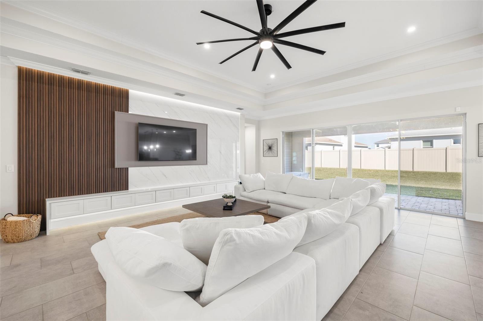 Welcome to this beautifully built, newer home located in the highly sought-after Epperson Lagoon community of Wesley Chapel. Boasting 4 spacious bedrooms, 3.5 luxurious baths, 3,214 square foot of living space, and a 3-car garage, this home is designed with upgraded modern finishes throughout, providing both style and comfort on a generous quarter-acre lot. As you enter, you’re immediately greeted by high ceilings and an open floor plan that seamlessly connects the living room, kitchen, and dining areas. The expansive living room features a custom accent wall that adds a wow factor to the space. Upon entering the living room, you'll discover an additional bonus room, currently set up as a home office, featuring custom built-in cabinets crafted from monkey pod wood imported from Puerto Rico. The chef's kitchen offers pristine quartz countertops, high-end stainless steel appliances, and a large island that opens up to the generous dining area. The master retreat is a true sanctuary, featuring dual walk-in closets, a luxurious soaking tub, and a walk-in shower with sleek finishes. One bedroom includes an en-suite bath, while two additional bedrooms are conveniently located next to a full shared bath. For added convenience, the home features a laundry room that connects directly to the two-car garage. The third garage space is currently being used as a home gym, and all materials for the gym can be included upon request. Step outside to enjoy the private fenced-in backyard, complete with a covered outdoor patio featuring stunning wood paneling from wall to ceiling —perfect for outdoor activities or simply relaxing in the Florida sunshine. The same wood paneling ceilings are located on the floor door entry way. Enjoy the convenience of being directly across the street from Eagle Park, which features a playground, dog park, community center, and extra parking just steps away. From your front door, you'll also have an unobstructed view of the lake and stunning sunsets. Residents of the Epperson community enjoy the benefits of an HOA that covers internet and cable, along with access to exclusive amenities, including the state-of-the-art lagoon—an incredible oasis just minutes from your doorstep. You’ll also find yourself within close proximity to local shops, restaurants, Publix, and more, making it easy to live, work, and play in one of the best areas of Wesley Chapel. This home offers the perfect blend of luxury, convenience, and community—don't miss the opportunity to make it yours! Contact us today for a tour.