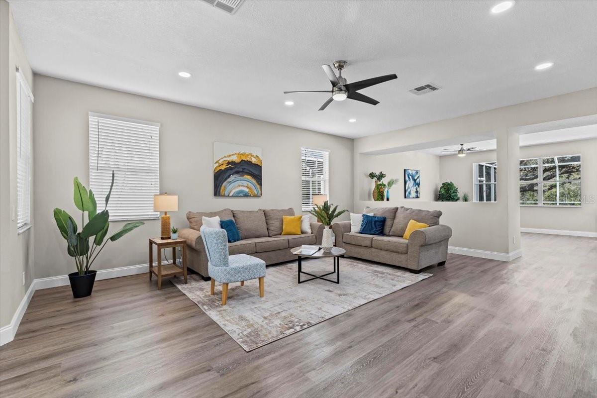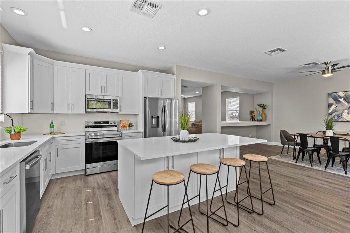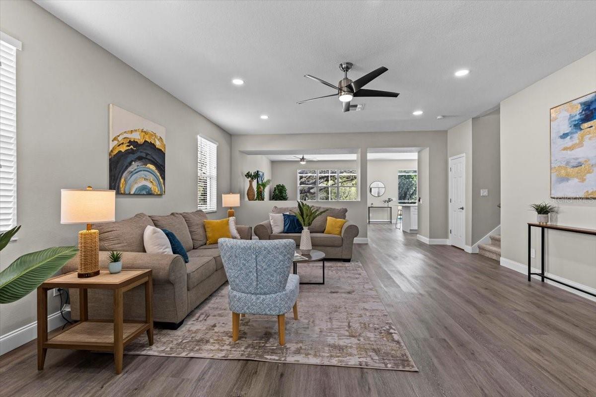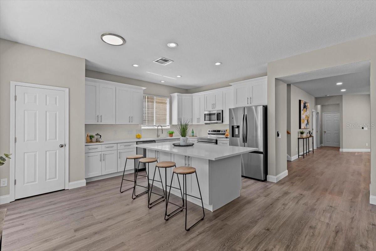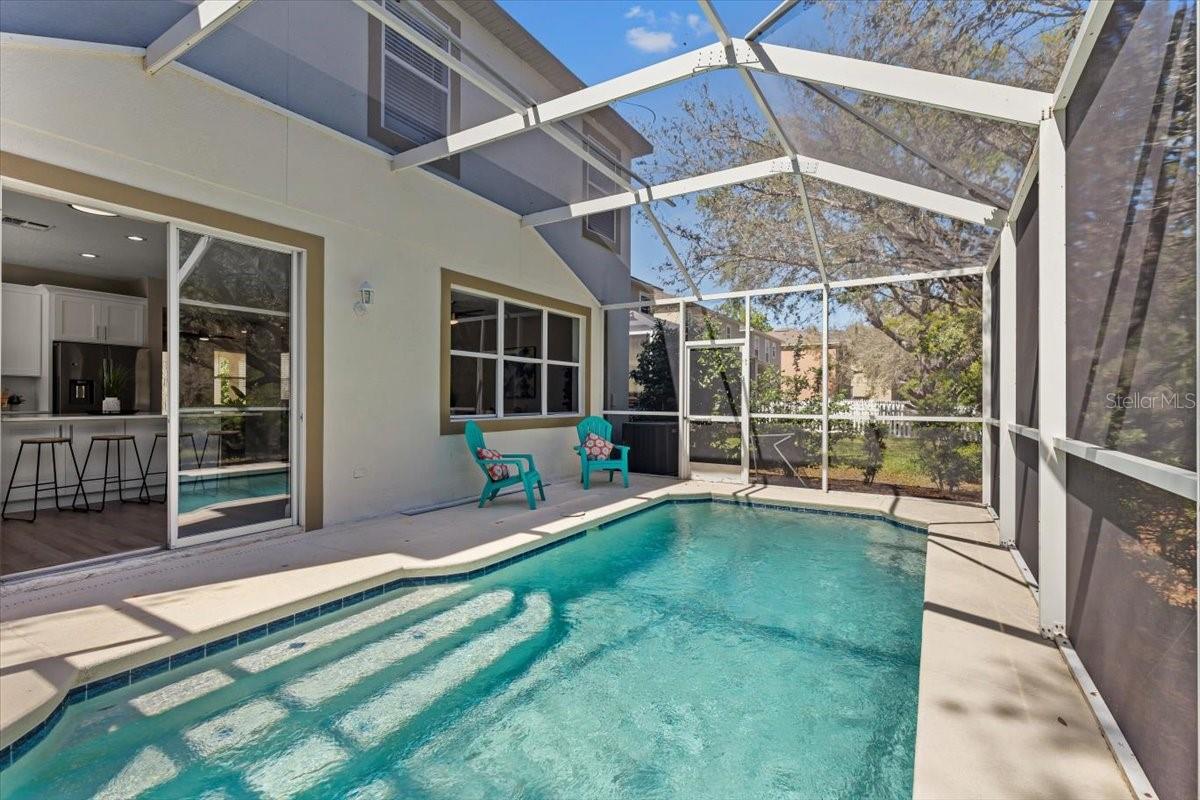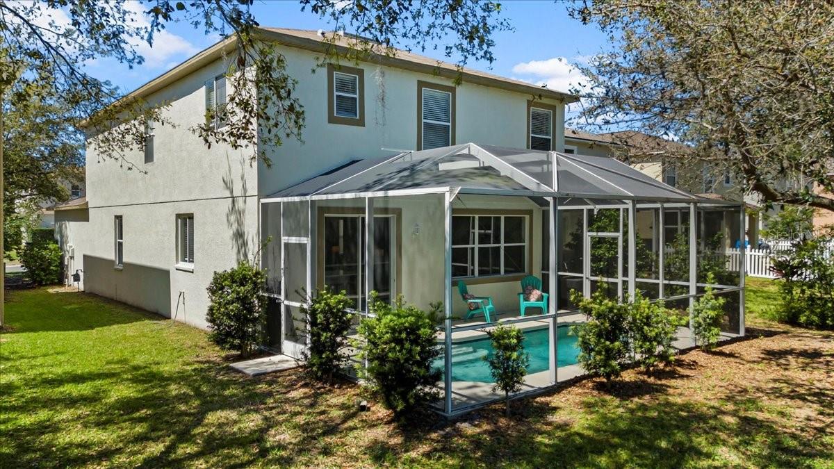 SELLER WILL REPLACE ROOF WITH AN ACCEPTABLE OFFER! Welcome home to this expansive 4-bedroom, 3-bathroom 2-car garage, pool home retreat in the sought-after Seven Oaks community. Nestled on a serene conservation lot with picturesque pond views, this home offers the perfect balance of comfort, style, and nature. From the moment you arrive, you’ll be welcomed by fresh landscaping and a covered tile entryway that invites you inside. Step into the spacious living room, where natural light pours in through large windows, highlighting the warm luxury vinyl flooring and all-new updated fixtures that create a cozy and inviting atmosphere. The heart of the home is the beautifully updated kitchen, thoughtfully designed with modern touches that make cooking and entertaining a delight. Crisp white shaker cabinets, quartz countertops, brand-new stainless steel appliances, and a large island provide plenty of prep space while offering stunning views of the pool and tranquil pond just beyond the sliding glass doors. The kitchen seamlessly connects to a bright dining area and a cozy seating nook, making it the perfect place for gathering with loved ones. Just beyond the kitchen and dining area, a spacious first-floor bedroom offers flexibility as a guest suite or home office, complete with a spacious closet. Nearby, a stylishly updated full bathroom with a quartz-topped vanity and chic luxury vinyl flooring provides convenience for guests. Thoughtful storage solutions throughout the first floor ensure everything has its place. Venture upstairs to find a versatile loft space, ideal for a home office. The inviting Primary Suite is a true retreat, offering breathtaking views of the conservation area and pond. Wake up to peaceful scenery and unwind in the primary bathroom, featuring a new double vanity with quartz countertops, a garden tub, and a walk-in shower. A spacious walk-in closet provides ample storage for all your needs. Two additional generously sized bedrooms, each with large walk-in closets, and a third full bathroom with modern updates complete the second floor. A conveniently located laundry room adds to the home’s practical charm. Step outside to your own backyard oasis. The screened-in pool area is perfect for relaxing or entertaining, offering stunning water and conservation views. Whether you're enjoying a morning coffee on the patio or taking an evening swim, this outdoor space is designed to be your personal retreat. Beyond the home, the Seven Oaks community offers an array of resort-style amenities. Enjoy the sun deck with private cabanas, swim in the Junior-Olympic lap pool with a thrilling double-loop waterslide, or let the splash park bring out your inner child. Sports enthusiasts will appreciate the tennis courts, sand volleyball court, softball and soccer fields, and a fully-lit basketball court. The welcoming clubhouse features a fitness center, locker rooms with showers, a multi-tiered theater with a projection screen, gathering spaces, and a café for your convenience. Located near top-tier shopping and dining options like The Shops at Wiregrass, Tampa Premium Outlets, you'll have everything you need just moments away. With premier medical facilities such as Advent Health of Wesley Chapel and BayCare-Wesley Chapel. This isn’t just a house—it’s a place to call home. Schedule your private tour today and discover the comfort and lifestyle that await you in Seven Oaks. For a virtual tour, click the provided link.