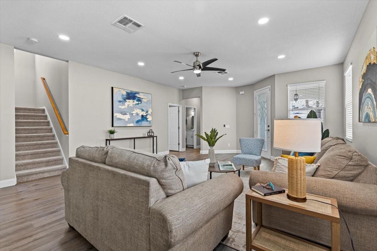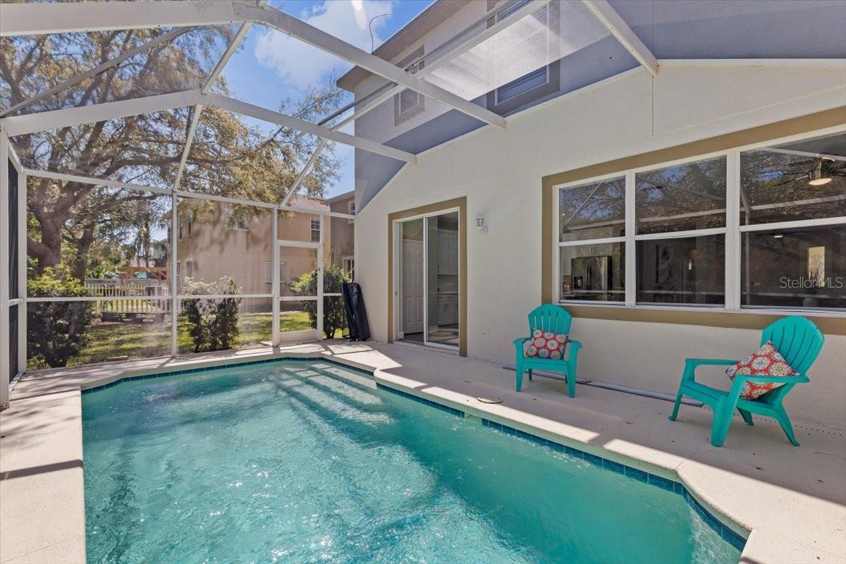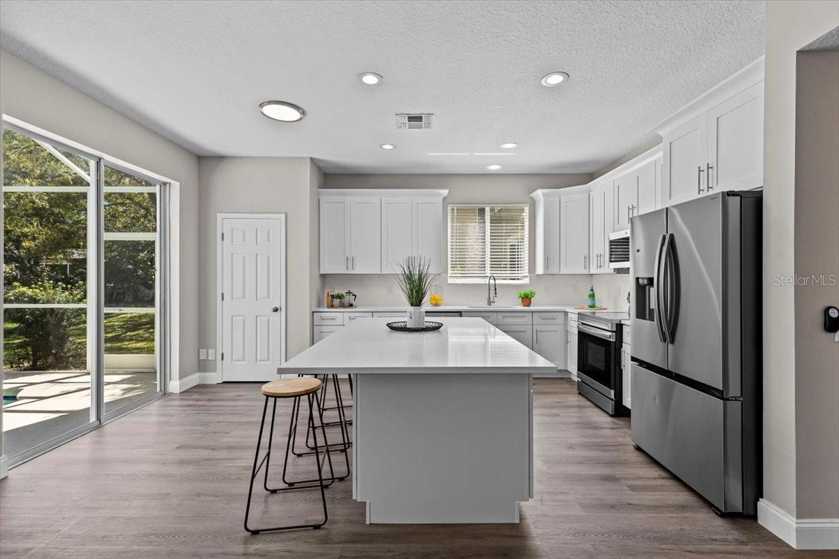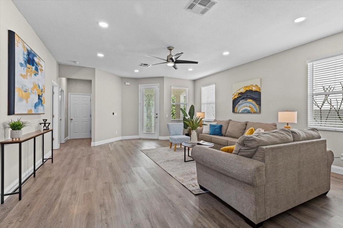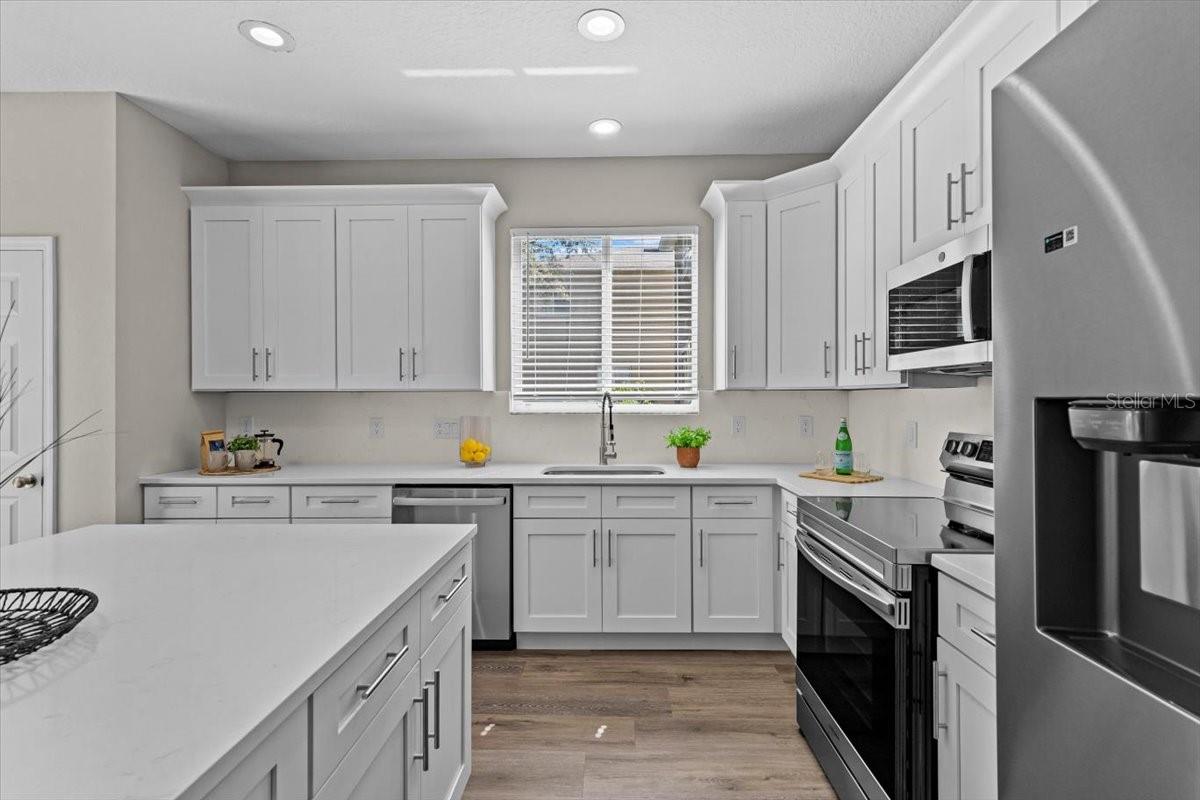 SELLER WILL REPLACE ROOF WITH AN ACCEPTABLE OFFER! Welcome home to this expansive 4-bedroom, 3-bathroom 2-car garage, pool home retreat in the sought-after Seven Oaks community. Nestled on a serene conservation lot with picturesque pond views, this home offers the perfect balance of comfort, style, and nature. From the moment you arrive, you’ll be welcomed by fresh landscaping and a covered tile entryway that invites you inside. Step into the spacious living room, where natural light pours in through large windows, highlighting the warm luxury vinyl flooring and all-new updated fixtures that create a cozy and inviting atmosphere. The heart of the home is the beautifully updated kitchen, thoughtfully designed with modern touches that make cooking and entertaining a delight. Crisp white shaker cabinets, quartz countertops, brand-new stainless steel appliances, and a large island provide plenty of prep space while offering stunning views of the pool and tranquil pond just beyond the sliding glass doors. The kitchen seamlessly connects to a bright dining area and a cozy seating nook, making it the perfect place for gathering with loved ones. Just beyond the kitchen and dining area, a spacious first-floor bedroom offers flexibility as a guest suite or home office, complete with a spacious closet. Nearby, a stylishly updated full bathroom with a quartz-topped vanity and chic luxury vinyl flooring provides convenience for guests. Thoughtful storage solutions throughout the first floor ensure everything has its place. Venture upstairs to find a versatile loft space, ideal for a home office. The inviting Primary Suite is a true retreat, offering breathtaking views of the conservation area and pond. Wake up to peaceful scenery and unwind in the primary bathroom, featuring a new double vanity with quartz countertops, a garden tub, and a walk-in shower. A spacious walk-in closet provides ample storage for all your needs. Two additional generously sized bedrooms, each with large walk-in closets, and a third full bathroom with modern updates complete the second floor. A conveniently located laundry room adds to the home’s practical charm. Step outside to your own backyard oasis. The screened-in pool area is perfect for relaxing or entertaining, offering stunning water and conservation views. Whether you're enjoying a morning coffee on the patio or taking an evening swim, this outdoor space is designed to be your personal retreat. Beyond the home, the Seven Oaks community offers an array of resort-style amenities. Enjoy the sun deck with private cabanas, swim in the Junior-Olympic lap pool with a thrilling double-loop waterslide, or let the splash park bring out your inner child. Sports enthusiasts will appreciate the tennis courts, sand volleyball court, softball and soccer fields, and a fully-lit basketball court. The welcoming clubhouse features a fitness center, locker rooms with showers, a multi-tiered theater with a projection screen, gathering spaces, and a café for your convenience. Located near top-tier shopping and dining options like The Shops at Wiregrass, Tampa Premium Outlets, you'll have everything you need just moments away. With premier medical facilities such as Advent Health of Wesley Chapel and BayCare-Wesley Chapel. This isn’t just a house—it’s a place to call home. Schedule your private tour today and discover the comfort and lifestyle that await you in Seven Oaks. For a virtual tour, click the provided link.