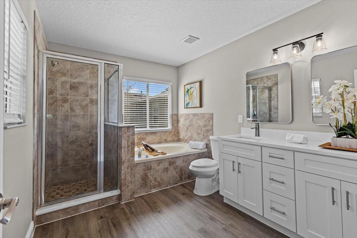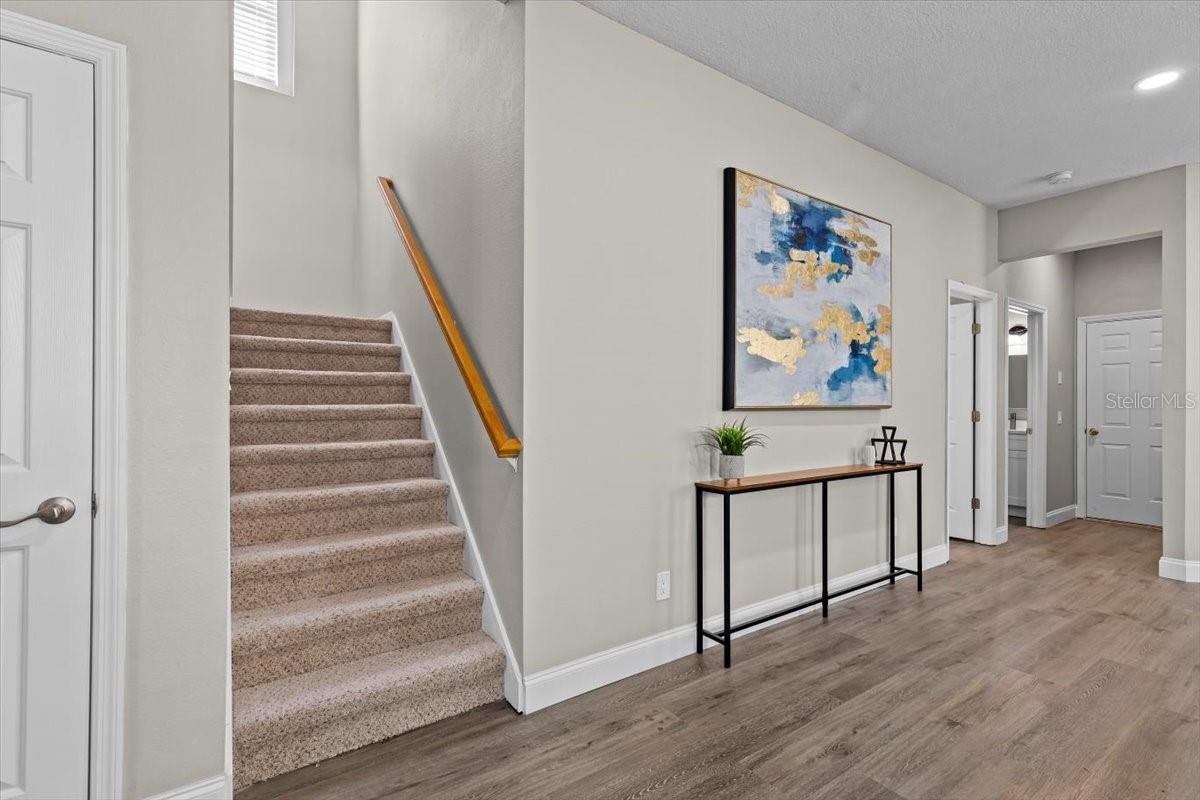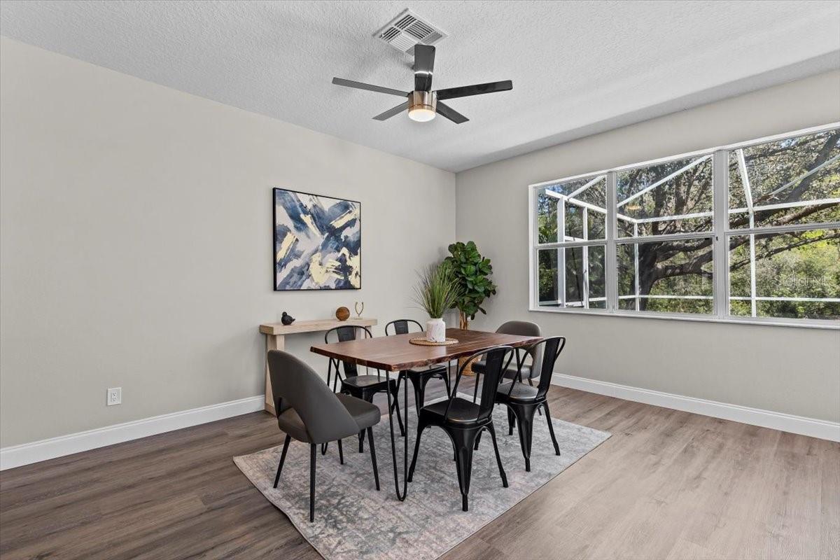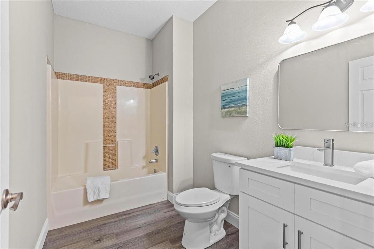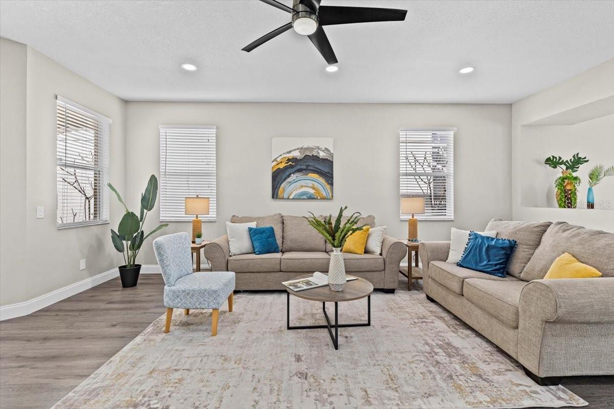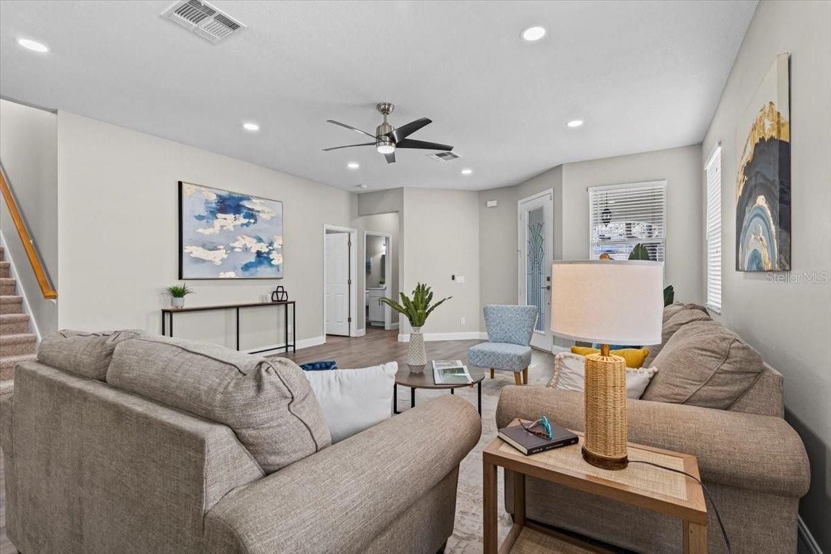 SELLER WILL REPLACE ROOF WITH AN ACCEPTABLE OFFER! Welcome home to this expansive 4-bedroom, 3-bathroom 2-car garage, pool home retreat in the sought-after Seven Oaks community. Nestled on a serene conservation lot with picturesque pond views, this home offers the perfect balance of comfort, style, and nature. From the moment you arrive, you’ll be welcomed by fresh landscaping and a covered tile entryway that invites you inside. Step into the spacious living room, where natural light pours in through large windows, highlighting the warm luxury vinyl flooring and all-new updated fixtures that create a cozy and inviting atmosphere. The heart of the home is the beautifully updated kitchen, thoughtfully designed with modern touches that make cooking and entertaining a delight. Crisp white shaker cabinets, quartz countertops, brand-new stainless steel appliances, and a large island provide plenty of prep space while offering stunning views of the pool and tranquil pond just beyond the sliding glass doors. The kitchen seamlessly connects to a bright dining area and a cozy seating nook, making it the perfect place for gathering with loved ones. Just beyond the kitchen and dining area, a spacious first-floor bedroom offers flexibility as a guest suite or home office, complete with a spacious closet. Nearby, a stylishly updated full bathroom with a quartz-topped vanity and chic luxury vinyl flooring provides convenience for guests. Thoughtful storage solutions throughout the first floor ensure everything has its place. Venture upstairs to find a versatile loft space, ideal for a home office. The inviting Primary Suite is a true retreat, offering breathtaking views of the conservation area and pond. Wake up to peaceful scenery and unwind in the primary bathroom, featuring a new double vanity with quartz countertops, a garden tub, and a walk-in shower. A spacious walk-in closet provides ample storage for all your needs. Two additional generously sized bedrooms, each with large walk-in closets, and a third full bathroom with modern updates complete the second floor. A conveniently located laundry room adds to the home’s practical charm. Step outside to your own backyard oasis. The screened-in pool area is perfect for relaxing or entertaining, offering stunning water and conservation views. Whether you're enjoying a morning coffee on the patio or taking an evening swim, this outdoor space is designed to be your personal retreat. Beyond the home, the Seven Oaks community offers an array of resort-style amenities. Enjoy the sun deck with private cabanas, swim in the Junior-Olympic lap pool with a thrilling double-loop waterslide, or let the splash park bring out your inner child. Sports enthusiasts will appreciate the tennis courts, sand volleyball court, softball and soccer fields, and a fully-lit basketball court. The welcoming clubhouse features a fitness center, locker rooms with showers, a multi-tiered theater with a projection screen, gathering spaces, and a café for your convenience. Located near top-tier shopping and dining options like The Shops at Wiregrass, Tampa Premium Outlets, you'll have everything you need just moments away. With premier medical facilities such as Advent Health of Wesley Chapel and BayCare-Wesley Chapel. This isn’t just a house—it’s a place to call home. Schedule your private tour today and discover the comfort and lifestyle that await you in Seven Oaks. For a virtual tour, click the provided link.