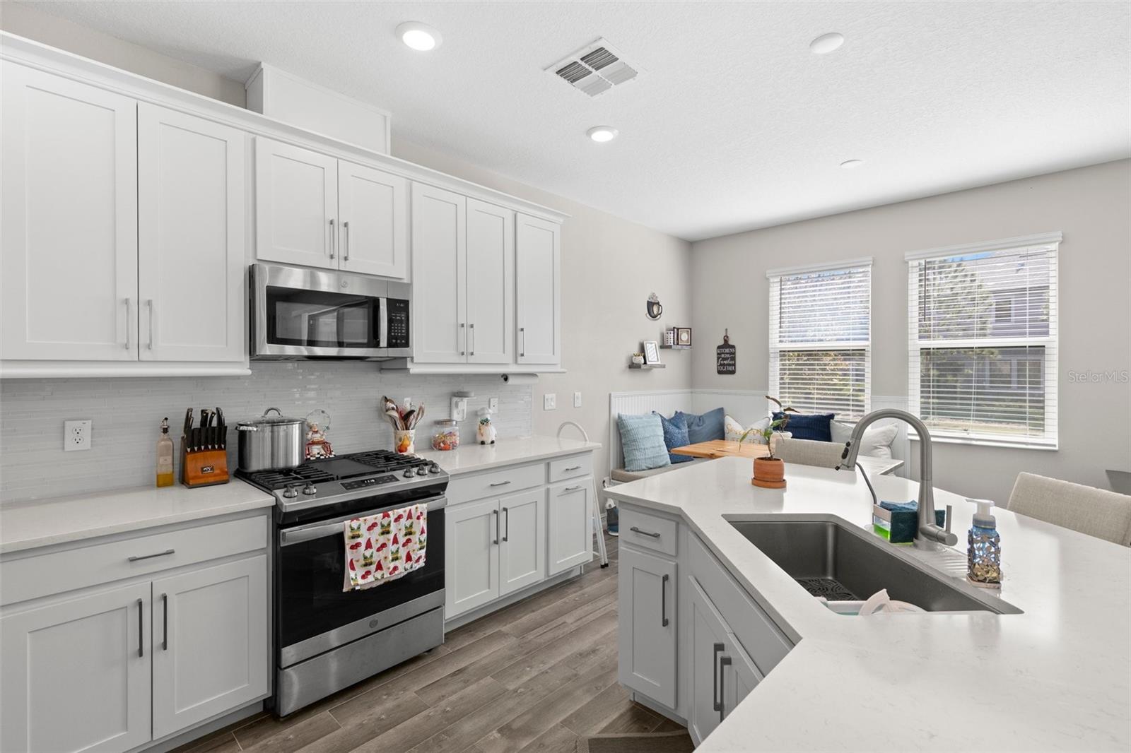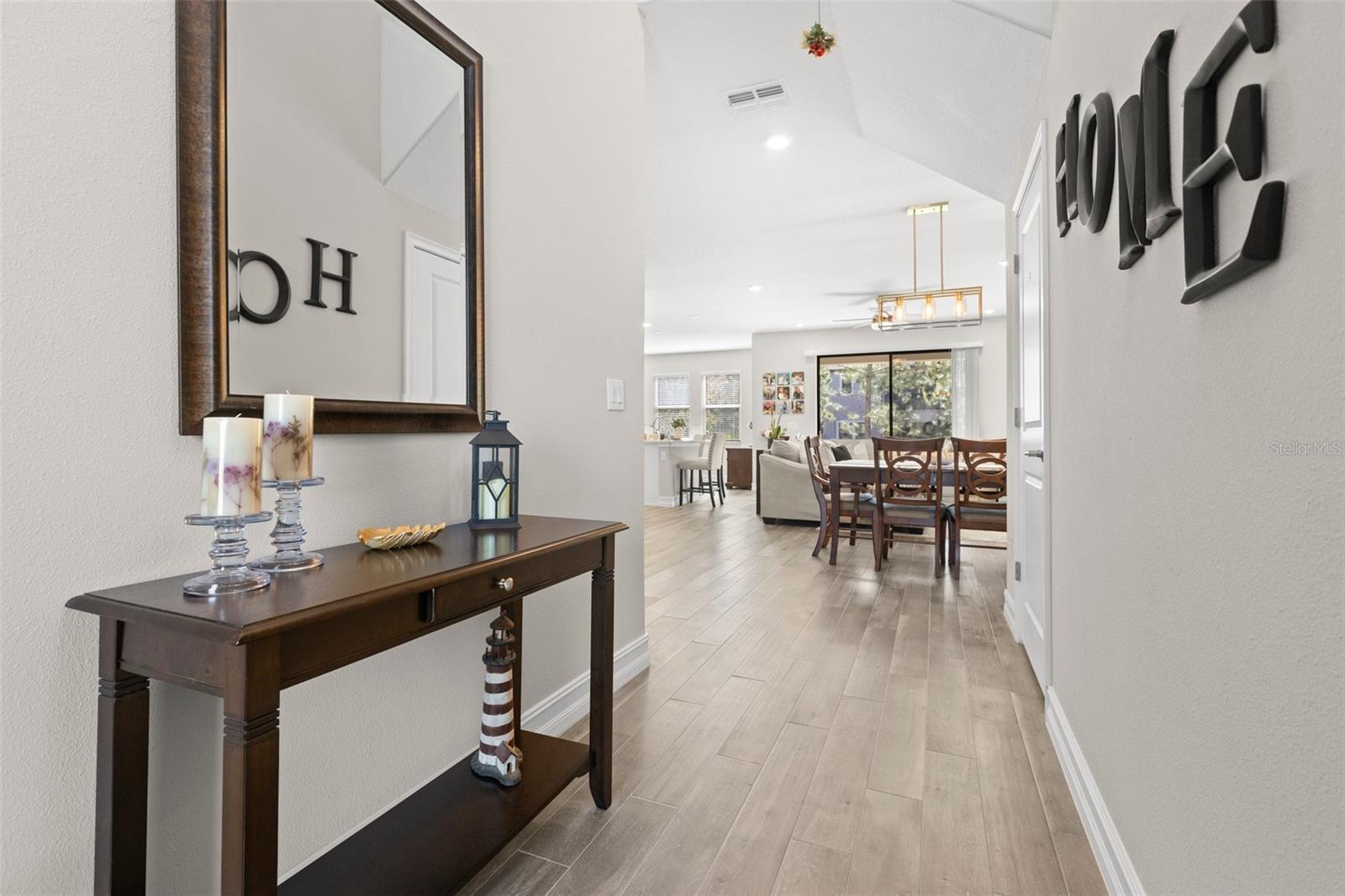 Welcome to your new home in this expansive end-unit Vittoria model townhouse, offering over 2,000 square feet of beautifully designed living space. This stunning residence features 3 bedrooms plus a den/study, 2.5 bathrooms, and a convenient 2-car garage. Built just three years ago, it is nestled in the highly desirable Estancia community, right in the vibrant heart of Wesley Chapel—one of Tampa Bay’s most sought-after suburbs.As you step inside, you'll be welcomed by a bright and airy two-story foyer that flows into the open-concept living area. This townhouse boasts elegant upgrades, including wood-look tile flooring and smart home features such as remote-controlled blinds and Wi-Fi-enabled keypads. The kitchen is equipped with a gas cooktop, ample cabinet space, and a gas dryer, complemented by a tankless water heater.The separate den/study provides a perfect retreat, while the living room and kitchen area create an ideal space for entertaining. Enjoy serene views of nature from your windows and covered lanai, making it a perfect spot to unwind.Upstairs, the luxurious master suite awaits, complete with a private covered balcony, tray ceiling, and an expansive master bathroom featuring a walk-in closet and dual sinks. Two generously-sized guest bedrooms and a second full bathroom are also located on this floor, along with a thoughtfully positioned laundry room.As a resident of Estancia, you'll have access to exceptional amenities, including a resort-style clubhouse, heated swimming pool, tennis and basketball courts, nature trails, playgrounds, dog parks, and more! The highly-rated Wiregrass school district and prime location within the Wiregrass Ranch area of Wesley Chapel make this one of the most attractive suburbs in the Tampa Bay region. With easy access to the interstate, hospitals, shopping malls, restaurants, and everything you need just minutes away, this end-unit townhouse is an unparalleled opportunity you won't want to miss!