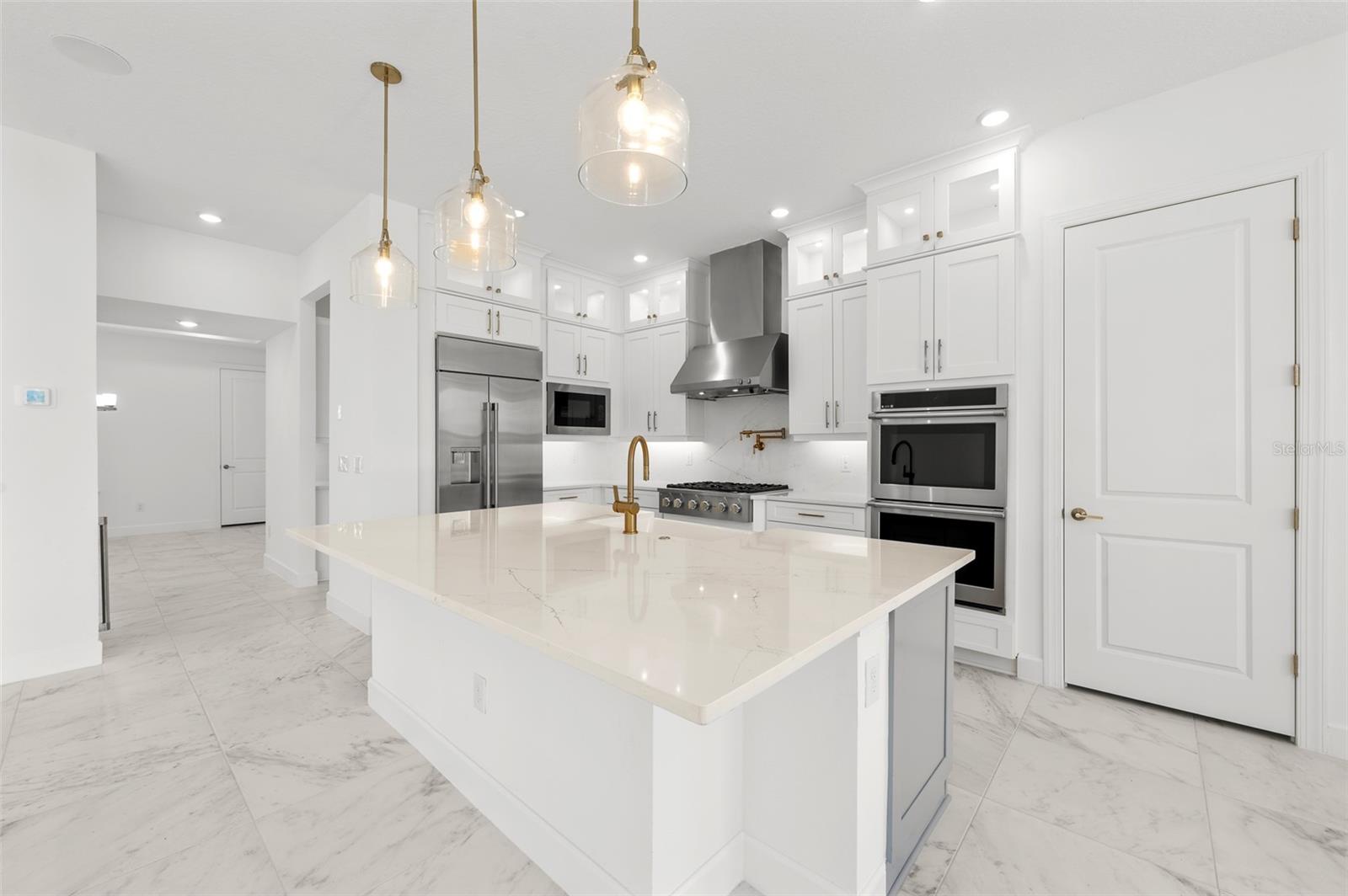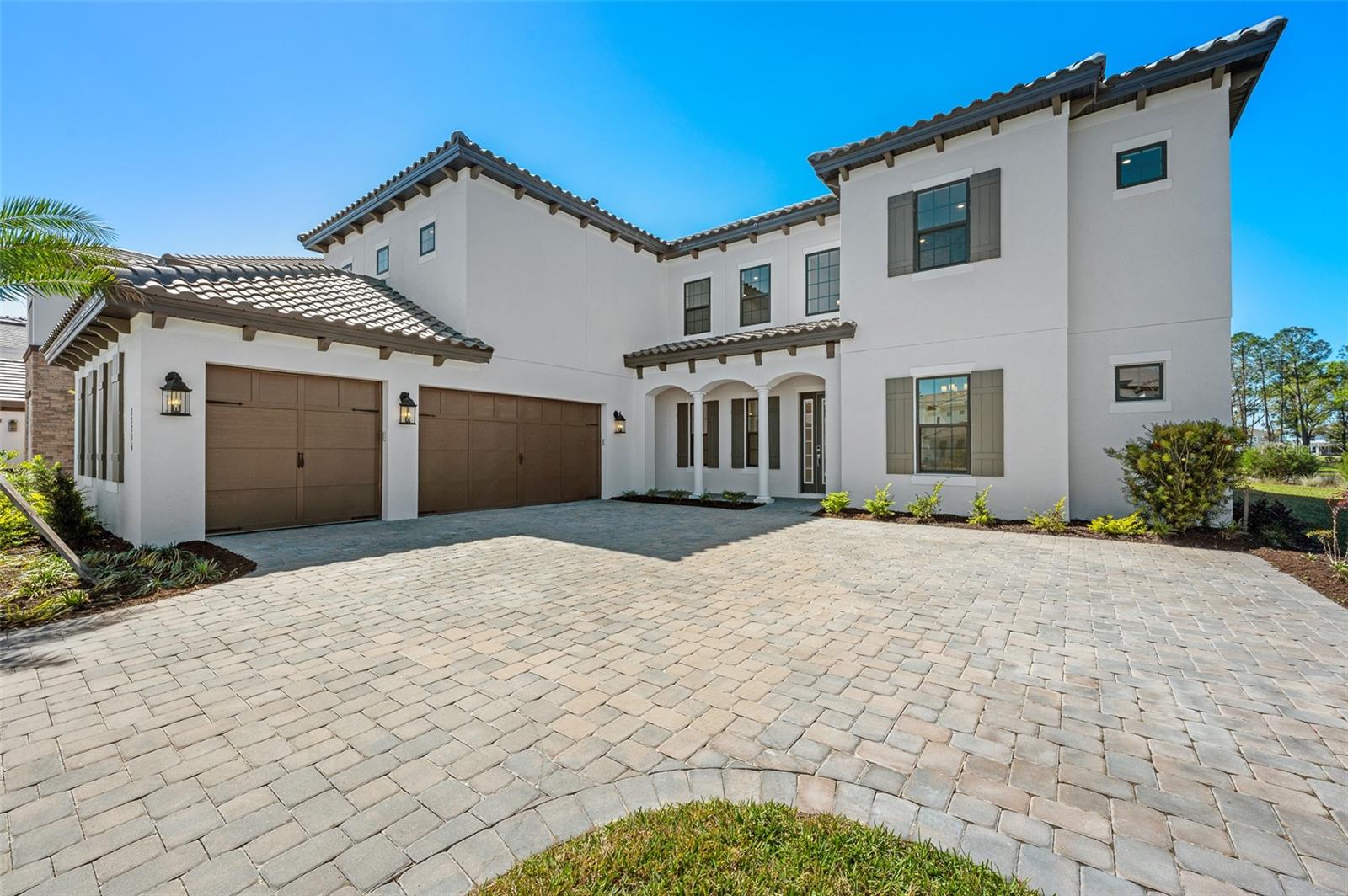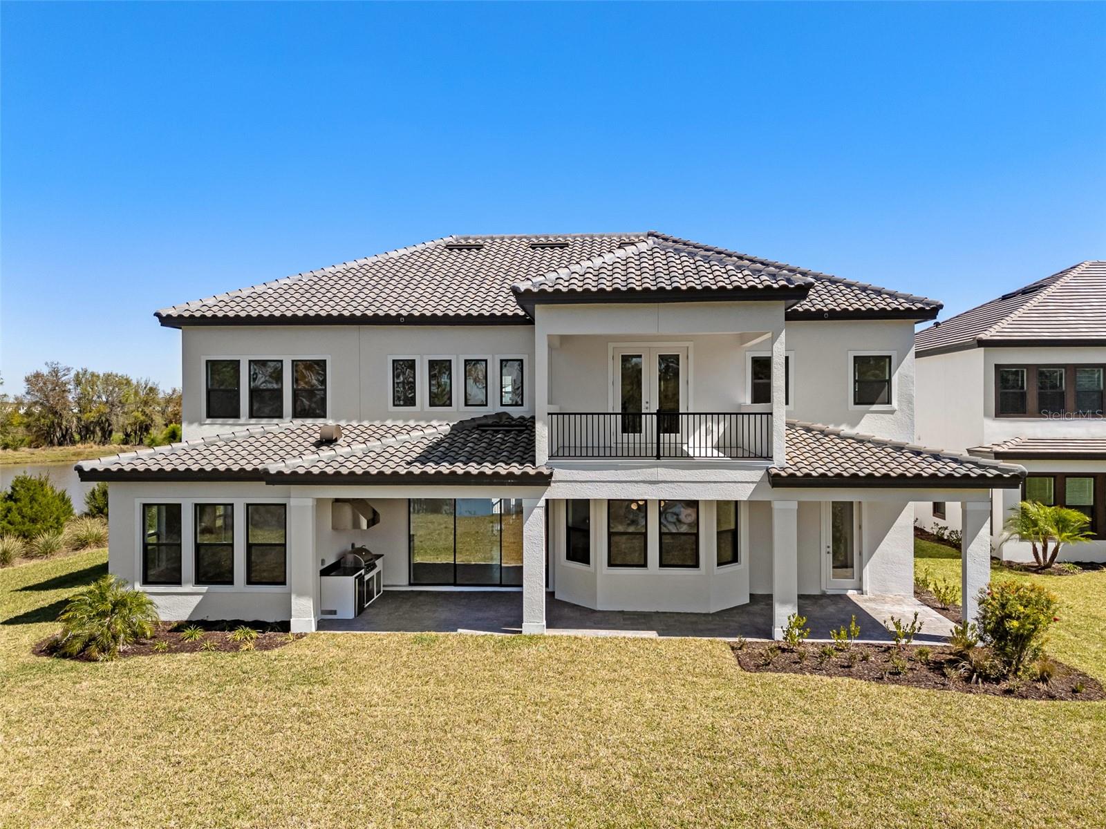 Introducing an unparalleled residence in the exclusive gated community of River’s Edge. This exquisite new construction property offers six bedrooms, 4.5 baths, oversized three-car garage, dedicated office, theater room, bonus loft with wet bar, formal dining room with butler’s pantry and second-story balcony overlooking panoramic pond views. This exclusive home offers unparalleled luxury, comfort, and an elevated sense of privacy as it rests on a premium corner lot within a tranquil cul-de-sac and features ideal minimal neighboring homes. This Taylor Morrison Forsyth floor plan boasts breathtaking western pond views, creating a serene and picturesque backdrop for sunsets and everyday living. From the moment you step inside, you'll be captivated by the grandeur of the open two-story foyer and living room, accentuated by soaring ceilings and 8-foot doors, radiating an aura of spaciousness and elegance. The thoughtfully designed interior features a formal dining room ideal for entertaining alongside the butler’s pantry with direct access to the breathtaking kitchen. You will also find a designated office space with glass French doors, and a separate media room with built-in surround sound speakers and a vaulted ceiling optimized for projector viewing. Large format tile flows seamlessly throughout the main living area, leading to an amazing open kitchen that is a chef's dream. Equipped with upgraded Monogram stainless steel appliances, a large center island with beautiful pendant lighting, a pot filler, farmhouse sink with a touchless faucet and large walk-in pantry, this kitchen is as functional as it is exquisite. The primary suite features idyllic views of the water and includes an en-suite bath with an elegant frameless glass walk-in shower complete with additional rainfall shower head, a freestanding deep-soaking bathtub and a private water closet. Tray ceilings in the primary suite, dining room and office add a touch of architectural sophistication. Step outside through the pocket sliding doors to discover an extended covered lanai and full outdoor kitchen, ideal for alfresco dining and entertaining. A convenient pool bath and bonus room enhances the outdoor living experience. The second level is thoughtfully designed with dual guest bedroom wings, each offering shared baths, ensuring privacy and comfort for family and guests. A bonus loft area completes the upstairs living experience with a full wet bar and adjacent half bath, plus access to the covered rear balcony. Practical features abound, including multi-zoned air-conditioning systems, a Culligan water softener system, indoor/outdoor audio system, and a tankless gas water heater, ensuring optimal comfort and efficiency. The oversized three-car garage, complete with an additional golf cart parking space, caters to all your storage needs. The property is also pre-plumbed for a pool addition, offering potential for further customization. Residents of River’s Edge enjoy access to a first-class clubhouse, resort-style pool and hot tub, fitness center, playground, dog park, soccer field, basketball court, tennis and pickleball courts, and peaceful recreational trails. Nearby, there is also access to many shopping, dining and entertainment options including The Shops at Wiregrass, Cooper’s Hawk Winery & Restaurant, Tampa Premium Outlets and ideally close to major roadways making travel to Tampa and Tampa International Airport convenient.
