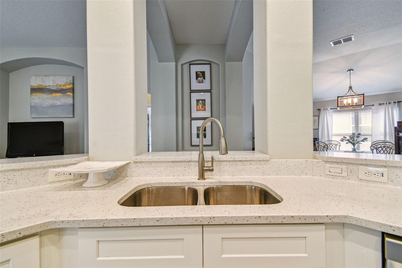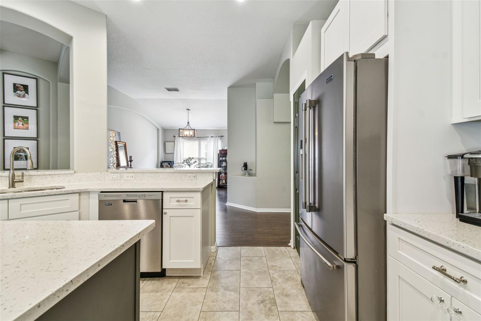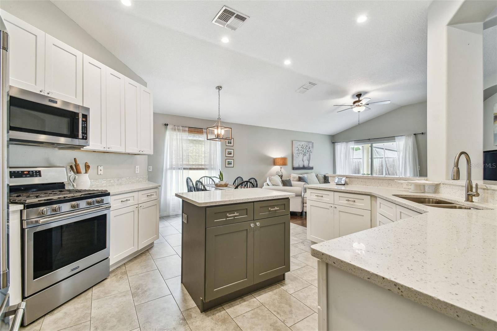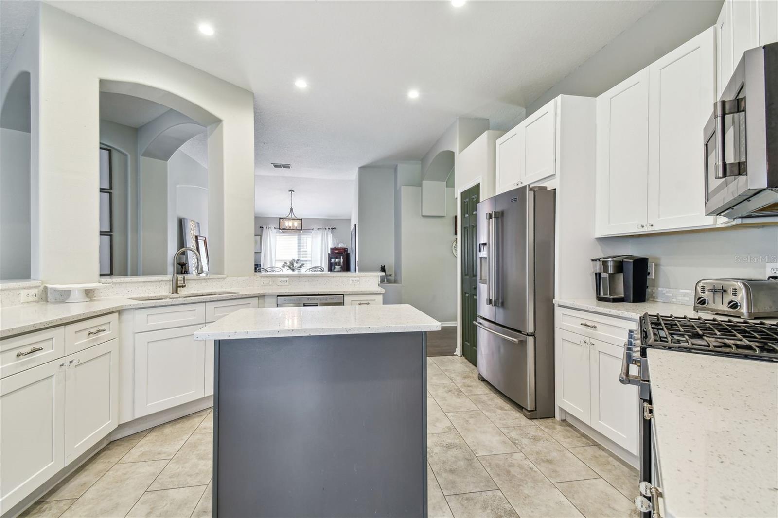 Beautiful, sought-after three bedroom PLUS den home in popular Meadow Pointe. Open floor plan with tall ceilings and plenty of windows create a light and bright atmosphere. The large kitchen has been fully renovated and upgraded to feature white 42" shaker-style cabinetry, quartz countertops, tile backsplash, stainless steel undermount sink with one touch faucet, Maytag stainless steel appliances to include French door refrigerator, built-in microwave, dishwasher and five burner gas range. The kitchen also includes a large breakfast bar that can seat six, spacious casual dining area, recessed lights and pantry. Other upgrades to this lovely home include: 12x24 ceramic tile in kitchen, casual dining and second bathroom, quality laminate flooring in the great room, dining room, den/study, entry and hallway, upgraded vanity and shower tile in the second bathroom, decorative arches and niches and more. The primary bathroom features a double vanity, garden tub, walk-in shower, private water closet and spacious walk-in closet. Sit out on the enlarged and pavered lanai overlooking the private and fenced yard. Meadow Pointe is the Bay areas largest master-planned community featuring tremendous amenities including a swimming pool with water slide, splash pad, gym, playground, courts, sand volleyball plus walking, running and biking trails throughout the community. A-rated elementary, middle and high school within walking distance. A short drive to shopping, dining, recreation, USF, several area hospitals, Shoppes at Wiregrass, Premium Outlet Mall and a 30 minute drive to downtown Tampa. Pride of ownership is evident. Hurry!
