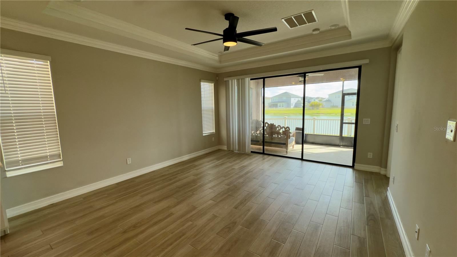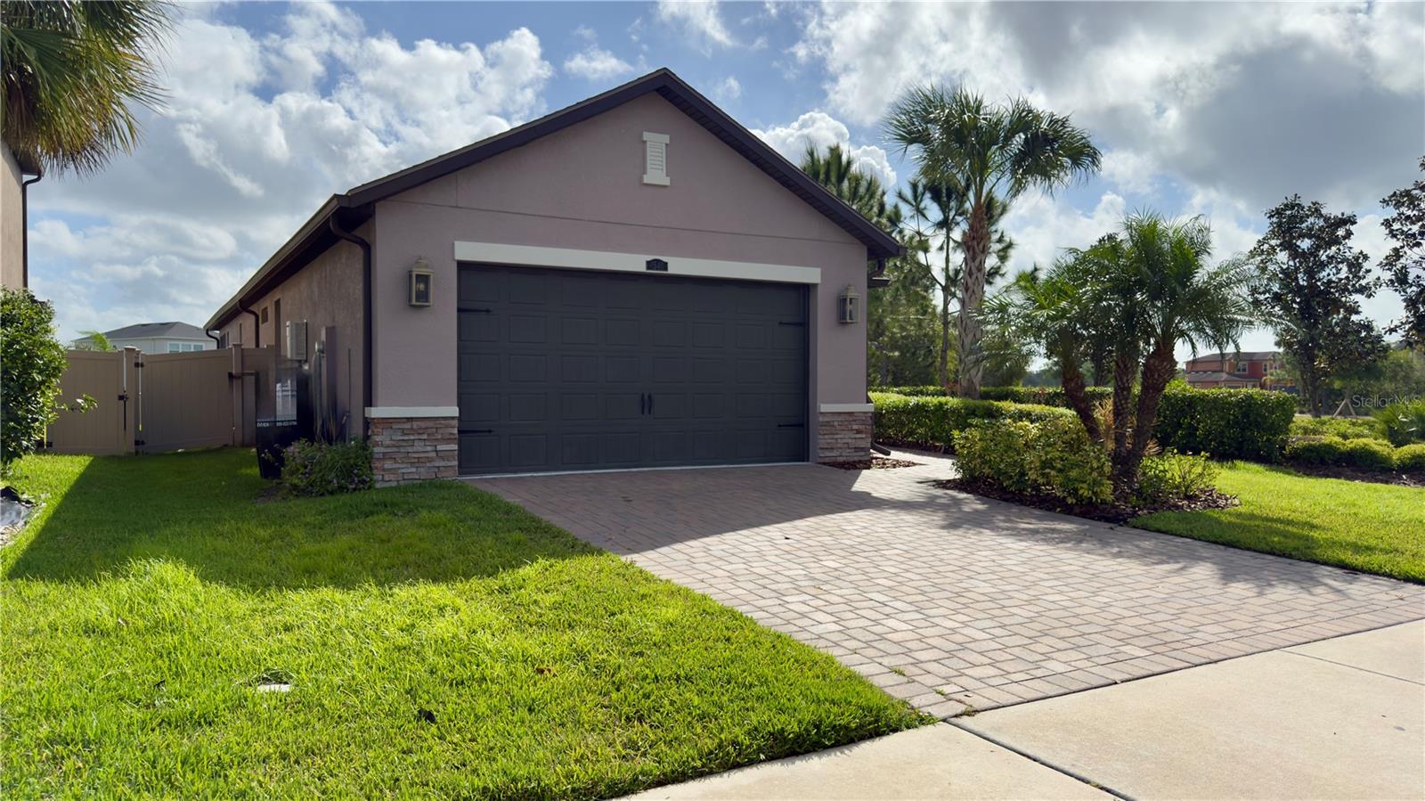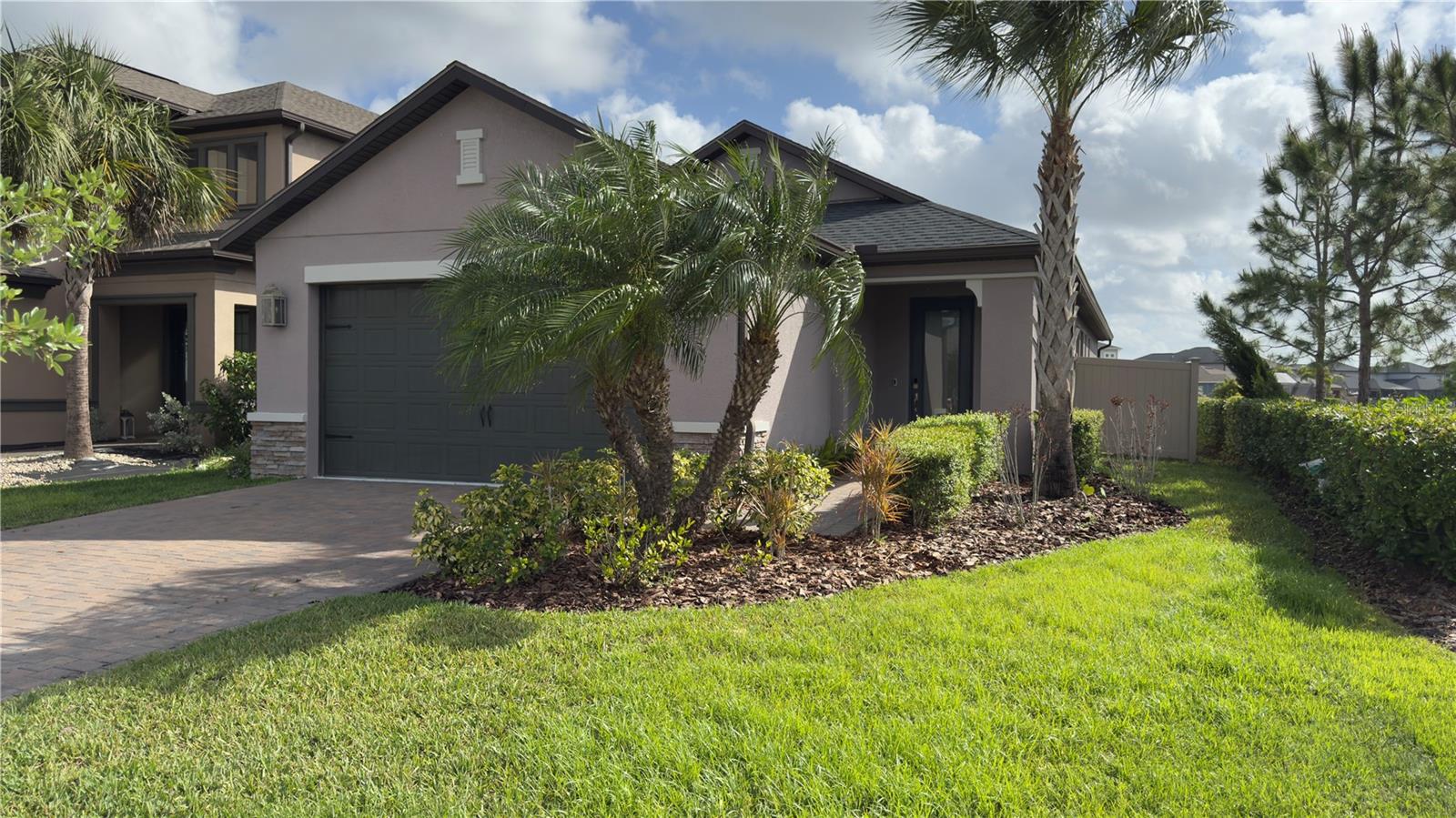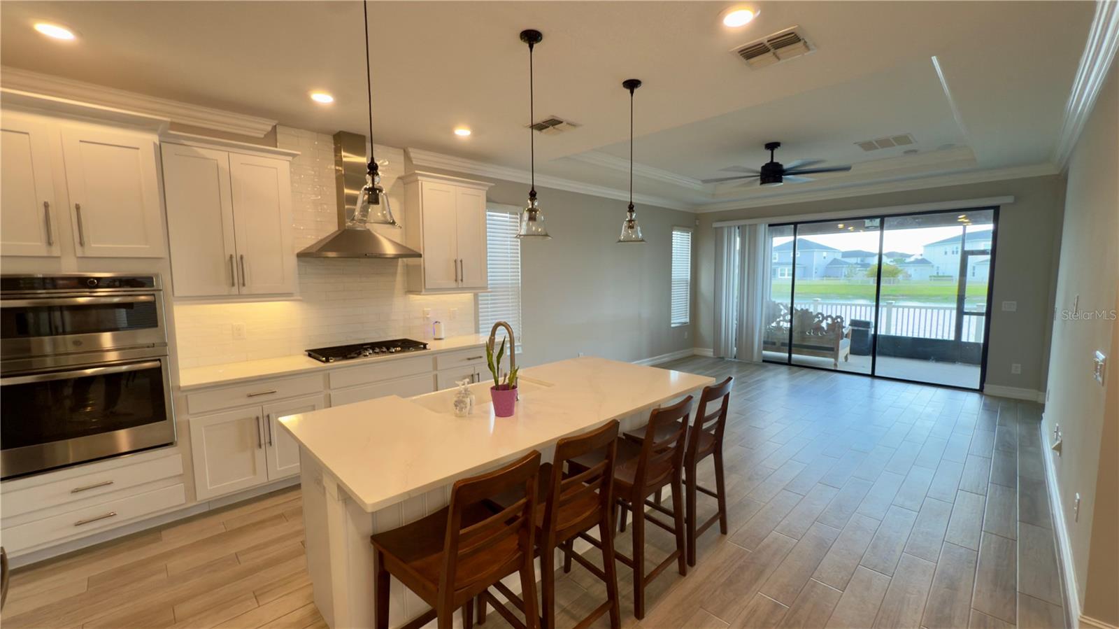 Welcome to this modern contemporary 3 bedroom, 2-bathroom home nestled on a beautiful corner lot located in the highly sought community of Estancia. This gorgeous home overlooks a serene conservation pond for relaxing privacy. As you walk up the paver line driveway up to the covered front door, the decorative glass front door opens to the bright & open floor plan. The kitchen features stainless steel appliances, kitchen island with a large deep sink, quartz countertops, under mount cabinet lighting, designed backsplash, closet pantry with built in shelving & pendant lights. The kitchen+ great room combo is perfect for entertaining. The great room has 3 way sliding doors that open up to a large 16X10 screened lanai with a view looking out to the pond. Master bathroom comes with dual vanities/sinks, glass seamless large walk-in shower with custom bench seat & walk in closet with built in shelving. Home is a split plan. Other features include wood/vinyl flooring throughout the home, lots of crown molding & tray ceilings & hurricane shutters. Community features include a luxury community pool, kiddie pool, splash zone, clubhouse, fitness center, dog park, walking trail, playground & tennis court. Close to the schools, lots of shopping areas including 3 malls, restaurants, hospitals & mutiple entertainment places. Home is in move in condition.
