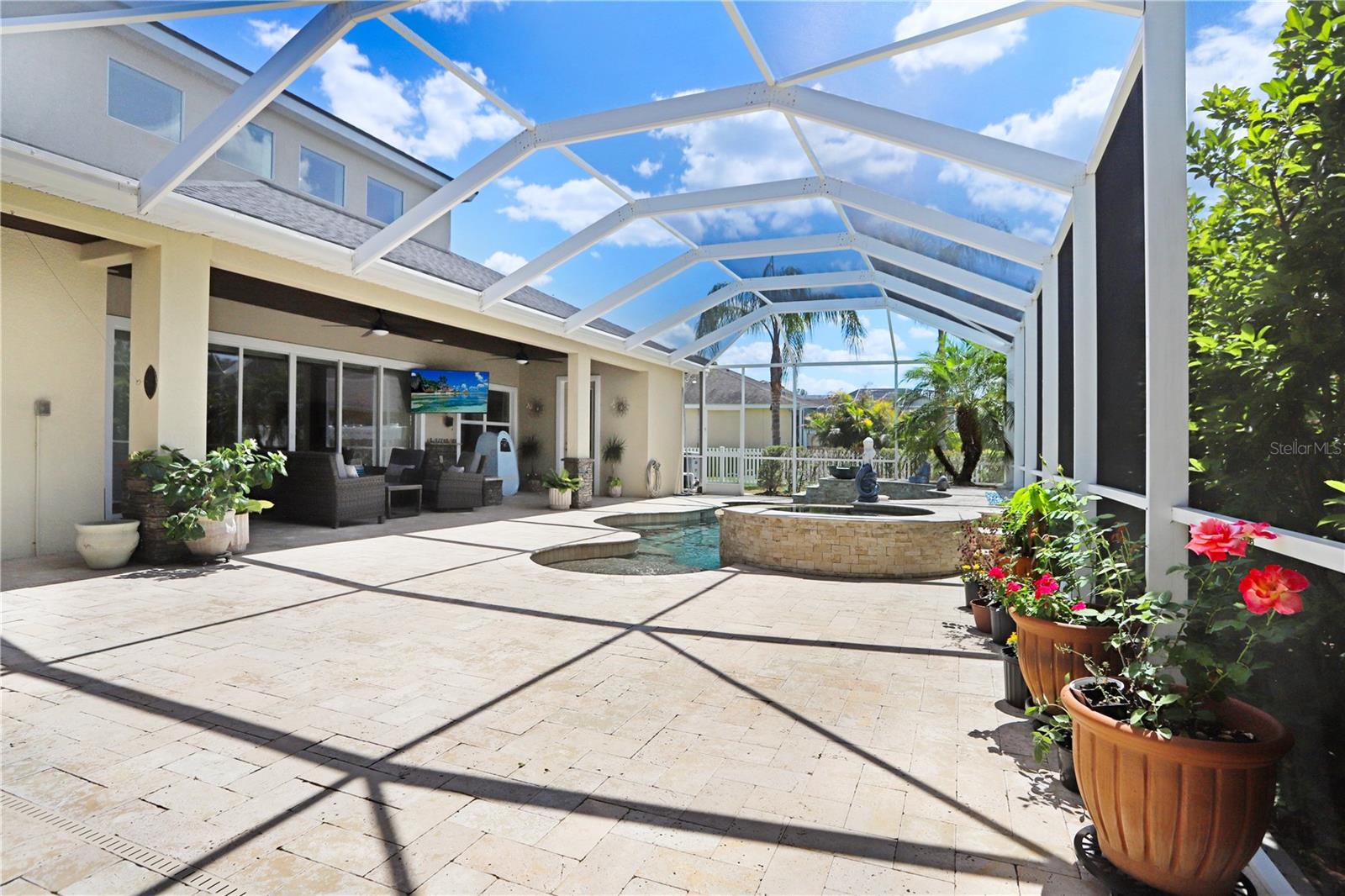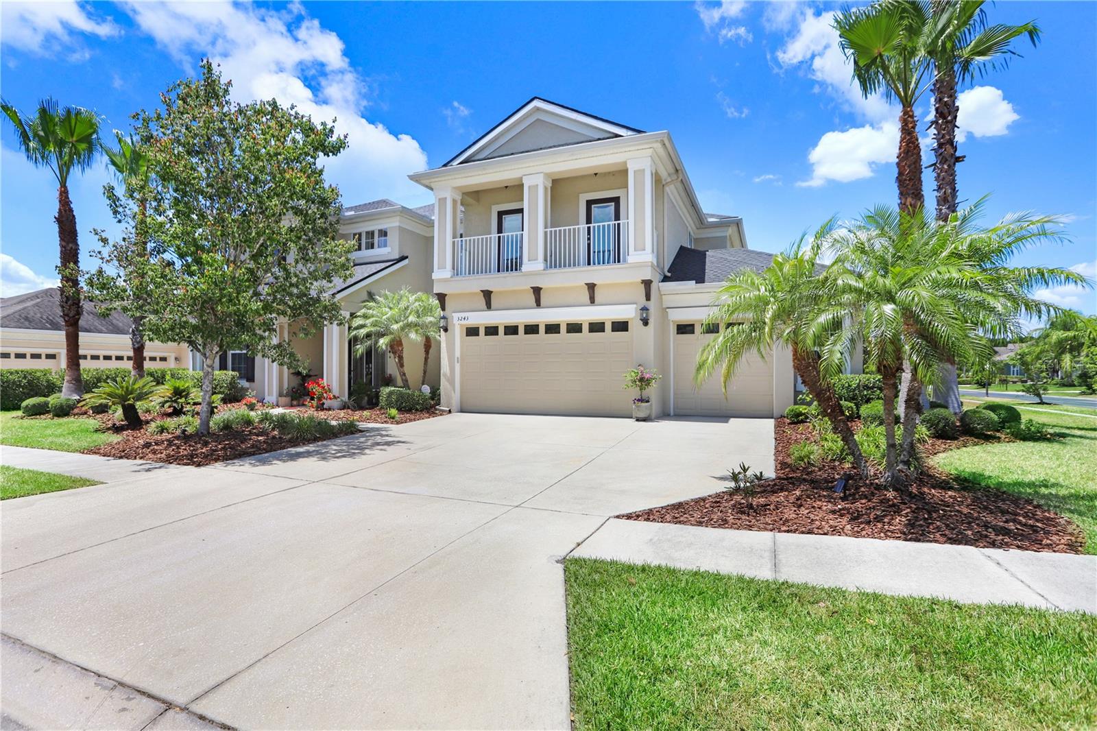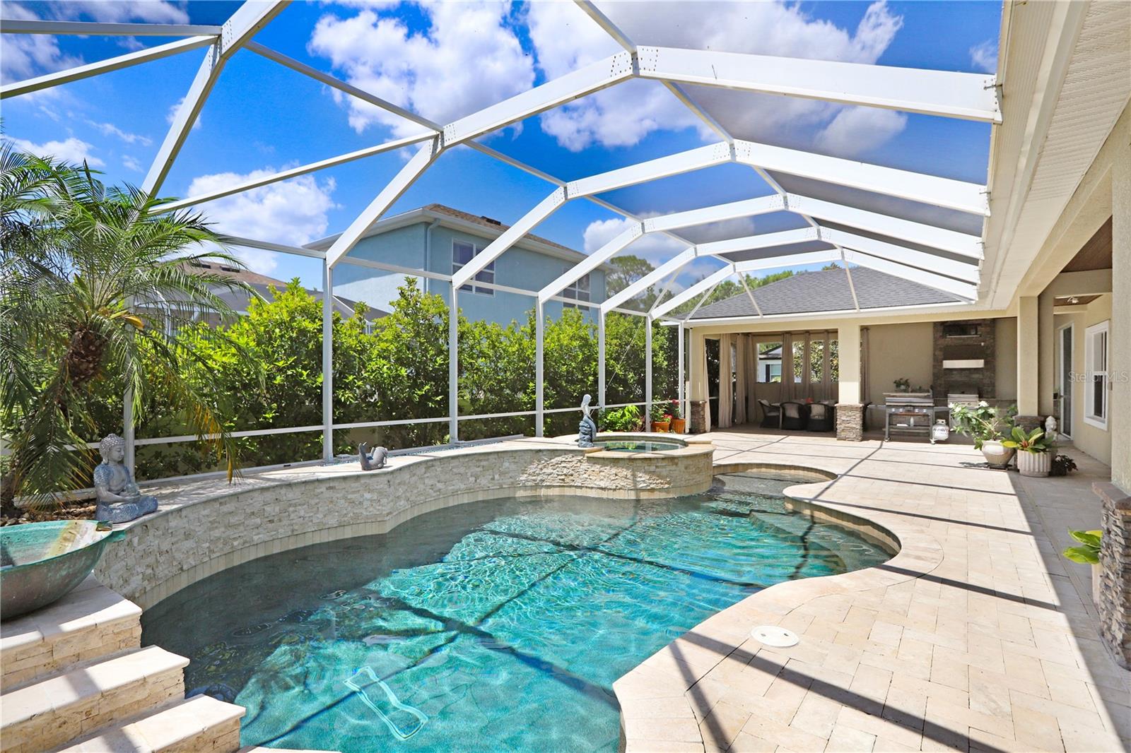 If the Florida lifestyle is calling your name....then STOP THE CAR!!!! Welcome to the highly desired gated village of Watermark in Seven Oaks, the Wesley Chapel community where everyone wants to live. As you drive in, you'll be impressed with the lush landscaping, mature trees, wide sidewalks, wooden walkways, and a community center that is full of FUN!!! This Westbay home radiates luxury all around, from the 23 ft high ceilings to the extended outdoor kitchen area, and so much more! This Gasparilla floorplan features 5 bedrooms, 4 and a half bathrooms with a 3-car garage, located on an oversized corner lot. Boasting 3,707 square feet, this beauty will check all of your boxes. Previously featured in Florida Home Magazine for an exquisite outdoor paradise, you'll find entertaining easy peasy ! The saltwater pool & spa area is mesmerizing with not one but two outdoor gas fireplaces which are stunning at night. The large outdoor kitchen area is fully equipped with a new grill featuring ceramic & infra-red burners, a mini fridge and sink. Enjoy dinner and drinks in your fully screened lanai without the pesky mosquitos bothering you and a private pool bath with access only from the lanai. Upon entering the home you'll find a floorplan that is open and airy with tons of natural light from all directions. The primary and one other bedroom are located on the first level but is currently being used as a home office. The kitchen island is enormous, giving you several seating options and it overlooks the family room so you will not miss a beat. Whether you are meal prepping, cleaning dishes or having a cup of joe, you'll be able to watch TV or entertain effortlessly! The true focal point of the home is the stunning staircase that comes together in the family room. You can conveniently access the second level from the kitchen or entrance of the home. The upstairs bonus room has double doors making movie night private and cozy!! You'll find 3 additional bedrooms and 2 full bathrooms completing the 2nd level. Upgrades include a new roof Feb. 2025, both upstairs bathrooms have been converted to tiled walk-in showers, garage opener belt-drive w/camera, GE reveal ceiling lights w/dimmers, auto sensor lights in primary bath & closet, kitchen reverse osmosis system, Wi-Fi enabled sprinklers, nest thermostat on both levels, front door Wi-Fi enabled locks, and updated rear drainage system. The home also includes a Generac system, mini golf area, security camera system, outdoor ceiling speakers and 5.1 surround sound system in the living area. Seven Oaks offers residents outstanding amenities, including multiple pools, tennis courts, playgrounds, nature trails, and a state-of-the-art clubhouse with a theater room. Conveniently located in the heart of Wesley Chapel, you're just moments away from premier shopping, dining, entertainment, and top-rated schools. Easy access to major interstates ensures a quick commute to Tampa International Airport, downtown Tampa, and the beautiful Gulf Coast beaches. This home is more than just a residence—it's a lifestyle. Come experience all that this home provides, and schedule your private showing today!