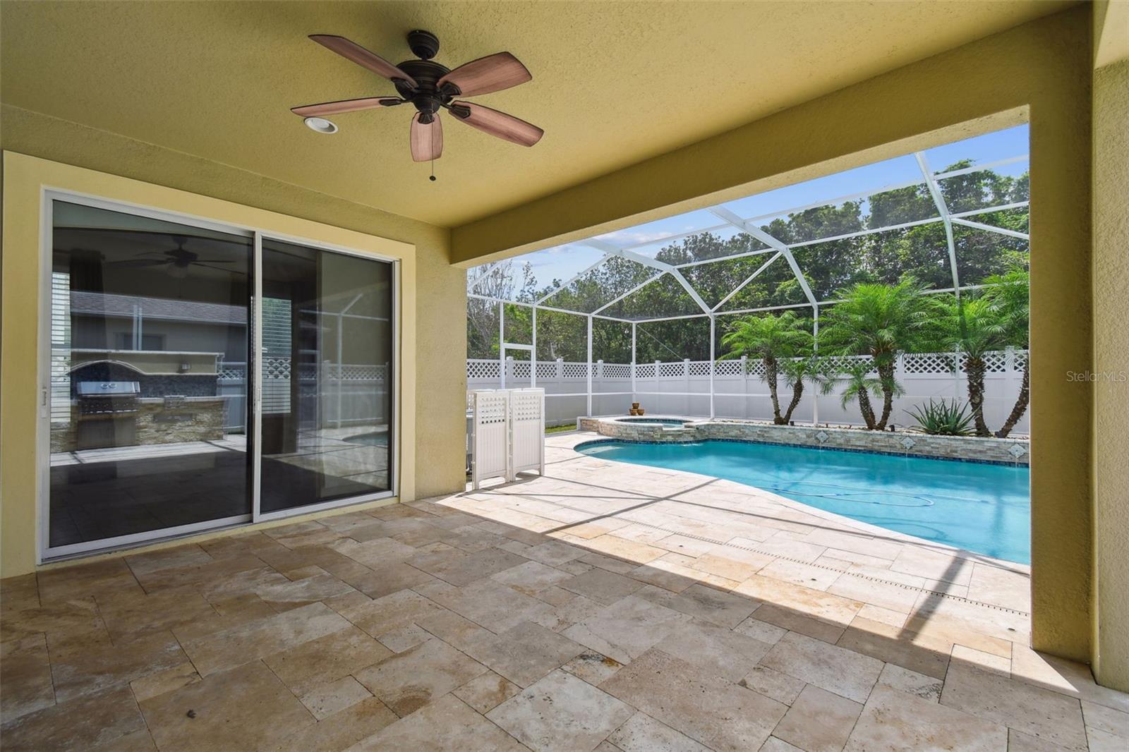 One or more photo(s) has been virtually staged. IMPROVED PRICE!!! PRISTINE POOL & SPA HOME with OUTDOOR KITCHEN on a CUL-DE-SAC! Located in the highly sought after gated community of Bellafield in Seven Oaks! This gorgeous Standard Pacific home offers 4 large bedrooms, 3 full baths, including a first-floor in-law suite, front den/office, and a second-floor bonus/loft area! The exterior of the home is sure to impress with stone facade accents, a 2-car garage driveway with pavers, and mature landscaping. Upon entering the home, you'll be greeted with a large foyer and French doors that open to a sunny and bright office/den. The gourmet kitchen is a chef's dream! Boasting an extra-large center island, stainless steel appliances, glass-top electric stove, double wall oven, granite countertops, recessed lighting, 42" upper cabinets, mini-fridge, and a walk-in pantry with wood shelving! You'll love the brand-new dishwasher and newer microwave! Eat at the island or in the large adjacent dining area! The family room offers a custom-built matching shelving/TV unit and is open to the kitchen which makes the space perfect for entertaining. Sliding glass doors lead to the peace & tranquility of a covered screened lanai complete with travertine pavers, fully fenced in backyard, large self-cleaning saltwater pool with NEW LED lighting, NEW POOL PUMPS, NEW SALT CELL, GROTTO/WATERFALL & HEATED SPA! The outdoor kitchen offers a newer grill, cold water sink, and lots of storage. Use the amazing retractable awning to fully shade yourself while cooking! The first floor also features a private bedroom and bathroom, along with a laundry room complete with front-loading Samsung washer/dryer, and utility sink. Head up the wooden staircase to the oversized primary bedroom, with en-suite bathroom complete with walk-in shower, garden tub, split vanities, private commode, and a built-in custom closet system! You'll also find 2 additional bedrooms, one in the front of the home and one in the back of the home, another full bathroom with double sinks, and a flex space/loft or bonus area! This home has all hard flooring throughout, plenty of closets, extra storage available under the stairs and in the pantry, irrigation system, gutters, in-wall pest control system, newly serviced A/C units, overhead garage storage racks, and security pre-wire. Seven Oaks offers a resort style clubhouse, pool w/slide and cabanas, basketball, tennis, and volleyball courts, along with a huge soccer field and brand-new community playground. Bellafield also has its very own community playground and basketball court as well! This home is served by top-rated elementary, middle, and high schools and is close to everything Wesley Chapel has to offer. You'll be minutes to the Premium Outlet Mall, restaurants, amenities, and new hospitals. Also, easy access to I275/I75, as well as the airport. MUST SEE!