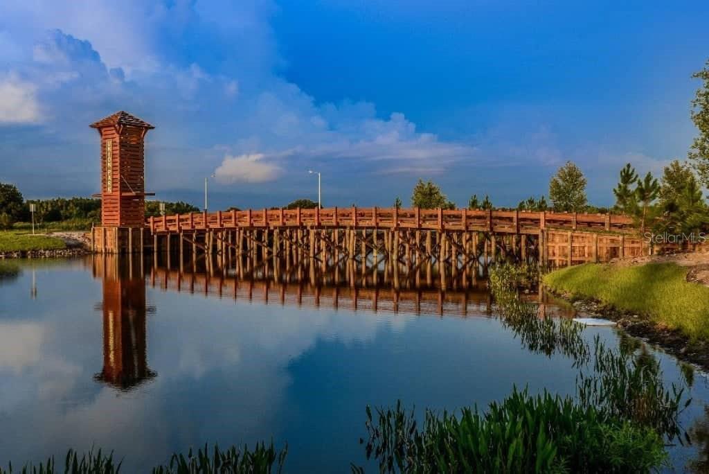Welcome to this inviting D.R. Horton Holden floor plan, beautifully situated on a serene pond-view homesite within the gated Liberty Square enclave of Union Park. This sought-after community is known for its natural setting, scenic walking trails, and resort-style amenities, offering a peaceful yet connected lifestyle. Take a moment to relax on the charming front porch before stepping inside to a thoughtfully designed open-concept layout ideal for both everyday living and entertaining. Near the front of the home, a private office with glass double doors creates an inspiring workspace and flows seamlessly through a glass barn door into the Butler’s Pantry—an elegant and functional transition. The bright and spacious great room and kitchen showcase tranquil pond views and overlook the expansive pavered patio. The kitchen features quartz countertops, an upgraded sink with a glass rinser, stainless appliances, and a Butler’s Pantry with a custom-designed walk-in pantry. This open Great Room includes a spacious dining area, large windows and sliding doors create a seamless connection to the covered lanai and outdoor kitchen. A guest bedroom and full bath on the main level provide comfort and privacy for visitors. Upstairs, a generous bonus loft offers endless possibilities as a media room, game space, or home gym. The spacious owner’s suite features a private ensuite bath and additional room for a sitting area, exercise space, or quiet retreat. The custom-designed closet conveniently connects to the upstairs laundry room for everyday ease. Two additional bedrooms and a third full bath complete the second level. One bedroom is currently outfitted with custom desks and cabinetry, making it an ideal home office or study space and easily converted to bedroom utilizing the current custom features. Step back downstairs and out to the inviting outdoor living area. Enjoy the covered 10x14 lanai with outdoor kitchen, then relax on the extended pavered patio with fire pit while taking in peaceful pond views. The fenced side and rear yard has plenty of room for pets and play. Additional upgrades include upgraded can lighting, tile plank flooring throughout all main living and wet areas, interior paint upgrades, custom pantry storage, reverse osmosis kitchen sink system, upgraded linen closets, and a Culligan water softener. Exterior enhancements include Trim Light exterior lighting, an extended pavered driveway, and gutters. This move-in ready home offers comfort, style, and tranquility—allowing you to immediately enjoy the peaceful setting and added security of this gated Union Park enclave.