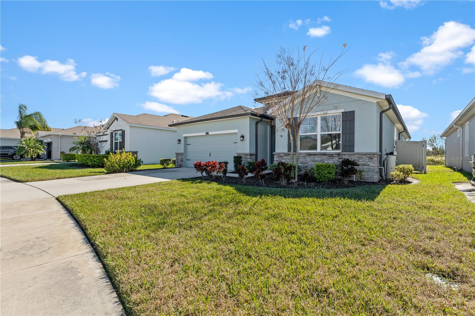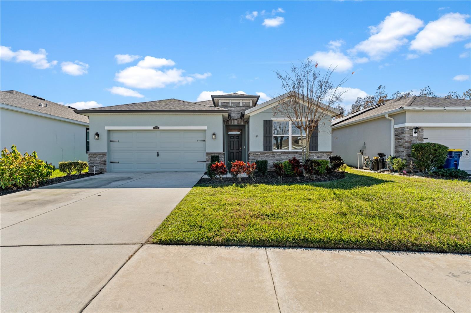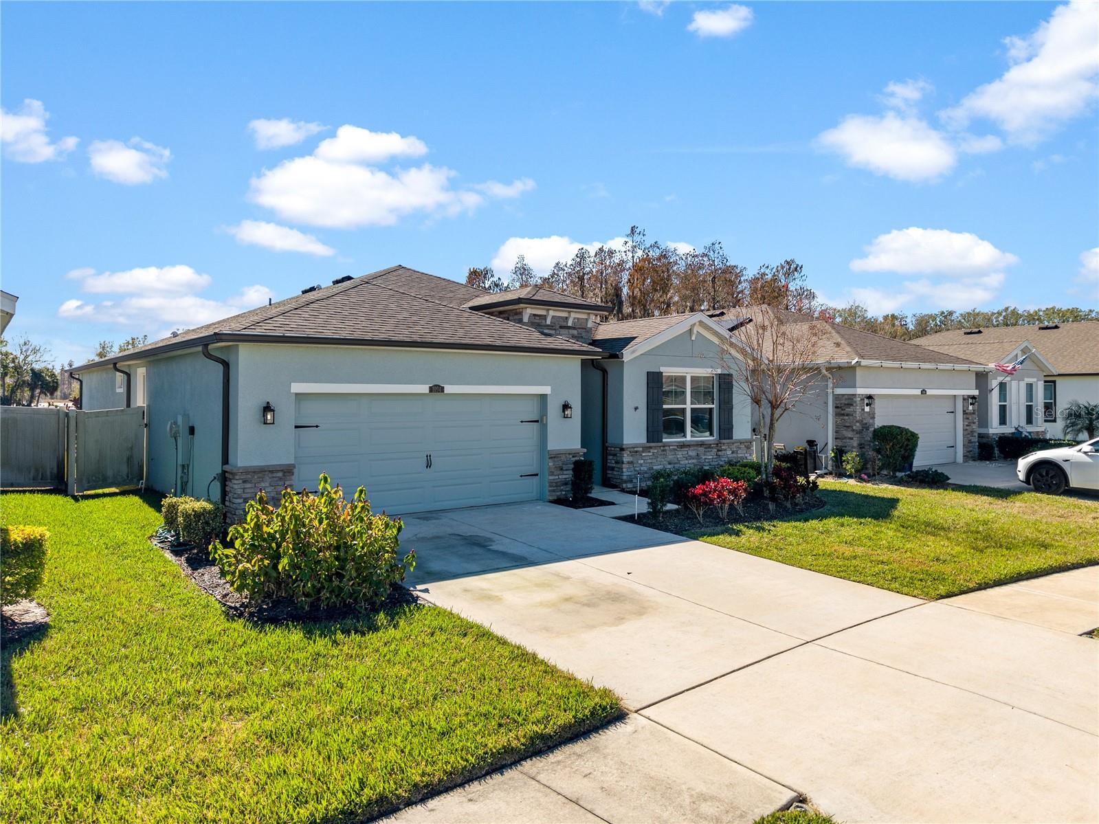 Pond-front, single-story home located in the Union Park master-planned community of Wesley Chapel, Florida, featuring a screened lanai with direct pond frontage and unobstructed water views behind the home. Built in 2019, this 4-bedroom, 2-bath single-family residence offers an open-concept floor plan designed for everyday living, with tile flooring throughout the main living areas and connected kitchen, dining, and living spaces. The kitchen includes a center island, pantry, ample cabinet storage, and functional counter space with clear sightlines to the living area and rear pond. The primary bedroom is privately situated and includes an en suite bathroom with dual sinks, walk-in shower, and linen storage, while three additional bedrooms provide flexible use options for a home office, guest room, or hobby space. The screened-in patio overlooks the pond directly behind the home and offers covered outdoor living space suitable for daily use and seasonal enjoyment. Attached 2-car garage with driveway parking. Union Park is a CDD community in Wesley Chapel with a wide range of amenities including multiple resort-style pools, clubhouse, fitness center, dog parks, playgrounds, open green spaces, walking trails, and community parks. The Wesley Chapel location offers convenient access to SR-56 and I-75, along with nearby shopping centers, grocery stores, dining options, medical facilities, and everyday services. Located close to Tampa Premium Outlets, The Shops at Wiregrass, local parks, and recreation areas, providing easy access to many of the most used destinations in Wesley Chapel and the surrounding Tampa Bay area.