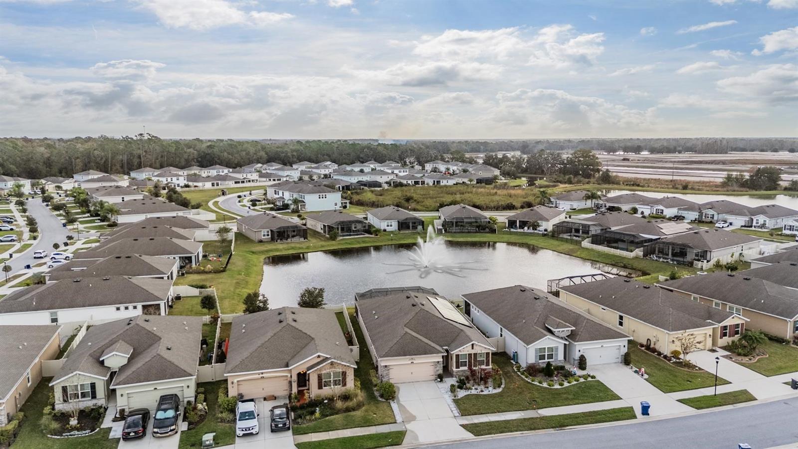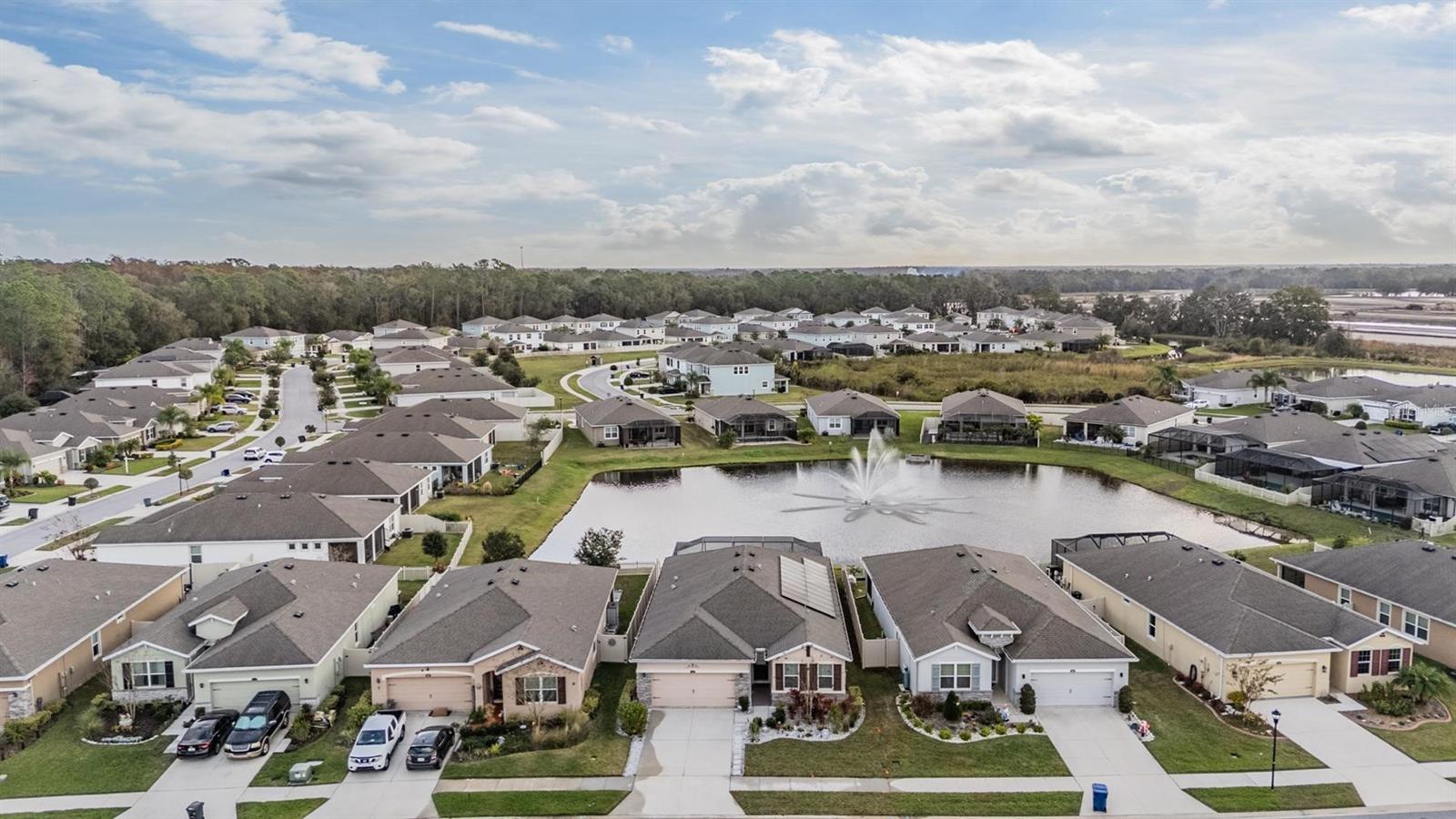Welcome To The Gated Enclave Of Liberty Square In Union Park East, Wesley Chapel. This Highly Desirable Community Is Known For Seamlessly Blending Nature, Technology, And Modern Living. Perfectly Positioned On A Serene Pond Homesite With Fountain Views, This Beautifully Upgraded 4-Bedroom, 2-Bath Single-Family Home Offers Comfort, Style, And True Move-In-Ready Convenience. Step Inside To A Thoughtfully Updated Interior Featuring No Carpet Throughout. Luxury Vinyl Plank Flooring Enhances The Primary And Secondary Bedrooms, While Ceramic Tile Flows Through The Main Living Areas For Easy Maintenance And Everyday Durability. Crown Molding Accents The Main Living Areas, Adding Architectural Detail And A Refined Finish. The Kitchen Is A True Highlight, Showcasing Granite Countertops, A Stylish Designer Backsplash, Stainless Steel Appliances, And A Fully Customized Pantry With Built-In Shelving,Perfect For Organization And Entertaining. The Spacious Primary Suite Includes Custom Closet Upgrades, While The Laundry Room Adds Everyday Functionality With Built-In Wall Cabinets And A Utility Sink. Outdoor Living Is Exceptional With An Oversized Screened Lanai Featuring Custom Brick Pavers, Ideal For Relaxing Or Hosting Guests While Enjoying Peaceful Water Views. Additional Exterior Enhancements Include Custom Landscaping, Outdoor Lighting, Water Softener, And Paver / Stone-Edged Driveway Accents, Creating Strong Curb Appeal. This Is A Low-Maintenance Home, With Exterior Landscaping Included In The Monthly HOA Fee, Allowing You To Enjoy A Beautifully Maintained Yard Without The Upkeep. The Home Is Also Equipped With Solar Panels, Providing Energy Efficiency And Potential Utility Savings. Buyer To Assume The Existing Solar Panel Payment Of Approximately $135 Per Month (Subject To Lender Approval And Transfer Terms). Located Within Union Park, A High-Tech, Resort-Style Community Offering A Resort Pool, Fitness Center, And HOA-Included Internet And Cable, This Home Delivers Exceptional Value And Lifestyle. Ideally Situated With Quick Access To I-75, SR 56, And Major Commuter Routes, And Just Minutes From Wiregrass Mall, Tampa Premium Outlets, Dining, Medical Facilities, And Top-Rated Wesley Chapel Schools. This Home Combines Quality Upgrades, Tranquil Views, And An Unbeatable Location. Don’t Miss The Opportunity To Make This Exceptional Liberty Square Home Your Own.