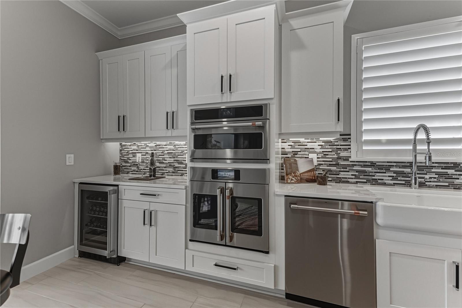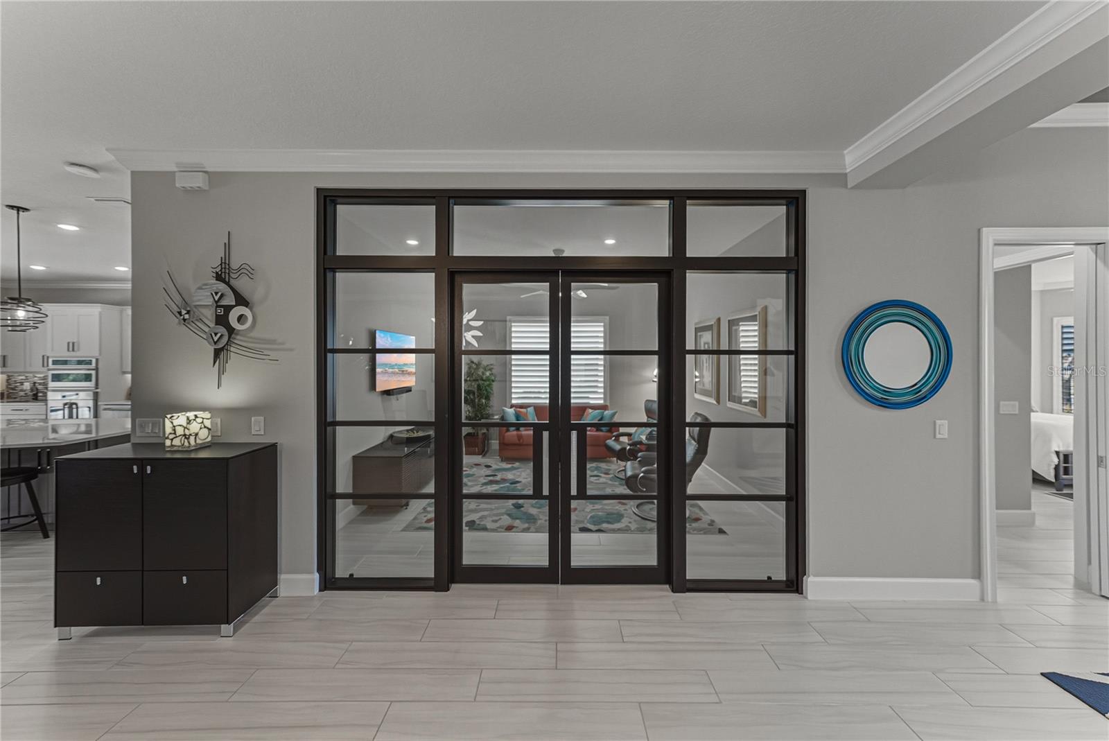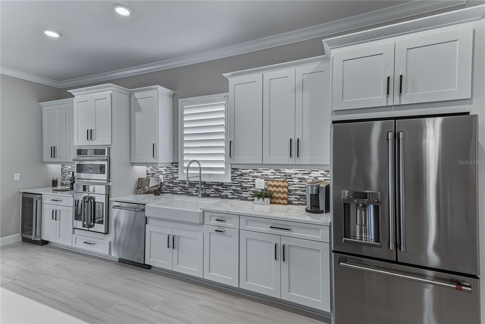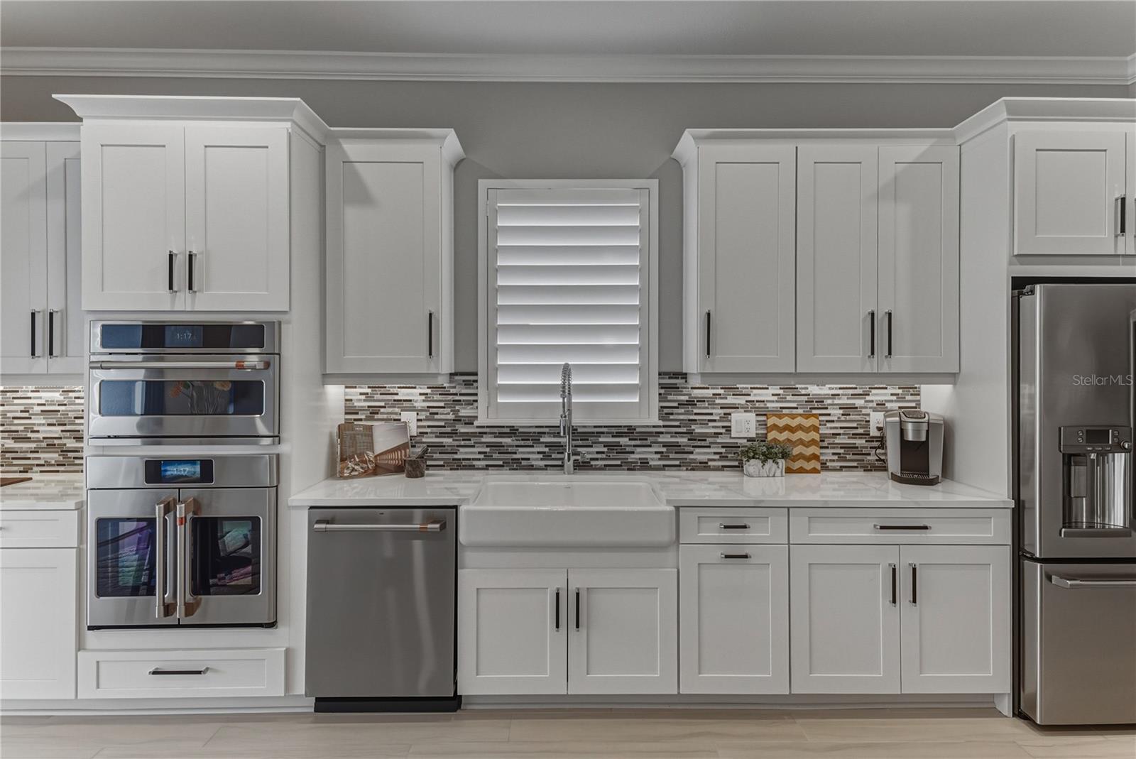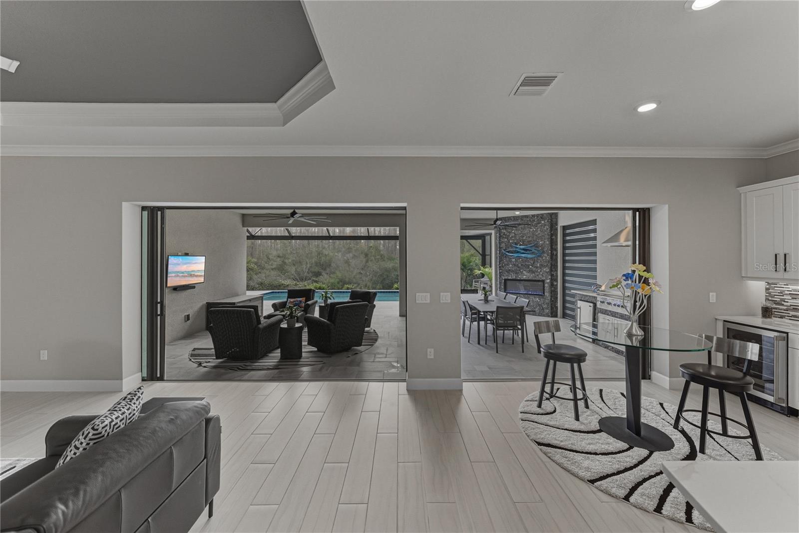 Luxurious custom upgrades are put into this Taylor Morrison built home. Located on a conservation lot, tucked away, in Esplanade of Wiregrass, makes it a private retreat. This stunning residence offers the ultimate in privacy, luxury, with thoughtful design. Step inside foyer to soaring tray ceilings with custom Brazilian mahogany glass doors, beautifully designed tile flooring, and striking custom lighting. This spacious three bedroom home boast three full baths, a versatile flex space, bonus room or dedicated office/den and formal dining. The property blends elegance and comfort while bringing the outdoors in with the double pocket sliding glass doors that lead you to the pool. The heart of the home features a gourmet kitchen with sleek quartz countertops, top-tier cabinetry with under mount lighting, pull outs and soft close drawers, huge island 10x5, Cafe and Monogram Appliances, a walk-in pantry along with designer finishes throughout. The kitchen has an additional four feet making this homes living space seamless and providing an intimate dining area. The additional room ideal for an office no detail was left unturned in this custom Brazilian mahogany glass wall. When the doors open they fold perfect to the transom windows and hold sound very well. The pampering owner’s suite with tray ceiling and push out bay windows is a true retreat with custom walk-in closet, a spa-like bath including an oversized walk-in shower and custom vanities that elevate everyday living. The second bedroom enjoys en suite bath and walk-in closet. This is perfect for visitors. The third bedroom in the front of the property is over sized with the large bay window push out. Function meets style in the expansive laundry room with cabinets, sink and drop zone. This extra large mudroom space is just off the generous 2-car garage with an extra four foot in length and width, measuring 25x25. Equipped with a 220 outlet for electric cars. Step outside to your private oasis—a sprawling screened lanai with pool, spa, elegant marble deck, outdoor grill, custom hood, gleaming granite refrigerator, fireplace, dining and living areas. The custom pool with sun shelf and spa are all perfectly framed with a 50 foot picture window screen with unobstructed serene conservation views. This exceptional property offers peace, privacy, and a truly elevated lifestyle. Don’t miss your opportunity to own a custom-crafted masterpiece in one of the most desirable settings available. Enjoy the clubhouse with an on-site café, swimming pools, fitness center, game room, walking trails, dog park, pickle ball and tennis. The best of Wesley Chapel Wiregrass Location featuring twenty golf courses with 30 mins, the best restaurants, wonderful shopping, 3 hospitals, salons, and much much more. Irrigation water is reclaimed.