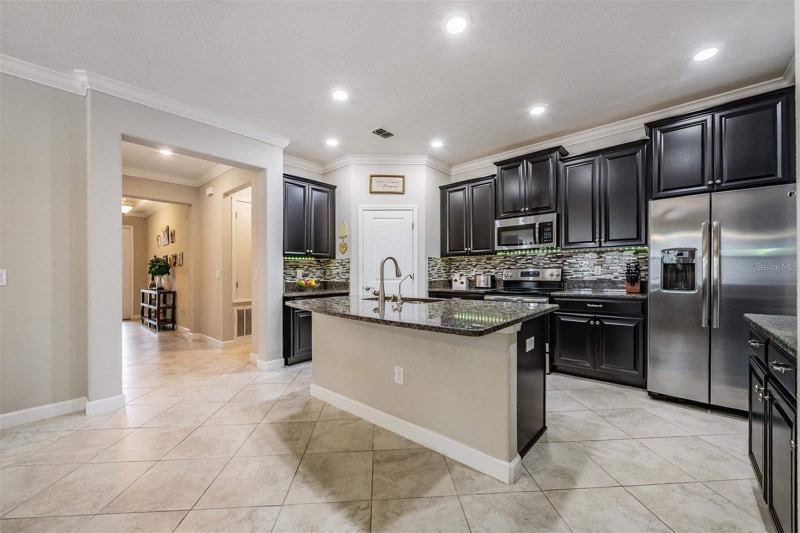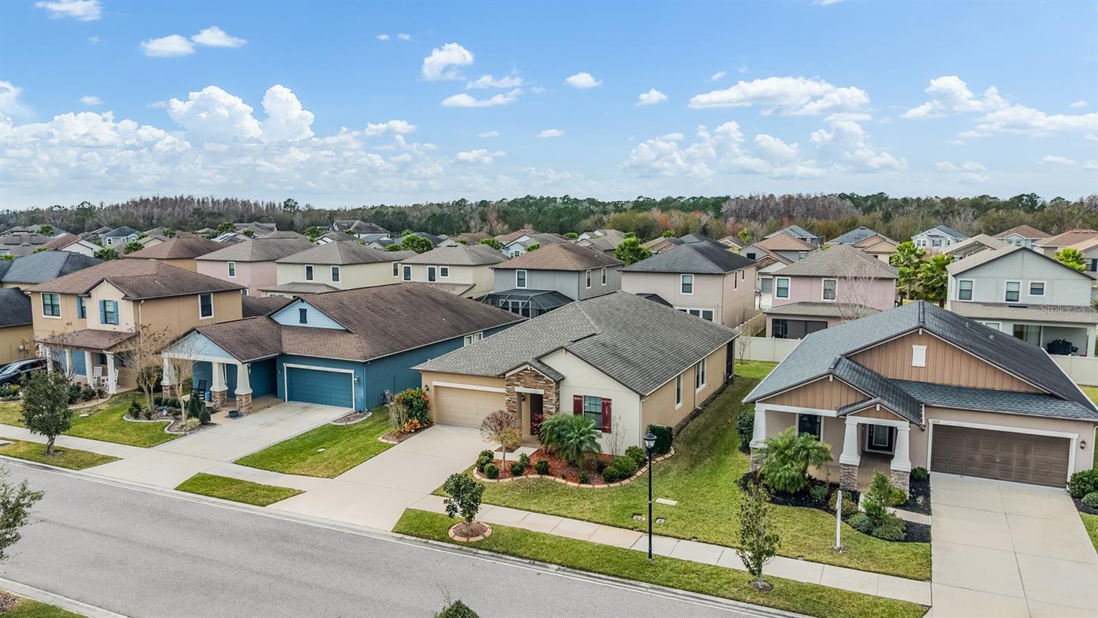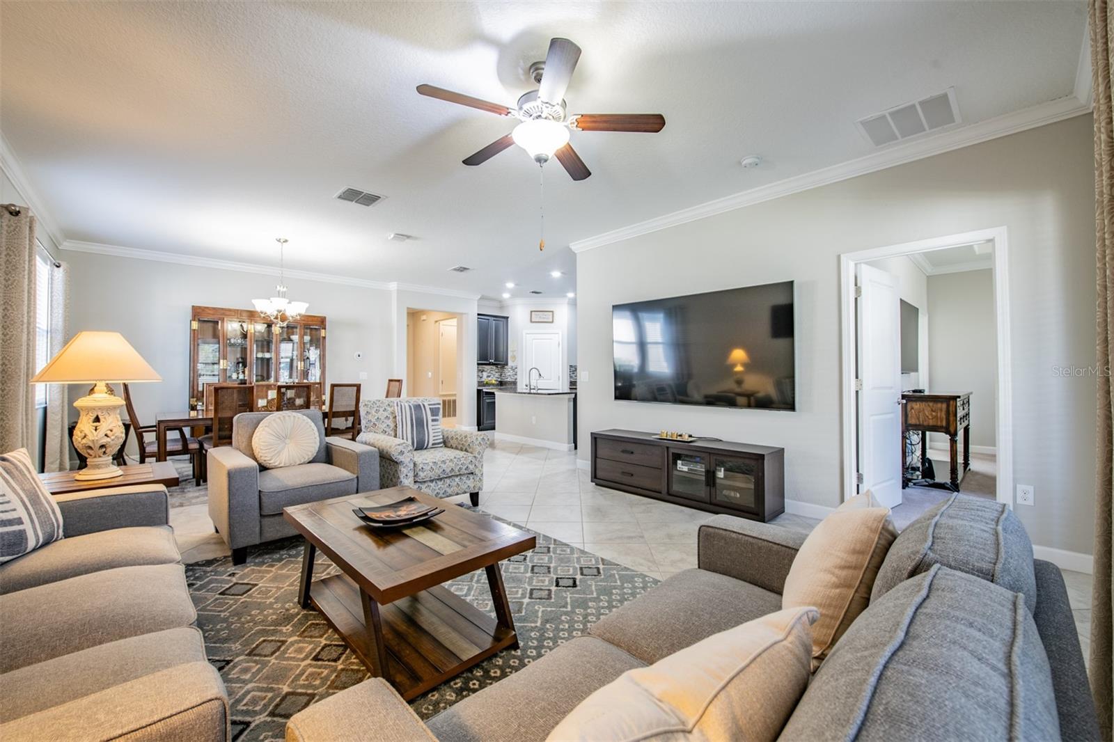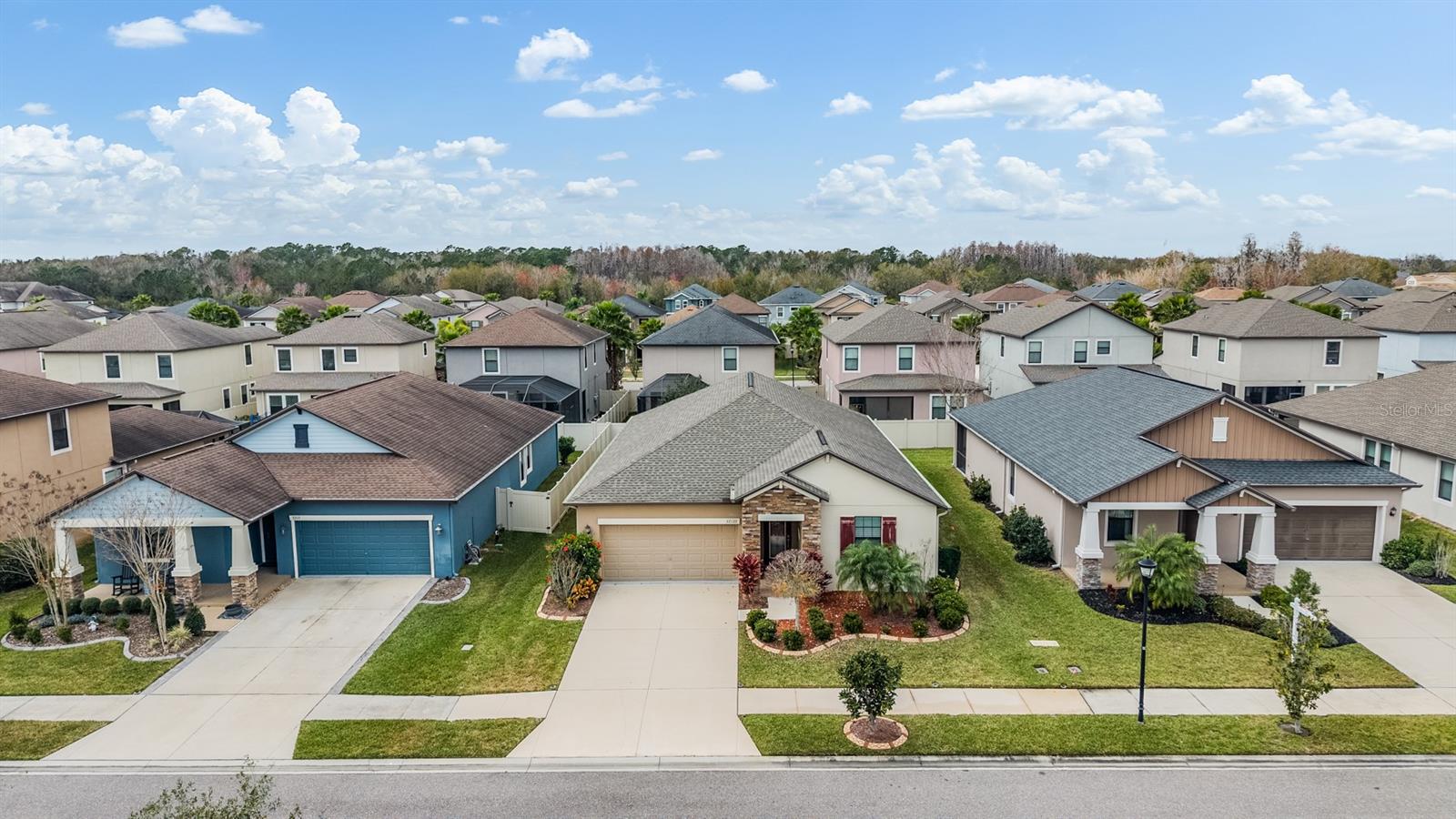 Welcome to this beautifully maintained 4-bedroom, 3-bath, 2-car garage home located in the highly desirable Union Park community of Wesley Chapel. Step inside through a new designer front door with glass detailing enhancing the home’s curb-appeal to find high ceilings, elegant tile flooring throughout the main living areas and plush carpeting in each bedroom. The gourmet kitchen is a true highlight, complete with granite countertops, updated backsplash, stainless steel appliances, and elegant cabinetry with crown molding. A large kitchen island with bar seating seamlessly flows into the living and dining spaces, making gatherings a breeze. The Living room opens to the covered screened in lanai, leading to a fenced backyard—ideal for outdoor relaxation. The primary suite features a tray-ceiling, customized walk-in closet, a large walk-in shower and dual sinks vanity for convenience. The conveniently located laundry room comes equipped with a washer and dryer and is easily accessible from both the primary suite and kitchen. Three additional bedrooms provide ample space for a home office, guest room, or hobby space. Additional features include ceiling fans installed in every bedroom as well as the living room, 2” designer blinds complemented by builder-grade crown molding featured throughout the home. The exterior features custom landscaping with edging, new rain gutters, and a new irrigation system. Enjoy the benefits of a water softener with reverse osmosis and a water heater for added efficiency. Union Park offers resort-style amenities: clubhouse, two pools, splash pad, fitness center, picnic pavilion, playground, dog park and nature trails. The location is incredibly convenient, just minutes from top-rated schools, Pasco-Hernando State College, AdventHealth and BayCare Hospitals, Wiregrass Mall, Tampa Premium Outlets, and endless dining options. Commuting is easy with quick access to major highways, Tampa International Airport, Downtown Tampa, and Florida’s stunning Gulf Coast beaches. This home truly offers it all—style, comfort, and an unbeatable location. Schedule your private showing today!