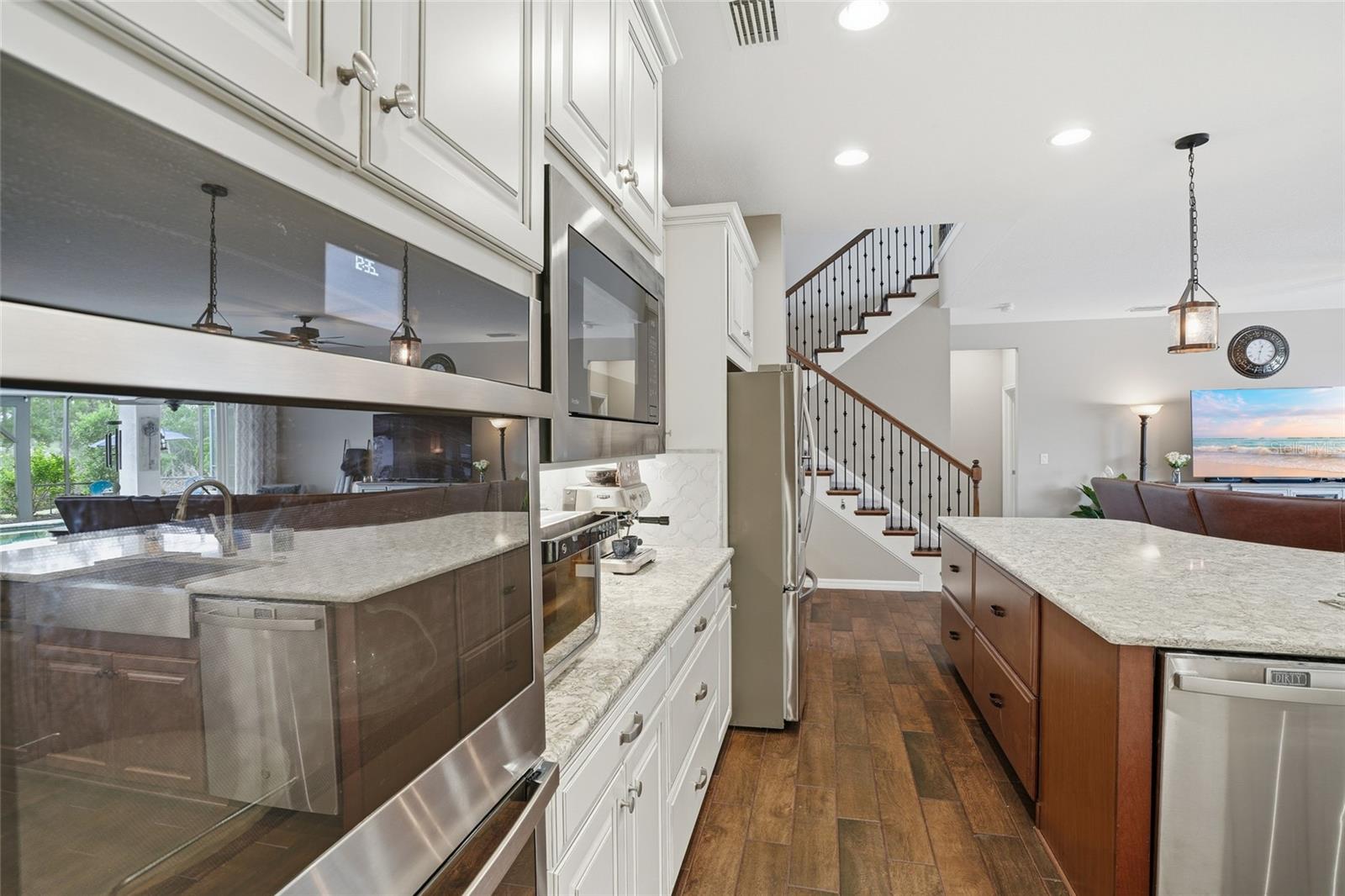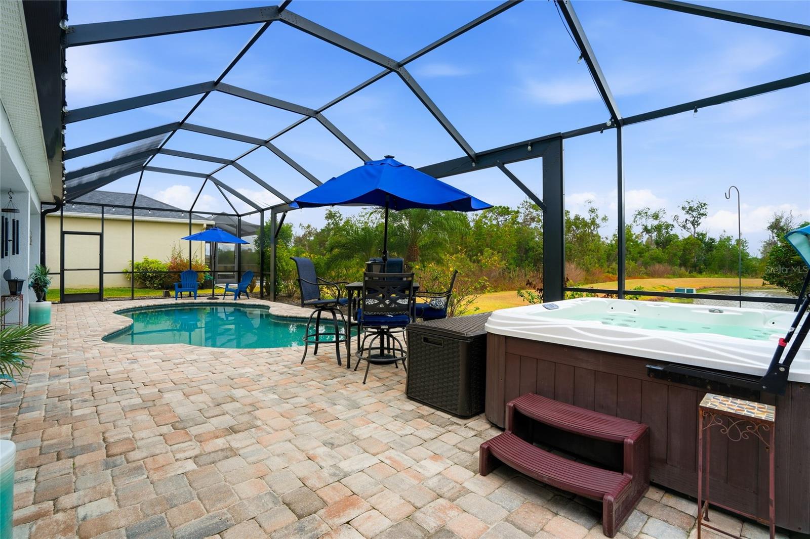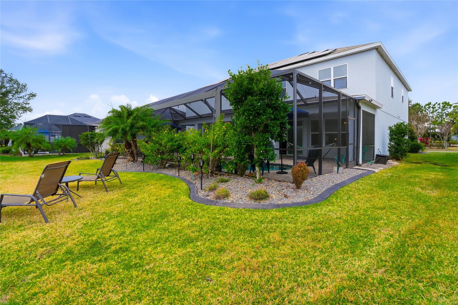 Welcome to this stunning Tradewinds model by award-winning Taylor Morrison, located in the gated Willow Point enclave of the sought-after Watergrass community. Built in 2020, this 6-bedroom, 4-bathroom, 3-car garage pool solar home offers over 4,800 square feet of luxurious living space and is perfectly situated on a serene waterfront lot with breathtaking conservation views. Very private. Step inside to discover an open and airy layout featuring soaring 20-foot ceilings, abundant natural light, and elegant upgrades throughout. The main floor boasts wood look ceramic tile in all living areas, a formal dining room, a formal living or den, and a gourmet kitchen equipped with induction cooktop, double oven, stainless steel appliances, quartz countertops, and a huge island—ideal for entertaining. The kitchen seamlessly flows into a spacious dining nook and the expansive gathering room, highlighted by a dramatic full pocket 4 piece pocket style sliding door that opens fully to a massive private panoramic screen-enclosed lanai, where you’ll find a saltwater chlorinated pool with custom lighting and Wi-Fi controls, an Islands Spa 5 person Jacuzzi, built in propane gas grill, and ceiling fans to keep the space breezy and comfortable. The pool is also served by solar heating perfect for extending the swim season almost all year round. This model is determined to impress with TWO owner’s suites- Perfect for Multi-generational living with potential utilization of the additional Owner Retreat as an Inlaw Suite. The downstairs owner suite is a peaceful retreat, complete with a spa-like ensuite bathroom featuring quartz counters, double vanities, a soaking tub, walk-in spa shower, and a generously sized walk-in closet. A solar system was installed in 2023 for peace of mind to condition the home as you wish while having low electricity bills. There are ceiling fans throughout the home. Upstairs, you'll find the owners suite and a sitting room off the owners suite entry set up as a spa retreat- complete with Sauna also perfect for a nursery, office or yoga space. The owner's bath is beautiful with a soaking tub, glassed in shower, dual sinks and quartz counters, and a walk-in closet with a fabulous custom shelving system. There are four additional spacious bedrooms that share a bath, a massive loft, and a separate media room, offering plenty of space for work, play, and relaxation. The home is stunning at night with landscape lighting and programmable holiday lights. Curbing, low maintenance rock in landscape beds, and additional pavers were added for access alongside garage entry and the entire side of home for convenience. This smart home comes with a doorbell camera, 3 additional perimeter cameras, additional wifi extender, and programmable thermostats for comfort and safety. A whole home water softener and circulating pump provides softened, hot water throughout the home whenever you need it. Located in one of the area’s premier master-planned communities, Watergrass offers resort-style amenities including a clubhouse with gym, multiple parks, tennis courts, three pools, walking trails, and more! Plus, you're just 1 mile from a brand-new Publix and retail plaza, with shopping, dining, and daily conveniences right at your fingertips. Quick access to I-75, Epperson Lagoon, and top-rated schools makes this location as convenient as it is beautiful. Don’t miss your chance to own this show-stopping home—schedule your private showing today!