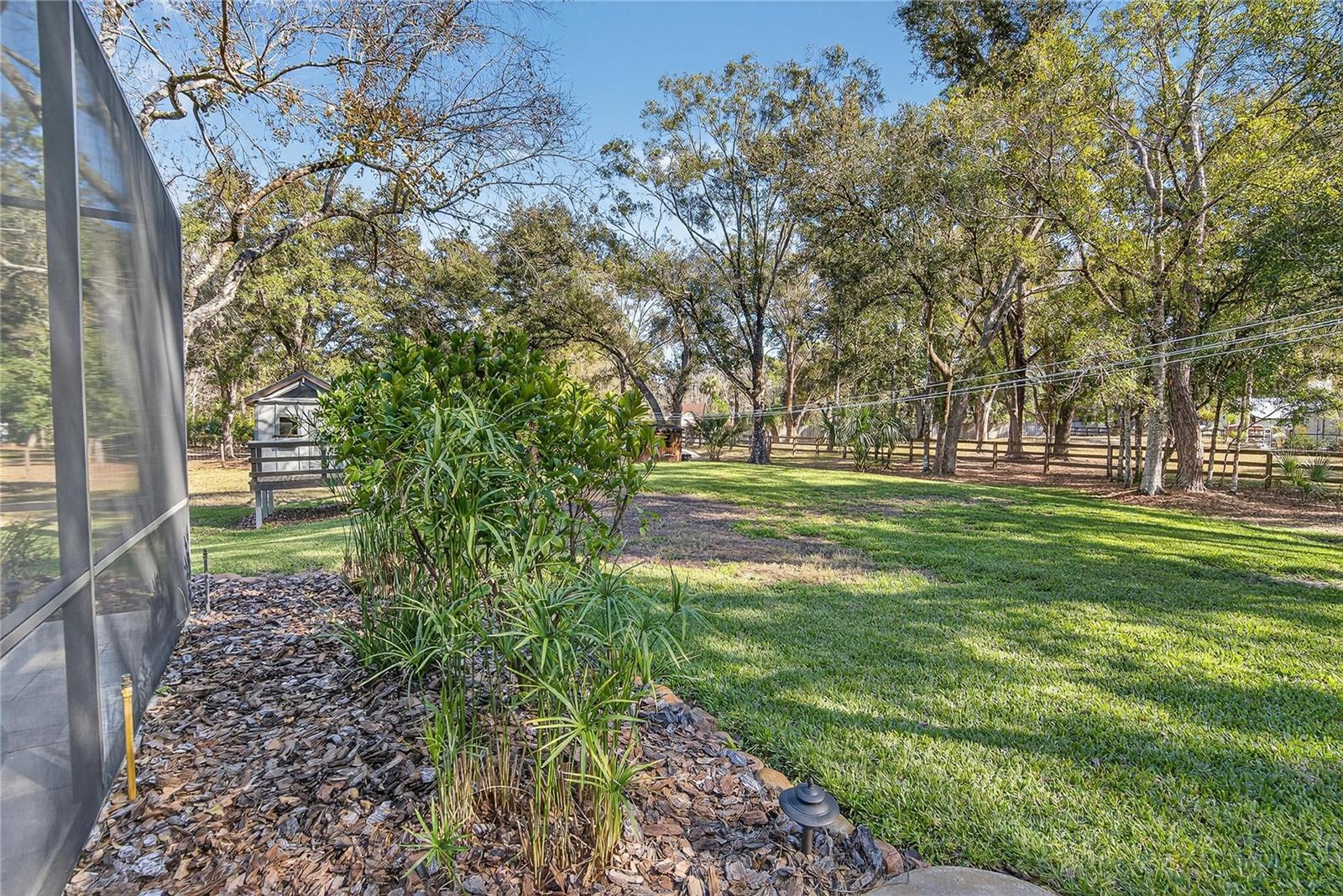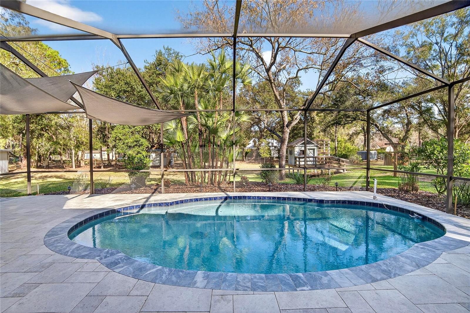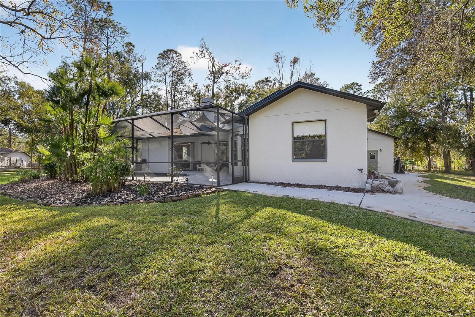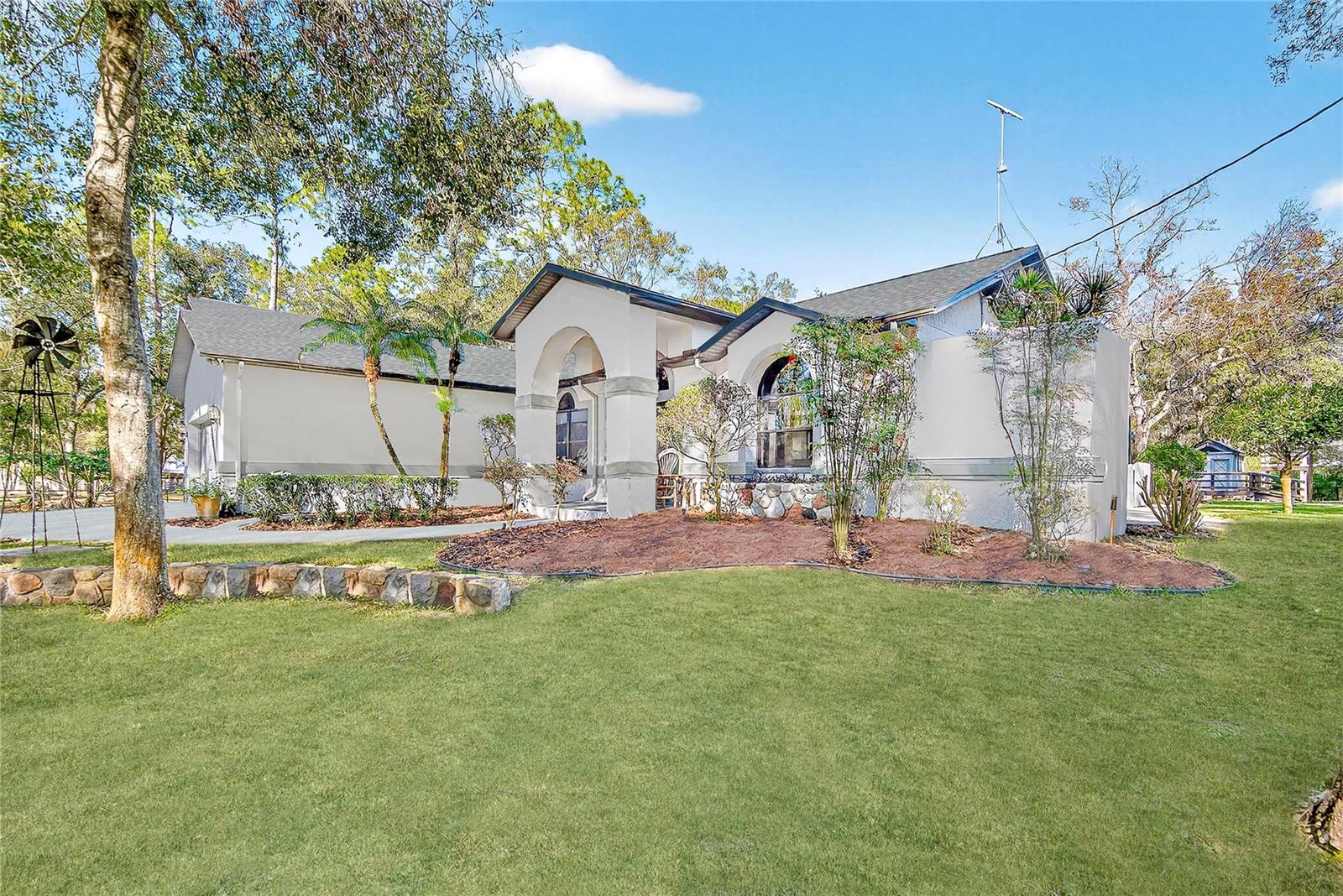 One or more photo(s) has been virtually staged. Privately set on a lush 1.33-acre wooded homesite in the coveted Quail Hollow community of Wesley Chapel, this exceptional custom-built residence delivers refined estate living with rare freedom—no HOA & no CDD. Surrounded by mature trees & manicured landscaping, the setting offers privacy & serenity while remaining moments from shopping, dining, medical facilities, & major roadways. A long, elegant driveway leads to double front doors & an immediate sense of arrival. Upon entry, vaulted ceilings, expansive sightlines, & abundant natural light frame views of the fieldstone fireplace & pool beyond. Block construction, meticulous maintenance, & thoughtful architectural details reflect the quality throughout the home. The interior features a desirable three-way split floor plan with 4 bedrooms & 2 bathrooms. Brazilian walnut flooring enhances all bedrooms, while oversized windows create a bright, open atmosphere. The living room is anchored by a striking fieldstone gas fireplace, with a formal dining room just off the entry. The kitchen is inviting & functional, showcasing granite countertops, oak cabinetry, stainless-steel appliances, a gas range, tile backsplash, built-in granite desk, & a breakfast nook. The custom granite breakfast table conveys. The private primary suite features sliding glass doors to the pool, serene views, a spa-inspired marble & stone bath, & a spacious walk-in closet. Two additional bedrooms & a secondary bath are on the opposite side, with a fourth bedroom ideal for an office or guest suite. Outdoor living rivals that of a private resort with a newly remodeled saltwater pool & patio featuring leathered marble pavers, a fully fenced yard, insulated playhouse with electricity, storage shed, potting shed with water & power, landscape lighting, & irrigation on well. The property offers 2 garage structures: an attached 3-car garage with attic storage & a 30’ x 50’ air-conditioned & heated workshop accommodating vehicles, RVs, boats, or recreational equipment. The workshop includes porcelain tile flooring, 3 overhead doors, RV hookup, & an attached 1-bedroom apartment with granite & travertine finishes. Additional features include a black aluminum fence with electric gate, stone pillars, gravity septic for the main home, separate septic for the apartment, water softener & filtration system, & fresh interior paint. Within walking distance to the 8,000-acre Cypress Creek Preserve & minutes to The Grove, Wiregrass Mall, Tampa Premium Outlets, dining, entertainment, & top medical facilities. A rare opportunity offering privacy, versatility, & craftsmanship—this estate must be experienced in person. Ask for the complete features list & schedule your showing today.