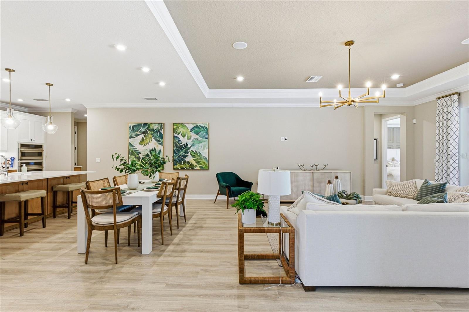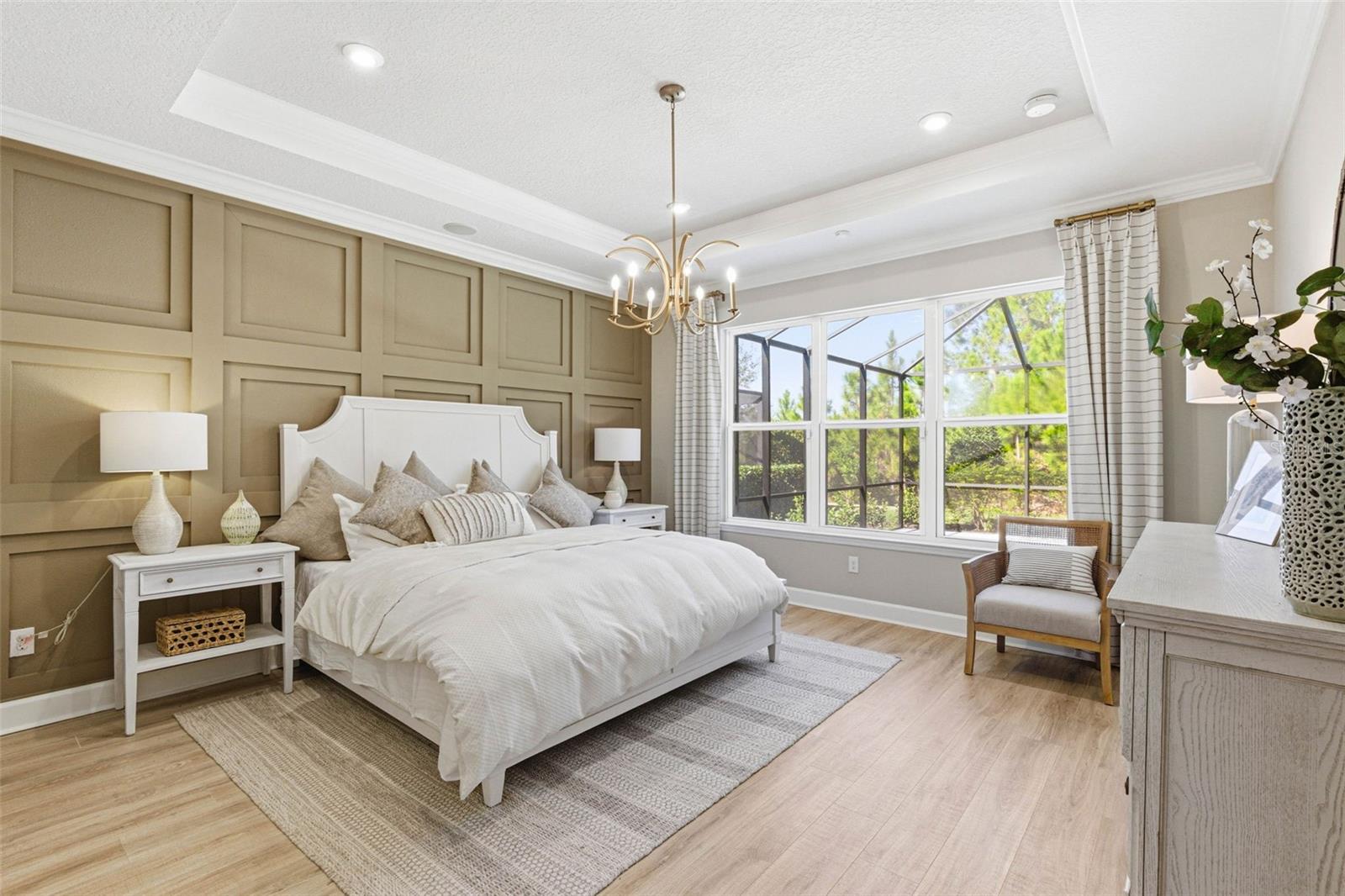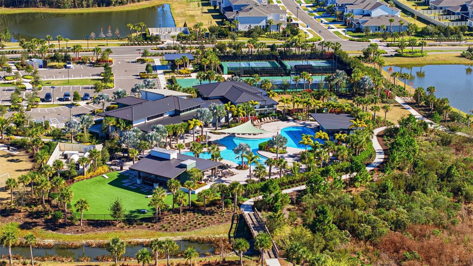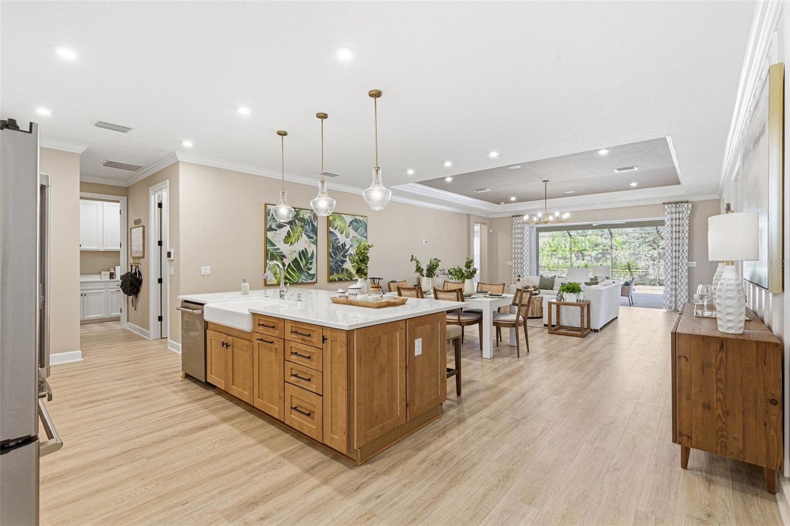 Welcome to this beautiful Saint Croix floor plan, former Model Home, never lived in, offering exceptional curb appeal, POOL and Outdoor kitchen and a refined, designer interior. The price INCLUDES ALL FURNITURE AND DECORATION! This thoughtfully designed 2,921 sq. ft. home features 4 bedrooms and 4.5 bathrooms, with each bedroom offering a private en-suite bath and 3 Car Garage. An inviting foyer welcomes you and provides access to two secondary bedrooms. Beyond the foyer, the home opens to a spacious, open-concept beautifully finished gourmet kitchen with a center island overlooking the gathering room, perfect for entertaining. Pocket sliding glass doors lead to a large covered lanai, where you can enjoy outdoor cooking, spend time by the pool overseeing the view of the conservation lot, seamlessly blending indoor and outdoor living. Upgrades and structural options include tray ceilings, a gourmet kitchen, kitchen island knee wall, floor outlet, study in place of flex space with double French doors, 8-foot interior doors, and pocket glass sliding doors. The owner’s suite features a deluxe bath with a rain showerhead. Additional features include a laundry room cabinetry and sink, outdoor kitchen with vent, private pool, built- in ceiling audio system and thoughtfully selected design enhancements throughout. River Landing community features resort-style amenities, including a heated pool with multiple entertainment areas, grills, clubhouse, fitness center, basketball and tennis courts, a playground, and a small soccer field. Conveniently located along the SR 56 extension, this community offers easy access to shopping, entertainment, and dining options. Don't miss out and schedule your private tour today!