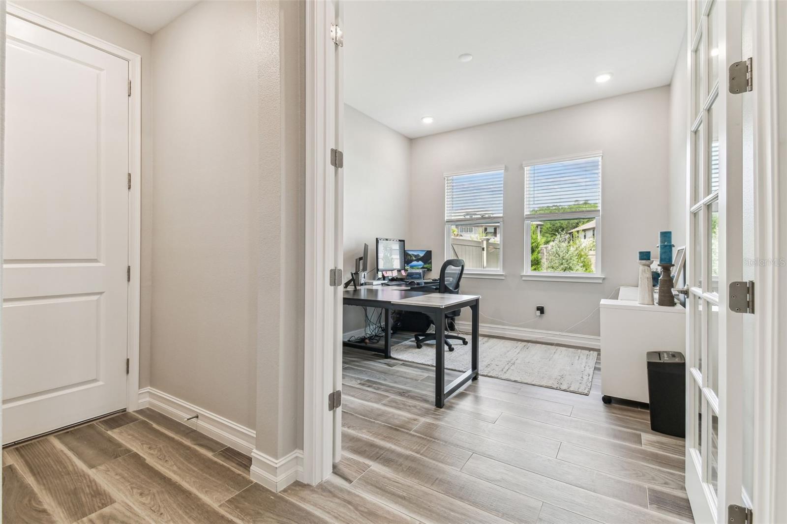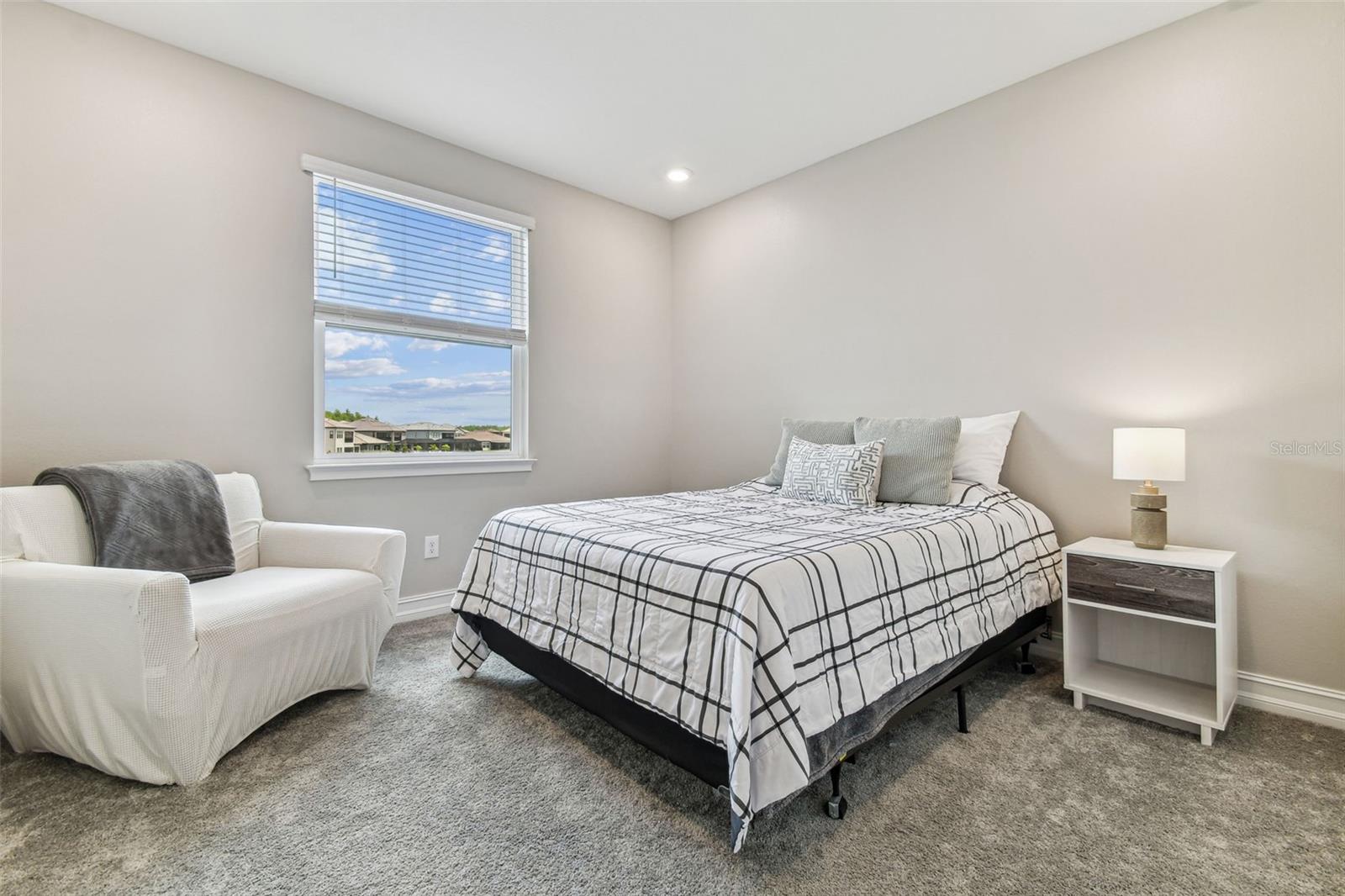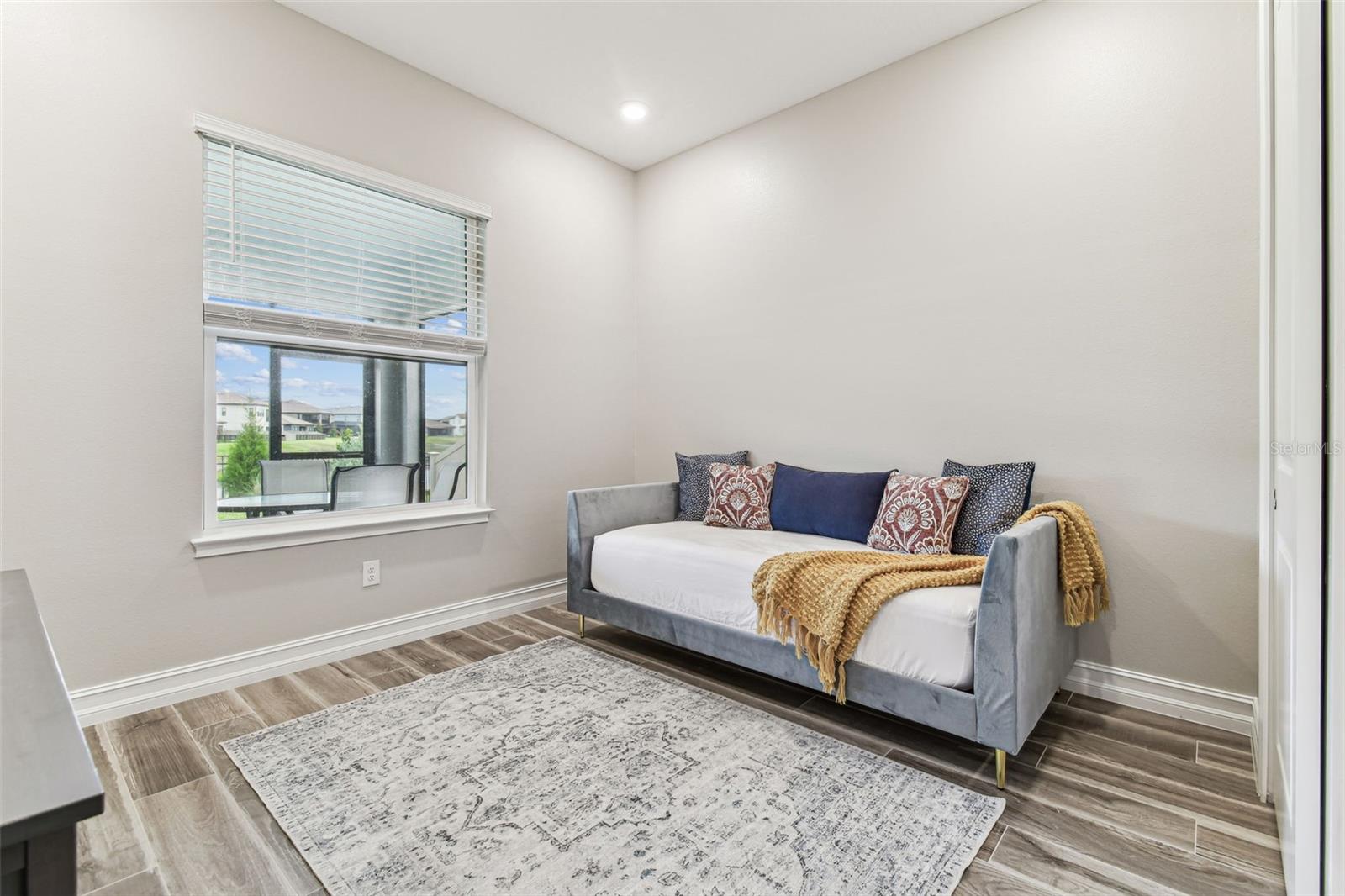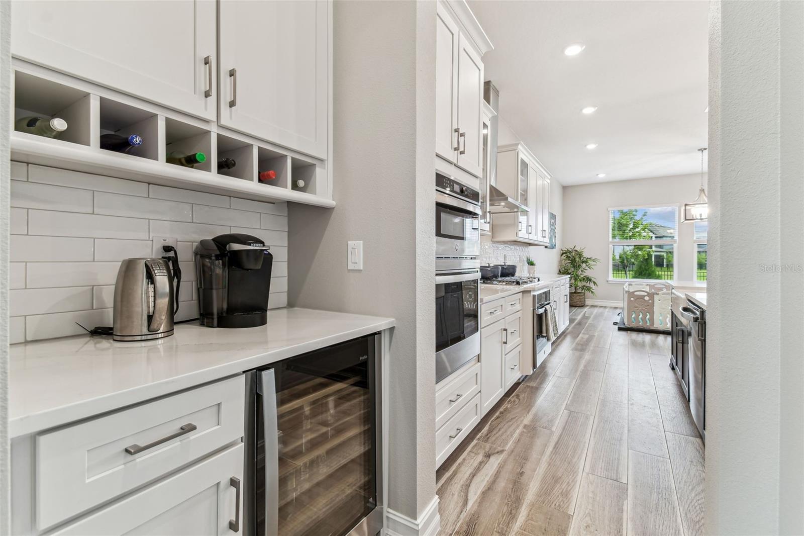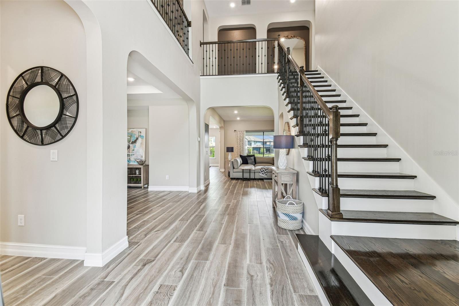 Built in 2023 with over a dozen premium upgrades, this 5BR/4BA home sits on an oversized corner lot in the gated enclave of Ravello at Estancia. Designed for effortless indoor-outdoor living, it features stone accents, upgraded landscaping, a brick paver driveway, and a 3-car garage with epoxy floors and EV hookup. Enjoy a stunning entrance as you step inside, where an exquisite wrought iron staircase makes a dramatic and elegant first impression. The flexible floor plan includes a private office/den, formal dining room, bonus flex room, and a gourmet kitchen with farmhouse sink, pendant lighting, butler’s pantry/beverage bar, and café-style dining. Pocket sliding glass doors glide open to create a wide, unobstructed opening, allowing for a continuous flow between indoor and outdoor spaces—perfect for seamless entertaining and effortless indoor-outdoor living. The upstairs owner’s suite offers a private screened in wrought iron balcony, oversized walk-in closet, soaking tub, frameless glass shower, and dual quartz vanities. Upgrades include 3M heat-reducing window film, wrought iron stair railings, outdoor kitchen hookups (gas/plumbing/electric), garage water treatment hookup, fresh 2025 interior paint, and hurricane shutters. Two large, screened lanais and a fully fenced back and side yard provide space for a future pool while also maintaining a grassy play area. Located in Estancia with resort-style amenities, a luxury clubhouse, zero-entry heated pool with slide and lap lanes, tennis, pickleball, basketball, parks, and trails just minutes to shopping, dining, I-75, Tampa, and Tampa International Airport.