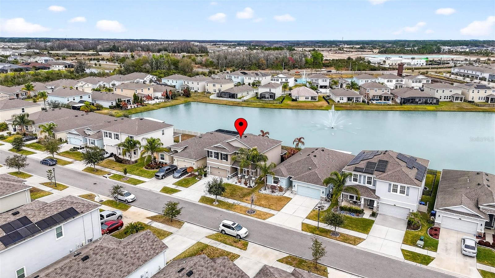 Experience the ultimate Florida lifestyle in this stunning 2019-built D.R. Horton Coral model. Your 4-bedroom 3 bath home offers 2,756 square feet of masterfully designed living space. The centerpiece of this property is the breathtaking outdoor retreat, featuring a spacious screened-in and covered lanai that leads to an expansive paved patio addition, perfect for sunbathing or grilling. This outdoor sanctuary overlooks a serene water view with a majestic fountain, providing a peaceful focal point and a gentle breeze. The stunning backyard is a true tropical oasis, complete with lush landscaping and a dedicated butterfly garden. A charming front porch welcomes you into a bright, open interior characterized by high-end finishes and a highly functional layout. Immediately off the entrance, you will find a dedicated home office or den, elegantly separated by glass double doors for both privacy and style. The main level is designed for convenience, offering a guest bedroom and a full bathroom alongside a spacious, open-concept kitchen. The heart of the home features granite countertops, an induction cooktop range, an upgraded deep single-bowl sink, and premium cabinetry. Upstairs, the layout transitions into a massive loft area, perfect for a media room or play space. This level features a true split floorplan for maximum privacy, with the spacious primary suite situated separately from the other two upstairs bedrooms. The laundry room with tub sink is also located on the second floor for added convenience. Storage is a standout feature of this home, with an abundance of closets throughout and a spacious two-car garage. Modern comforts are integrated into this smart home, including an installed security system, a whole-home water softener with reverse osmosis, and an antimicrobial UV system in the HVAC for superior air quality. Located on a quiet mid-block street with no through traffic, this property offers the high-speed "Ultra-Fi" lifestyle of Union Park, where the HOA fee conveniently includes cable and high-speed internet. Residents enjoy world-class amenities such as a resort-style pool, lap lanes, a splash pad, a fitness center, and miles of trails. This prime Wesley Chapel location is just minutes from AdventHealth Wesley Chapel, BayCare Hospital Wesley Chapel, and the brand-new Florida Medical Clinic Orlando Health Wiregrass Ranch Hospital. You are perfectly positioned for premium shopping and dining at the Shops at Wiregrass, Tampa Premium Outlets, and the KRATE at the Grove. Enjoy easy travel with a seamless 30-minute commute to the vibrant energy of Downtown Tampa, approximately 35 minutes to Tampa International Airport, and convenient access to world-class Gulf beaches. This home offers the perfect balance of suburban tranquility, top-tier medical care, and city convenience. Schedule your private showing today!