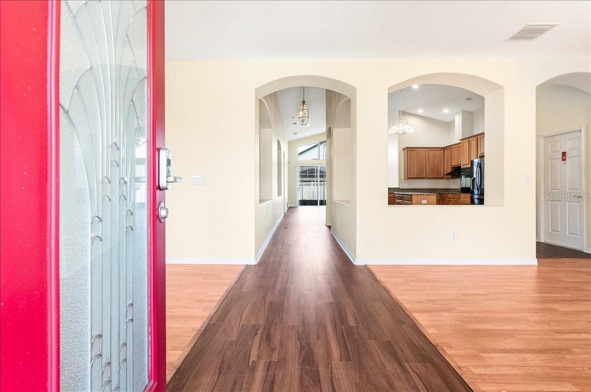 One or more photo(s) has been virtually staged. Some of the pictures virtually stagged.Beautifully updated one-story 4BR/3BA home in the heart of Wesley Chapel—move-in ready with major upgrades! Step into a modern gallery-style foyer with decorative niches and soaring vaulted ceilings that fill the home with light. Enjoy formal dining plus a flexible front room, then gather in the huge family room open to an eat-in kitchen featuring a large island, 42” maple cabinets, granite counters, and breakfast bar. Triple glass sliders lead to a covered lanai for easy indoor-outdoor living. The oversized primary suite offers lanai access, dual vanities, a jetted soaking tub, separate shower, and a spacious walk-in closet. Bedroom 4 works perfectly as a guest/teen suite with its own bath and sliders to the lanai. Relax in a private, partially fenced backyard—pre-plumbed for a future pool. Peace-of-mind updates include NEW roof (2025), NEW A/C (2024), brand new flooring, full bathroom remodels (2025), surge protection, and 2025 designed front landscaping with curb stone detail and professional sealing. Resort-style amenities include clubhouse, fitness center, multiple pools (water slide, splash pad, lap pool), playgrounds and tennis courts. Low HOA—only $131/year, plus quick access to I-75/I-275, Wiregrass Mall, Premium Outlets, hospitals, dining, and more.
