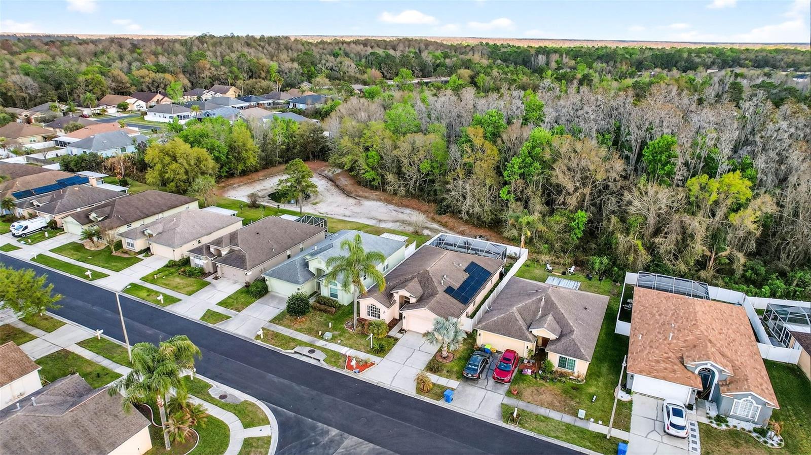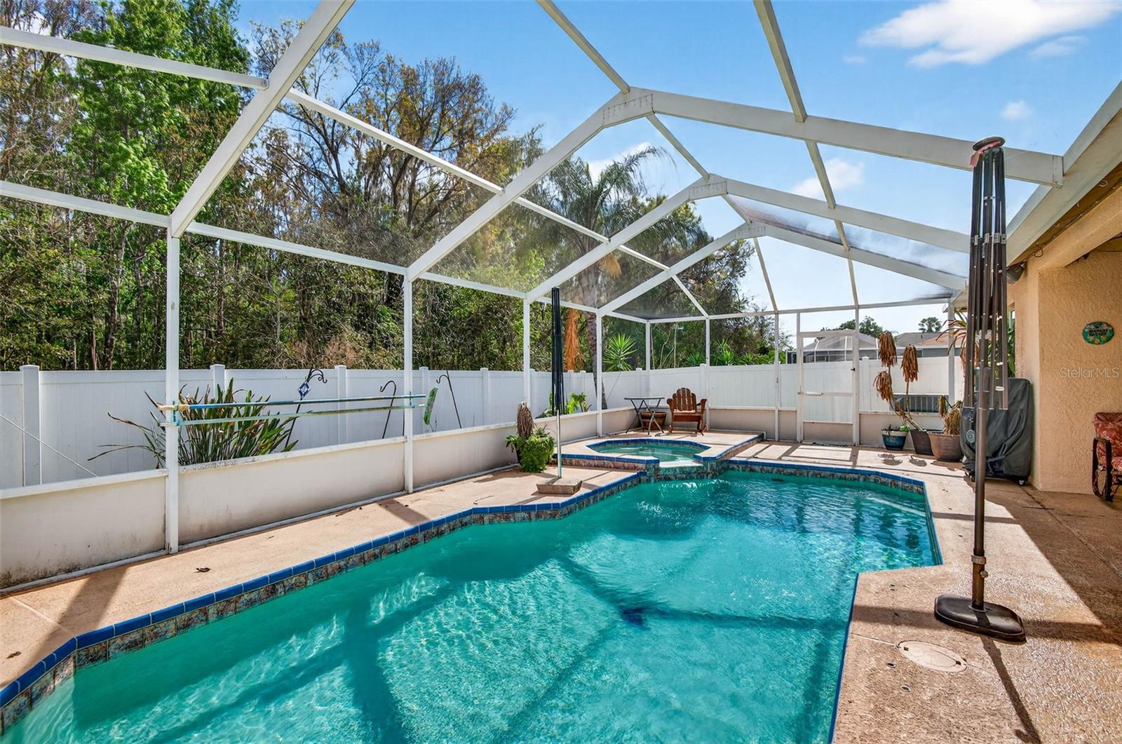 Welcome to this beautiful 4-bedroom, 2-bath pool home located in the desirable Meadow Pointe community in Wesley Chapel. Offering over 2,000 square feet of living space, this home features a bright open split-bedroom floor plan, ideal for both comfortable everyday living and entertaining. The spacious kitchen includes granite countertops, stainless steel appliances, abundant cabinetry, a breakfast bar, and an eat-in dining area, all overlooking the main living space. The large family room features triple sliding glass doors that open to your private backyard oasis. Step outside to enjoy a screen-enclosed pool and spa with peaceful conservation views, providing the perfect setting for relaxing or hosting guests year-round. The generous primary suite includes dual walk-in closets and an en-suite bath with double vanities, a garden tub, and a separate shower. Additional highlights include solar panels (2019, fully paid) tall ceilings, a 2-car garage, and a functional layout with well-sized secondary bedrooms. Conveniently located near shopping, dining, top-rated schools, and major highways, this home offers the perfect combination of privacy, comfort, and accessibility in one of Wesley Chapel’s most sought-after areas.