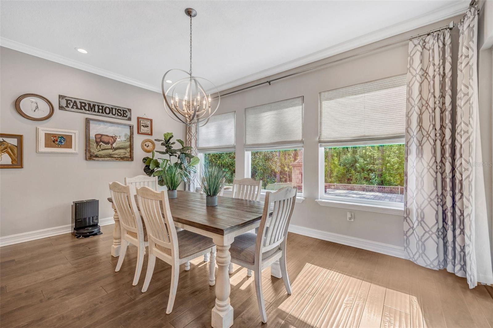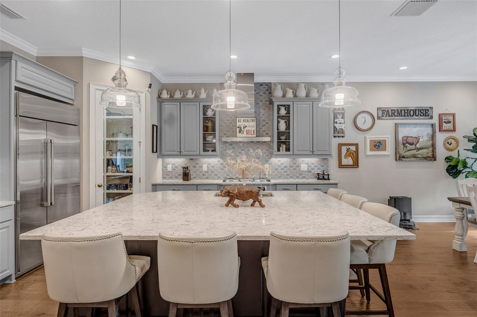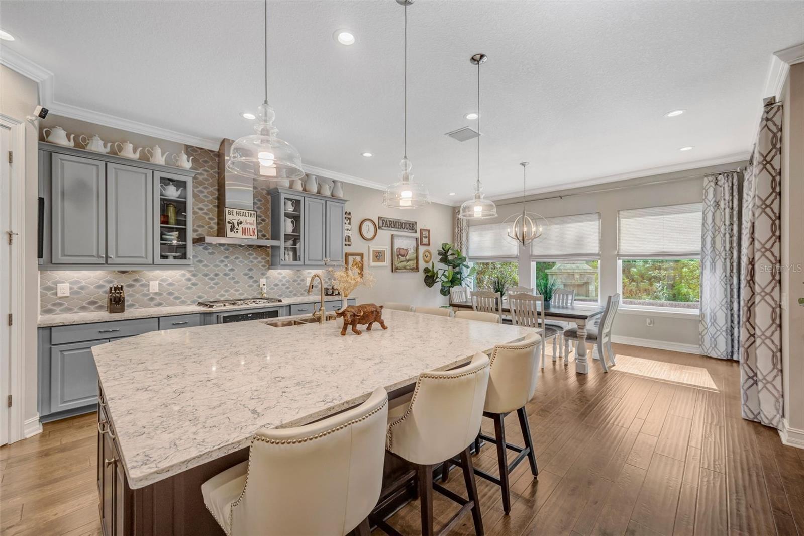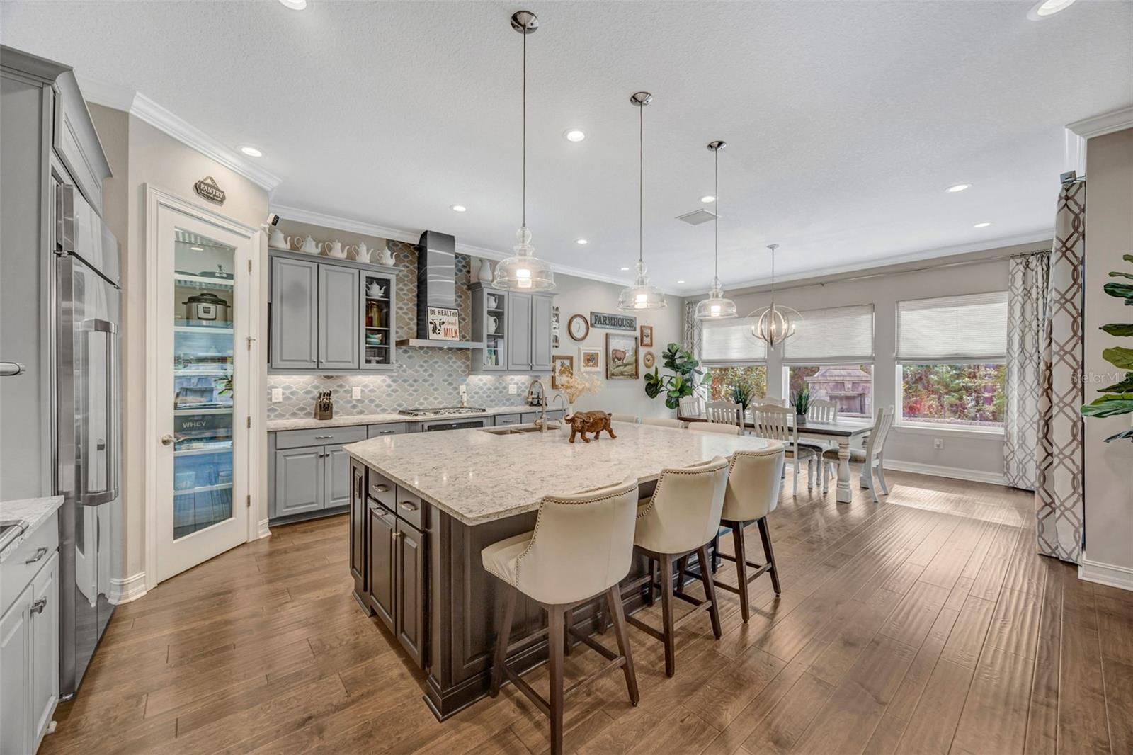 Welcome to luxury living in the gated community of Matera in Estancia located in the heart of Wesley Chapel! Beautifully designed by Standard Pacific Homes, this FORMER MODEL features 4-bedrooms, 3-bath PLUS a versatile flex space - over 3,030 square feet of thoughtfully crafted living space and a 3-car garage equipped with EV connection and SOLAR PANELS FOR REDUCED ELECTRIC BILLS! Step inside to find rich wood flooring throughout the main living areas, complemented by elegant architectural details including crown molding in the main living areas, coffered ceilings in the dining room and a tray ceiling in the great room—adding depth and sophistication throughout the home. Sit back and relax with a beverage you just poured for yourself and guests from your wetbar featuring a wine chiller and ice maker. The open-concept layout is perfect for both everyday living and entertaining, featuring a stunning gourmet kitchen with quartz countertops, custom backsplash, ample soft-close cabinetry, HUGE center island and seamless flow into the spacious living areas. The home is complete with a full GE Café series stainless steel appliance package including diswasher, 5-burner natural gas cooktop, range hood vented outside, in-wall convection oven and microwave. The primary suite is a true indulgence, showcasing a double-tray ceiling with decorative inlay for added elegance and newly installed custom California Closets for exceptional organization. Wake up in the morning and press the button to raise the room darkening shades to let the Florida sunrise start your day. The spa-like primary bath features a walk-in shower with tile extending to the ceiling and dual shower heads, creating a sleek, high-end finish. Relax in the large soaking tub at the end of a busy day. Three additional bedrooms and the flex space provide versatility for guests, a home office, or hobbies. Outdoor living is exceptional, with a private FENCED backyard oasis designed for entertaining. Relax under the covered lanai, enjoy the fully equipped OUTDOOR KITCHEN WITH GREEN EGG under a COVERED CONCRETE CABANA, or unwind beside the striking STONE WOOD-BURNING FIREPLACE—perfect for enjoying Florida evenings year-round while overlooking the private Florida conservation beyond. Located in the highly sought-after Estancia with resort-style community amenities including 2 swimming pools, fitness center, tennis courts, basketball courts, pickleball, walking trails, playground and large dog park. The home is centrally located with close access to the Wiregrass Mall, Advent Healthcare, Bay Care Medical, Florida Medical Center, the new Orlando Health Hospital (opening 2026), Moffit Cancer Center, the Tampa Premium Outlets, The Grove, restaurants and sport facilities, as well as top-rated area schools. Minutes from I-275 and I-75, approximately 35 minutes from Tampa Int. Airport and downtown Tampa, about 75 mins from Disney and theme parks and about 60 mins from beaches.