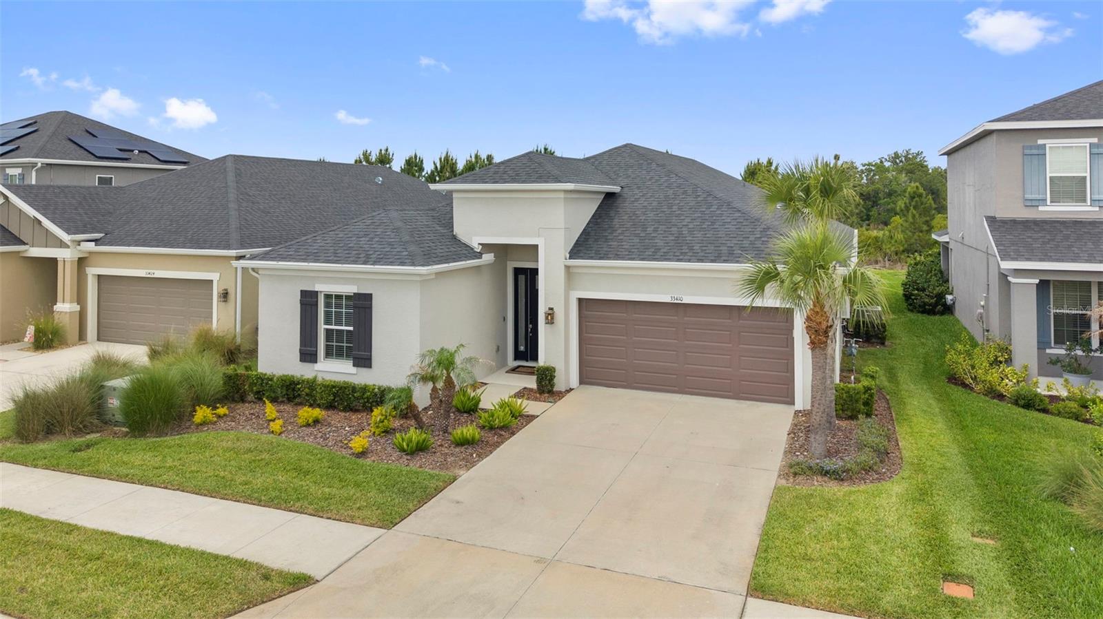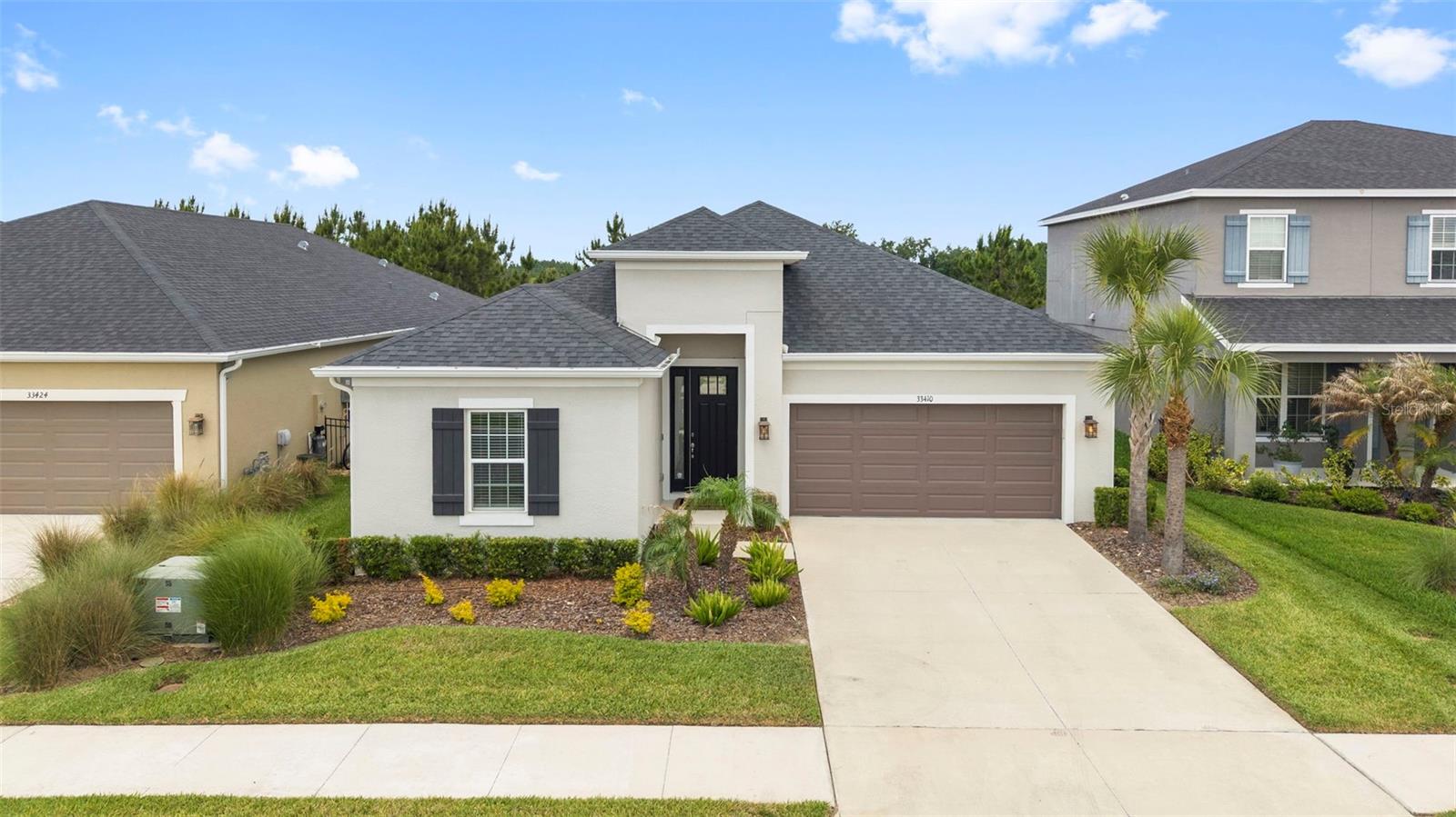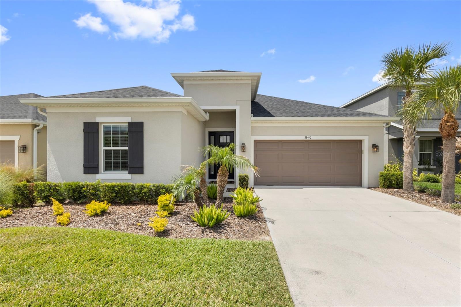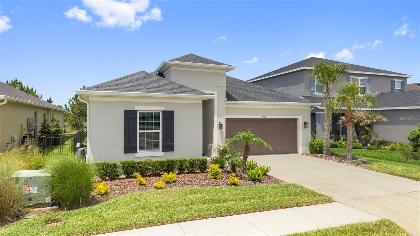 One or more photo(s) has been virtually staged. Positioned within the sought-after community of River Landing and set against a peaceful wooded backdrop, this original-owner 2022 Taylor Morrison residence offers a seamless blend of contemporary design, comfort, and elevated everyday living in one of Wesley Chapel’s prime locations. Thoughtfully designed with 2,420 square feet of single-story living, this four-bedroom, three-bath home with a versatile bonus room and two-car garage balances style with functionality, all while being ideally situated near the community gate, resort-style amenities, premier shopping, dining, and major roadways. Step through the covered entryway into a light-filled interior where natural light carries throughout the home, enhanced by 8-foot doors that add to the open, elevated feel. Just off the foyer, a spacious bedroom and full bath create a private retreat for guests, complete with a sleek glass walk-in shower and a Broan Surface Shield antiviral and antibacterial LED exhaust fan. Nearby, a flexible bonus room offers endless possibilities—ideal as a home office, formal dining space, or creative studio. Continue down the hall as the layout opens into the heart of the home, where open-concept living takes center stage. The gourmet kitchen is both striking and functional, featuring 42-inch wood cabinetry, quartz countertops, a designer tile backsplash, recessed and statement lighting, stainless steel appliances, and a gas range, along with an expansive island with wood planking detail. A dry bar and oversized walk-in pantry elevate the space, making entertaining effortless. The kitchen flows seamlessly into the dining and living areas, where pocket sliding glass doors blur the line between indoor and outdoor living. Privately tucked just off the living room, the primary suite offers a serene escape with a modern, tranquil feel, complemented by an expansive walk-in closet. The spa-inspired en-suite bath features a glass walk-in shower with bench seating, a soaking tub, dual-sink quartz vanity, and an additional Broan Surface Shield LED exhaust fan. Two additional bedrooms are thoughtfully positioned and share a beautifully designed full bath, completing the home’s well-executed single-level layout. Through stacking glass sliders, the covered lanai opens to an expansive backyard overlooking peaceful wooded views, offering the perfect canvas for a future pool or outdoor kitchen. Additional highlights include a leak detection system with auto shutoff, security system, Nest thermostat, pre-wiring for surround sound, tankless water heater, whole-house water softener and filtration system, electric vehicle charging connection, epoxy-coated garage flooring, MyQ app-controlled garage door opener, and French drains. River Landing residents enjoy an exceptional lifestyle with a beautifully appointed clubhouse featuring recreational and fitness spaces, a game room, lagoon-style pool with splash area, hot tub, cabanas, ample lounging areas, pickleball and tennis courts, basketball courts, soccer fields, dog park, playground, and corn hole area—creating a true resort-style living experience. Ideally situated near The Shops at Wiregrass and Tampa Premium Outlets, the community offers both convenience and lifestyle, with easy access to I-75, SR 56, SR 581, and SR 54.