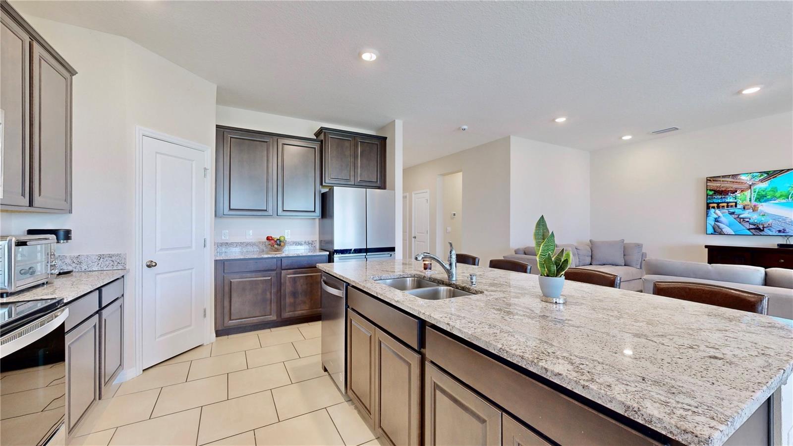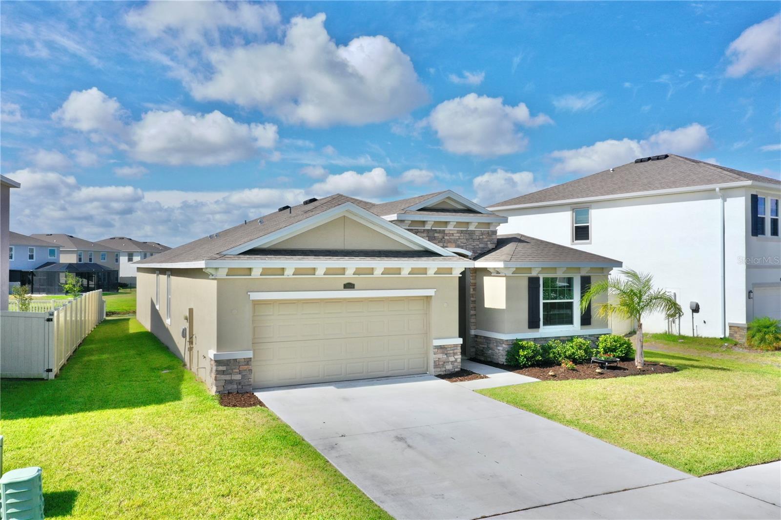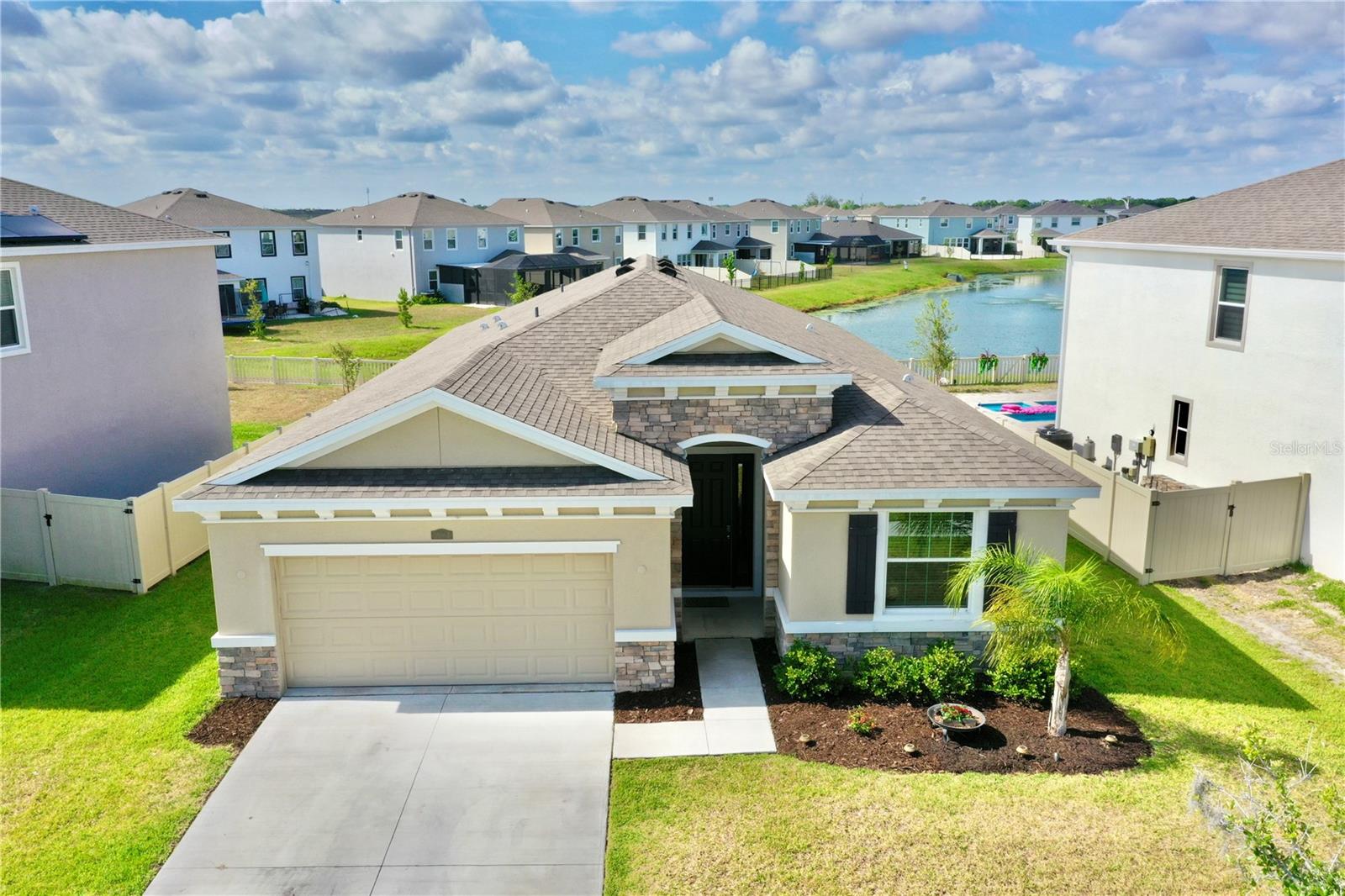 Welcome to the desirable community of Epperson Lagoon! Step into your sprawling "like new" ranch, a popular Lantana model built by DR Horton in 2022. The exterior stonework along with well-kept landscaping adds a lovely touch to this home, making for a welcoming entrance. Near the front of the home you will find two bedrooms and a full bath, access to your laundry room (Whirlpool washer and dryer set remain with the home) and access to your two car garage. The next hallway will lead you to another spacious bedroom as well as a half bath. The home is wired for an ADT system with a smart panel and enhanced smoke detection. The open living space is centered around the stunning kitchen. The beautiful granite countertops accent the rich cabinetry, and you will love the sink in the large island. In addition to the bright dining area, there is ample seating at the island, as well as plenty of storage and additional counter space. The corner pantry is spacious to say the least! In the rear of the home you will find a primary suite that really is its own retreat. Dual closets make storage a breeze. The large bathroom has a soaker tub, a large tiled shower, its own linen closet, and a private water closet. The dual sinks and granite countertops make for a perfect vanity area. Enjoy the pond view from your large covered lanai. This is the perfect place to enjoy your evening! Epperson has a 7.5 acre lagoon with more to do than you could imagine! Kayaking, beach volleyball, rock-climbing, and the swim up bar are just a few things to look forward to. This golf-cart friendly community is easy to get around to your favorite events at the lagoon including live music, food trucks, and weekend events. Conveniently located near I-75, Publix, Starbucks, and top-rated schools- this community offers endless possibilities for fun and convenience. Don't miss out on the chance to make this your new home—schedule a private showing today!
