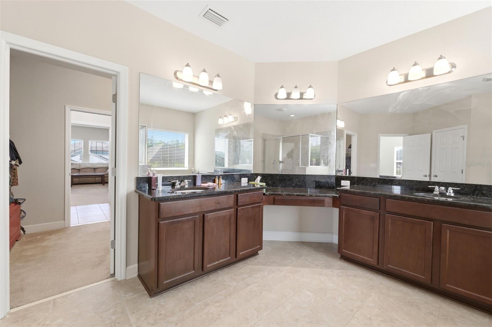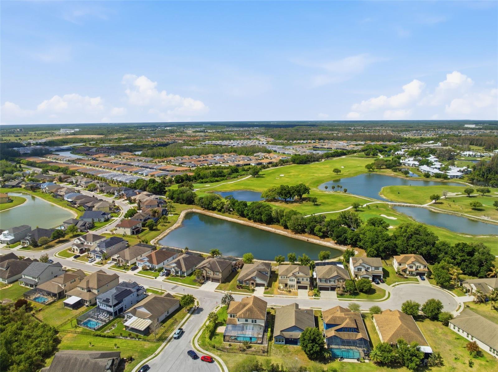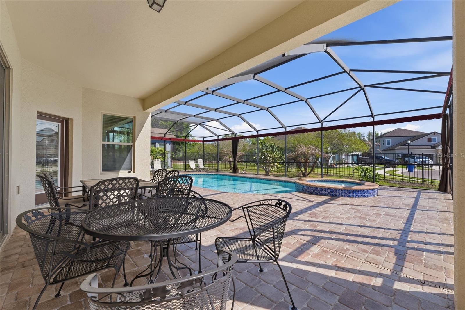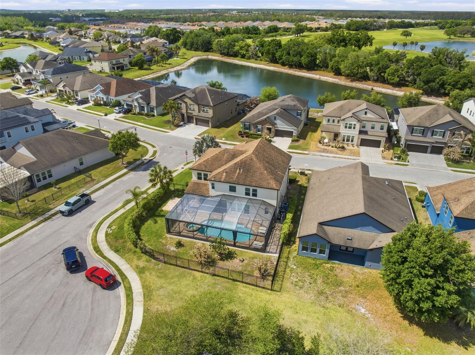 Located on a desirable corner lot within a quiet cul-de-sac in the sought-after Country Walk community, this spacious two-story home offers 5 bedrooms, 4 bathrooms, a 2-car garage, and a private pool and spa, creating the perfect blend of comfort, functionality, and Florida lifestyle living. A covered front porch with room for seating welcomes you into the home, where tile flooring flows through the foyer and leads to a formal dining room featuring carpet, high ceilings, and multiple windows that fill the space with natural light. The living room, also carpeted, is open to the kitchen and showcases a striking wall of four sliding glass doors that bring in abundant light and provide views of the outdoor living area. The kitchen is well-appointed with dark real wood cabinetry, granite countertops, a decorative backsplash, a large island with double sink that also serves as a breakfast bar, stainless steel appliances including a double oven and built-in cooktop, and a walk-in pantry. Just off the kitchen, a dedicated coffee bar area with additional cabinetry and granite counters adds both convenience and charm. The adjoining breakfast nook features three windows overlooking the backyard. A downstairs bedroom with an ensuite bathroom—complete with a step-in shower with glass enclosure, white vanity, wood cabinetry, and white tile flooring—provides a great option for guests or multigenerational living. The staircase features dark wood treads with contrasting white risers, leading to the second floor where a spacious family room awaits, offering flexible use as a media room, playroom, second living area, or home office space. The primary suite is located upstairs and features walls of windows, carpet flooring, a walk-in closet, and a large ensuite bathroom with dark wood cabinetry, light tile flooring, a water closet, a step-in shower with glass enclosure, a separate soaking tub beneath a window, and dual vanities with extended counter space and a dedicated seated area between them. The primary closet conveniently connects through to the laundry room, enhancing everyday functionality. Three additional upstairs bedrooms all feature walk-in closets, with two sharing a connected bathroom while maintaining separate vanity areas for added privacy. The outdoor space is designed for enjoyment, featuring a covered pavered lanai that opens to a screened-in pool and heated spa with a pool alarm, along with an extended paver patio outside the enclosure for additional outdoor living. The backyard is partially bordered by a metal fence with mature bushes providing added privacy. Residents of Country Walk enjoy a wide range of amenities designed for both relaxation and an active lifestyle, including a clubhouse for gatherings and events, multiple community pools, tennis and basketball courts, a fitness center, playgrounds, and scenic walking trails throughout the neighborhood. The community also features beautifully maintained parks, sidewalks, and street lighting, creating a welcoming and walkable environment. Conveniently located in Zephyrhills, Country Walk offers easy access to shopping, dining, and entertainment, along with nearby major roadways for commuting to surrounding areas including Wesley Chapel and Tampa.