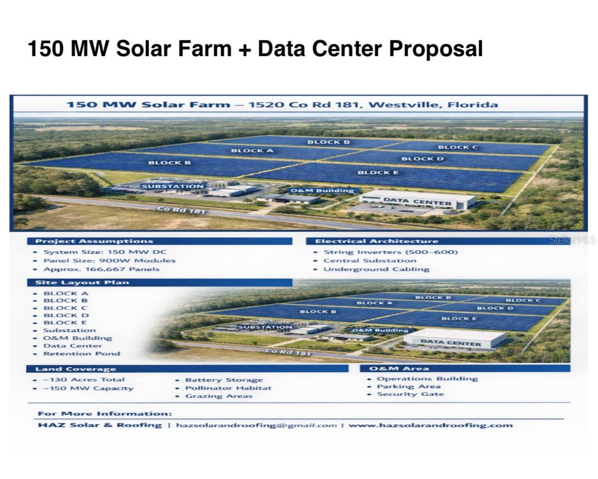 Data Center approved with solar power full back up and full power by solar Built to suit available Exceptional opportunity to acquire approximately 160 acres of prime development land, including ±130 acres with data center approved and zoning in place. This property is uniquely positioned for large-scale infrastructure projects, featuring approved use for a data center campus along with solar farm integration. All measurements and approvals to be verified by buyer.