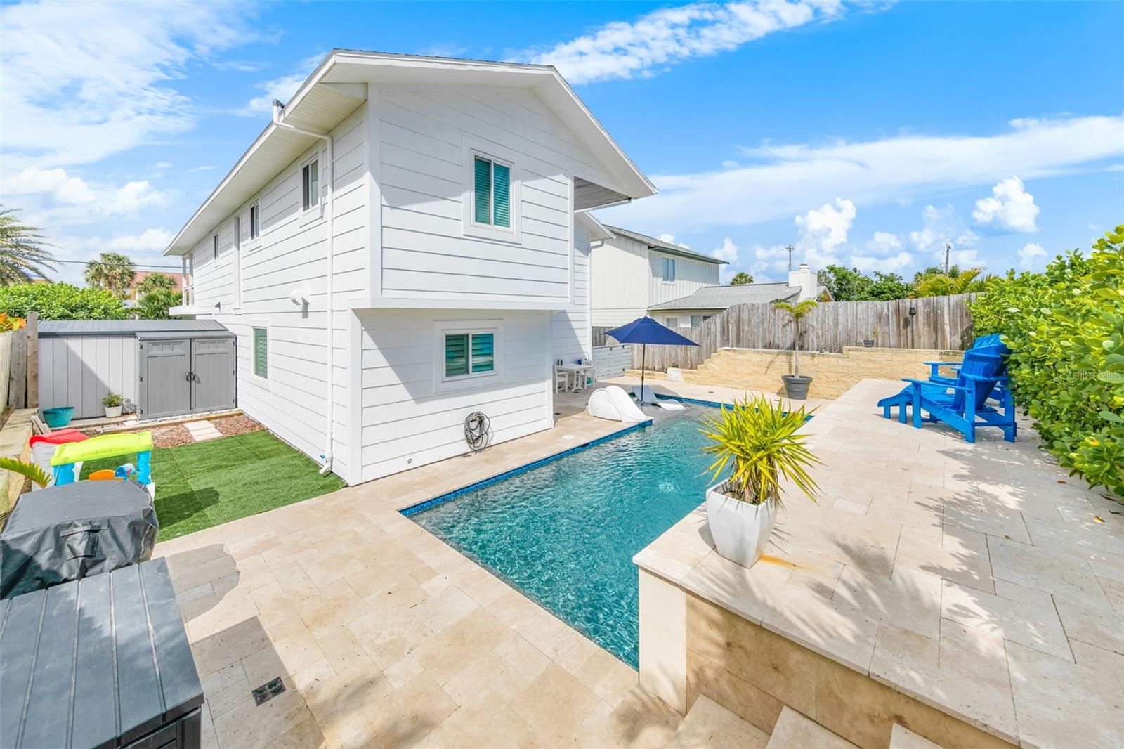 FABULOUS RECENTLY REMODELED & UPDATED BEACHSIDE HOME!! THIS 3BR/2.5BA HEATED POOL HOME WITH RIVER VIEW IS A COASTAL GEM!! This beautifully remodeled showplace boasts 2,180 SQUARE FEET of living area and nearly $250,000 IN RECENT UPGRADES!! Perfect location just a few blocks to the PRISTINE SUGAR SAND “NO DRIVE” BEACH in the laid back community of WILBUR BY THE SEA!! The LIGHT & BRIGHT OPEN FLOOR PLAN features PLANTATION SHUTTERS, BARN DOORS, POCKET DOORS, CUSTOM LIGHTING & FANS throughout the home. The SPACIOUS GREAT ROOM with SOARING HIGH CEILING boasts a majestic Brazilian Koa Wood ceiling fan. The UPDATED FULLY-EQUIPPED KITCHEN is a chef’s dream showcasing elegant Quartz countertops, soft close white cabinetry, a center island with bar seating, stainless steel appliances, a touch faucet & decorative wood accent wall. Exquisite & stylish WOOD-LOOK PORCELAIN TILE FLOORING throughout the living areas makes this home ideal for beachside living! The ELEGANT PRIMARY SUITE includes plush Berber carpeting and DUAL CUSTOM WALK-IN CLOSETS. The luxurious spa-style primary bathroom features a soaking tub & large walk-in shower. Step out onto the FABULOUS WRAP AROUND BALCONY with Trex deck flooring and decorative cable railing to enjoy morning coffee or evening sunsets OVERLOOKING THE RIVER!! TWO ADDITIONAL GUEST BEDROOMS plus an UPDATED FULL GUEST BATH and UPDATED HALF BATH provide maximum comfort for friends & family. There’s also a convenient HOME OFFICE / BONUS ROOM. The HUGE FAMILY/GAME ROOM adorned with a beautiful bamboo ceiling, provides the perfect space for entertaining, movie nights, or even a future home theater. It can also be easily converted back into a spacious garage, if desired. Enjoy the SALT-CHLORINATED POOL installed in 2019 and SOLAR HEATING SYSTEM added in 2021 offers a private oasis for year-round relaxation. The EXTENDED PAVER DRIVEWAY provides ample parking and the CHARMING FRONT PATIO is perfect for watching AMAZING SUNSETS. Additional improvements include new durable & easy maintenance HARDY BOARD SIDING throughout the exterior, NEW IMPACT WINDOWS, a NEW HVAC system (2020), NEW ROOF (2017), NEW SEPTIC (2022) and UPDATED ELECTRICAL PANEL (2014) ensuring peace-of-mind for years to come. Steps to the infamous Boondocks Restaurant and the Adventure Yacht Club and Freedom Boat Club marina, offering dock access or boat rentals for boating enthusiasts! This awesome home is perfect as a primary residence, vacation home, or a high income investment property with short-term rental potential! Located minutes to the historic Ponce Inlet Lighthouse, Jetty Park, Marine Science Center, dog park/beach, and a wide array of water activities including fishing, kayaking, jet skiing, surfing & much more!!