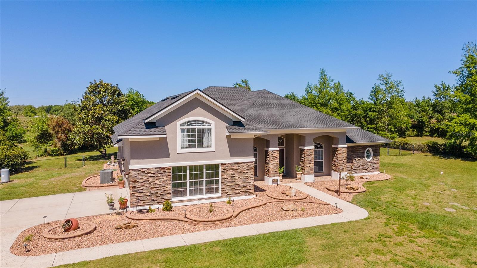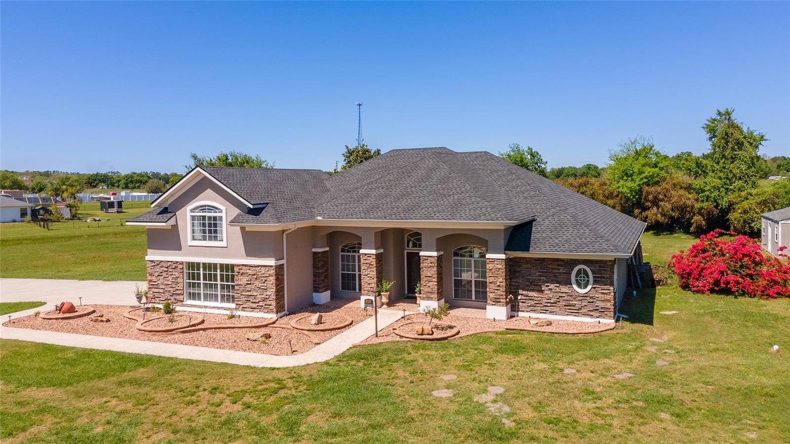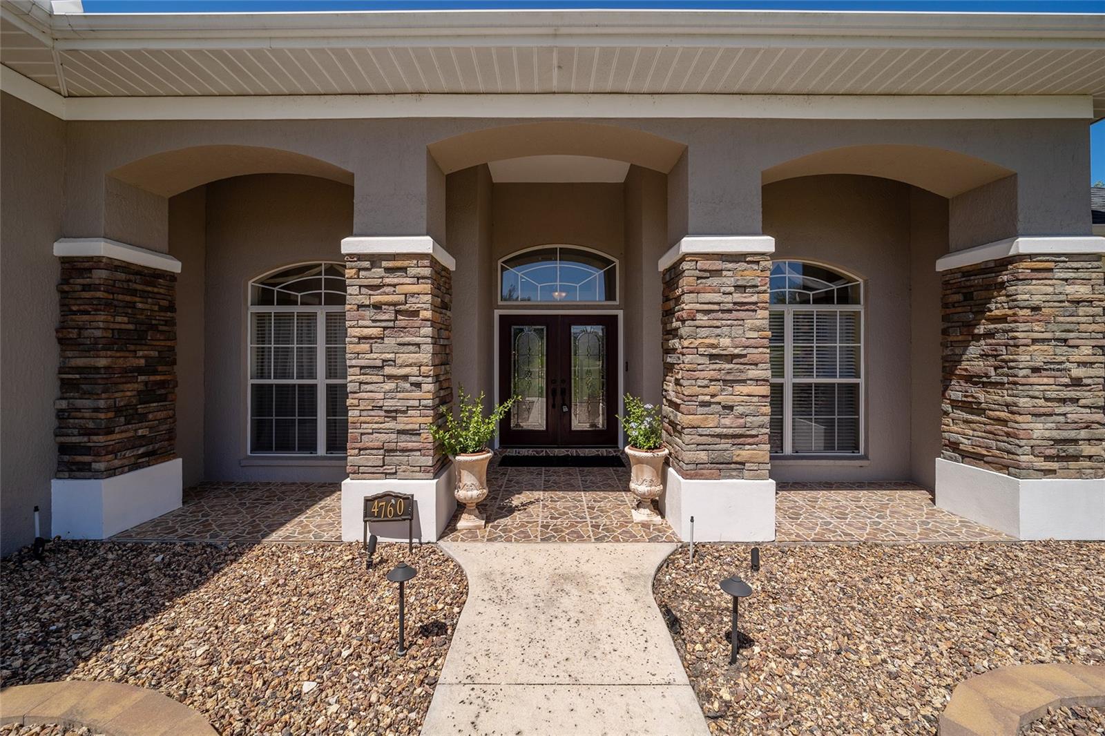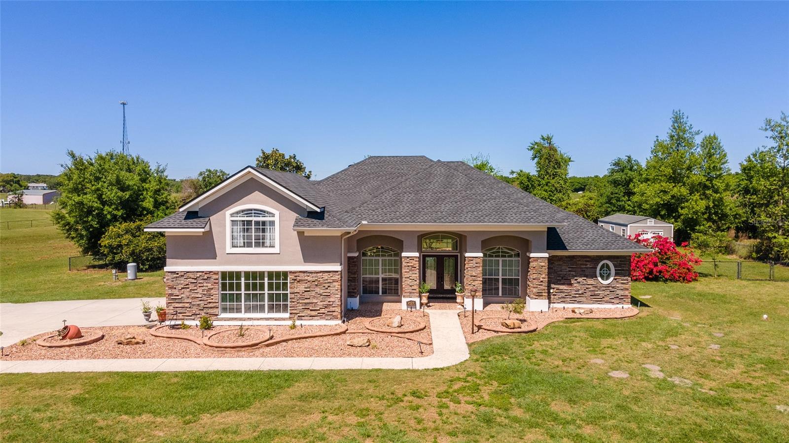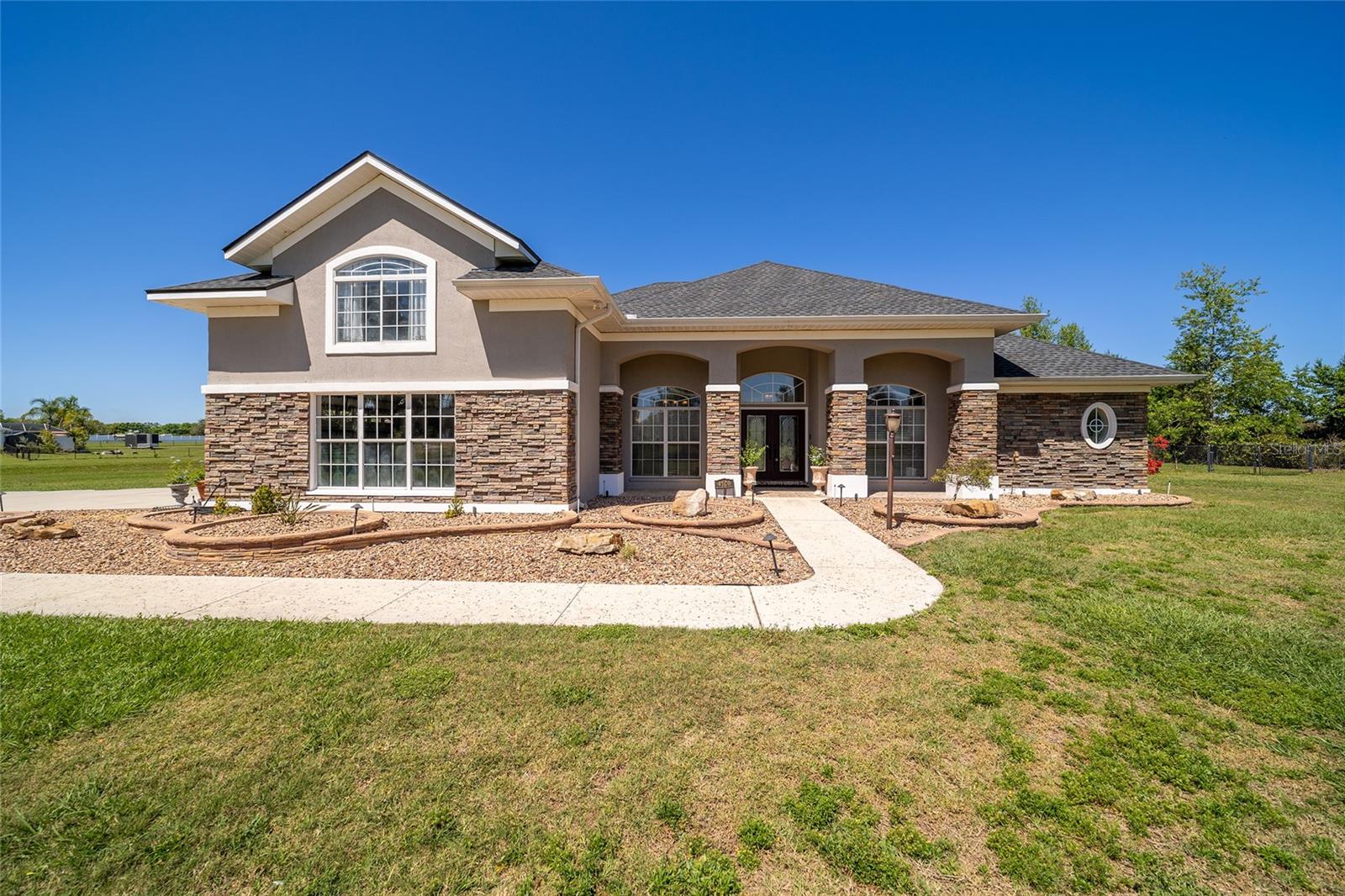 Welcome to your dream home in the coveted Fox Hollow subdivision, a rare gem nestled just minutes away from The Villages, Florida. This expansive property boasts over an acre of land and features a spacious 4-Bedroom / 2-Bathroom plus Den and Formal Dining layout, offering ample space for both relaxation and entertainment. As you step inside, you'll be greeted by stunning Dual Leaded Glass Front Doors, soaring 12' Ceilings adorned with elegant Crown Molding throughout. Coin Corners and 5 1/4" baseboards add a touch of timeless charm to every corner. The heart of the home lies in its well-appointed Kitchen, complete with Solid Wood 42-inch Cabinetry, Imported Granite Countertops, Newer Black SS Samsung Appliances, including Gas Range, and convenient Pantry Closet. Ceramic and accent tile flooring flow seamlessly throughout the main areas, creating a cohesive and stylish ambiance. Escape to the luxurious Primary Bedroom retreat, featuring a spacious Walk-in Closet and sprawling attached En-Suite Bath complete with Jetted Tub and Custom Gorgeous Onyx stone surround. A Private Water Closet with Bidet adds an extra touch of indulgence, while a Slider off the Master Bedroom provides easy access to the tranquil lanai and pool area. Entertain guests with ease in the custom-built entertainment center, complete with plant and lighted accent shelving. Transom Entryway Windows in the office and primary bedroom flood the spaces with natural light. The Split Floor Plan ensures privacy, with three additional bedrooms located away from the primary suite. Upstairs, the Bonus 4th Bedroom space offers versatility and convenience for guests or would make an excellent theater or hobby room! Step outside the quad pocket sliding doors off living room to your own private oasis where a 30 x 14 SALTWATER POOL awaits, complete with Triple Cascade Waterfalls for a touch of luxury. A HUGE Birdcage (New in 2019) and Lanai overlook the completely fenced, north-facing backyard, providing the perfect setting for outdoor gatherings or quiet relaxation. Low-maintenance stone hardscaping and meticulously maintained yard featuring mature plantings, extensive accent and pathway lighting along with in-ground irrigation system create a sense of grandeur and sophistication and complete the luxury exterior. This home is built to last with block and stucco construction. Additional amenities include a whole-house vacuum system, separate Laundry Room with Newer Washer/ and Dryer, Dual HVAC system (main unit New in 2022), Updated Hayward Pool equipment, Tankless Propane-powered RINNAI Hot Water Heater, and a New Storage Shed in 2020, and NEW ROOF in 2021. Don't miss your chance to own this exceptional property offering unparalleled privacy, luxury, and convenience in one of Florida's most desirable locations. Schedule your showing today and make this stunning residence your own!
