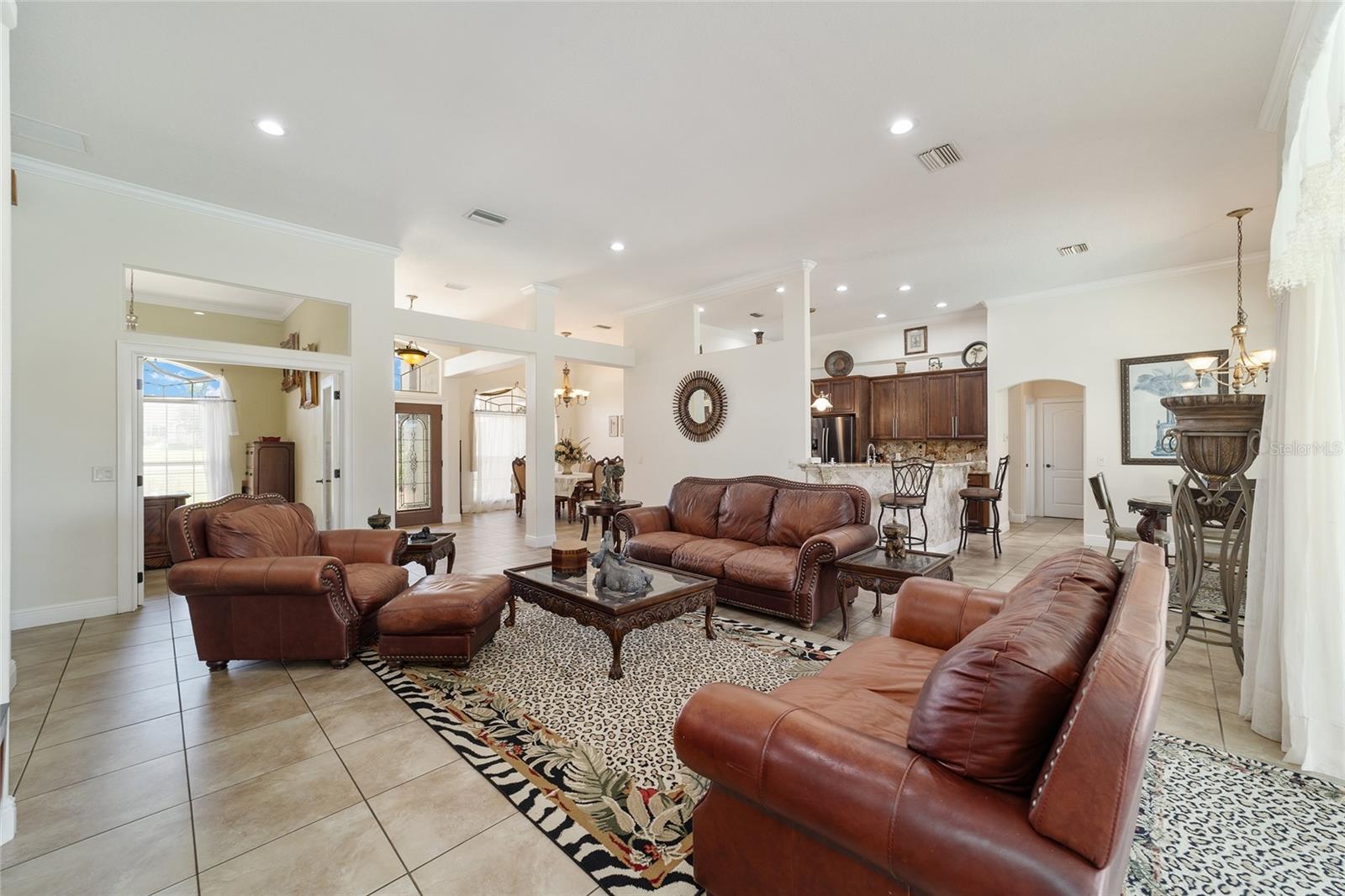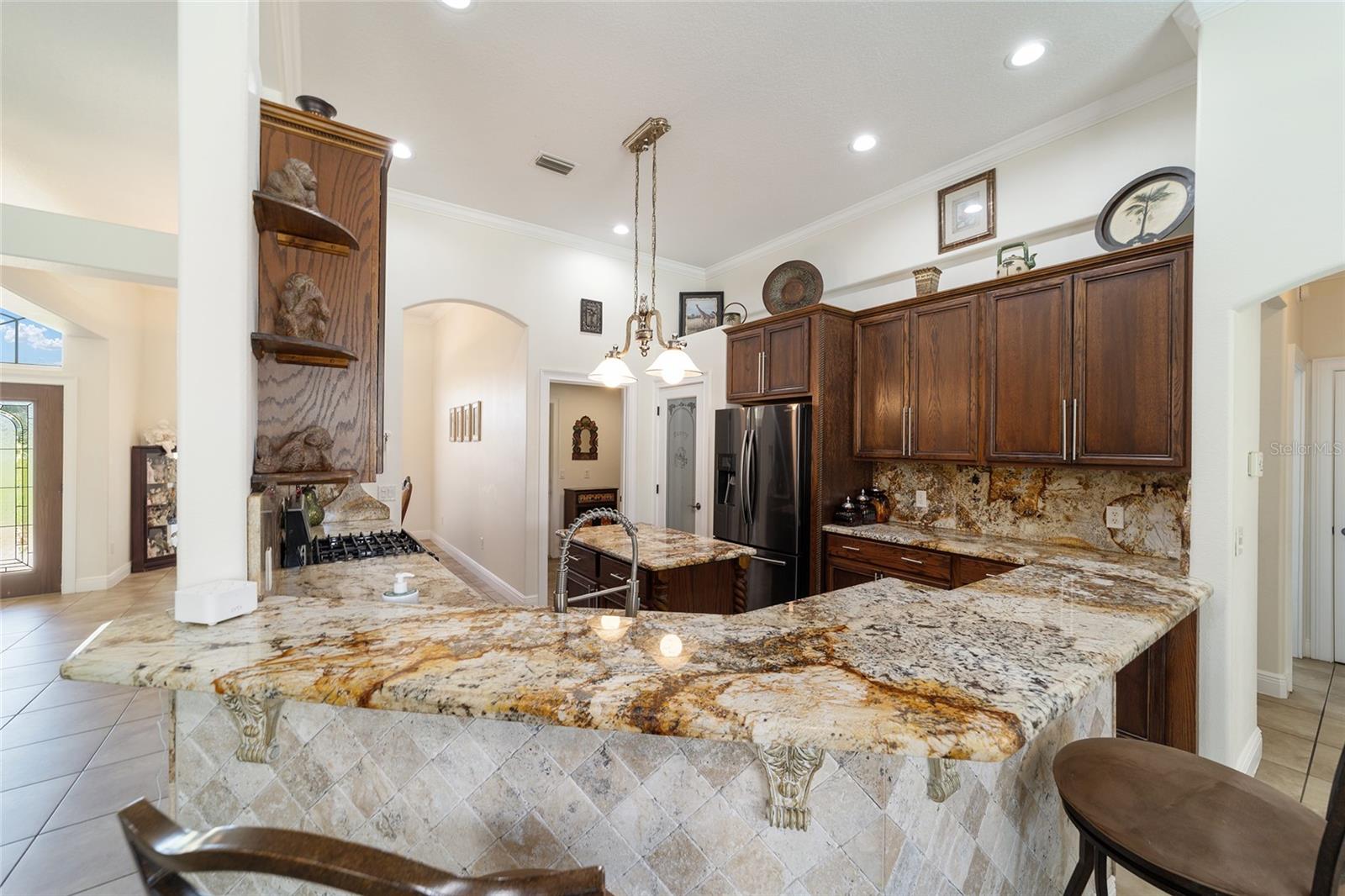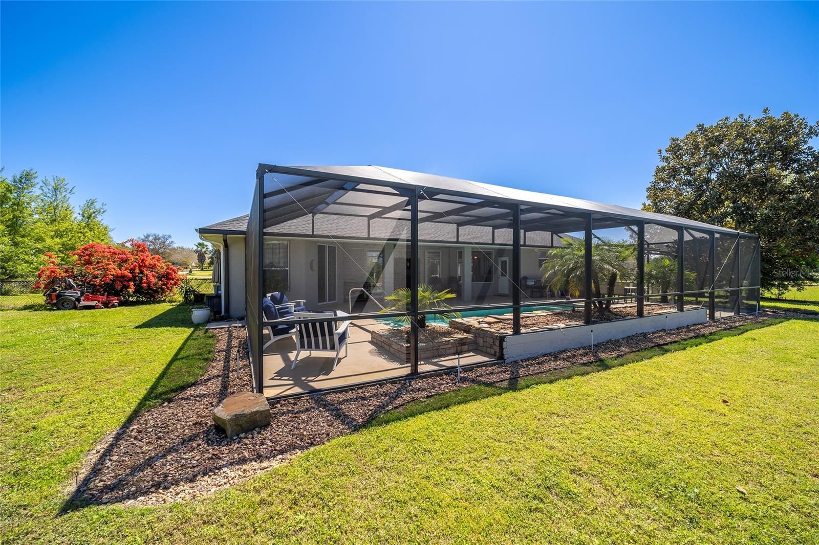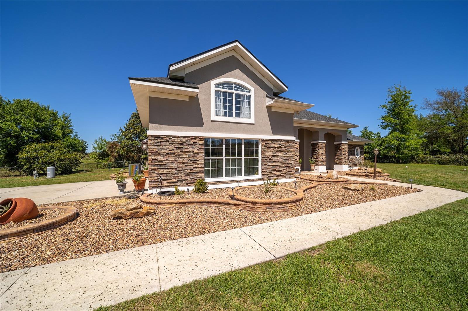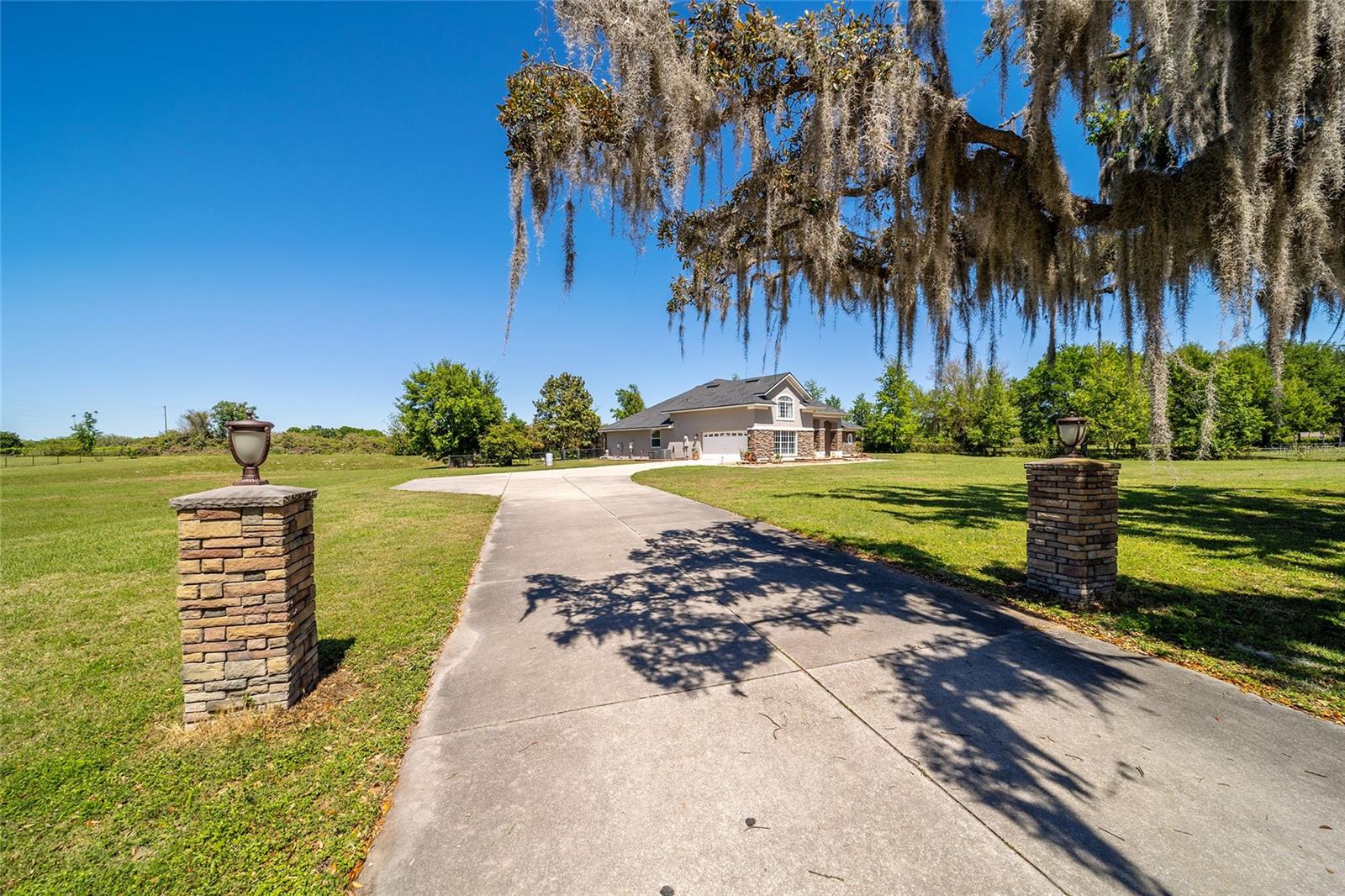 Welcome to your dream home in the coveted Fox Hollow subdivision, a rare gem nestled just minutes away from The Villages, Florida. This expansive property boasts over an acre of land and features a spacious 4-Bedroom / 2-Bathroom plus Den and Formal Dining layout, offering ample space for both relaxation and entertainment. As you step inside, you'll be greeted by stunning Dual Leaded Glass Front Doors, soaring 12' Ceilings adorned with elegant Crown Molding throughout. Coin Corners and 5 1/4" baseboards add a touch of timeless charm to every corner. The heart of the home lies in its well-appointed Kitchen, complete with Solid Wood 42-inch Cabinetry, Imported Granite Countertops, Newer Black SS Samsung Appliances, including Gas Range, and convenient Pantry Closet. Ceramic and accent tile flooring flow seamlessly throughout the main areas, creating a cohesive and stylish ambiance. Escape to the luxurious Primary Bedroom retreat, featuring a spacious Walk-in Closet and sprawling attached En-Suite Bath complete with Jetted Tub and Custom Gorgeous Onyx stone surround. A Private Water Closet with Bidet adds an extra touch of indulgence, while a Slider off the Master Bedroom provides easy access to the tranquil lanai and pool area. Entertain guests with ease in the custom-built entertainment center, complete with plant and lighted accent shelving. Transom Entryway Windows in the office and primary bedroom flood the spaces with natural light. The Split Floor Plan ensures privacy, with three additional bedrooms located away from the primary suite. Upstairs, the Bonus 4th Bedroom space offers versatility and convenience for guests or would make an excellent theater or hobby room! Step outside the quad pocket sliding doors off living room to your own private oasis where a 30 x 14 SALTWATER POOL awaits, complete with Triple Cascade Waterfalls for a touch of luxury. A HUGE Birdcage (New in 2019) and Lanai overlook the completely fenced, north-facing backyard, providing the perfect setting for outdoor gatherings or quiet relaxation. Low-maintenance stone hardscaping and meticulously maintained yard featuring mature plantings, extensive accent and pathway lighting along with in-ground irrigation system create a sense of grandeur and sophistication and complete the luxury exterior. This home is built to last with block and stucco construction. Additional amenities include a whole-house vacuum system, separate Laundry Room with Newer Washer/ and Dryer, Dual HVAC system (main unit New in 2022), Updated Hayward Pool equipment, Tankless Propane-powered RINNAI Hot Water Heater, and a New Storage Shed in 2020, and NEW ROOF in 2021. Don't miss your chance to own this exceptional property offering unparalleled privacy, luxury, and convenience in one of Florida's most desirable locations. Schedule your showing today and make this stunning residence your own!