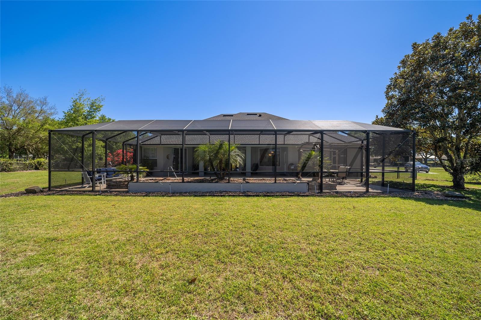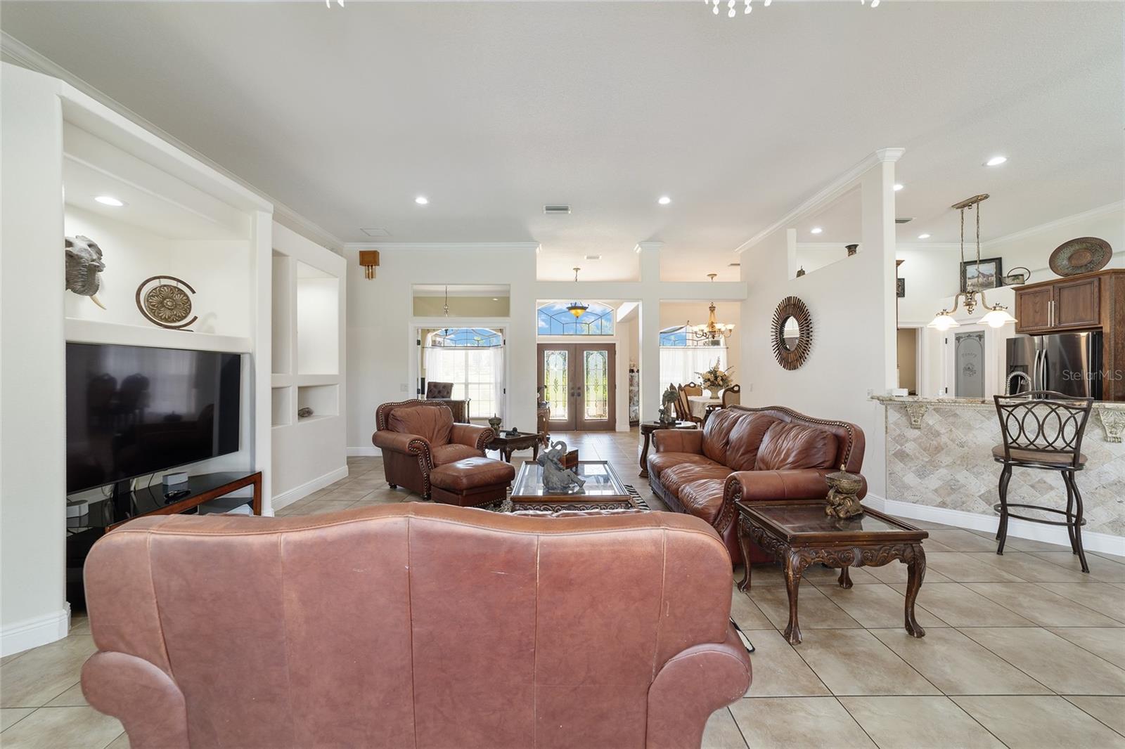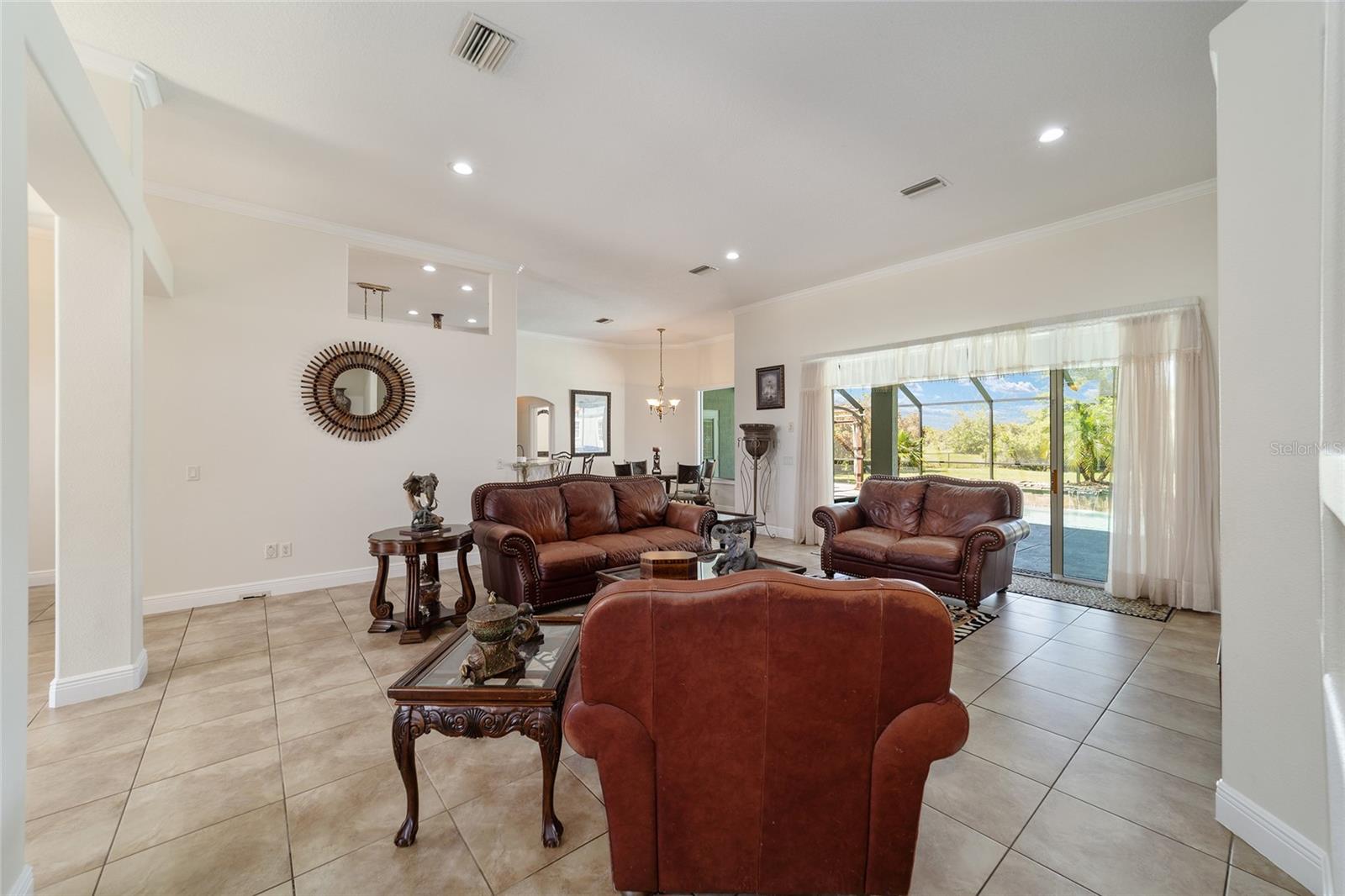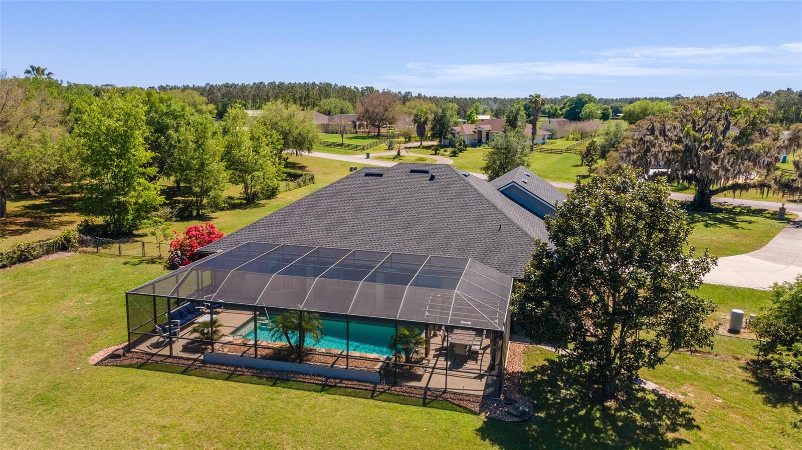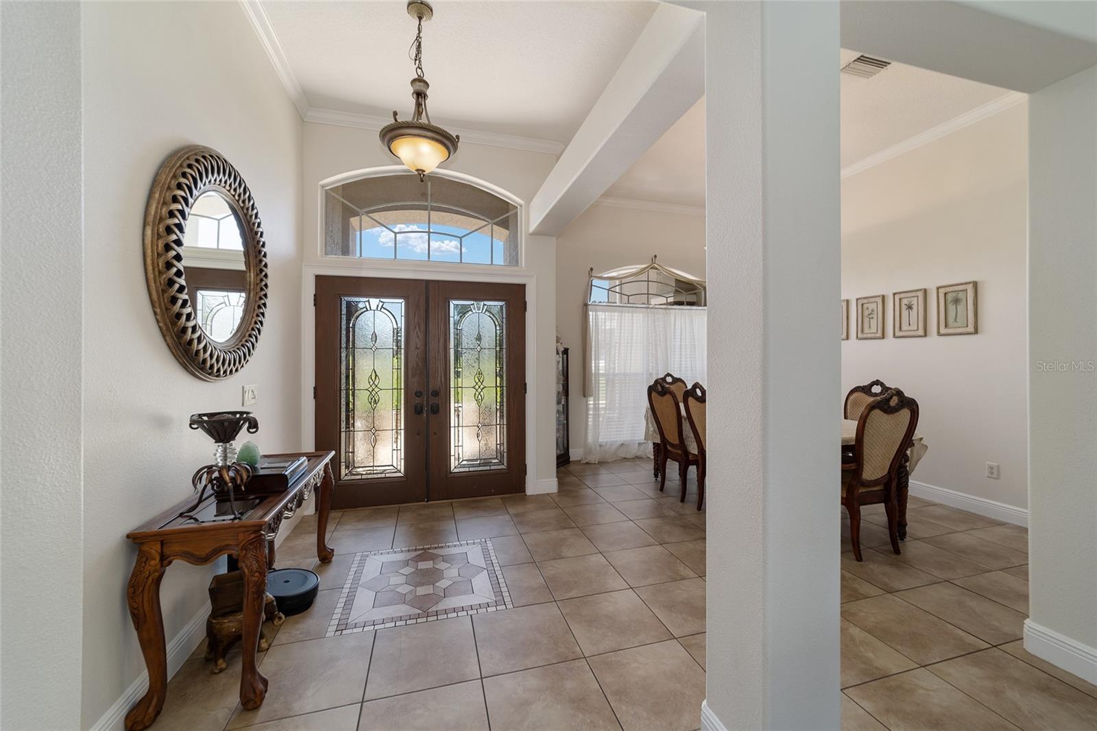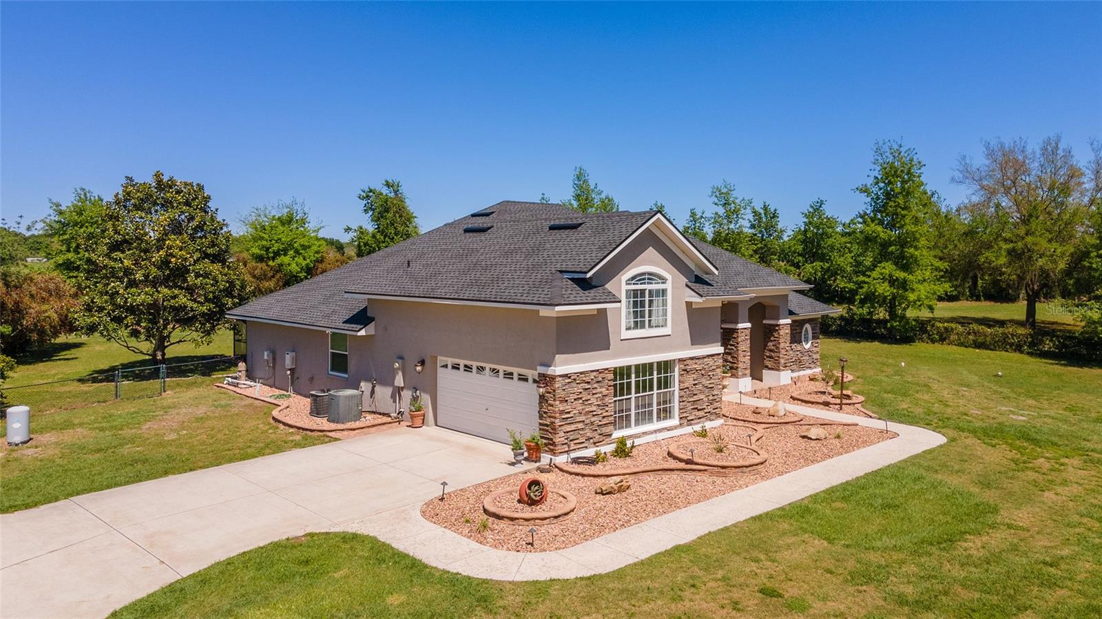 Welcome to your dream home in the coveted Fox Hollow subdivision, a rare gem nestled just minutes away from The Villages, Florida. This expansive property boasts over an acre of land and features a spacious 4-Bedroom / 2-Bathroom plus Den and Formal Dining layout, offering ample space for both relaxation and entertainment. As you step inside, you'll be greeted by stunning Dual Leaded Glass Front Doors, soaring 12' Ceilings adorned with elegant Crown Molding throughout. Coin Corners and 5 1/4" baseboards add a touch of timeless charm to every corner. The heart of the home lies in its well-appointed Kitchen, complete with Solid Wood 42-inch Cabinetry, Imported Granite Countertops, Newer Black SS Samsung Appliances, including Gas Range, and convenient Pantry Closet. Ceramic and accent tile flooring flow seamlessly throughout the main areas, creating a cohesive and stylish ambiance. Escape to the luxurious Primary Bedroom retreat, featuring a spacious Walk-in Closet and sprawling attached En-Suite Bath complete with Jetted Tub and Custom Gorgeous Onyx stone surround. A Private Water Closet with Bidet adds an extra touch of indulgence, while a Slider off the Master Bedroom provides easy access to the tranquil lanai and pool area. Entertain guests with ease in the custom-built entertainment center, complete with plant and lighted accent shelving. Transom Entryway Windows in the office and primary bedroom flood the spaces with natural light. The Split Floor Plan ensures privacy, with three additional bedrooms located away from the primary suite. Upstairs, the Bonus 4th Bedroom space offers versatility and convenience for guests or would make an excellent theater or hobby room! Step outside the quad pocket sliding doors off living room to your own private oasis where a 30 x 14 SALTWATER POOL awaits, complete with Triple Cascade Waterfalls for a touch of luxury. A HUGE Birdcage (New in 2019) and Lanai overlook the completely fenced, north-facing backyard, providing the perfect setting for outdoor gatherings or quiet relaxation. Low-maintenance stone hardscaping and meticulously maintained yard featuring mature plantings, extensive accent and pathway lighting along with in-ground irrigation system create a sense of grandeur and sophistication and complete the luxury exterior. This home is built to last with block and stucco construction. Additional amenities include a whole-house vacuum system, separate Laundry Room with Newer Washer/ and Dryer, Dual HVAC system (main unit New in 2022), Updated Hayward Pool equipment, Tankless Propane-powered RINNAI Hot Water Heater, and a New Storage Shed in 2020, and NEW ROOF in 2021. Don't miss your chance to own this exceptional property offering unparalleled privacy, luxury, and convenience in one of Florida's most desirable locations. Schedule your showing today and make this stunning residence your own!