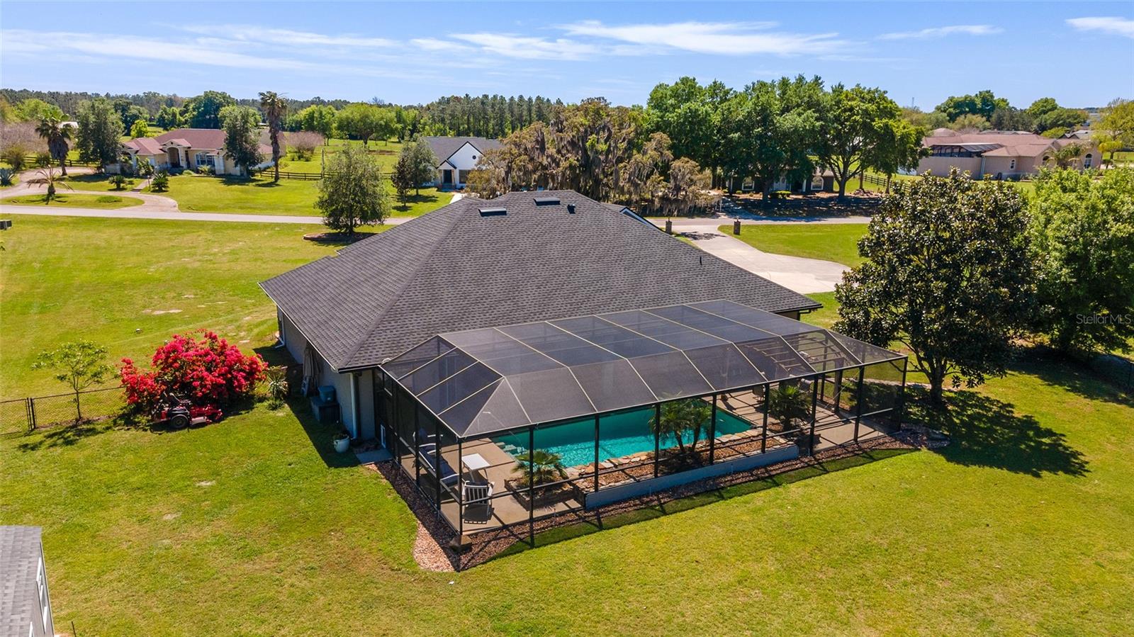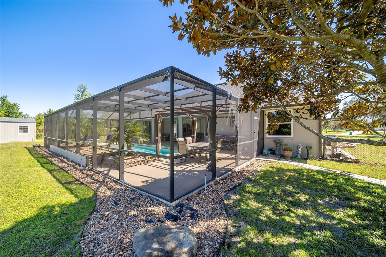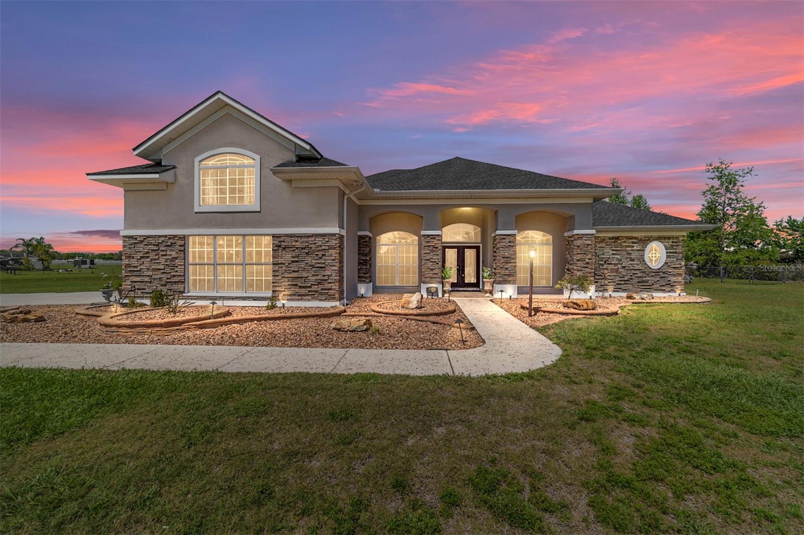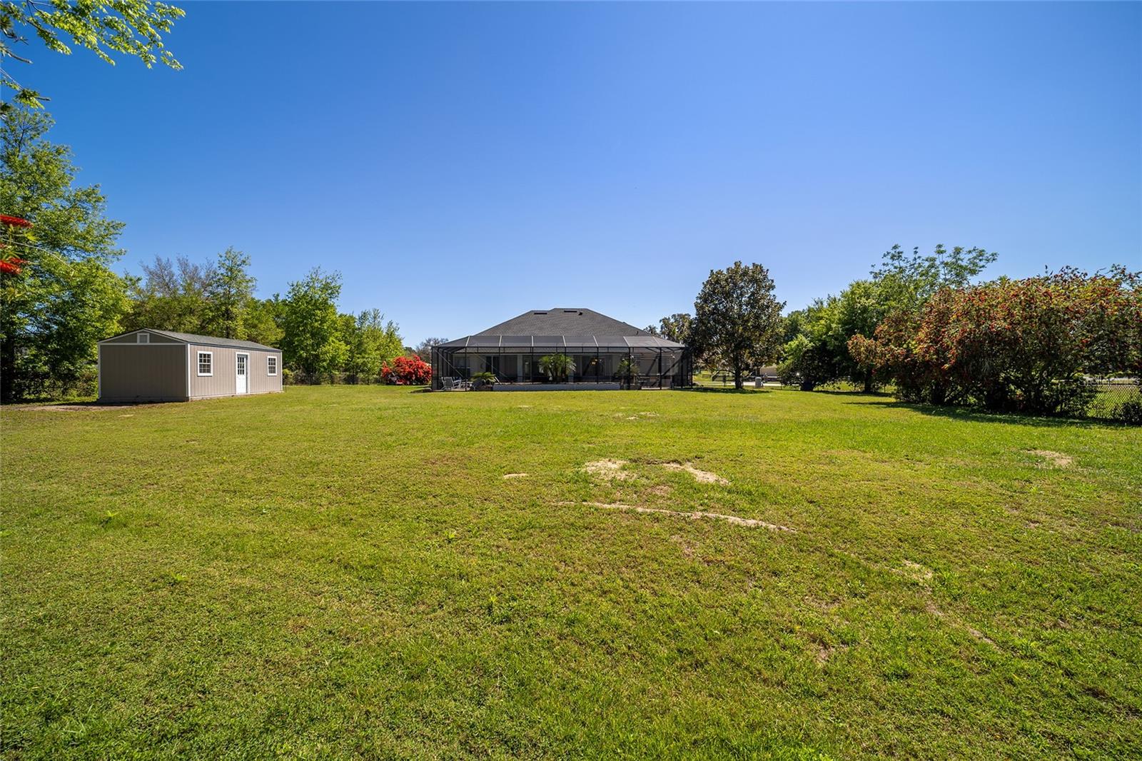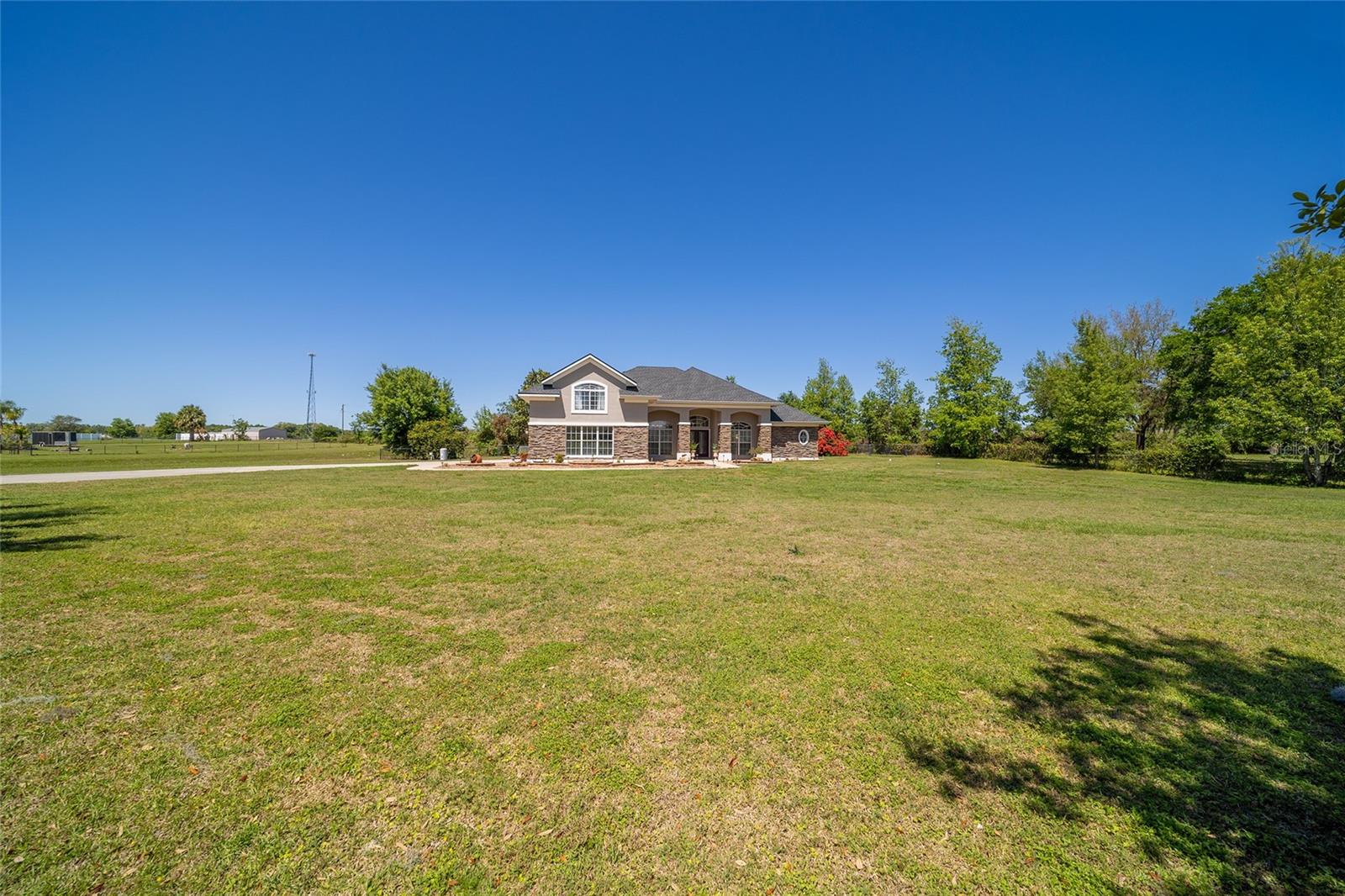 Welcome to your dream home in the coveted Fox Hollow subdivision, a rare gem nestled just minutes away from The Villages, Florida. This expansive property boasts over an acre of land and features a spacious 4-Bedroom / 2-Bathroom plus Den and Formal Dining layout, offering ample space for both relaxation and entertainment. As you step inside, you'll be greeted by stunning Dual Leaded Glass Front Doors, soaring 12' Ceilings adorned with elegant Crown Molding throughout. Coin Corners and 5 1/4" baseboards add a touch of timeless charm to every corner. The heart of the home lies in its well-appointed Kitchen, complete with Solid Wood 42-inch Cabinetry, Imported Granite Countertops, Newer Black SS Samsung Appliances, including Gas Range, and convenient Pantry Closet. Ceramic and accent tile flooring flow seamlessly throughout the main areas, creating a cohesive and stylish ambiance. Escape to the luxurious Primary Bedroom retreat, featuring a spacious Walk-in Closet and sprawling attached En-Suite Bath complete with Jetted Tub and Custom Gorgeous Onyx stone surround. A Private Water Closet with Bidet adds an extra touch of indulgence, while a Slider off the Master Bedroom provides easy access to the tranquil lanai and pool area. Entertain guests with ease in the custom-built entertainment center, complete with plant and lighted accent shelving. Transom Entryway Windows in the office and primary bedroom flood the spaces with natural light. The Split Floor Plan ensures privacy, with three additional bedrooms located away from the primary suite. Upstairs, the Bonus 4th Bedroom space offers versatility and convenience for guests or would make an excellent theater or hobby room! Step outside the quad pocket sliding doors off living room to your own private oasis where a 30 x 14 SALTWATER POOL awaits, complete with Triple Cascade Waterfalls for a touch of luxury. A HUGE Birdcage (New in 2019) and Lanai overlook the completely fenced, north-facing backyard, providing the perfect setting for outdoor gatherings or quiet relaxation. Low-maintenance stone hardscaping and meticulously maintained yard featuring mature plantings, extensive accent and pathway lighting along with in-ground irrigation system create a sense of grandeur and sophistication and complete the luxury exterior. This home is built to last with block and stucco construction. Additional amenities include a whole-house vacuum system, separate Laundry Room with Newer Washer/ and Dryer, Dual HVAC system (main unit New in 2022), Updated Hayward Pool equipment, Tankless Propane-powered RINNAI Hot Water Heater, and a New Storage Shed in 2020, and NEW ROOF in 2021. Don't miss your chance to own this exceptional property offering unparalleled privacy, luxury, and convenience in one of Florida's most desirable locations. Schedule your showing today and make this stunning residence your own!